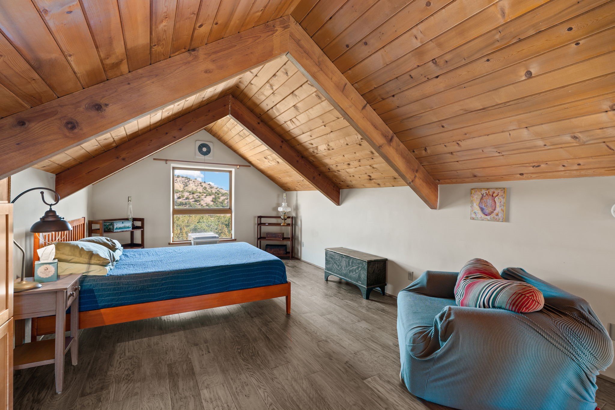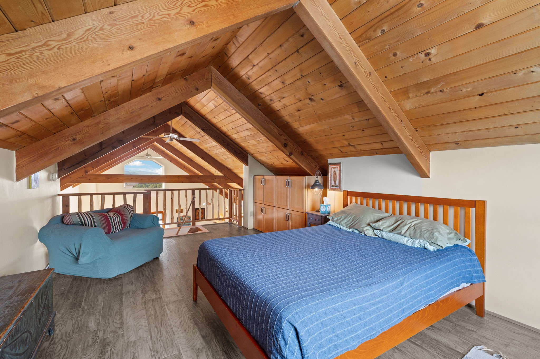 Beautiful adobe and frame Northern New Mexico style home with breathtaking views and hillside setting located just before the historic village of Lamy. This passive solar, open-plan, split-bedroom design offers both comfort and charm. Two primary suite possibilities and a large working studio space. The vaulted great room creates spaciousness, while the loft bedroom overlooks the living area. The owner's suite provides privacy and access to serene outdoor spaces. Enjoy relaxing or entertaining on the large deck overlooking the Lamy Valley. Recent upgrades include a new propanel roof (2017) and a brand-new septic system. A 2-car garage and storage shed offer ample space for hobbies and equipment. The property features an enclosed cat area, fenced dog pen, and room for horses in the field below. Minimal fee for road maintenence from the private road to CR 33. Conveniently located minutes from Lamy village, Amtrak station, Galisteo Basin Preserve, and the Legal Tender restaurant. Short drive to Eldorado shopping and services, and within easy reach of Santa Fe. This home captures the essence of Northern New Mexico country living -- spacious, practical, and beautifully situated. Well has a propane generator in the event of a power outage.