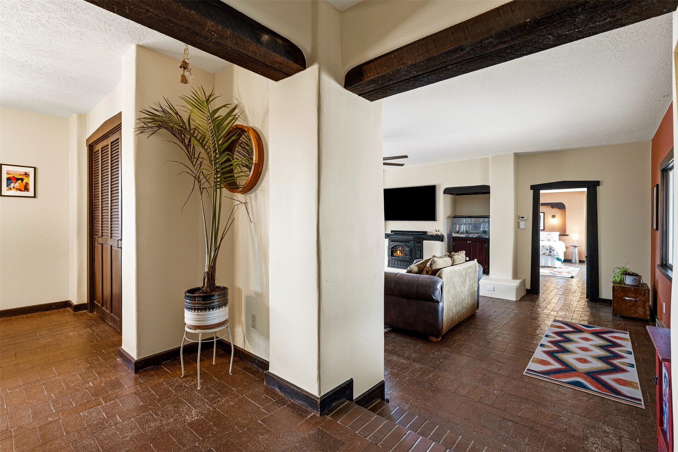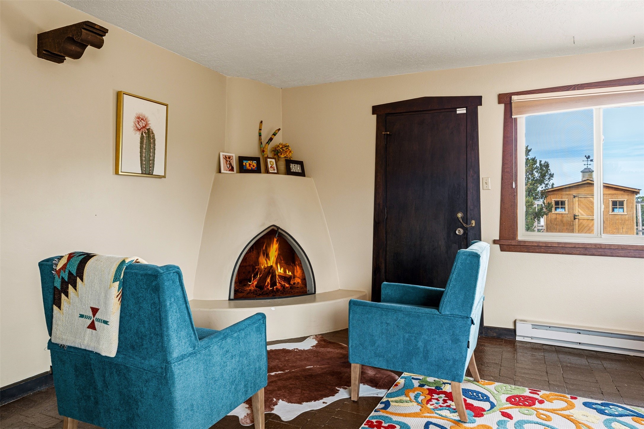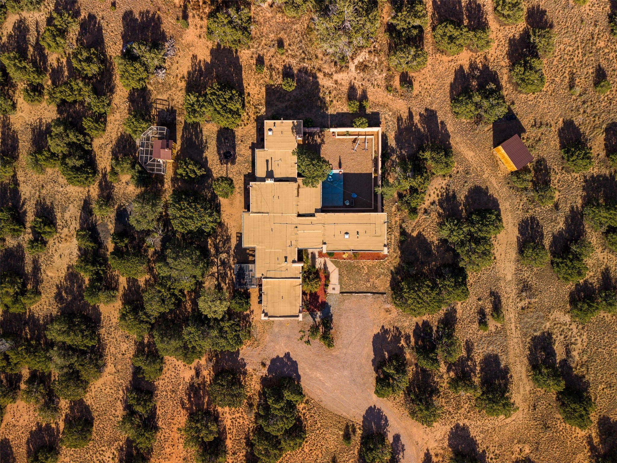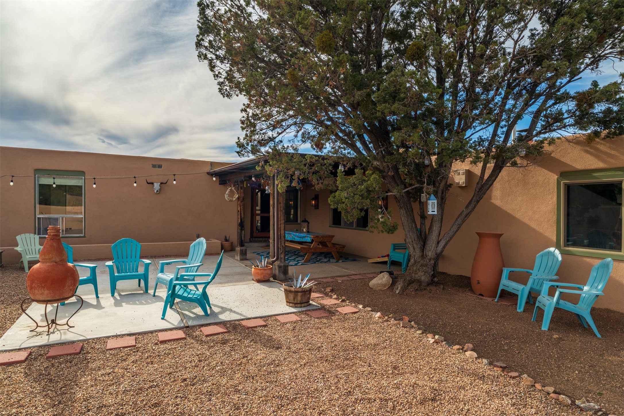 Discover this thoughtfully designed 3-bedroom, 2-bath home on five acres in Sunlit Hills, offering the perfect blend of rural tranquility and everyday convenience. Enjoy views of the Jemez Mountains and nearby foothills, just 10 minutes from town.The home's L-shaped layout centers around a courtyard and two large covered patios, ideal for outdoor dining and relaxation. Inside, you'll find brick and tile floors, maple cabinetry, custom built-ins, and generous closet space throughout.The private primary suite features a fireplace and peaceful views, while a pellet stove in the living room adds warmth and charm. A bonus room offers flexibility for an office, studio, or extra storage.Perfect for homesteading, the property includes a large chicken coop, fully fenced and deer-proof garden area, a spacious storage shed, and ample space for horses. Eco-friendly amenities include a fully owned solar panel array and EV charging station.With its heated two-car garage, self-sufficient design, and proven short-term rental history, this home offers comfort, versatility, and stunning natural beauty--all within easy reach of town.