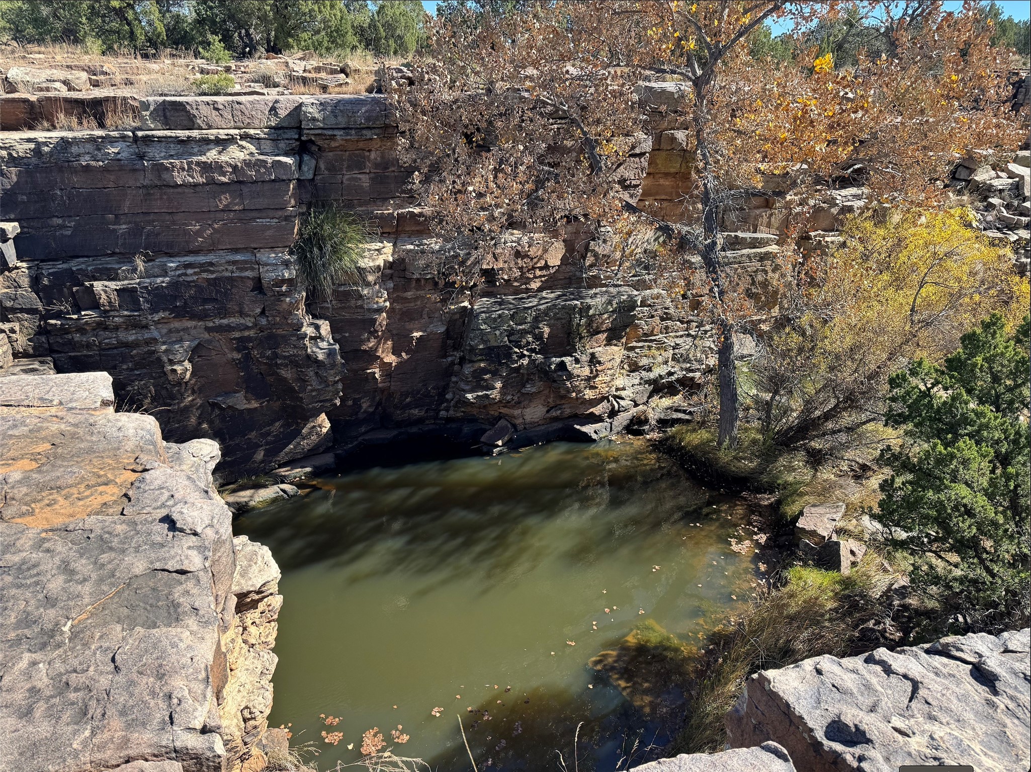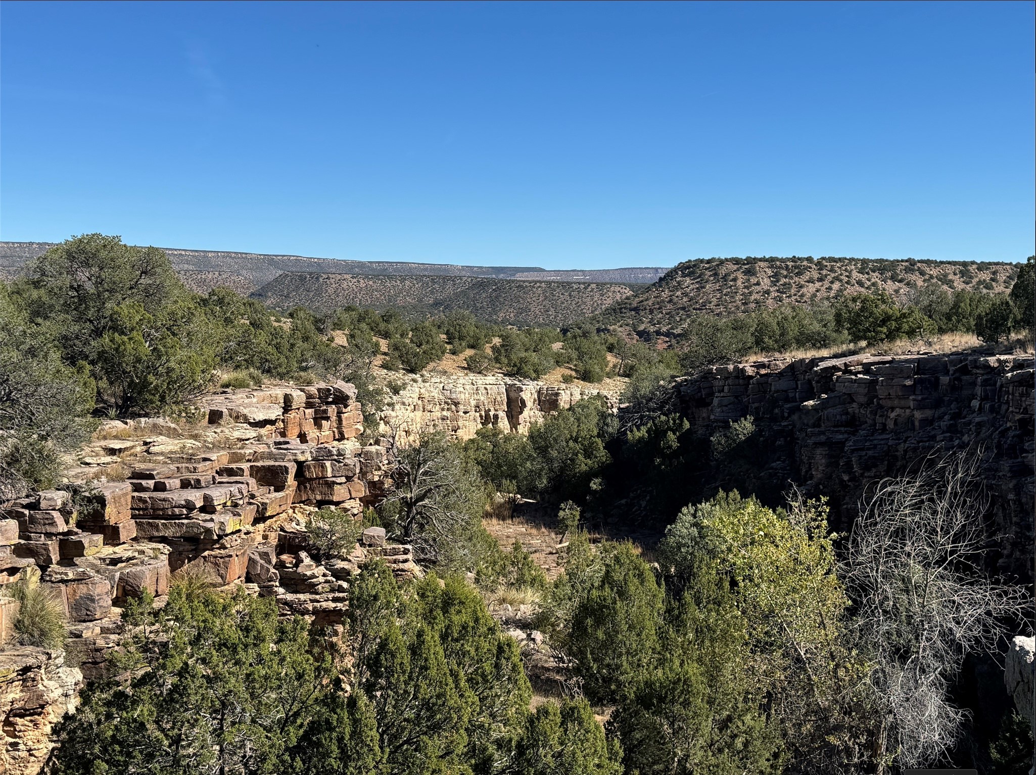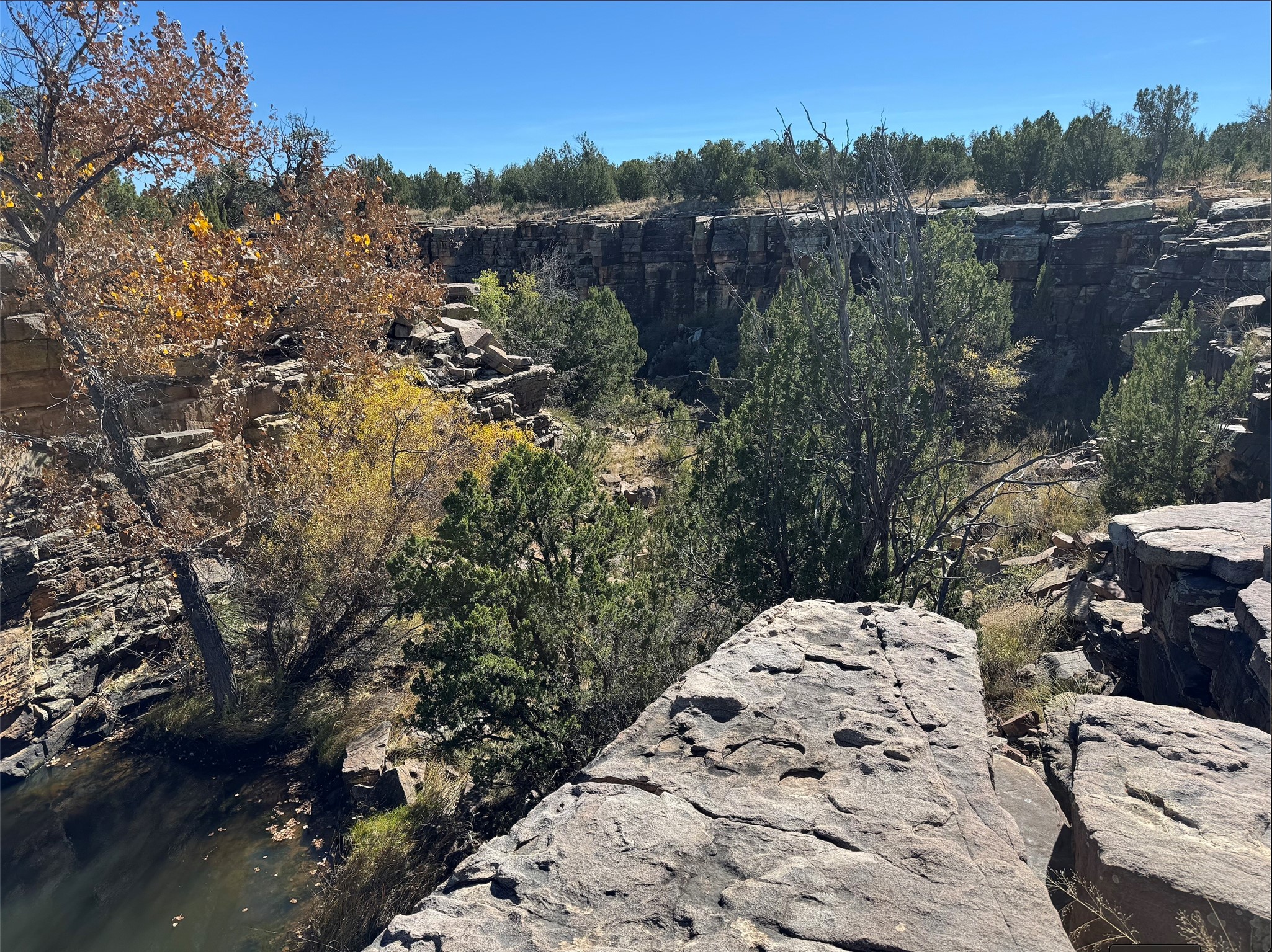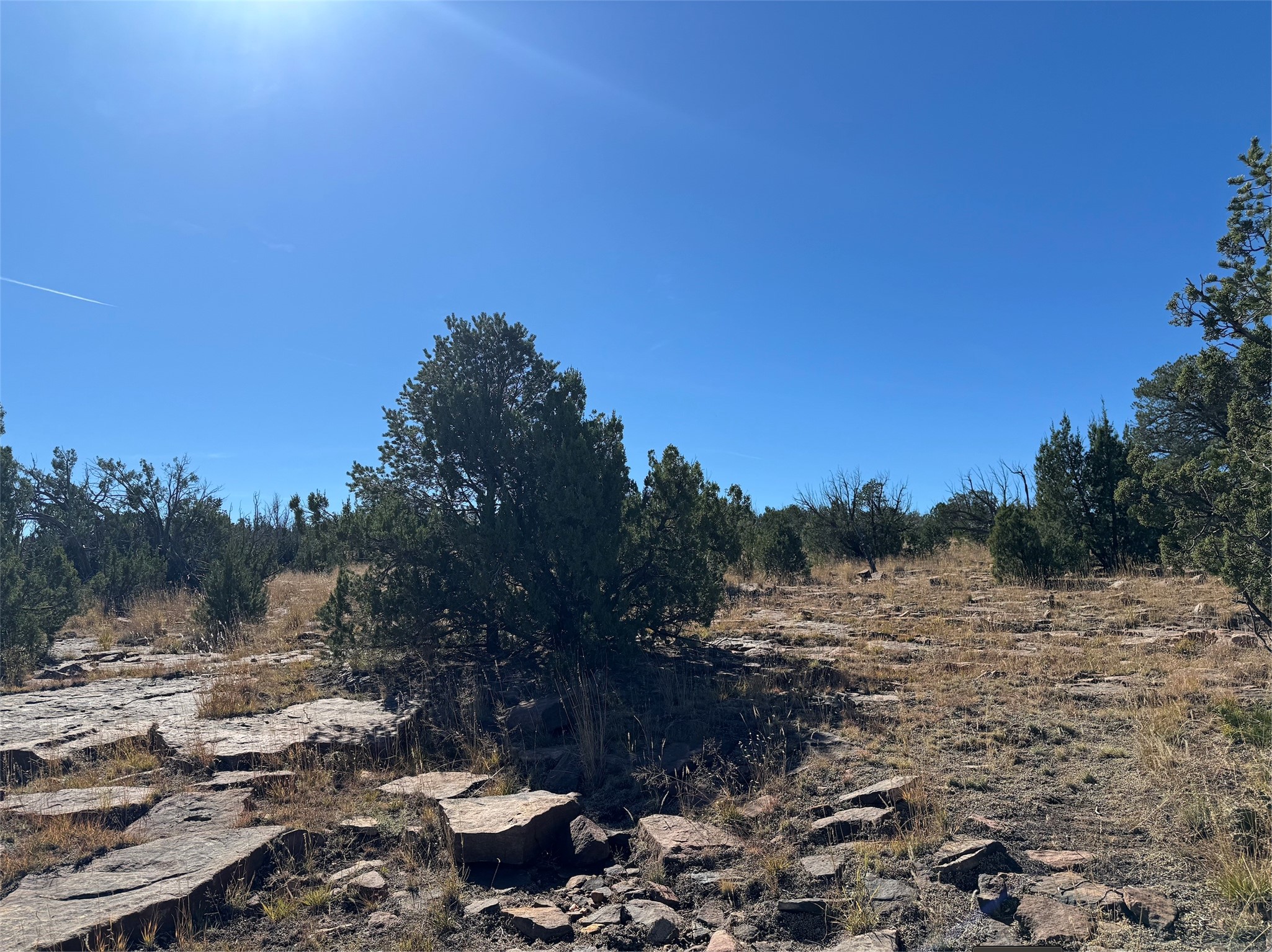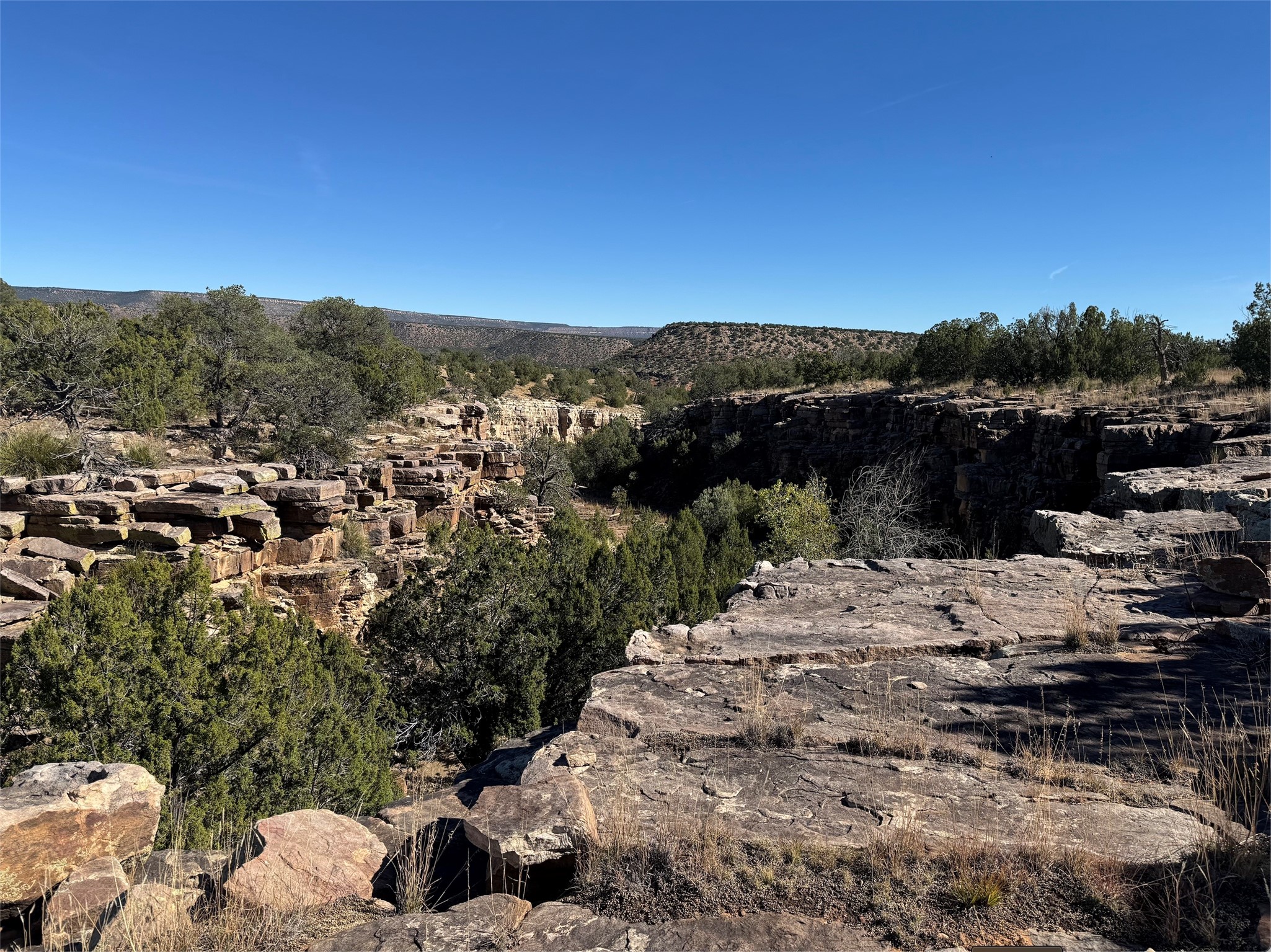 Stunning mesa views out over your own private canyon! Pinon and Juniper dotted landscape gives way to the dramatic stone walls of your very own box canyon, with a pool at the top! Natural stone 'steps' lead down to the pool under the shade of a cottonwood. Very private parcel with plenty of room for you and/or your animals to roam. Use it as a private spot to camp and contemplate the vistas and natural beauty of Northern New Mexico, or develop your own 'off-grid' homestead!