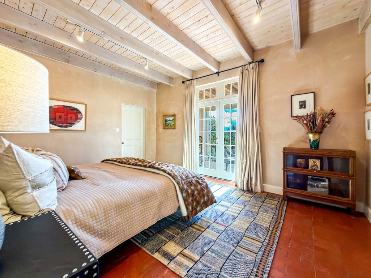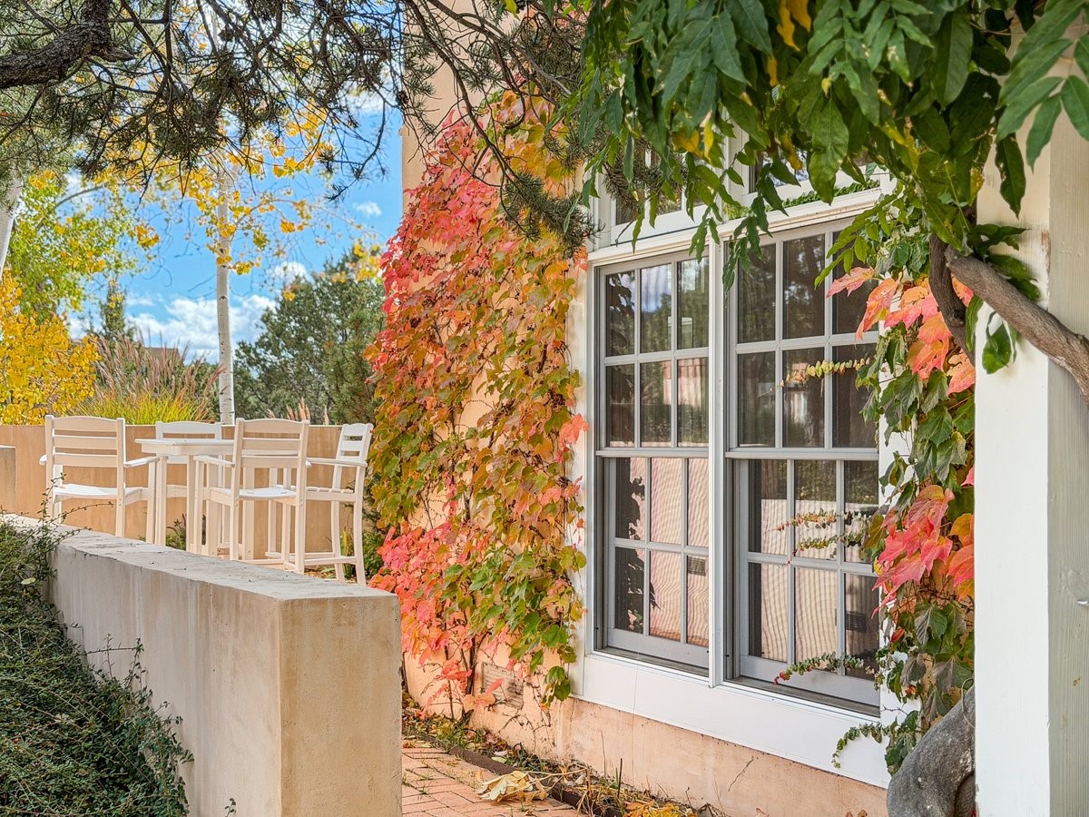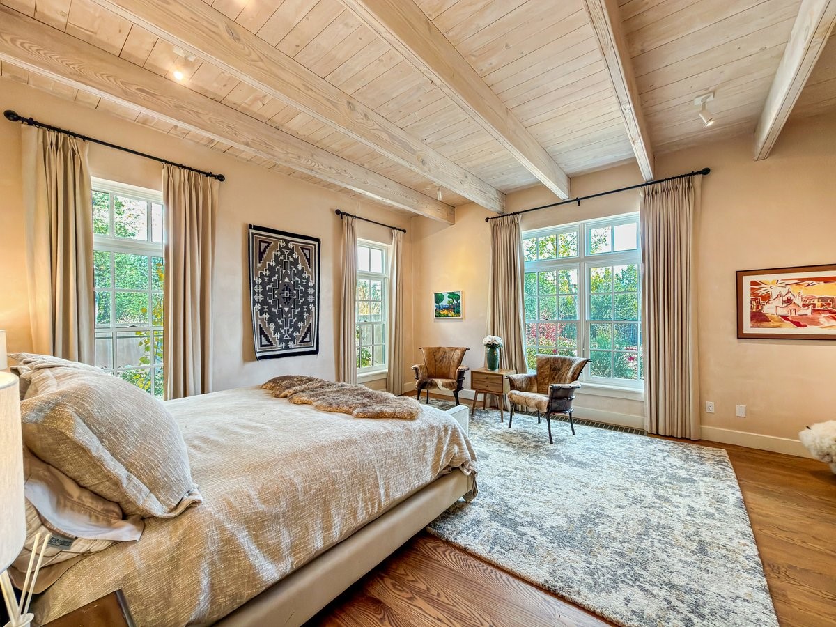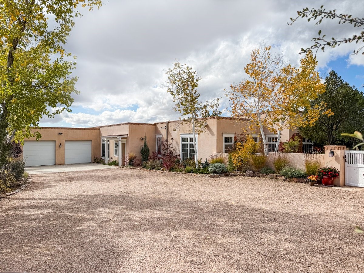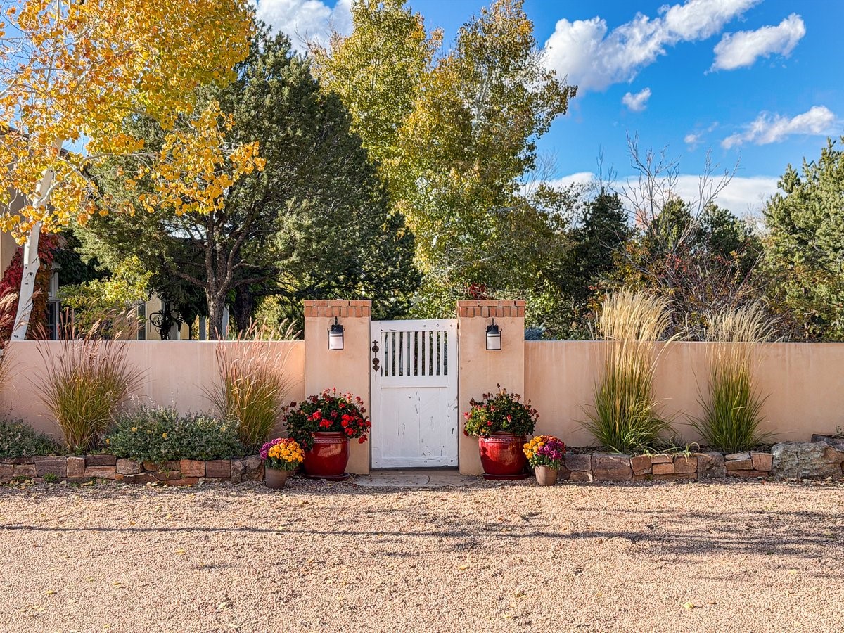 Nestled on 1.7 acres of lush, landscaped grounds near Bishop's Lodge Road, this timeless Territorial estate embodies the essence of Southwest living just five minutes from the Plaza. Behind a welcoming electronic gate, discover serene gardens and mature trees that set the tone for a private retreat filled with warmth and character. Inside, the residence unfolds with effortless grace, featuring hardwood and brick floors, tall ceilings and abundant natural light. The thoughtfully designed floor plan offers four bedrooms, three full baths, a three-quarter bath and a powder room, blending comfort and privacy throughout. Three inviting guest suites, each with its own en suite bath, are privately situated apart from the main living areas, providing an ideal layout for hosting family or friends. The elegant home captures the timeless charm of Santa Fe, where every detail invites relaxation and connection to the surrounding beauty.