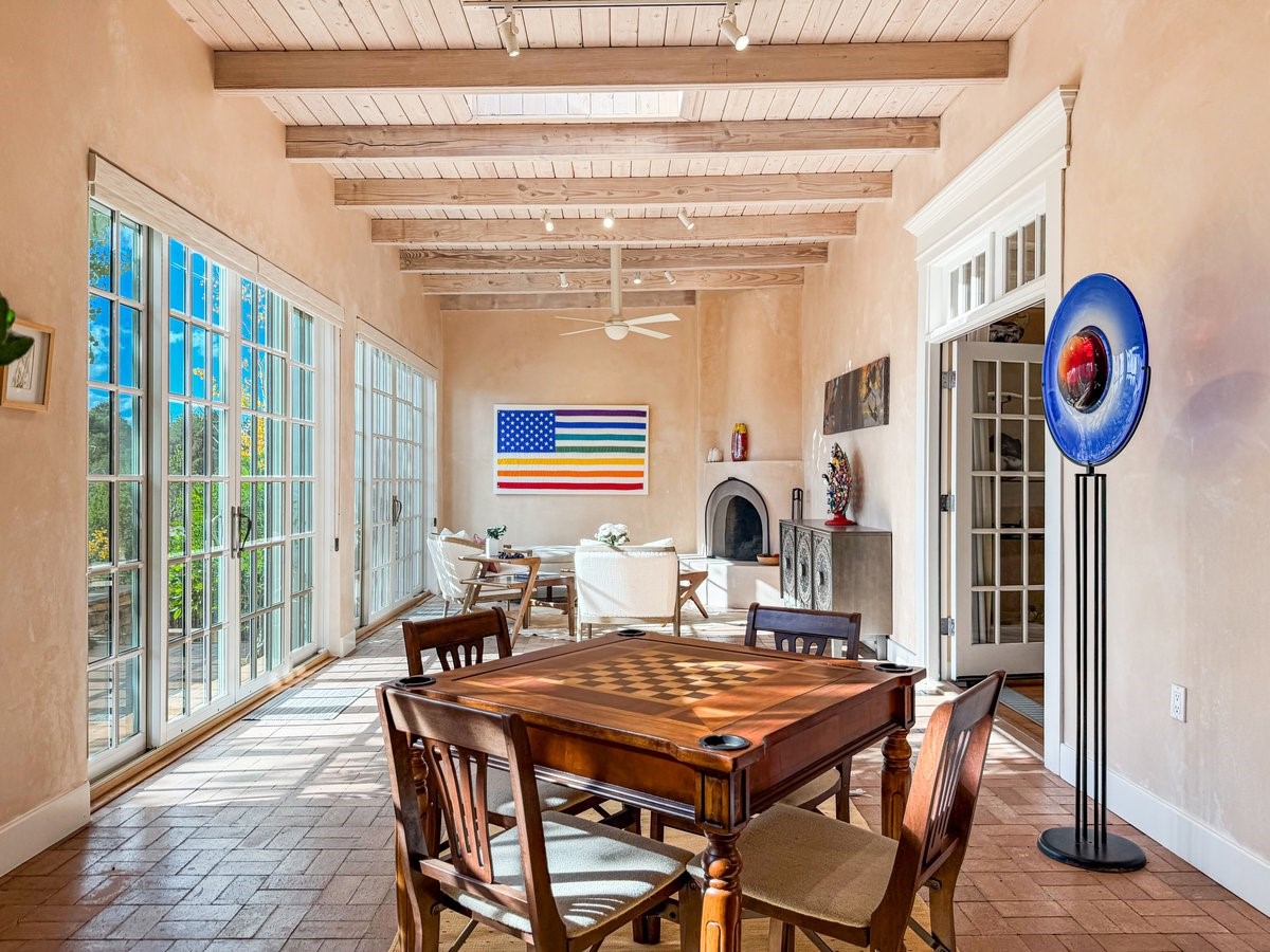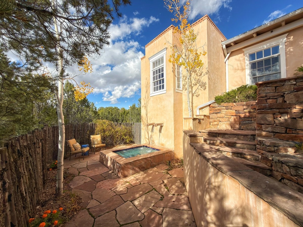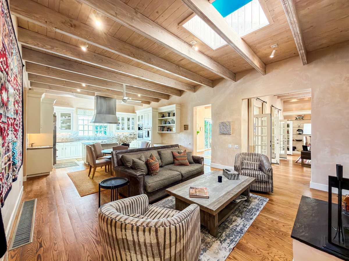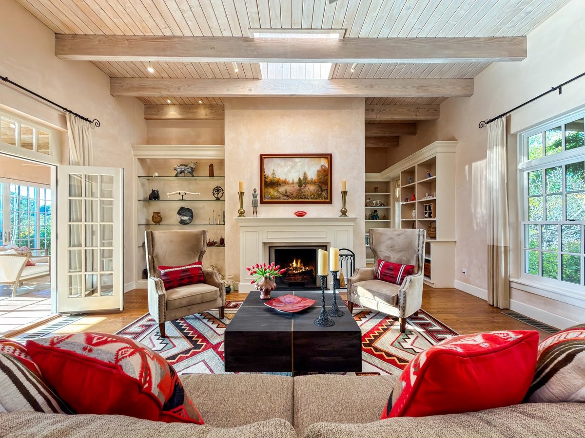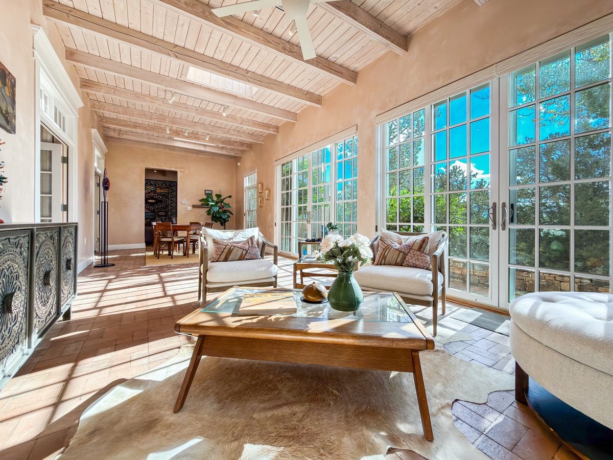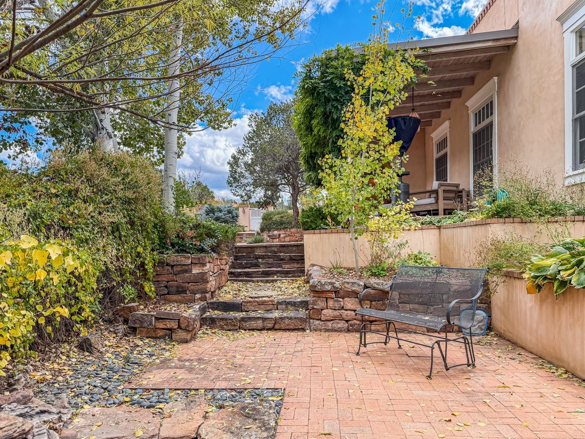 Nestled on 1.7 acres of lush, landscaped grounds near Bishop's Lodge Road, this timeless Territorial estate embodies the essence of Southwest living just five minutes from the Plaza. Behind a welcoming electronic gate, discover serene gardens and mature trees that set the tone for a private retreat filled with warmth and character. Inside, the residence unfolds with effortless grace, featuring hardwood and brick floors, tall ceilings and abundant natural light. The thoughtfully designed floor plan offers four bedrooms, three full baths, a three-quarter bath and a powder room, blending comfort and privacy throughout. Three inviting guest suites, each with its own en suite bath, are privately situated apart from the main living areas, providing an ideal layout for hosting family or friends. The elegant home captures the timeless charm of Santa Fe, where every detail invites relaxation and connection to the surrounding beauty.