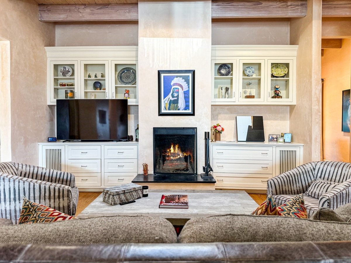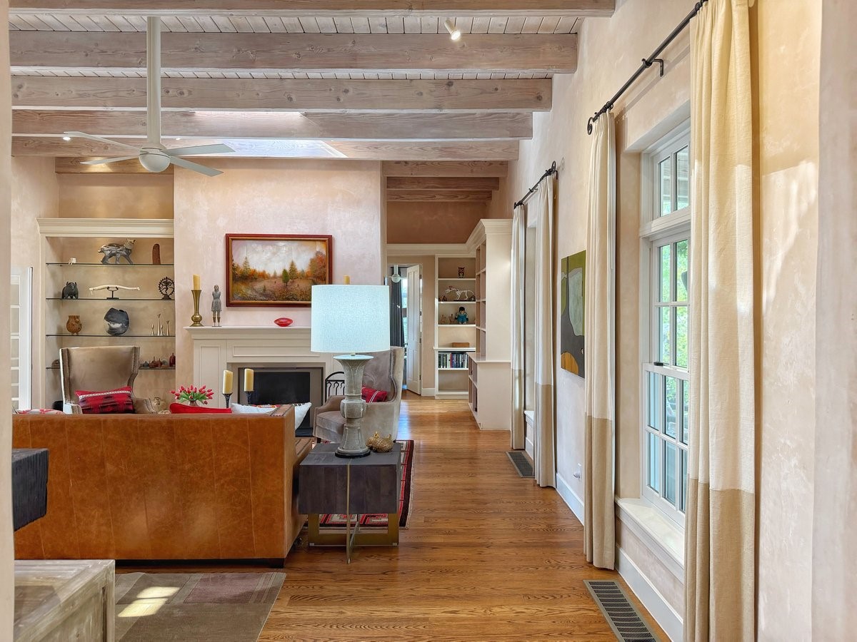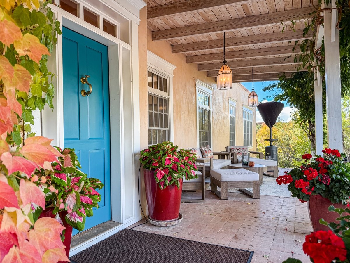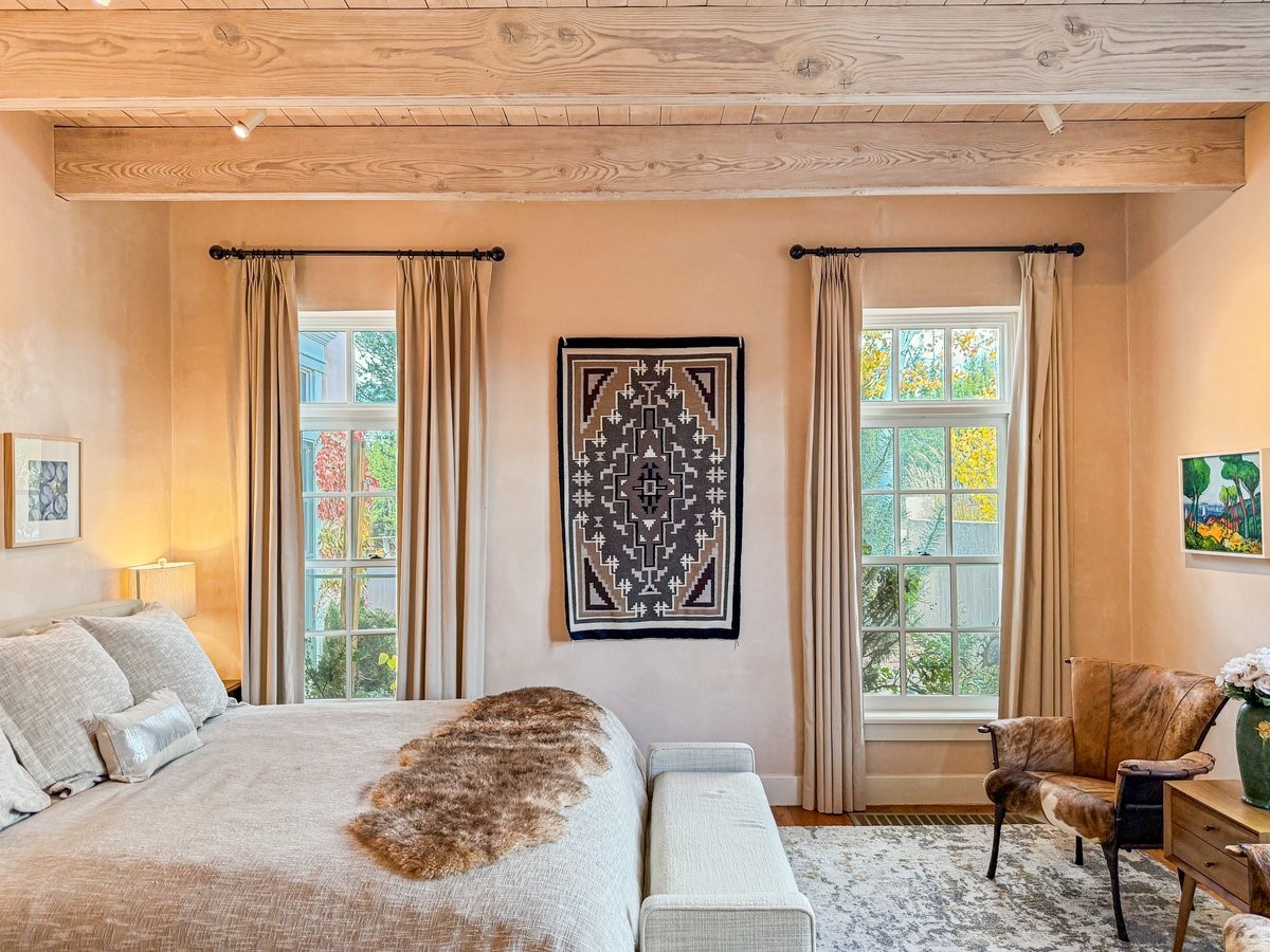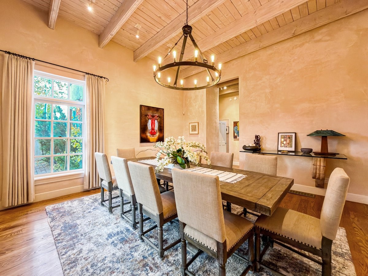 Nestled on 1.7 acres of lush, landscaped grounds near Bishop's Lodge Road, this timeless Territorial estate embodies the essence of Southwest living just five minutes from the Plaza. Behind a welcoming electronic gate, discover serene gardens and mature trees that set the tone for a private retreat filled with warmth and character. Inside, the residence unfolds with effortless grace, featuring hardwood and brick floors, tall ceilings and abundant natural light. The thoughtfully designed floor plan offers four bedrooms, three full baths, a three-quarter bath and a powder room, blending comfort and privacy throughout. Three inviting guest suites, each with its own en suite bath, are privately situated apart from the main living areas, providing an ideal layout for hosting family or friends. The elegant home captures the timeless charm of Santa Fe, where every detail invites relaxation and connection to the surrounding beauty.
