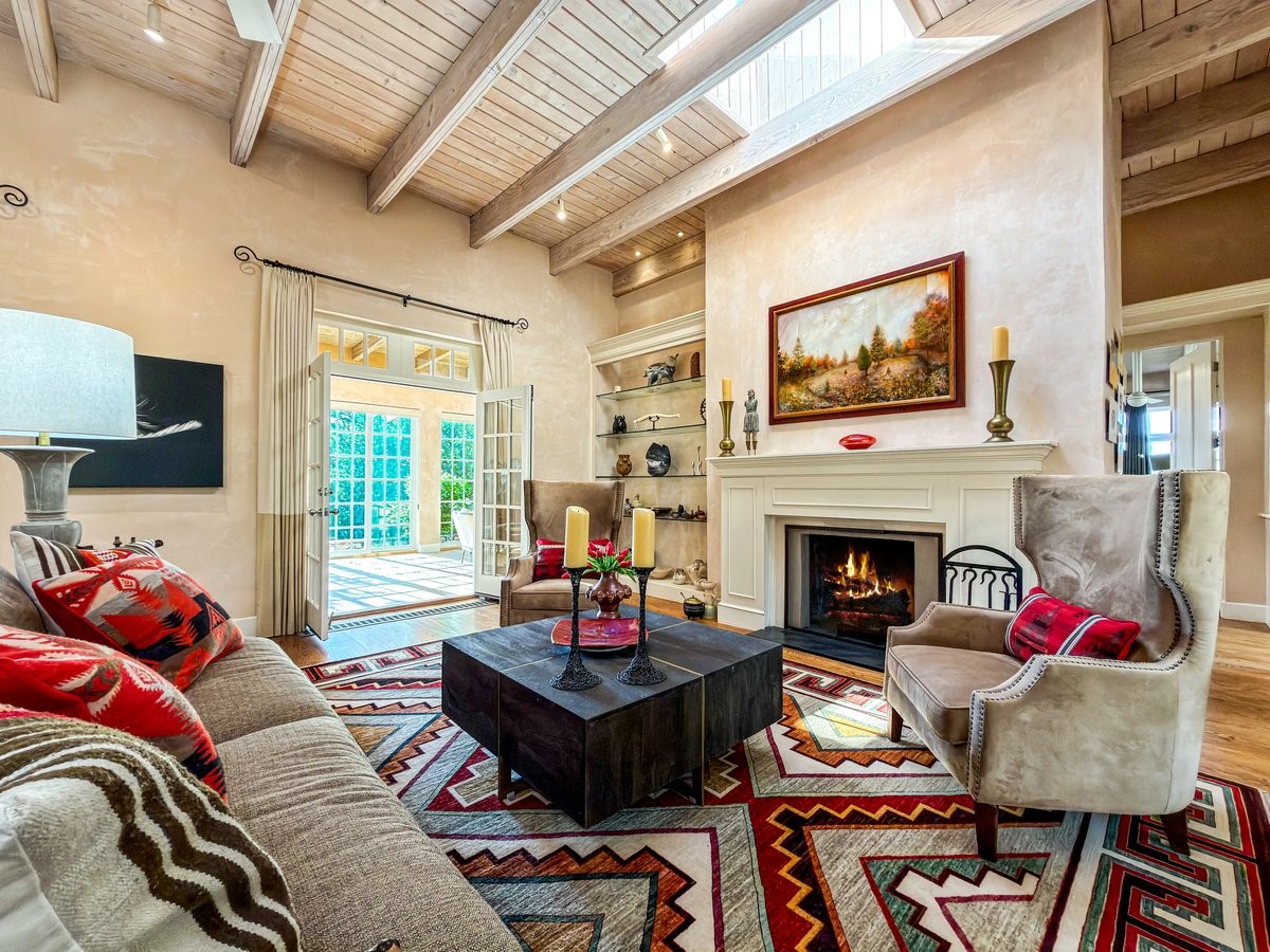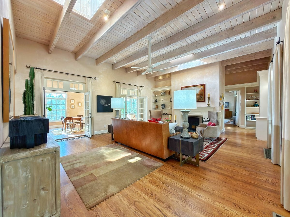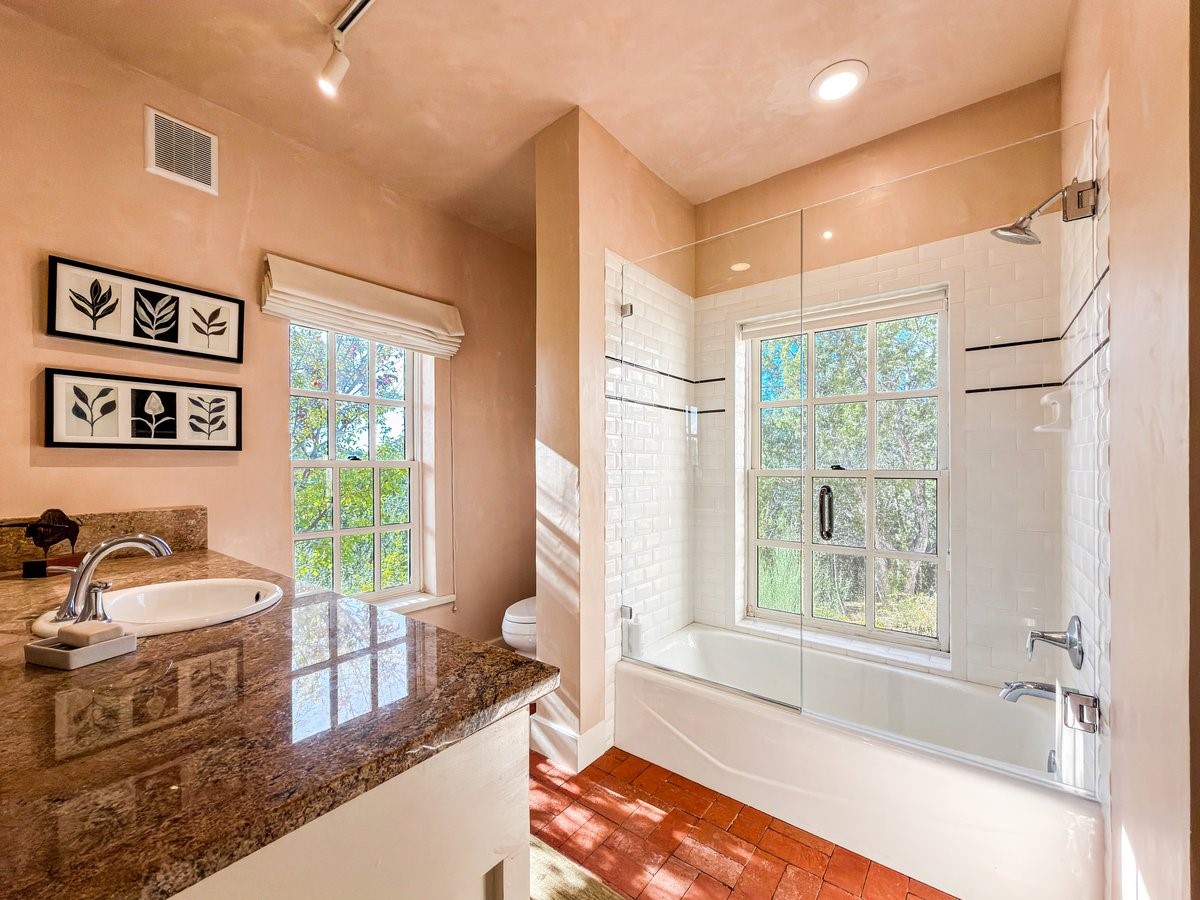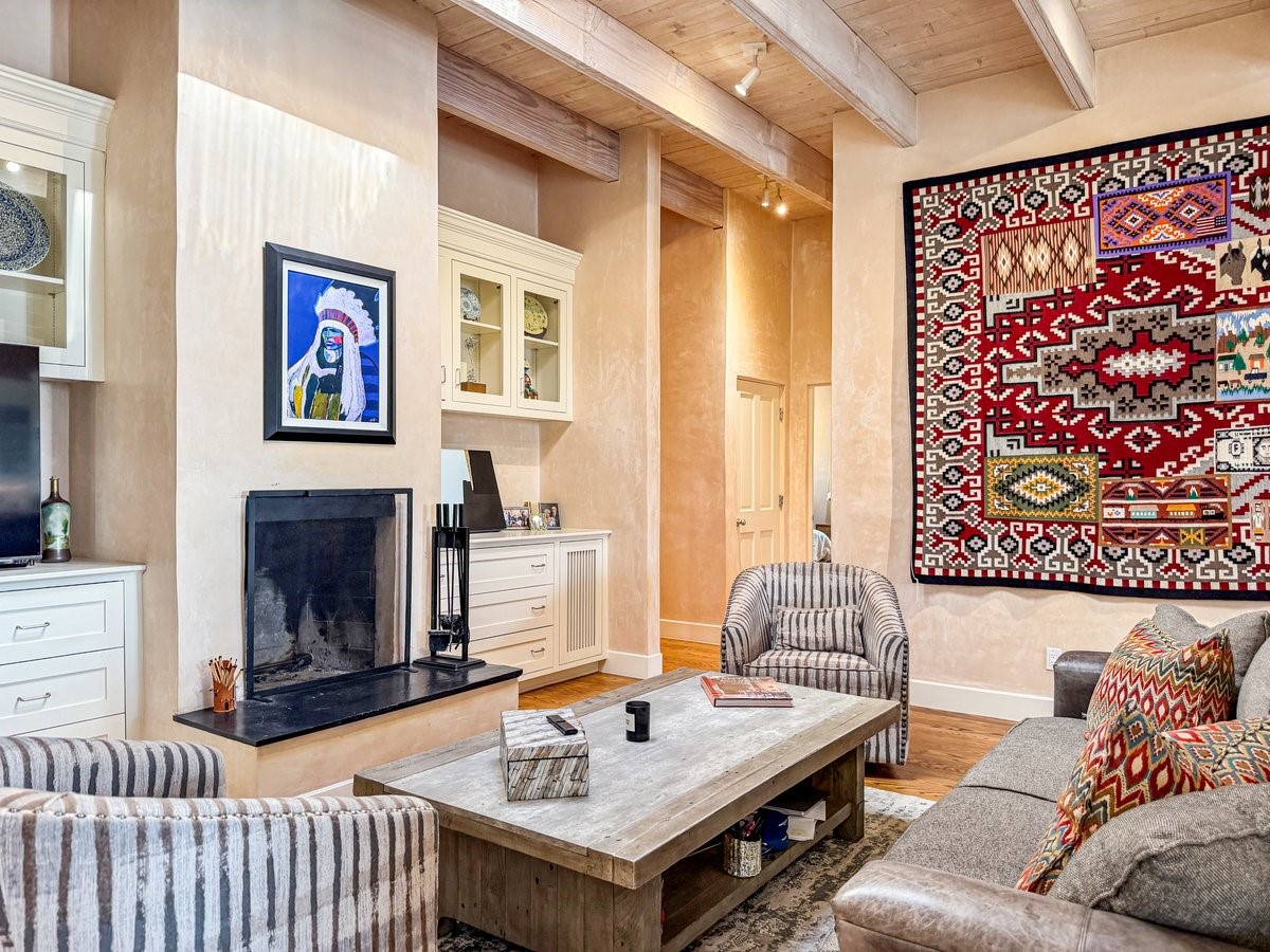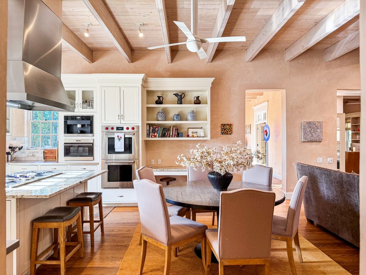 Nestled on 1.7 acres of lush, landscaped grounds near Bishop's Lodge Road, this timeless Territorial estate embodies the essence of Southwest living just five minutes from the Plaza. Behind a welcoming electronic gate, discover serene gardens and mature trees that set the tone for a private retreat filled with warmth and character. Inside, the residence unfolds with effortless grace, featuring hardwood and brick floors, tall ceilings and abundant natural light. The thoughtfully designed floor plan offers four bedrooms, three full baths, a three-quarter bath and a powder room, blending comfort and privacy throughout. Three inviting guest suites, each with its own en suite bath, are privately situated apart from the main living areas, providing an ideal layout for hosting family or friends. The elegant home captures the timeless charm of Santa Fe, where every detail invites relaxation and connection to the surrounding beauty.