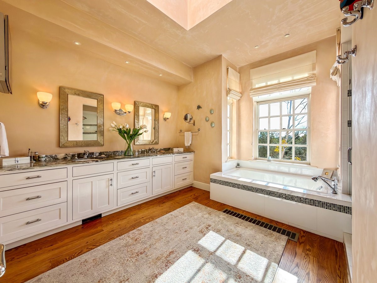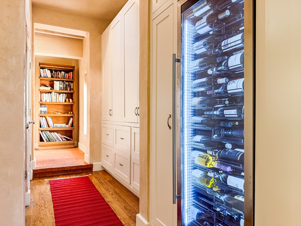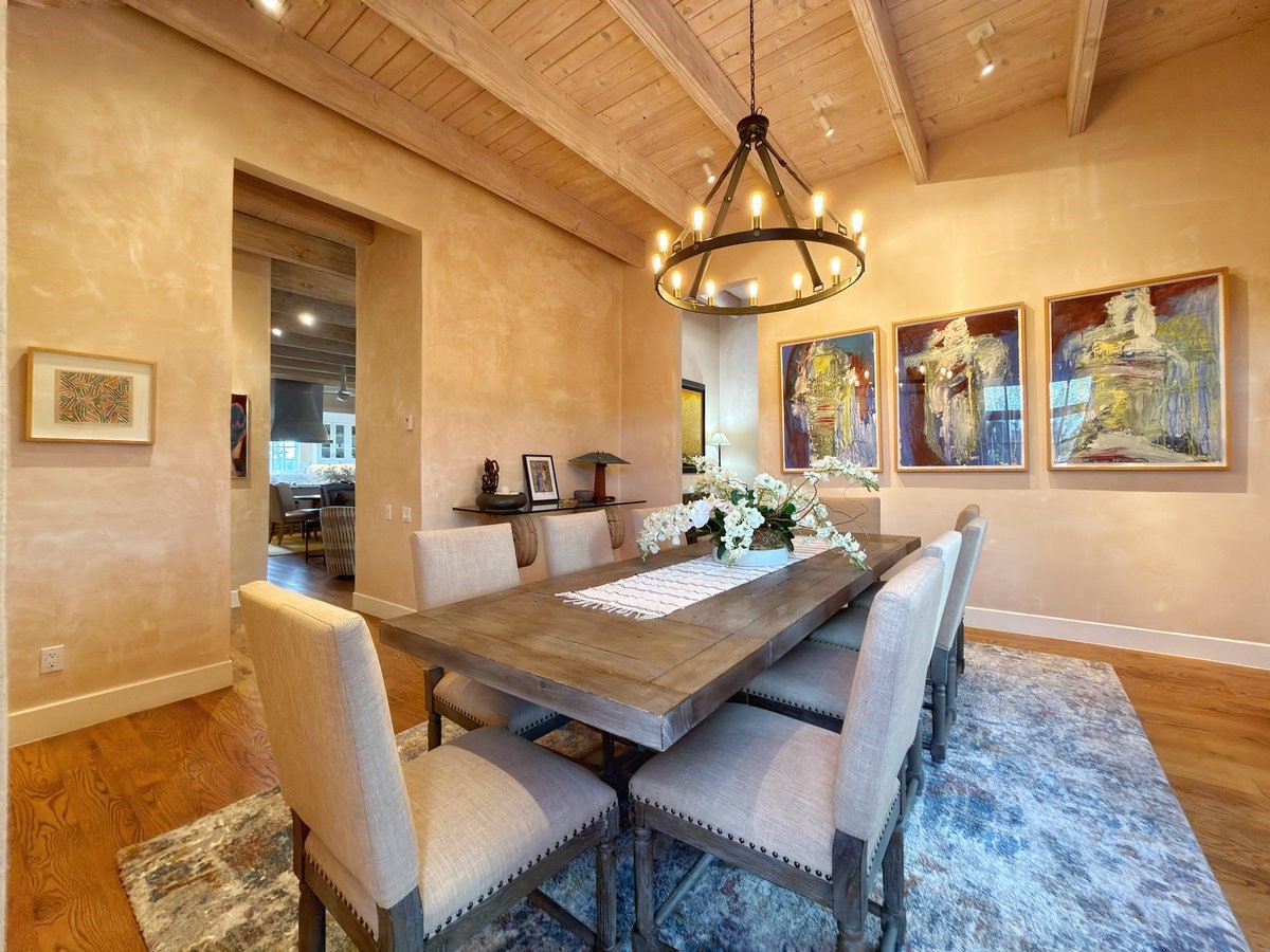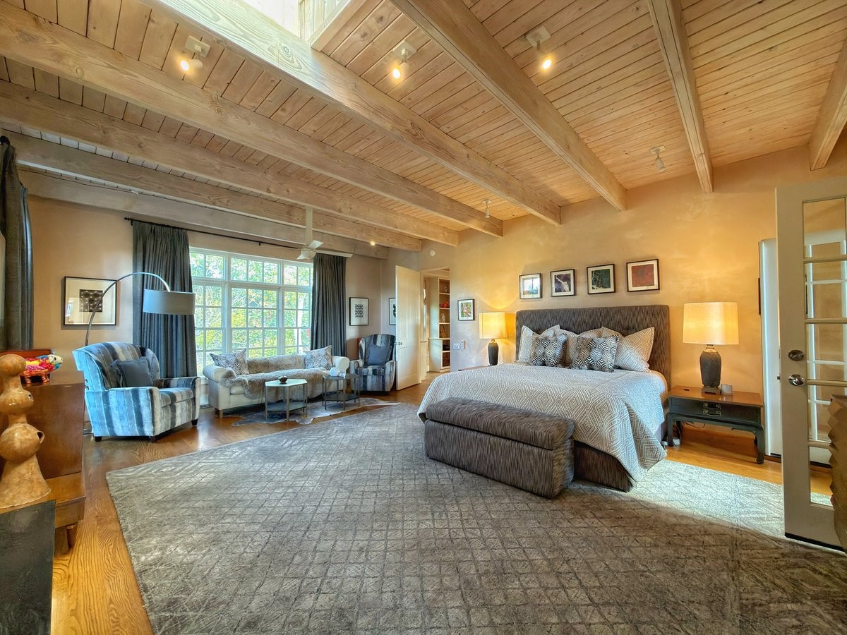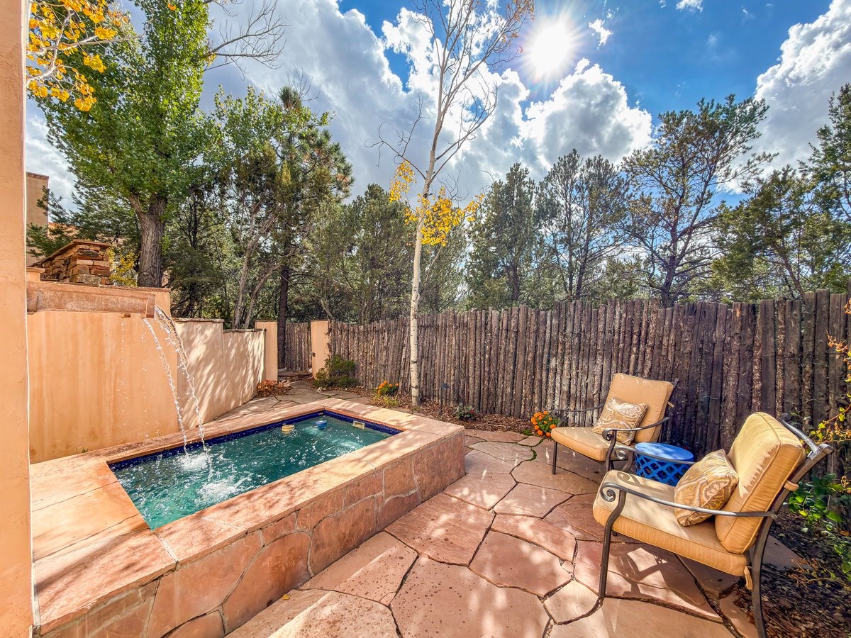 Nestled on 1.7 acres of lush, landscaped grounds near Bishop's Lodge Road, this timeless Territorial estate embodies the essence of Southwest living just five minutes from the Plaza. Behind a welcoming electronic gate, discover serene gardens and mature trees that set the tone for a private retreat filled with warmth and character. Inside, the residence unfolds with effortless grace, featuring hardwood and brick floors, tall ceilings and abundant natural light. The thoughtfully designed floor plan offers four bedrooms, three full baths, a three-quarter bath and a powder room, blending comfort and privacy throughout. Three inviting guest suites, each with its own en suite bath, are privately situated apart from the main living areas, providing an ideal layout for hosting family or friends. The elegant home captures the timeless charm of Santa Fe, where every detail invites relaxation and connection to the surrounding beauty.