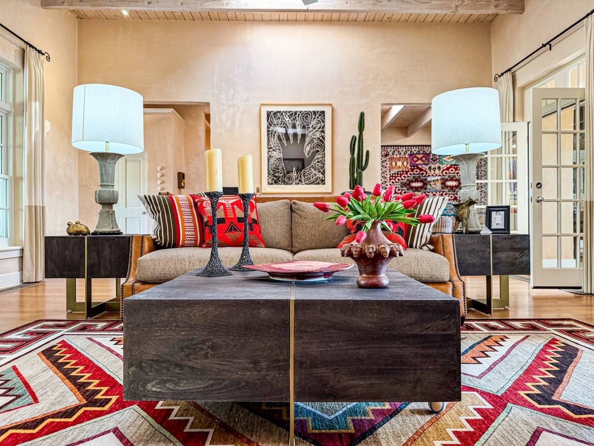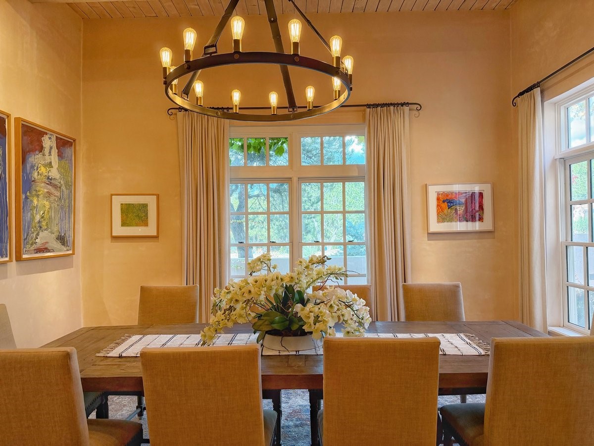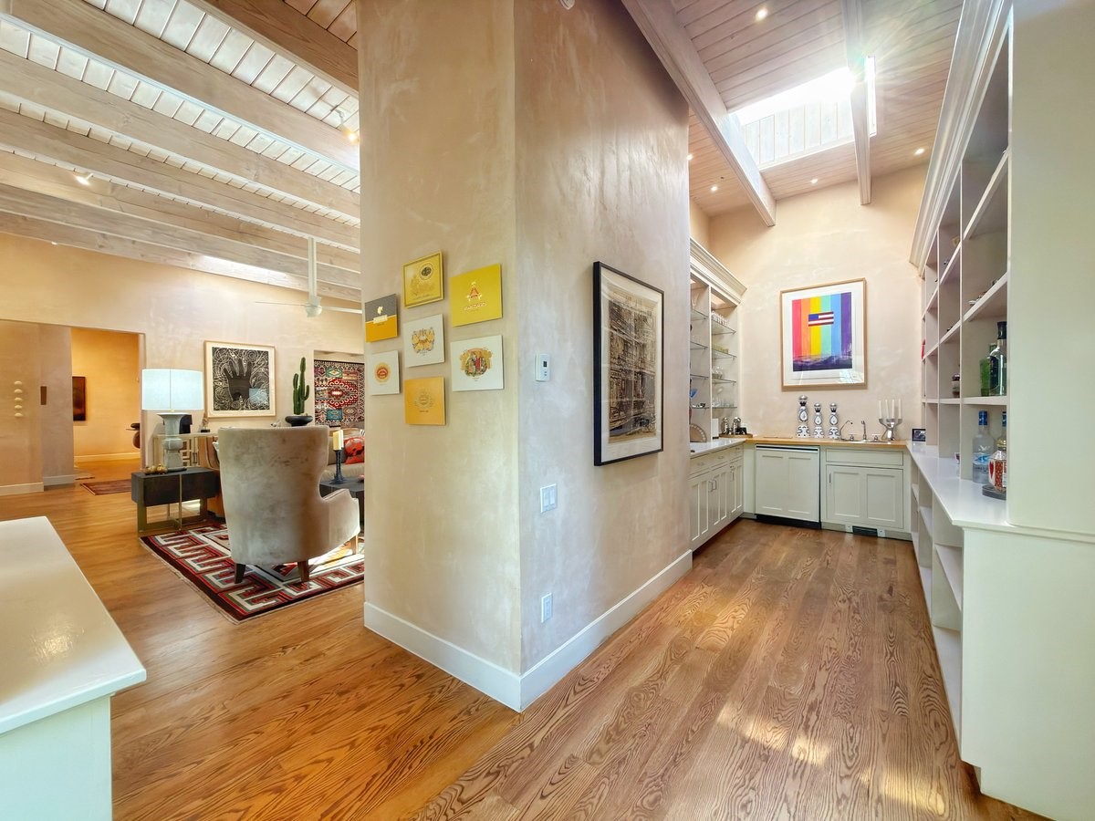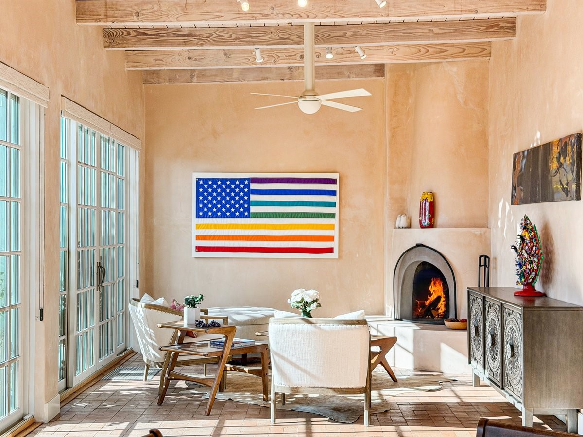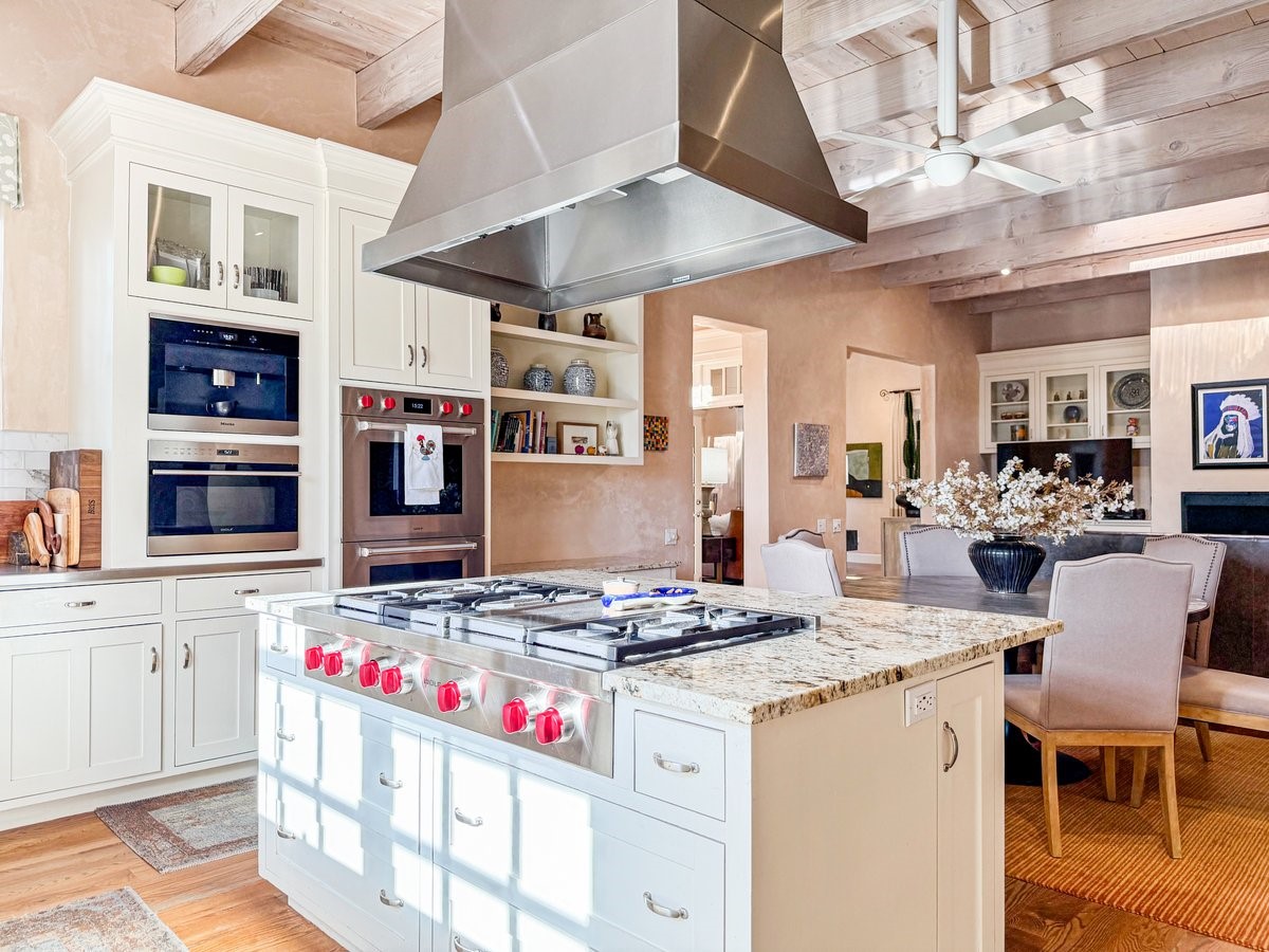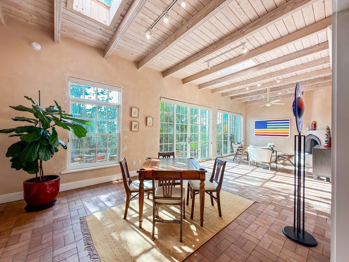 Nestled on 1.7 acres of lush, landscaped grounds near Bishop's Lodge Road, this timeless Territorial estate embodies the essence of Southwest living just five minutes from the Plaza. Behind a welcoming electronic gate, discover serene gardens and mature trees that set the tone for a private retreat filled with warmth and character. Inside, the residence unfolds with effortless grace, featuring hardwood and brick floors, tall ceilings and abundant natural light. The thoughtfully designed floor plan offers four bedrooms, three full baths, a three-quarter bath and a powder room, blending comfort and privacy throughout. Three inviting guest suites, each with its own en suite bath, are privately situated apart from the main living areas, providing an ideal layout for hosting family or friends. The elegant home captures the timeless charm of Santa Fe, where every detail invites relaxation and connection to the surrounding beauty.