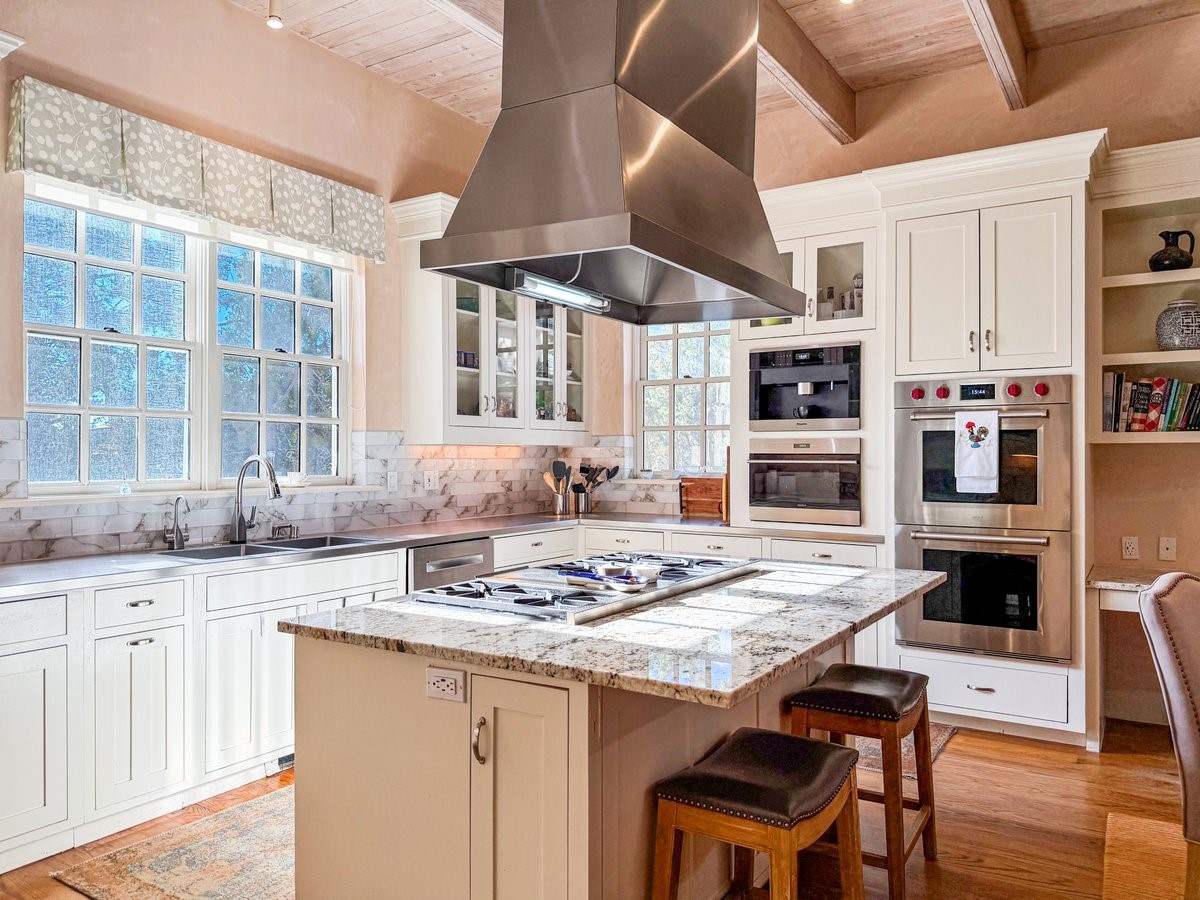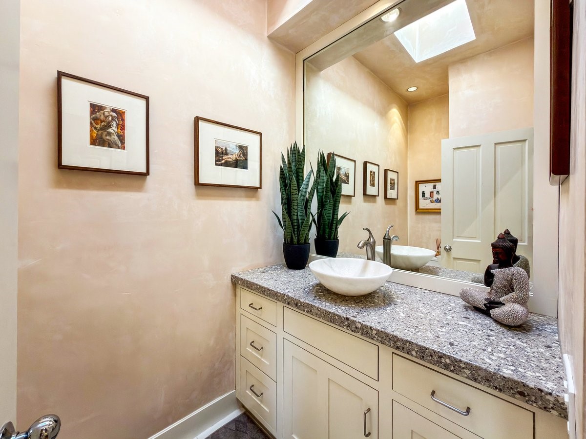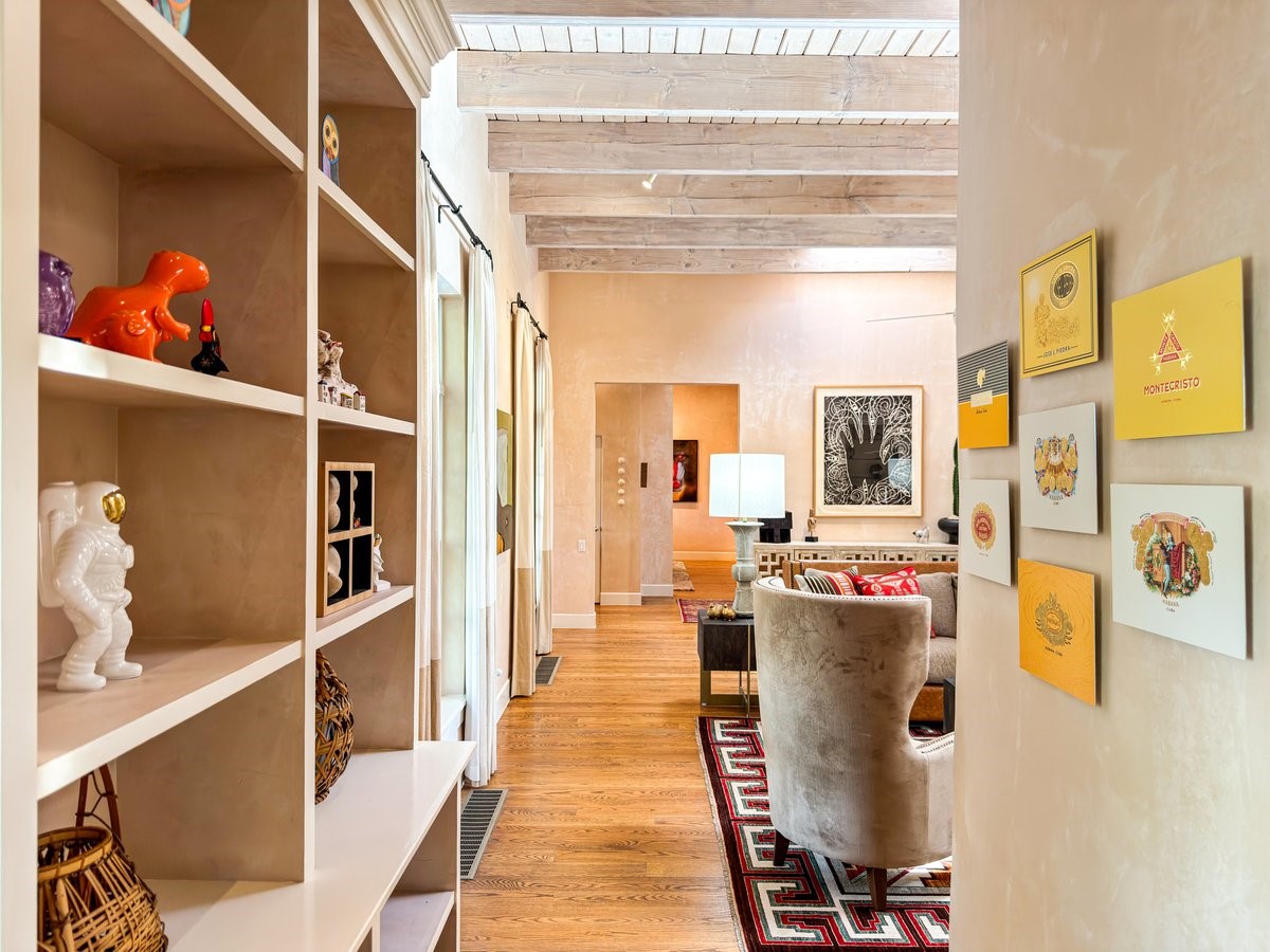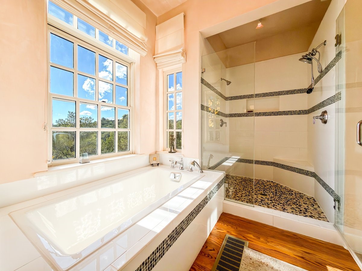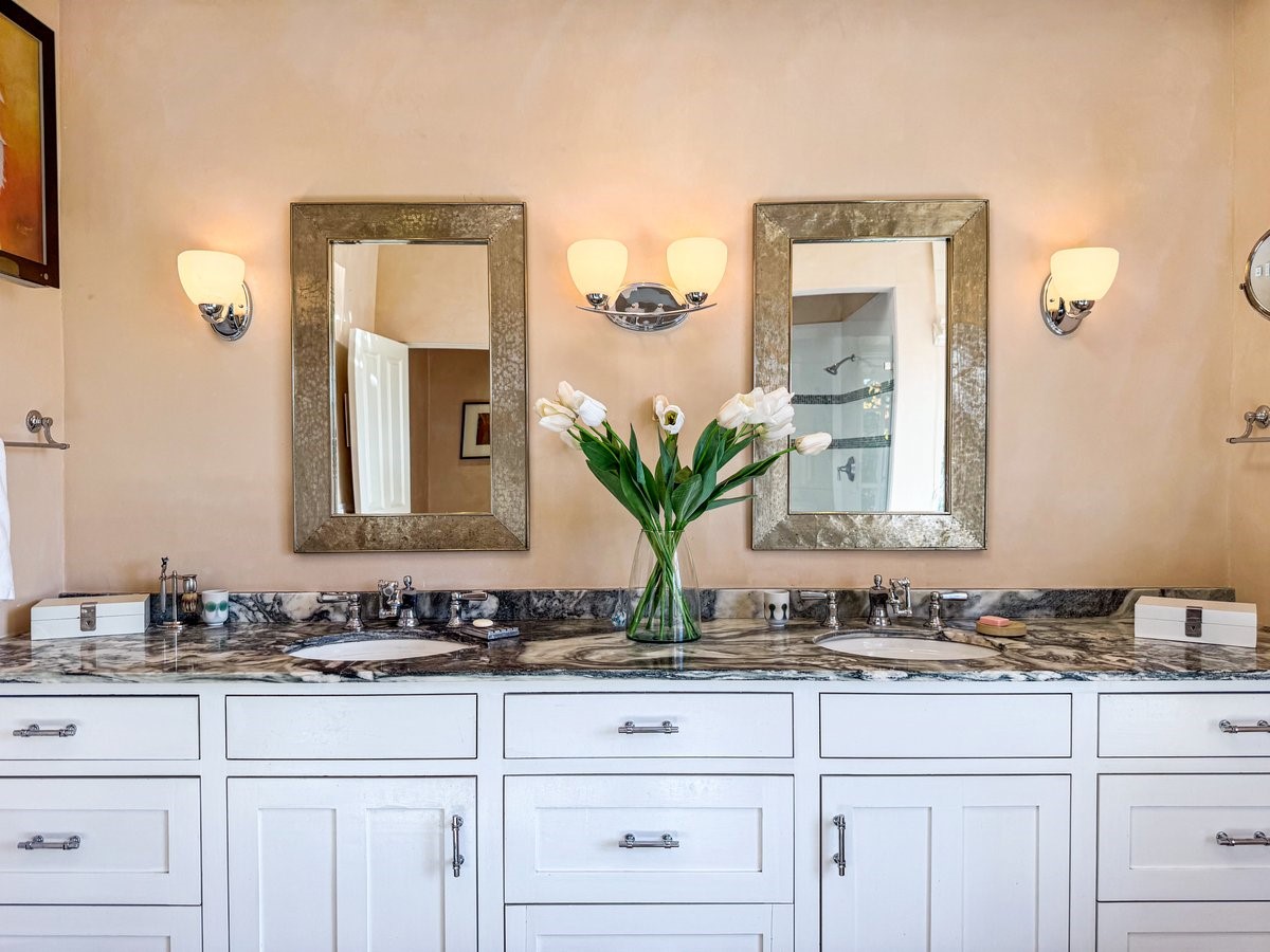 Nestled on 1.7 acres of lush, landscaped grounds near Bishop's Lodge Road, this timeless Territorial estate embodies the essence of Southwest living just five minutes from the Plaza. Behind a welcoming electronic gate, discover serene gardens and mature trees that set the tone for a private retreat filled with warmth and character. Inside, the residence unfolds with effortless grace, featuring hardwood and brick floors, tall ceilings and abundant natural light. The thoughtfully designed floor plan offers four bedrooms, three full baths, a three-quarter bath and a powder room, blending comfort and privacy throughout. Three inviting guest suites, each with its own en suite bath, are privately situated apart from the main living areas, providing an ideal layout for hosting family or friends. The elegant home captures the timeless charm of Santa Fe, where every detail invites relaxation and connection to the surrounding beauty.