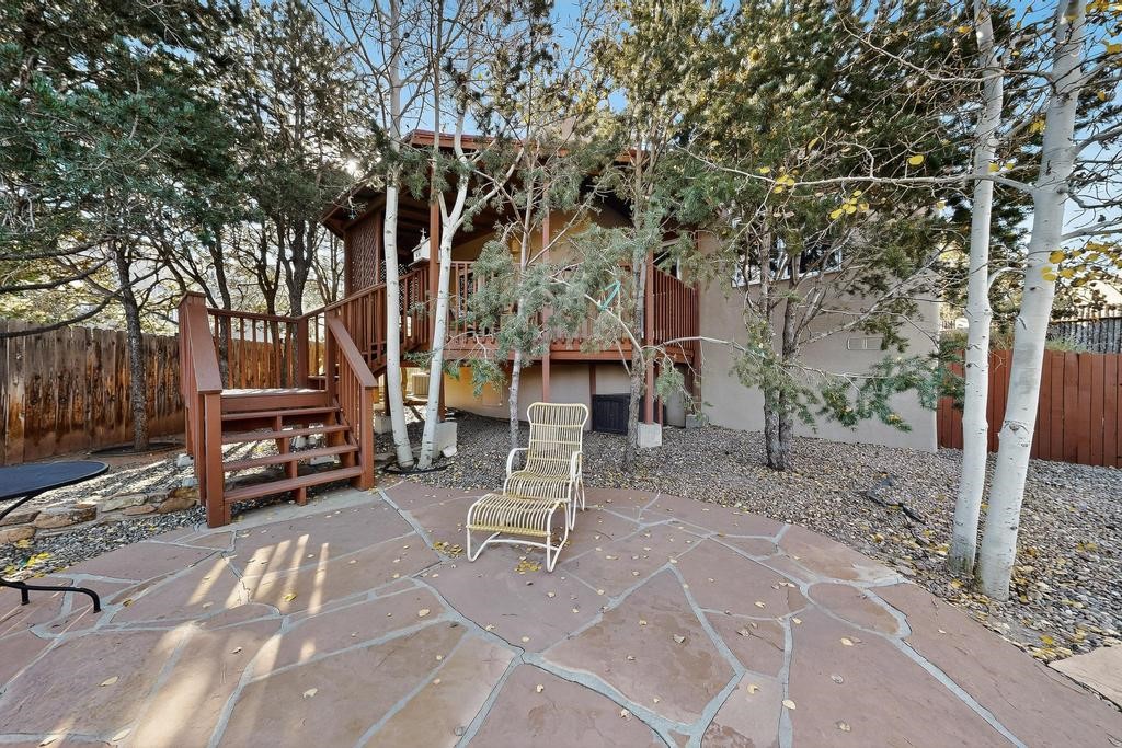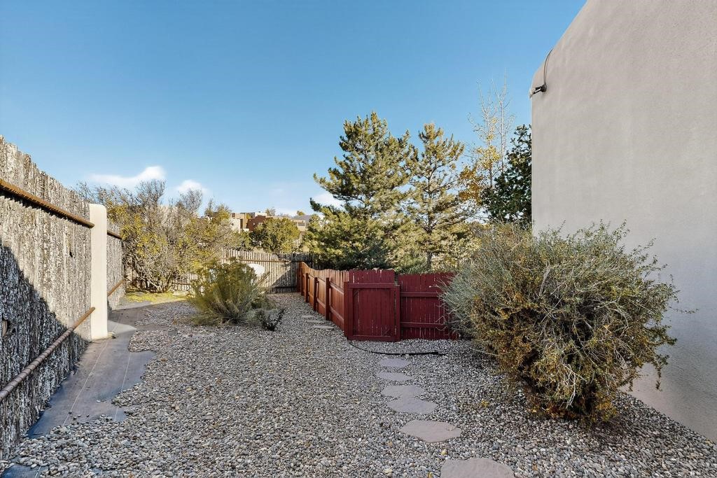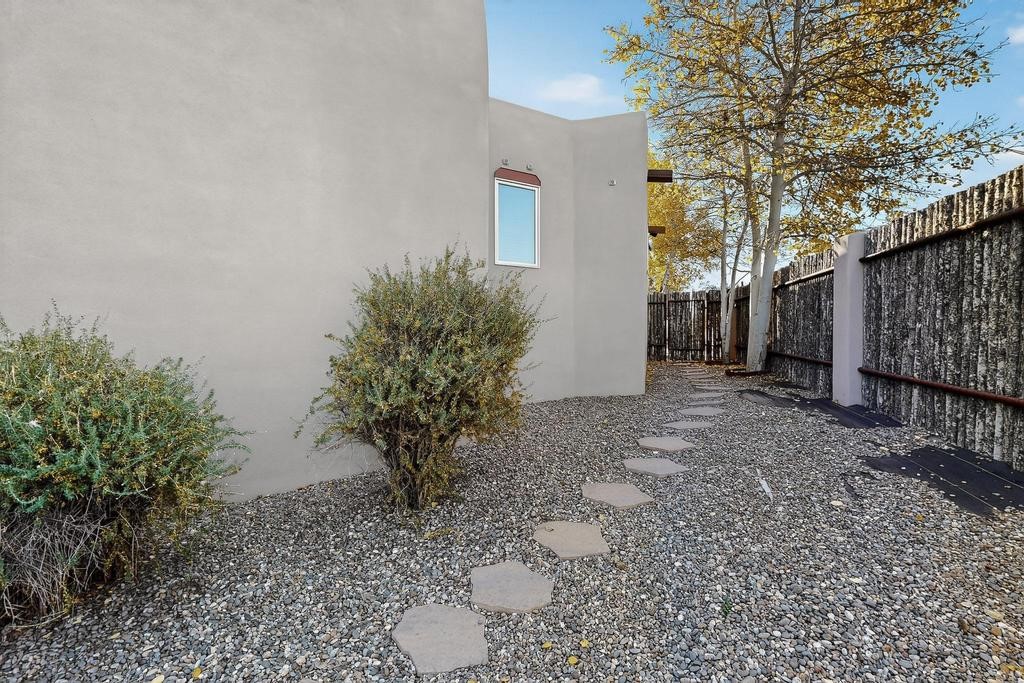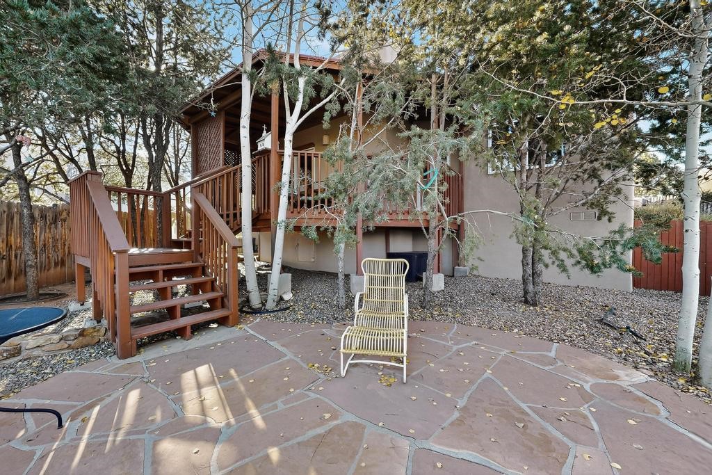 Don't miss this charming single-level home in Pueblos del Sol featuring three bedrooms and two bathrooms. This residence showcases classic Santa Fe details such as Vigas and a cozy Kiva fireplace. Lots of natural light streaming in from five skylights throughout the home. The home is positioned with southern exposure at the front and northern exposure at the rear. Mature trees provide exceptional privacy, with only one neighboring property. The surrounding trees and covered deck help keep the home cool in the summer, complemented by central air conditioning. Central heating ensures comfort and warmth throughout the winter months. The open floor plan provides great flow and comfortable bedroom separation, while the spacious deck with a solid portal--accessible from both the living room and primary bedroom--offers the perfect place to relax and enjoy the beautiful mountain views. York Central air conditioning and a two-car garage complete this wonderful Santa Fe home. Additionally, the raised subfloor design allows for easy access to plumbing for repairs or modifications. Situated on a large, beautifully landscaped corner lot with native plants and an apricot tree, the property backs onto a greenbelt for added privacy. Recent updates include a finished garage with a new door (2016), a new TPO roof (2021), new coyote and dog-eared fencing (2021), stucco patched and stained (2025), a new sump pump (2023), and a new tankless water heater (2025). We invite you to come take a look at this wonderful property.