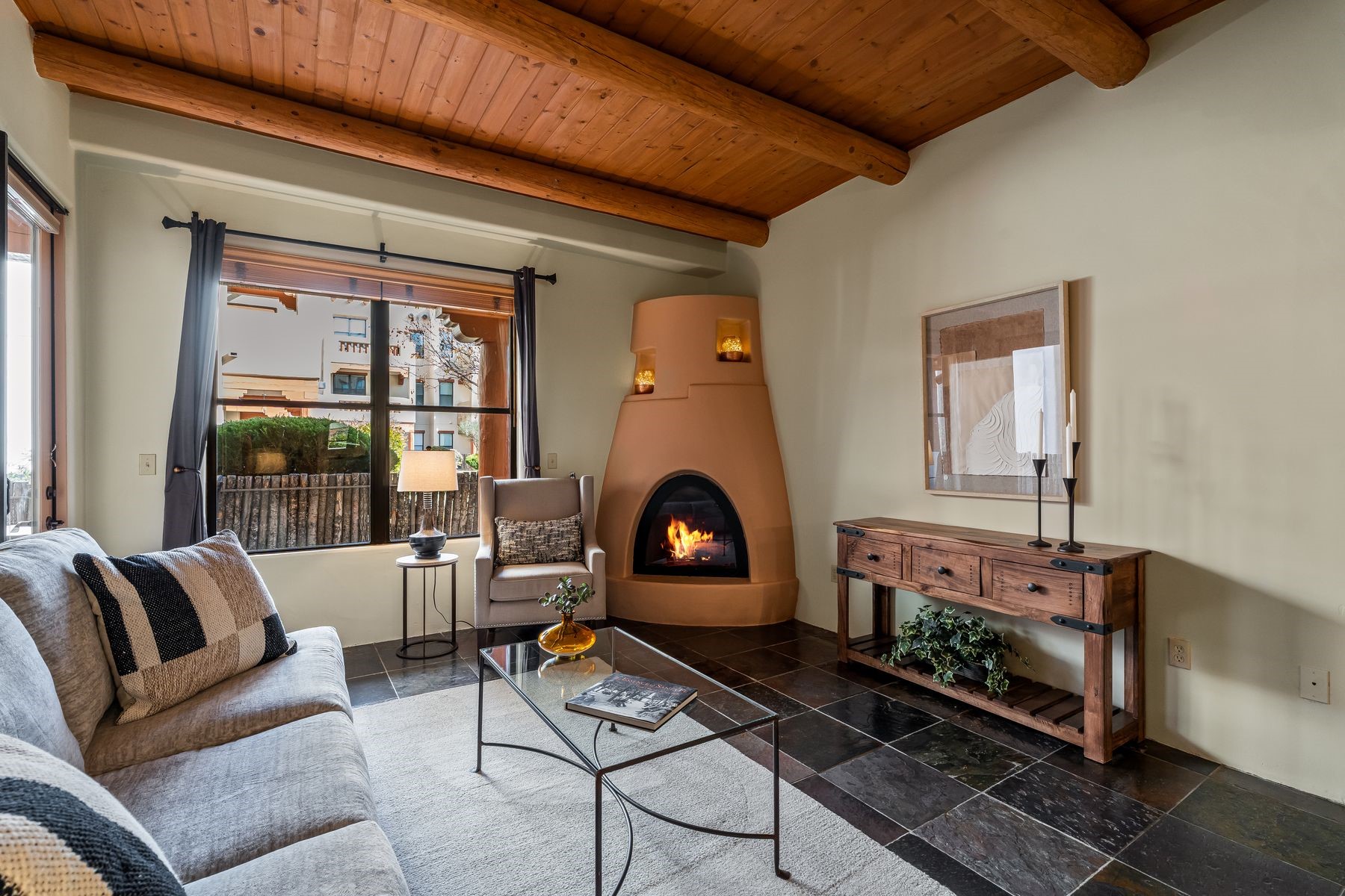 Live the life of luxury in this recently upgraded, ground floor, pool-side 2 bedroom/2 bathroom luxe condo at The Alameda! This exceptional unit is in a desirable corner location with a huge wrap around fenced private patio surrounded by landscaping. Just a few steps away is a heated pool with extensive seating, BBQ's and cabanas. Enjoy the fine architectural interior features of high ceilings, wood vigas, tongue and groove ceilings, corbels and a handsome corner gas kiva fireplace. Significant upgrades have been made to this unit including: All new paint, stripped and sealed slate flooring (no carpeting!), all new stainless steel appliances and sink, new hot water tank, new washer/dryer This unit includes a one-car garage and 115 square foot storage room. The Alameda is a luxury amenity condominium gated community that includes: Heated outside swimming pool; Fitness Center; Party Rooms with Kitchens and Lounge Areas throughout and a Dog Run. There is also an onsite professional manager and 24 hour controlled access. Fabulous location and close to shopping, dining and entertainment. This great opportunity can be yours solive La Dolce Vita and schedule your showing today!