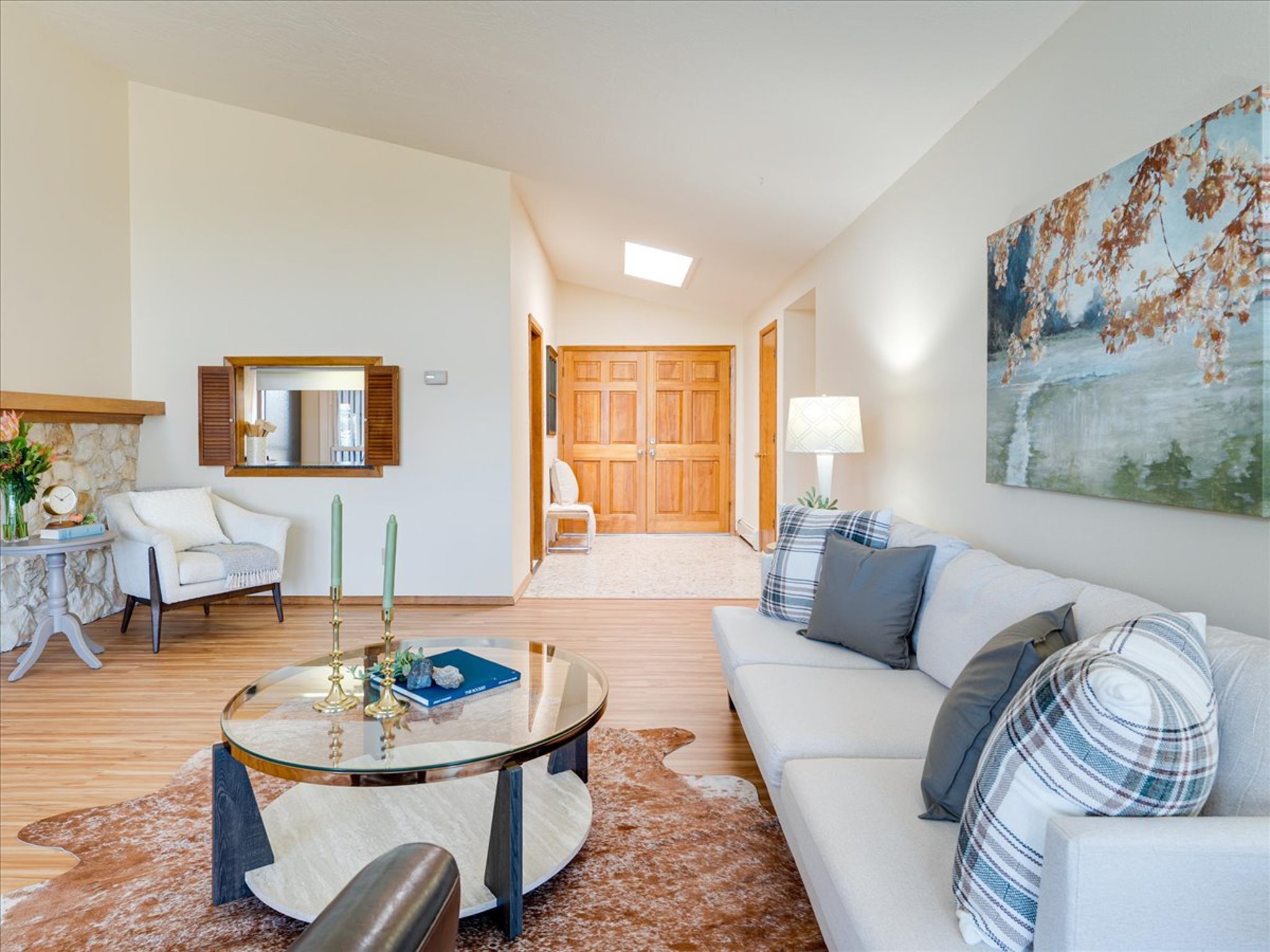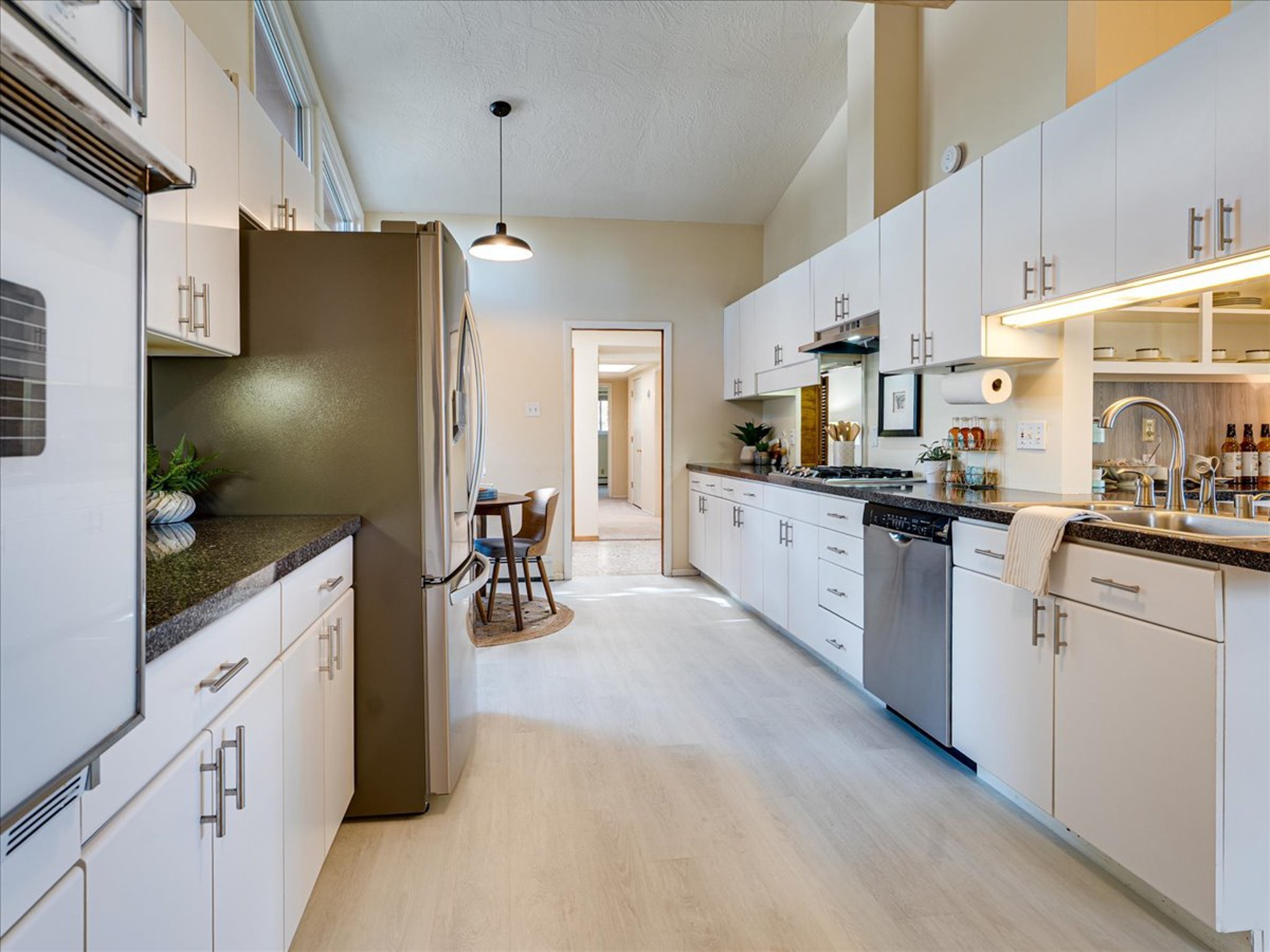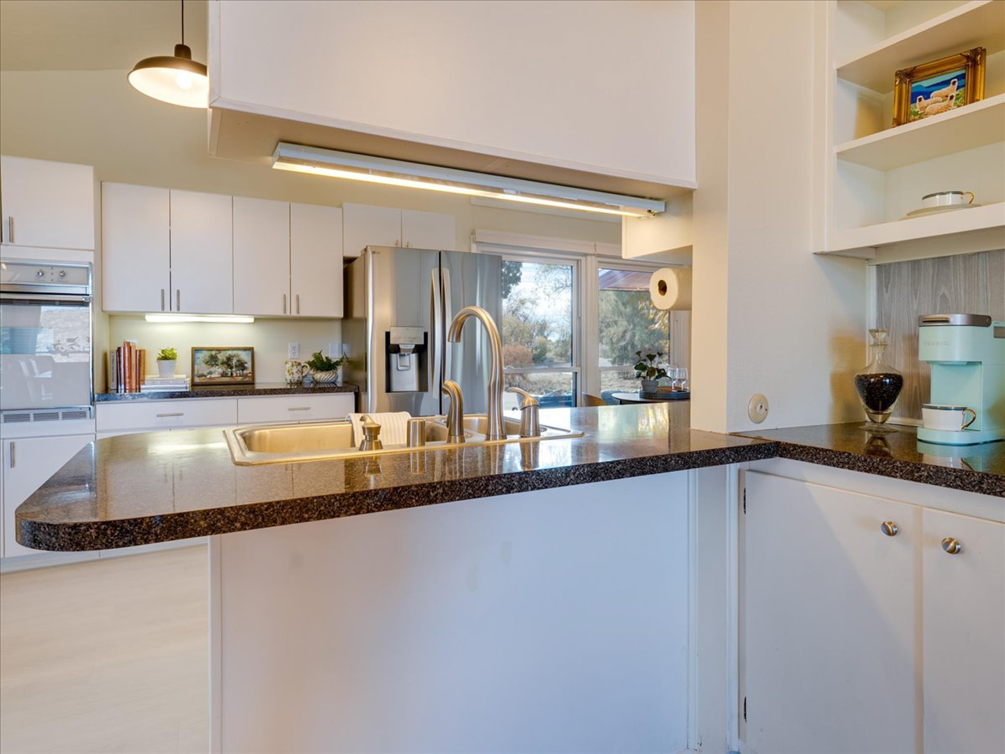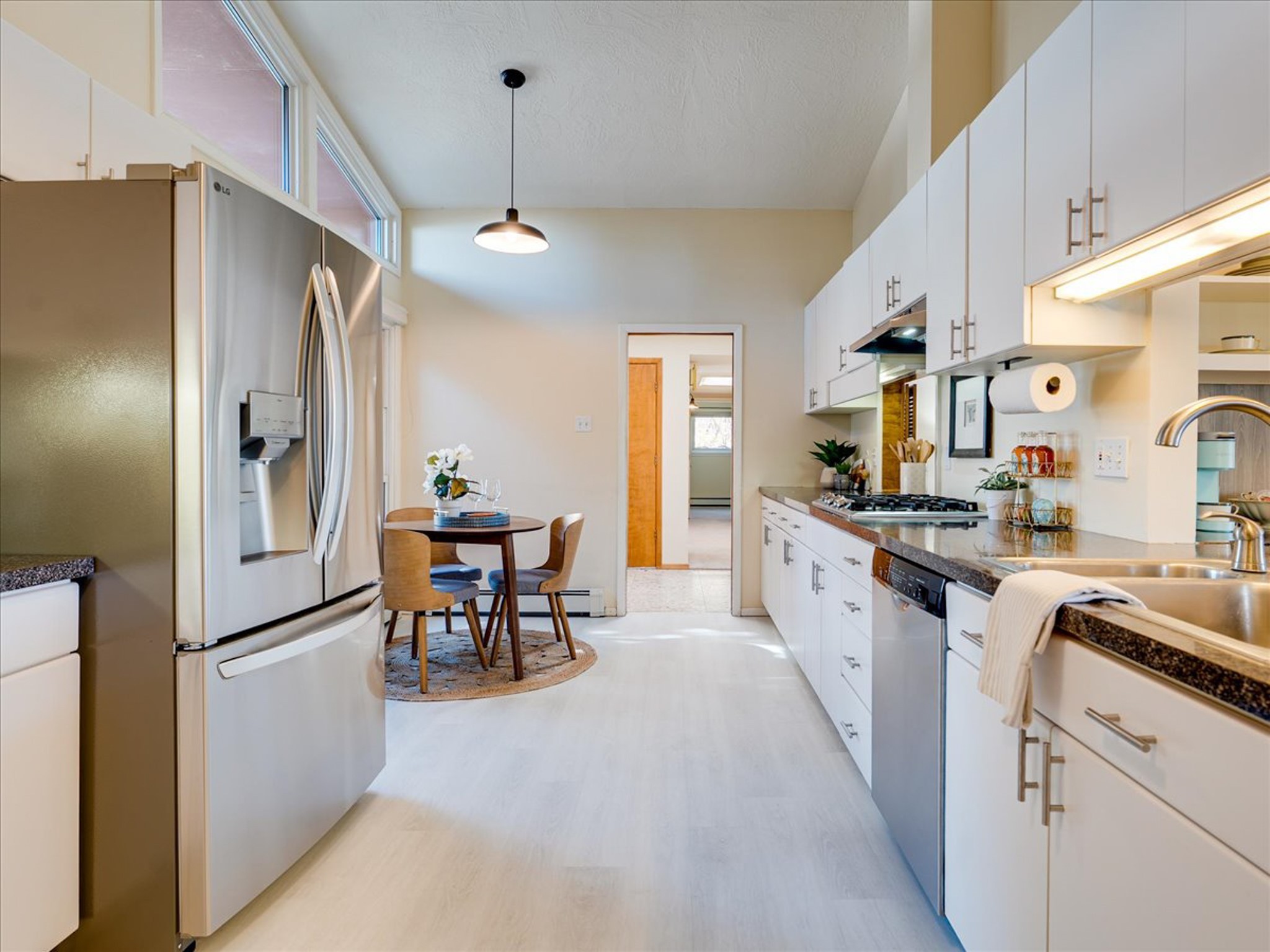Stunning Barranca Mesa home overlooking Rendija Canyon. Perched on a generous 0.335-acre canyon lot, this property offers the best of both worlds - expansive outdoor space paired with sweeping canyon views. Mature pine trees provide natural beauty, shade, and privacy. Inside, a spacious living room features floor-to-ceiling picture windows and a striking raw-edge quartz fireplace with a wraparound mantle that flows into the dining room, which is large enough to serve as a second living area. The bright white kitchen offers ample room for an eat-in nook, pantry, and the adjacent laundry room provides direct garage access, functioning perfectly as a mudroom or drop zone. The primary suite includes a built-in vanity, a walk-in closet, and large windows facing the canyon. Three additional bedrooms and a guest bath complete the floor plan. From the dining room, step out onto a lovely balcony overlooking the canyon, ideal for morning coffee or evening sunsets. You'll also find a fenced dog run with low-maintenance artificial turf, perfect for pets. Recent updates include a new roof (2024), a new heating system (2025), new flooring (2025), a refrigerator (2025), interior paint (2025), new blinds in the living room, family room, kitchen, and a bedroom (2025), and newer double-pane windows (2005). This is a rare opportunity to own a beautiful home with unmatched canyon views on Barranca Mesa. This one is not to be missed! Schedule a private showing today. Disclosure: Owner Broker