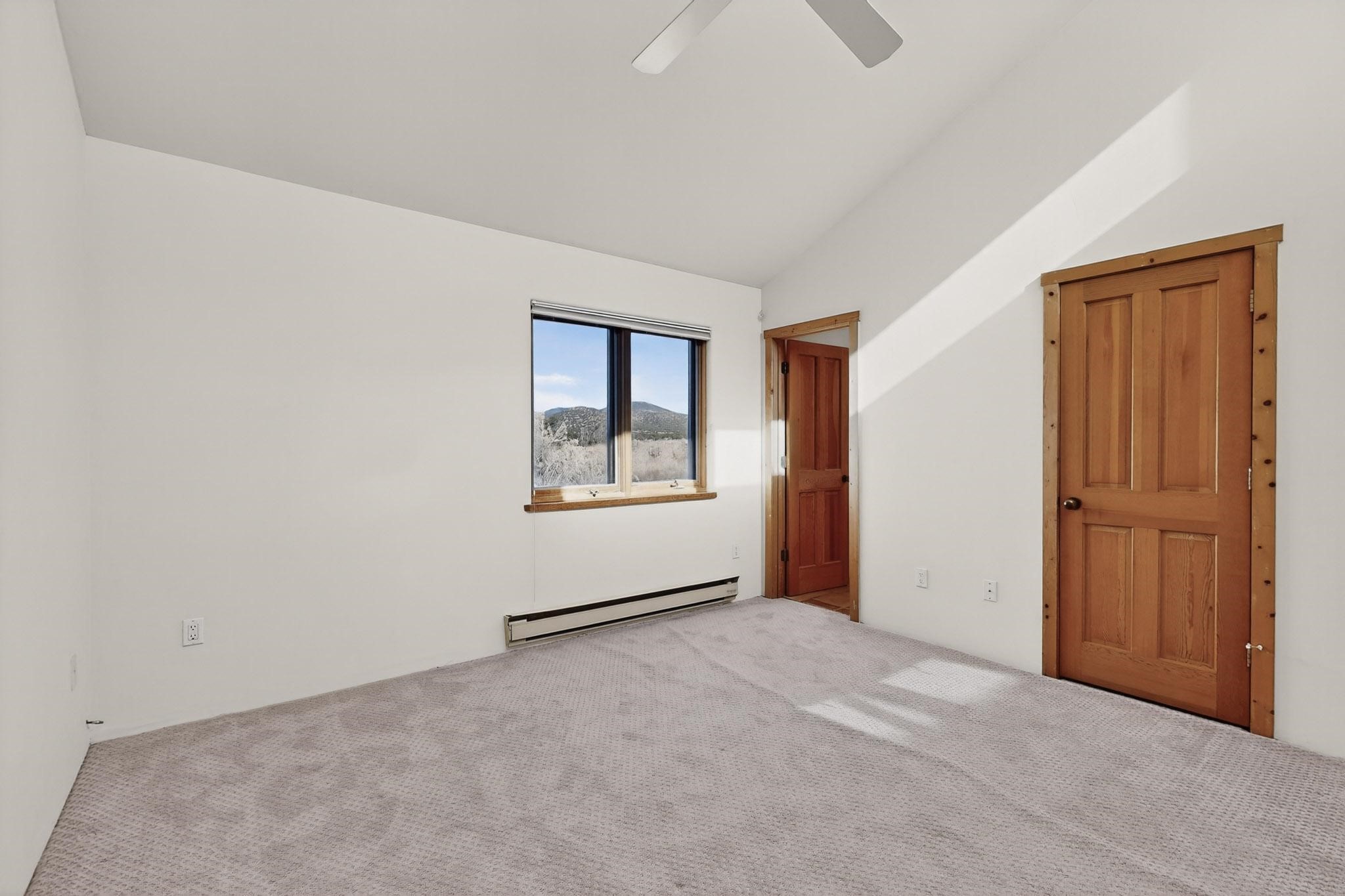 Located on an expansive Eldorado open space this is ideal for the night sky and naturalist enthusiast. Lovely traditional open plan, 1840sf passive solar design built by James Garton in 1990. The sunny split bedroom floorpan provides excellent separation for the main bedroom from the two guest bedrooms plus there is also a separate studio/den. Gleaming Santa Fe style saltillo tile and brick floors and beam ceilings throughout most rooms. Long south facing windows replaced in 2020, bring in the winter heat with overhangs adding shade in the summer.. A new TPO roof was installed in 2022. All appliances have been replaced in the last 5 years, and the hot water heater was replaced in 2020. There is a whole house filtering system, and a private front view brick patio added in 2021. here is an oversized 2 car garage plus plenty of guest parking. This home is accessed by paved roads and is within easy reach of Eldorado amenities, local shopping, schools, library and the senior center, only minutes into Santa Fe.