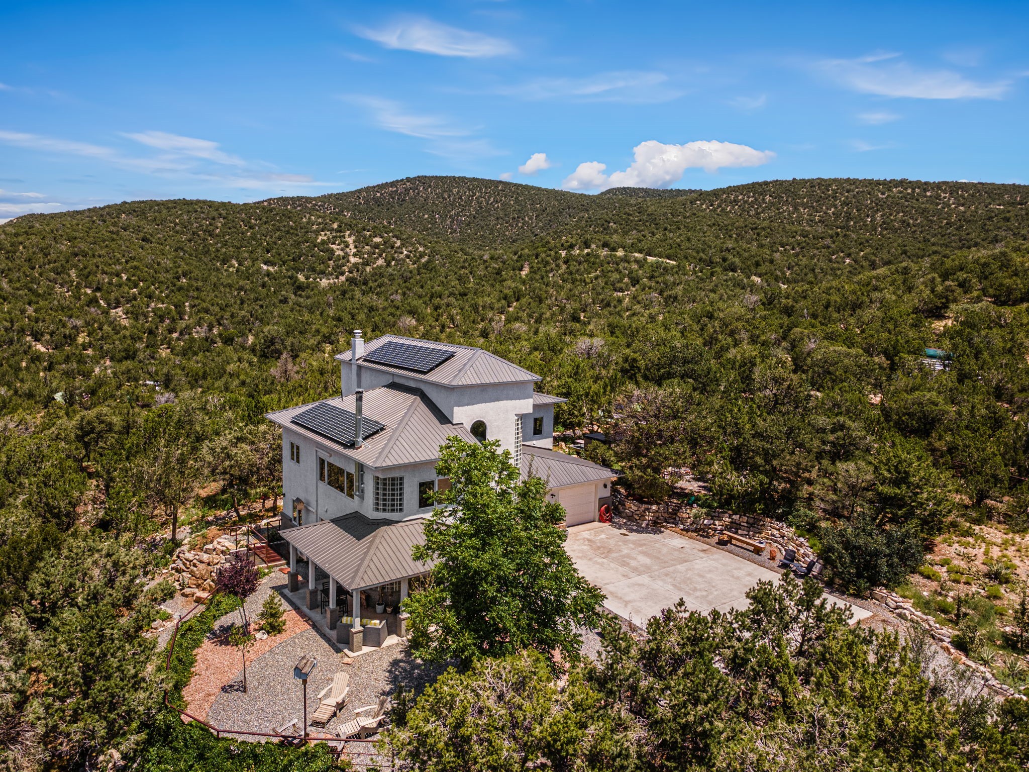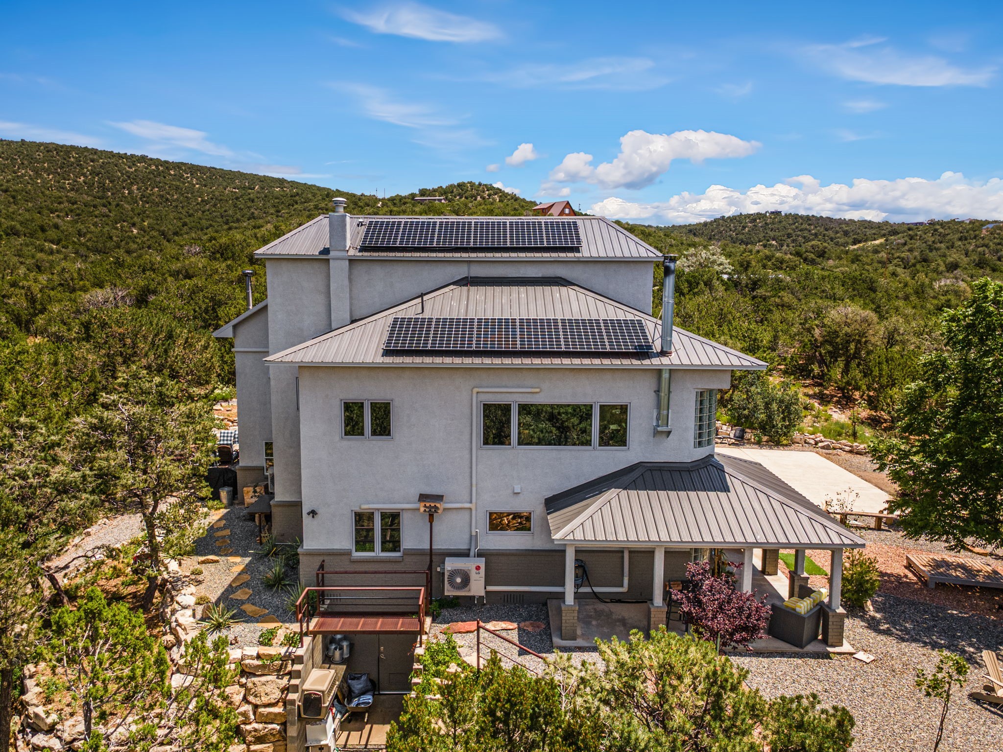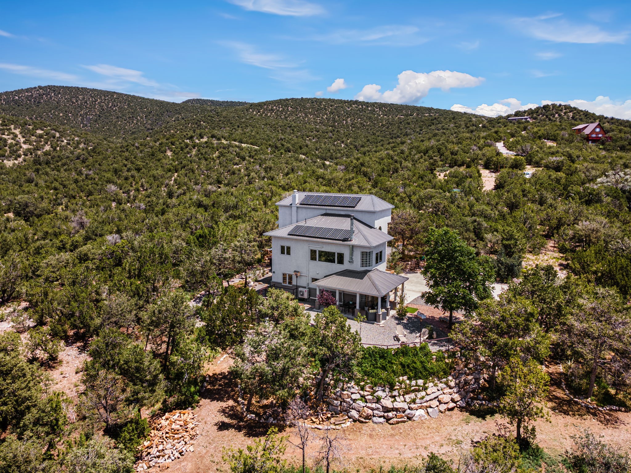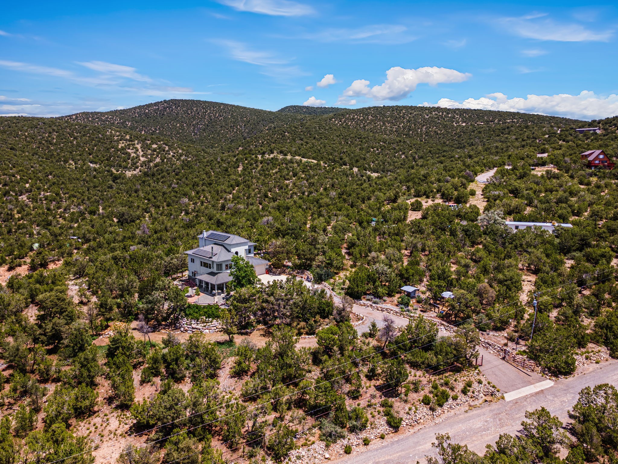 This updated home situated on 4.68 acres & 2 lots, zoned A-2, NO HOA & additional 820 sq. ft Bunker like basement is one of the most unique in the east mountains. It features an oversized 33.9x24 tandem style garage, automatic gate, vaulted ceilings, natural light, exposed wood beams, large casement windows, multiple outdoor seating areas, hot tub purchased 11/1/24, community water-no well. 3 sources of heat: Radiant baseboard, 6 Mini Splits& Wood stove. Solar panels that will be paid off by the Seller with acceptable offer. The views are stunning! The home is open & inviting. The property will take your breath away. Outdoor features include an oversized chair facing the Sandias for a beautiful sunset view, access through back gate, chicken coop and goat pen and much more