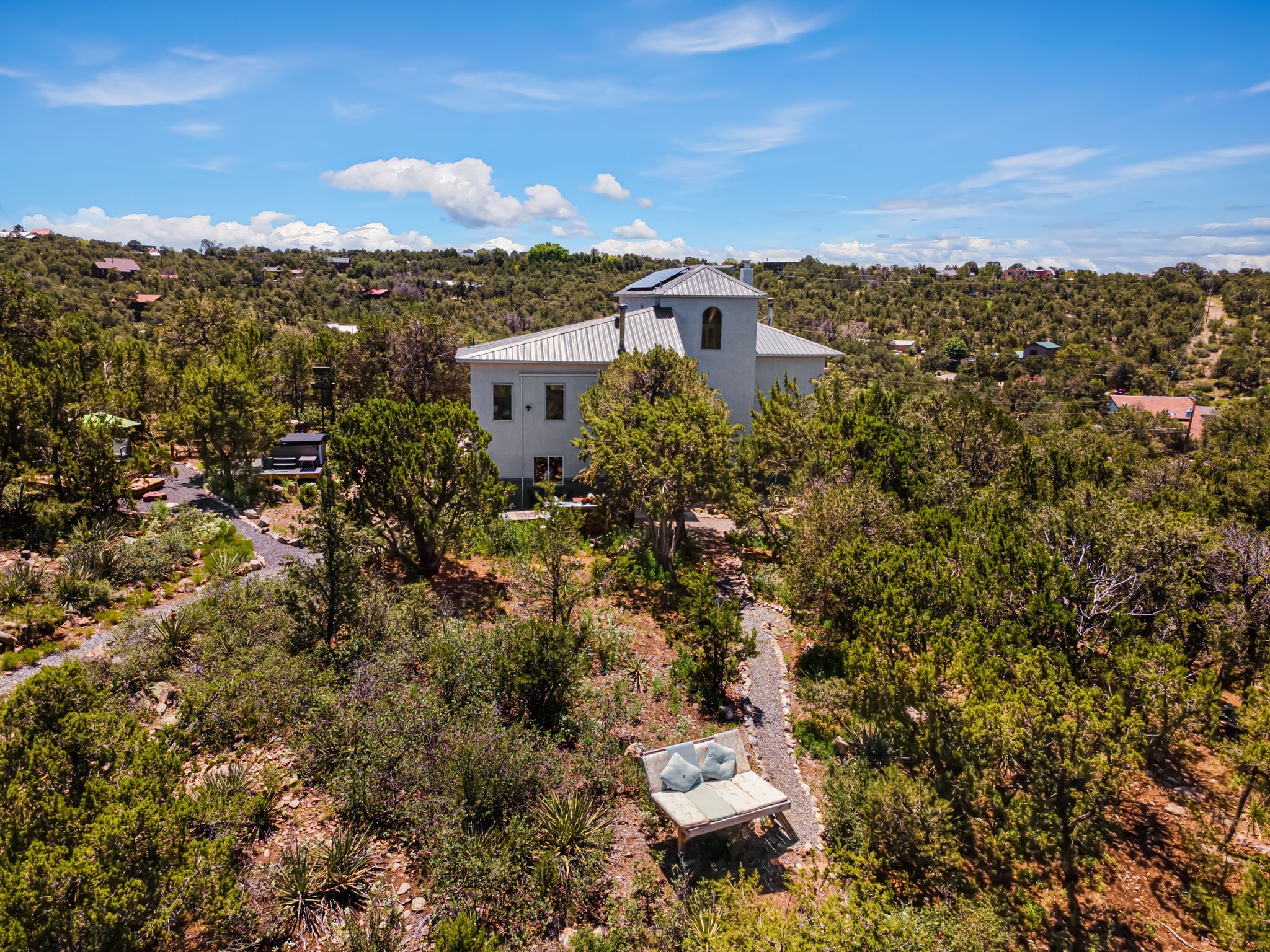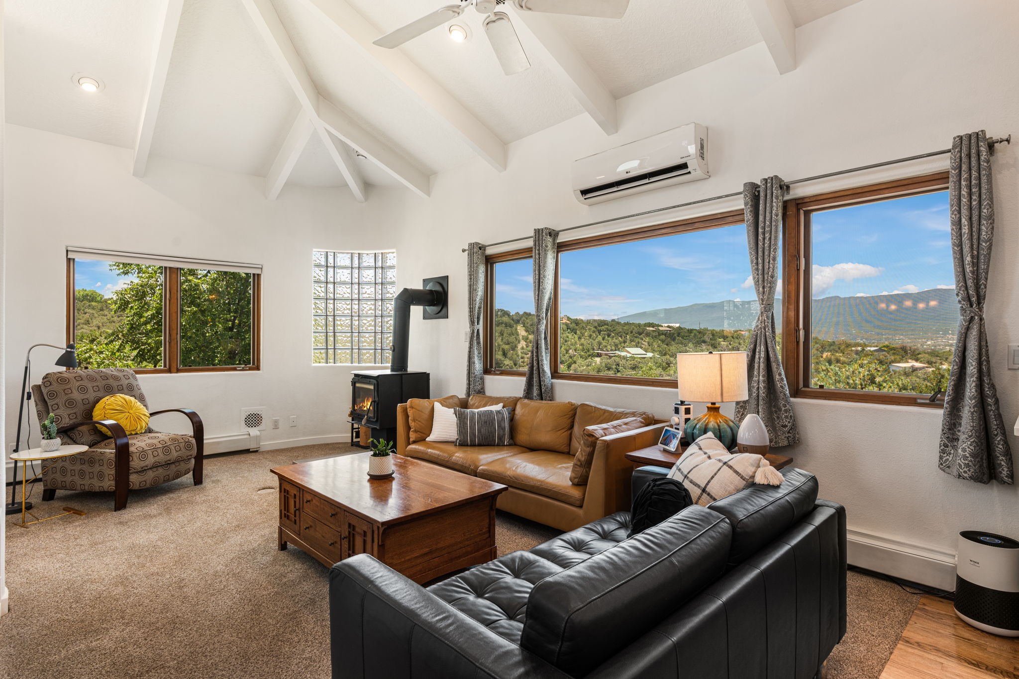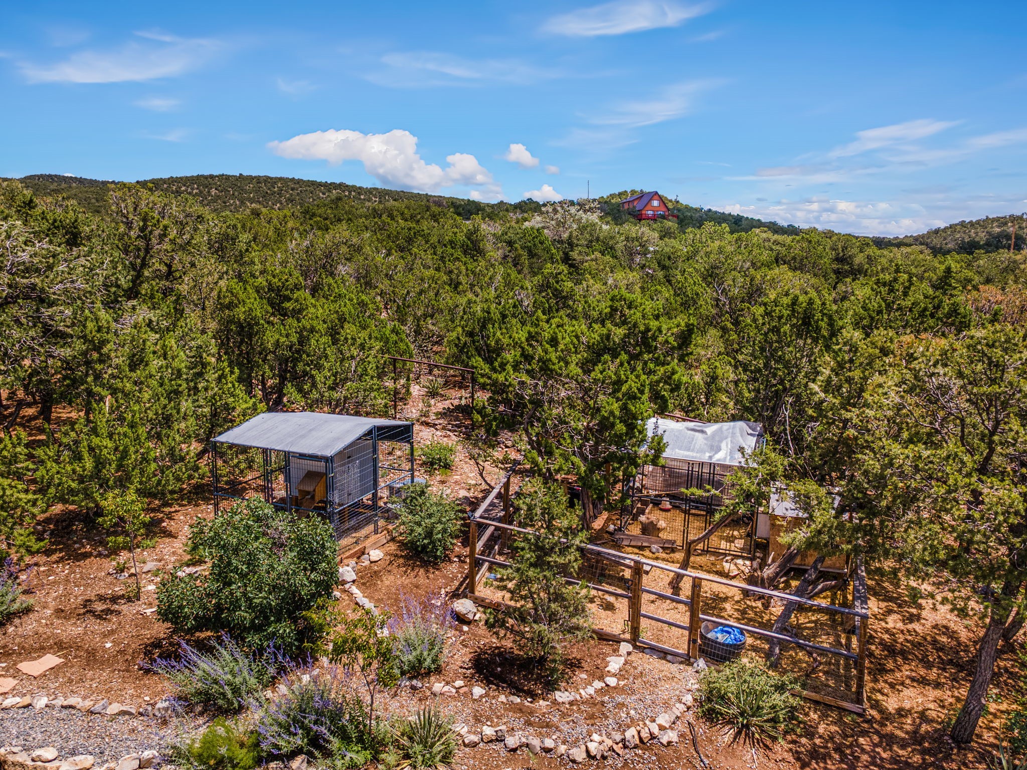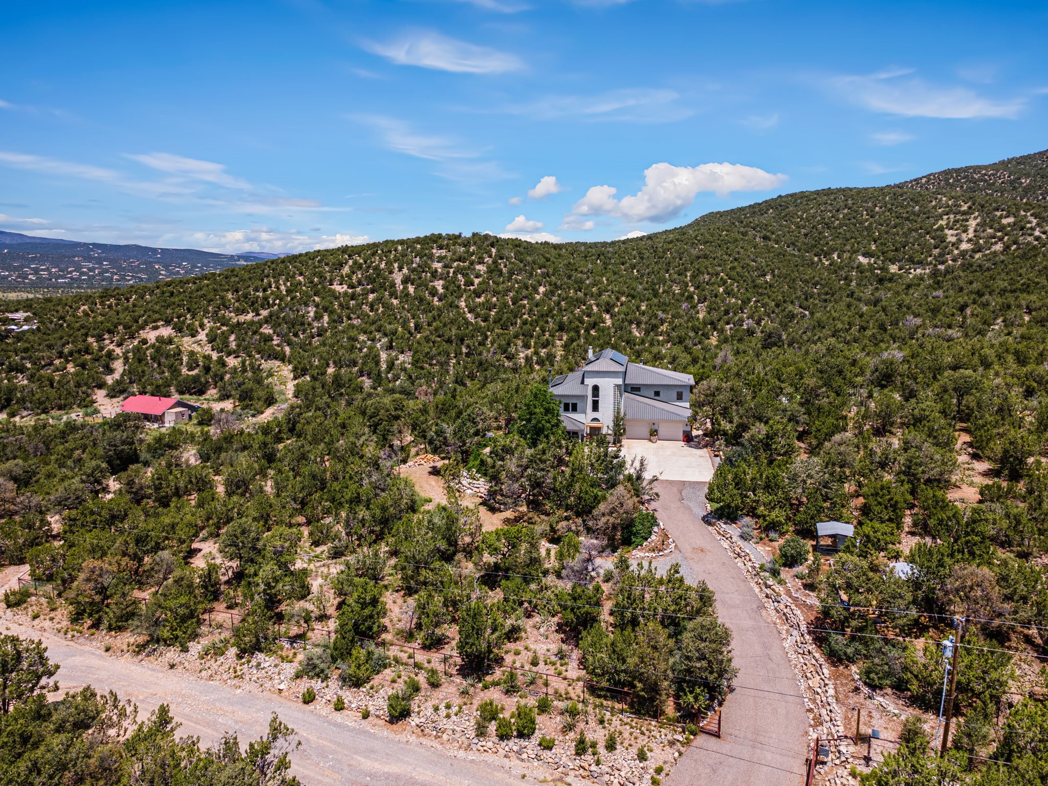 This updated home situated on 4.68 acres & 2 lots, zoned A-2, NO HOA & additional 820 sq. ft Bunker like basement is one of the most unique in the east mountains. It features an oversized 33.9x24 tandem style garage, automatic gate, vaulted ceilings, natural light, exposed wood beams, large casement windows, multiple outdoor seating areas, hot tub purchased 11/1/24, community water-no well. 3 sources of heat: Radiant baseboard, 6 Mini Splits& Wood stove. Solar panels that will be paid off by the Seller with acceptable offer. The views are stunning! The home is open & inviting. The property will take your breath away. Outdoor features include an oversized chair facing the Sandias for a beautiful sunset view, access through back gate, chicken coop and goat pen and much more