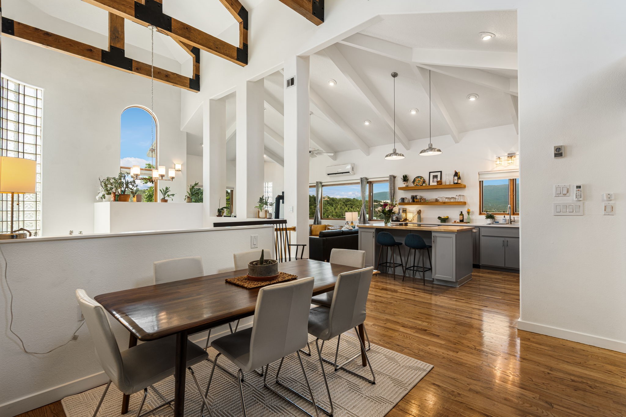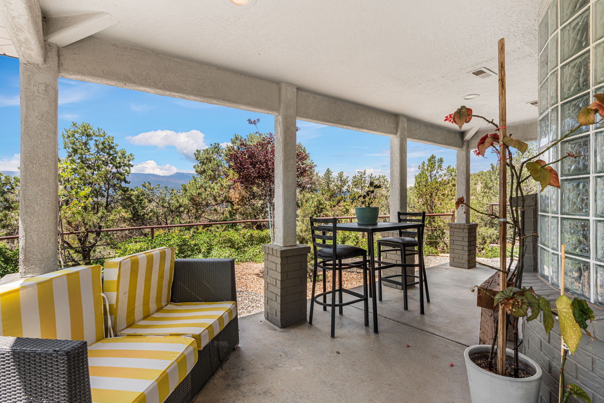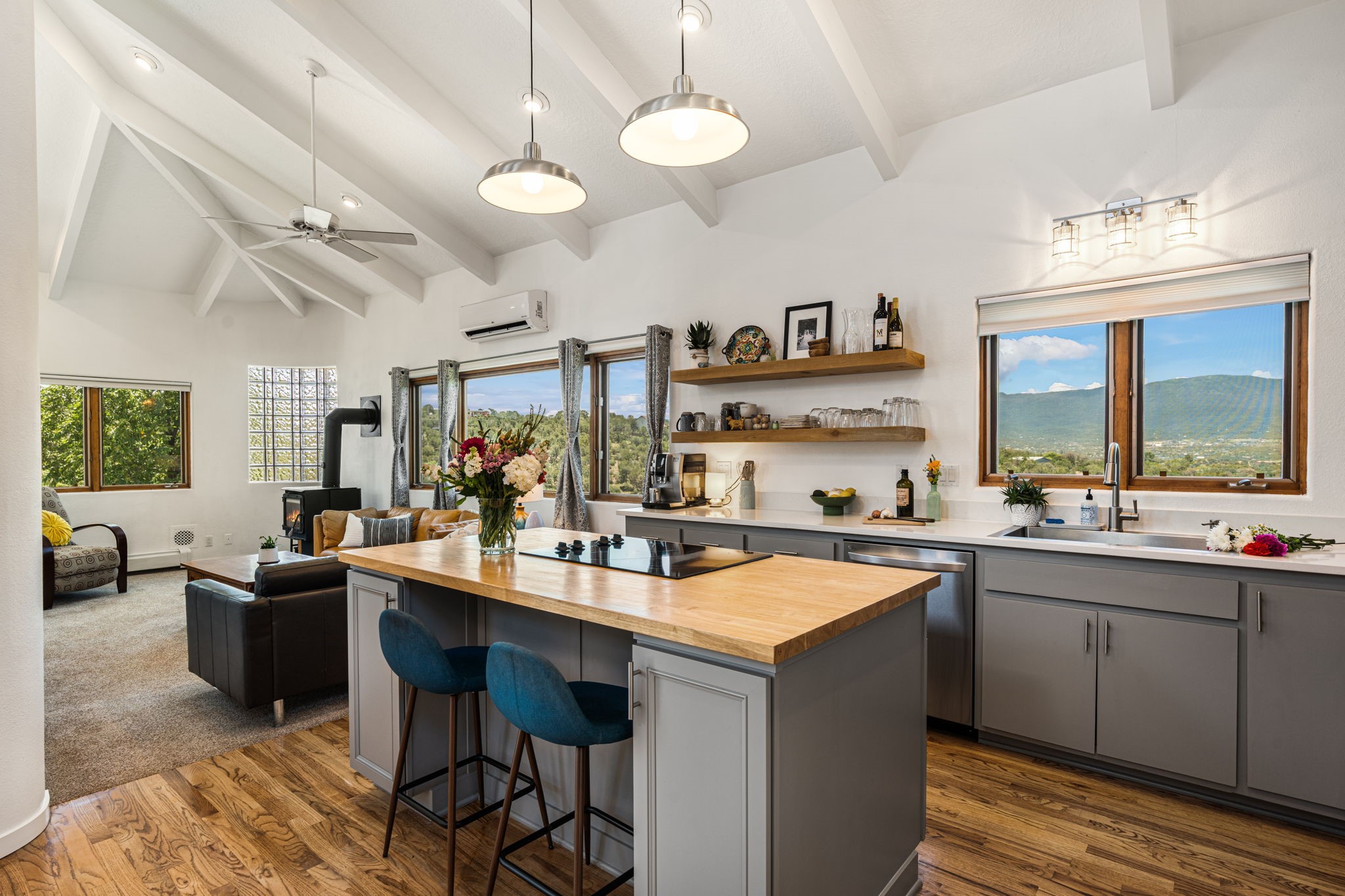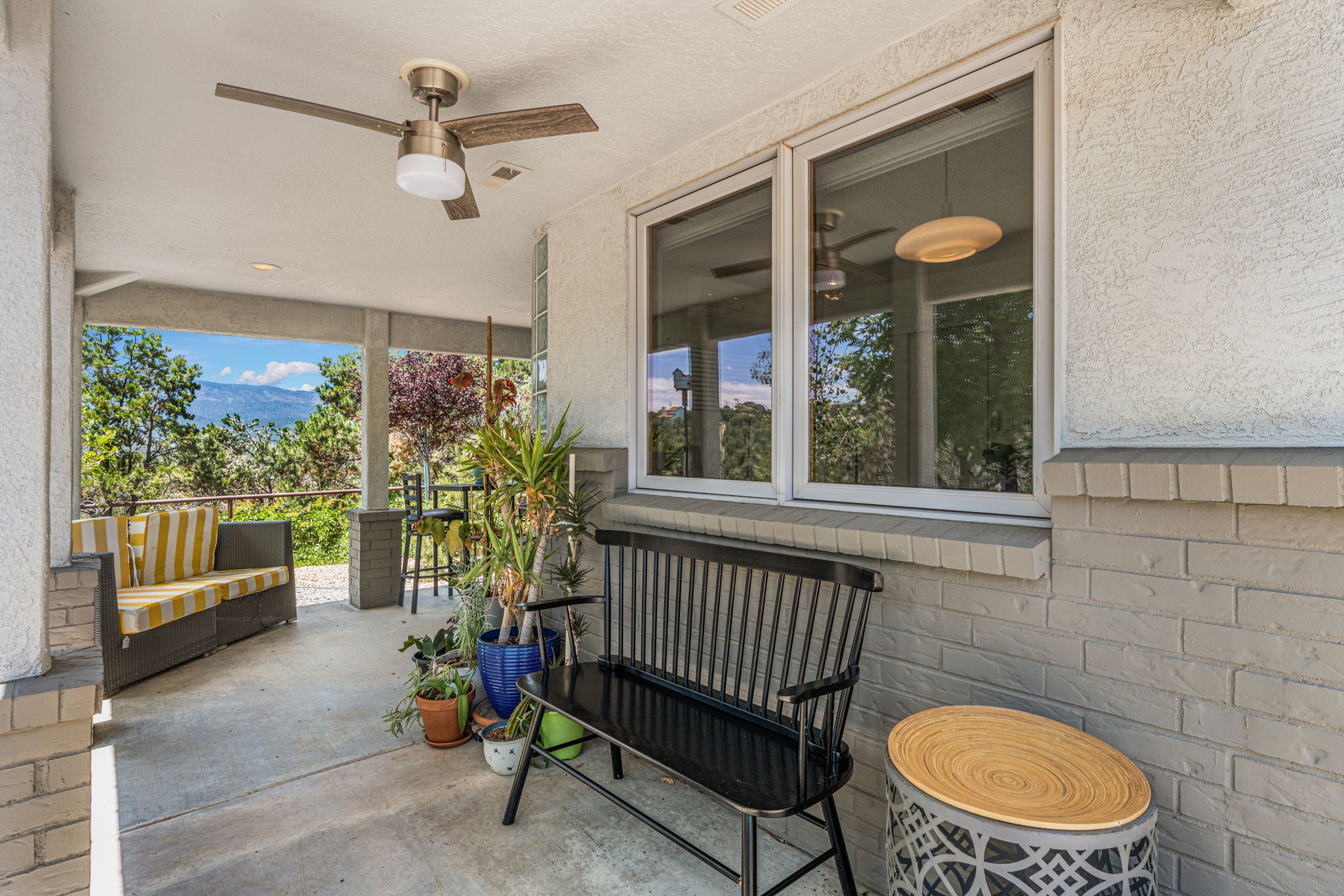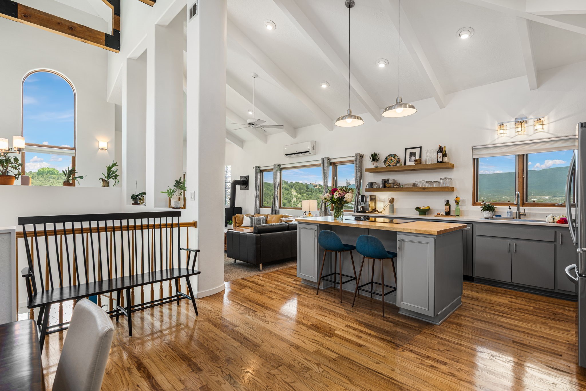 This updated home situated on 4.68 acres & 2 lots, zoned A-2, NO HOA & additional 820 sq. ft Bunker like basement is one of the most unique in the east mountains. It features an oversized 33.9x24 tandem style garage, automatic gate, vaulted ceilings, natural light, exposed wood beams, large casement windows, multiple outdoor seating areas, hot tub purchased 11/1/24, community water-no well. 3 sources of heat: Radiant baseboard, 6 Mini Splits& Wood stove. Solar panels that will be paid off by the Seller with acceptable offer. The views are stunning! The home is open & inviting. The property will take your breath away. Outdoor features include an oversized chair facing the Sandias for a beautiful sunset view, access through back gate, chicken coop and goat pen and much more