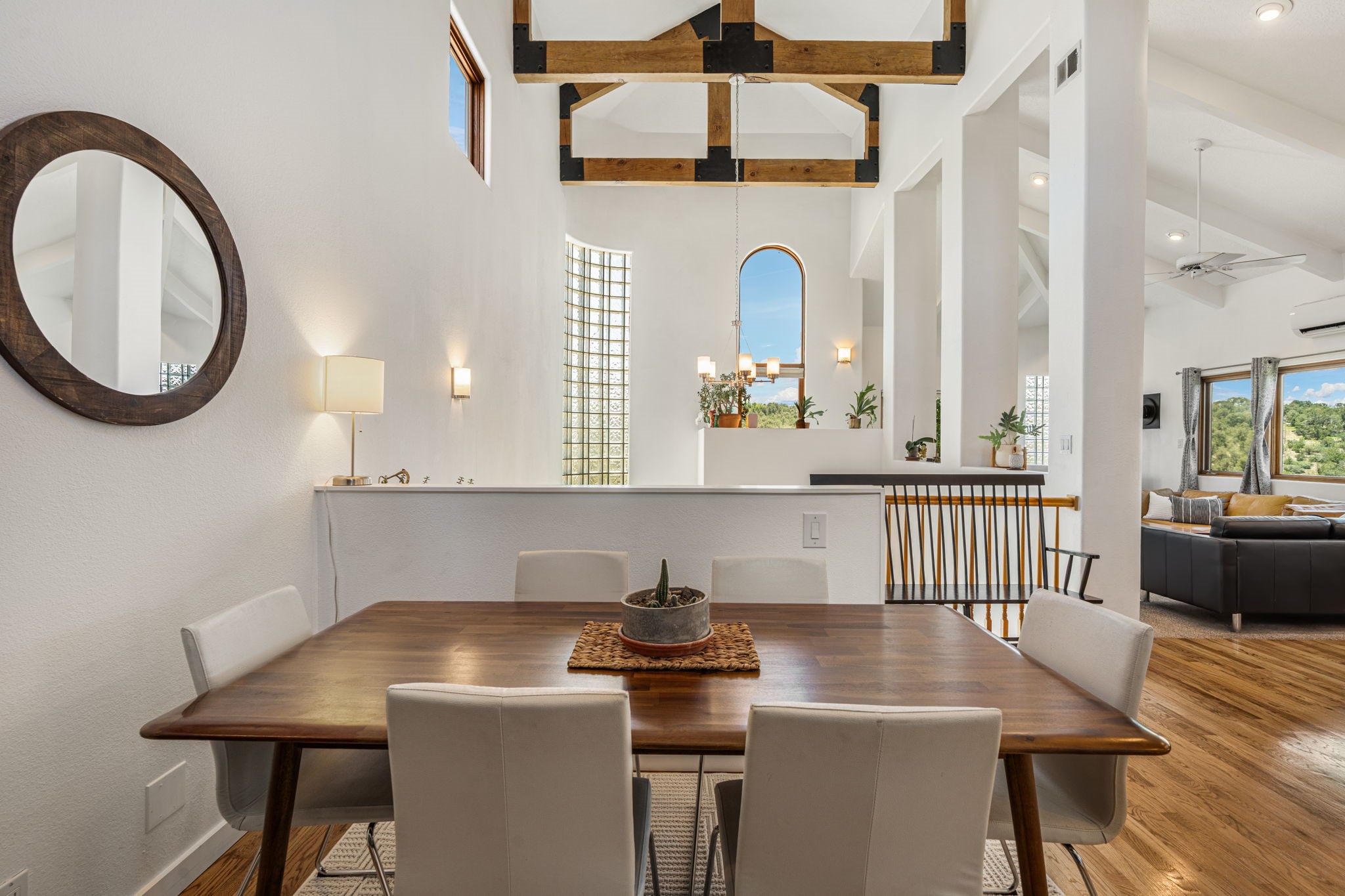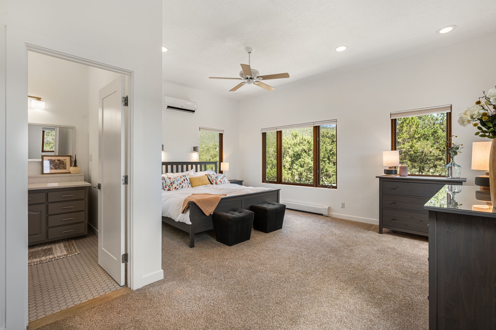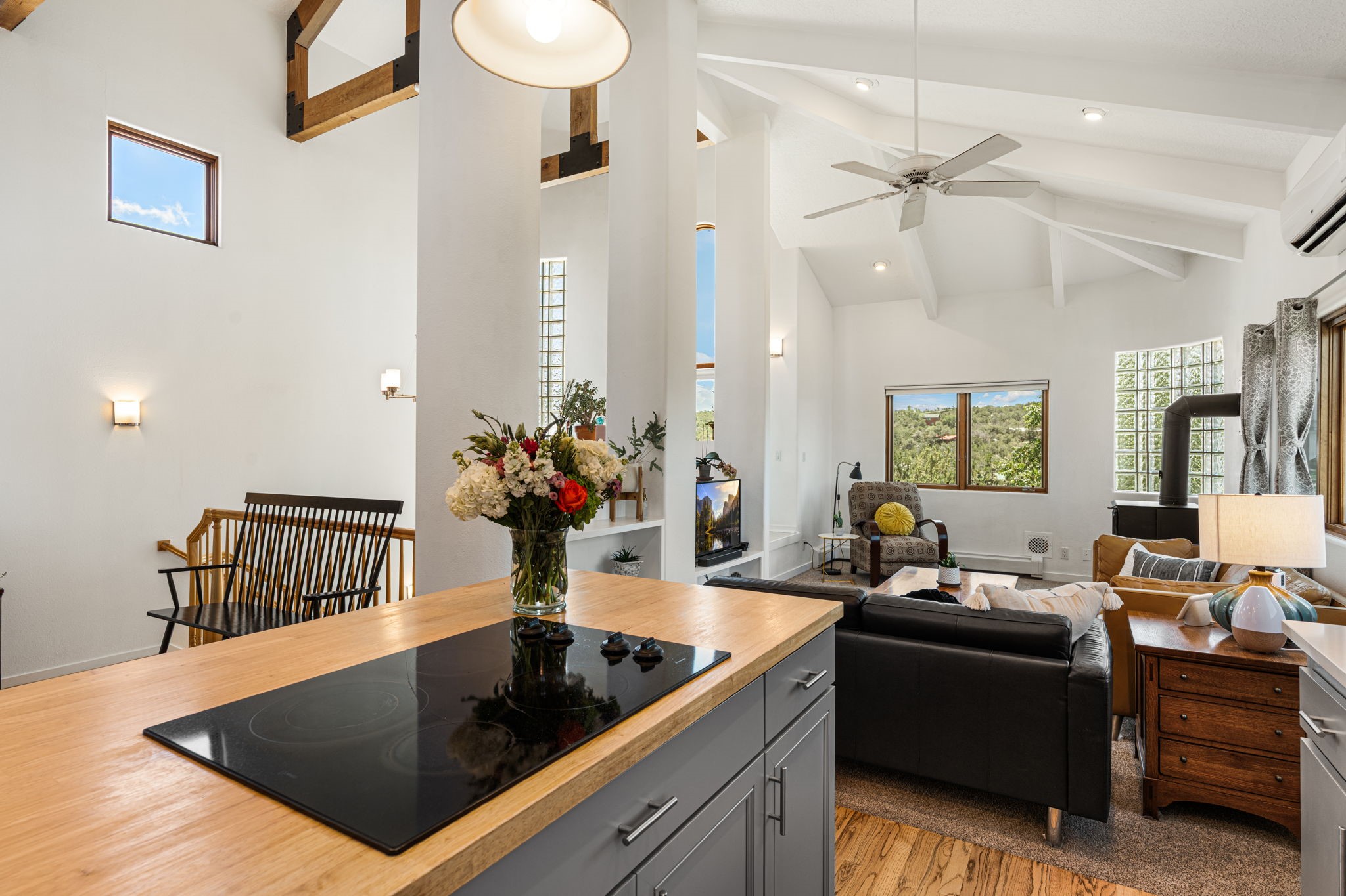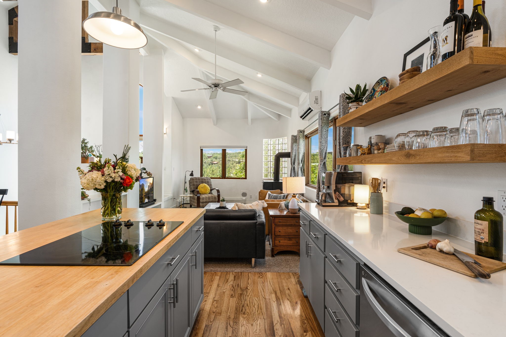 This updated home situated on 4.68 acres & 2 lots, zoned A-2, NO HOA & additional 820 sq. ft Bunker like basement is one of the most unique in the east mountains. It features an oversized 33.9x24 tandem style garage, automatic gate, vaulted ceilings, natural light, exposed wood beams, large casement windows, multiple outdoor seating areas, hot tub purchased 11/1/24, community water-no well. 3 sources of heat: Radiant baseboard, 6 Mini Splits& Wood stove. Solar panels that will be paid off by the Seller with acceptable offer. The views are stunning! The home is open & inviting. The property will take your breath away. Outdoor features include an oversized chair facing the Sandias for a beautiful sunset view, access through back gate, chicken coop and goat pen and much more