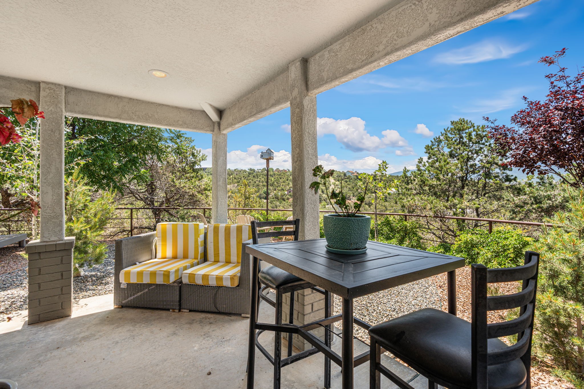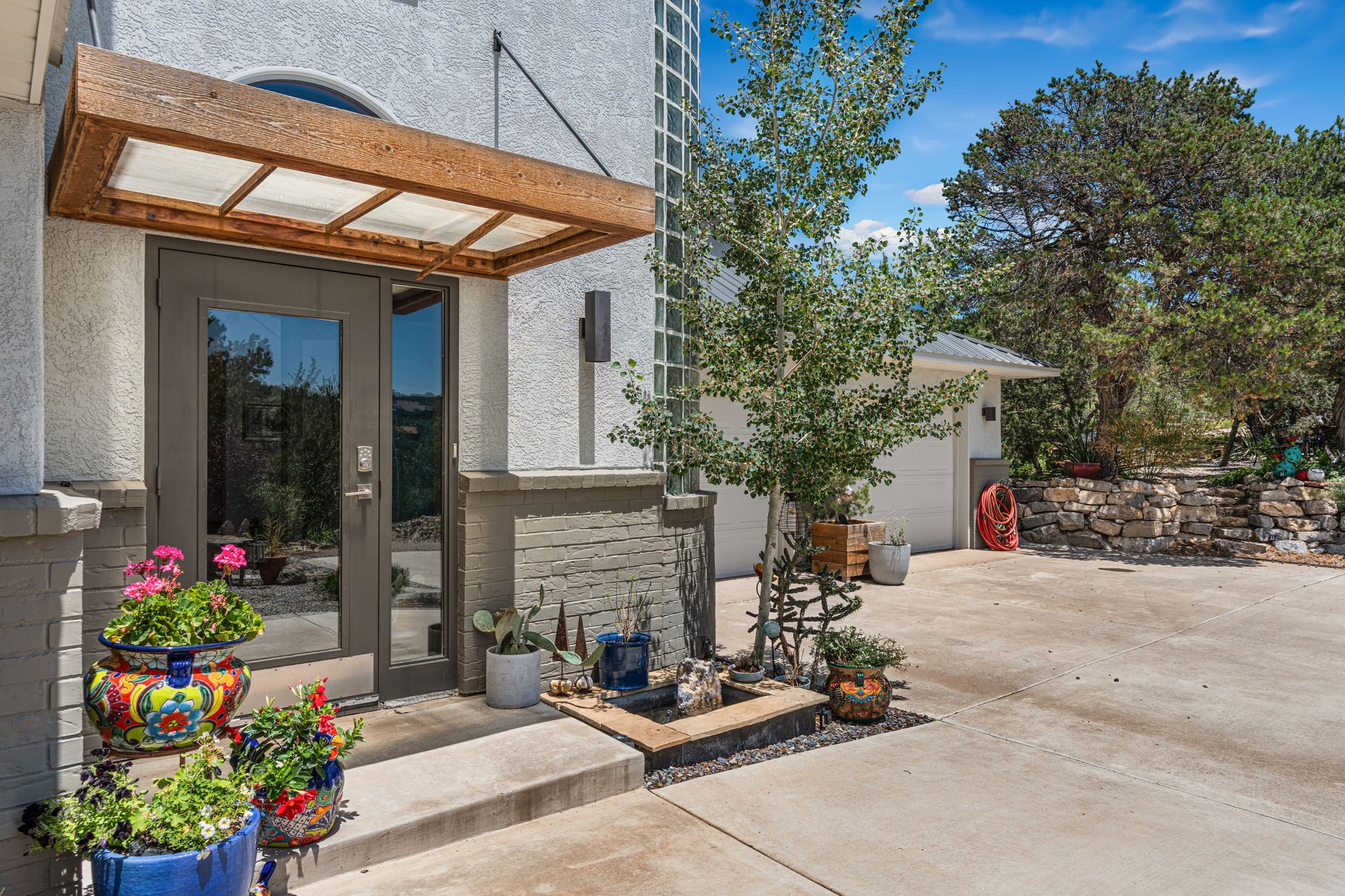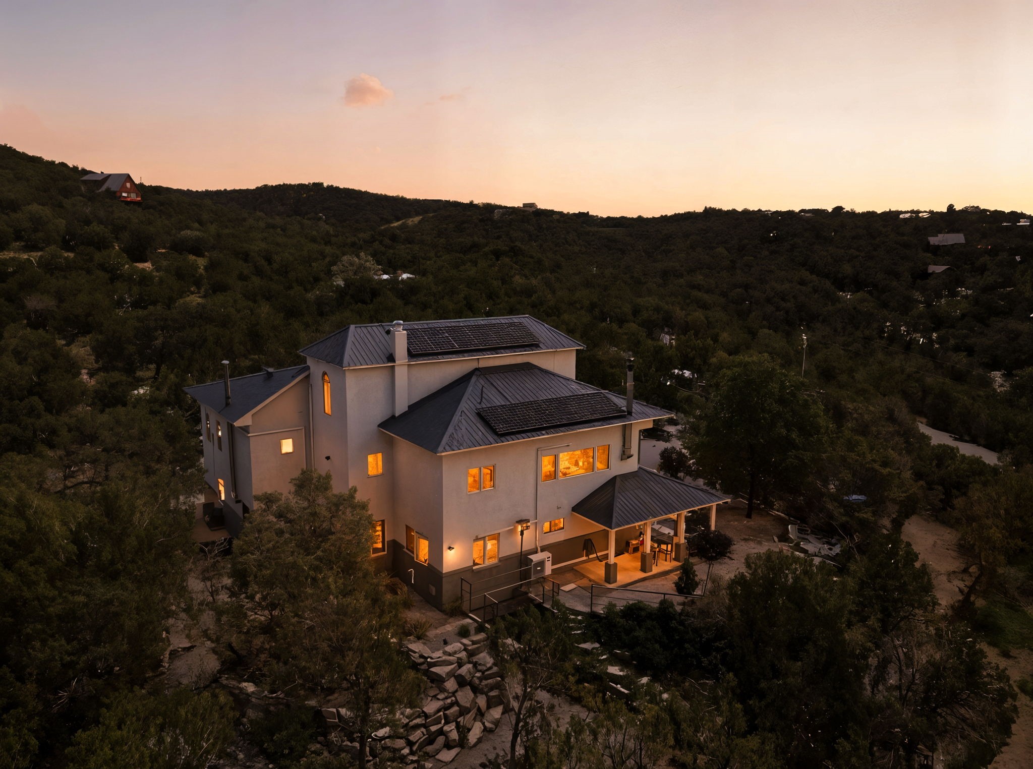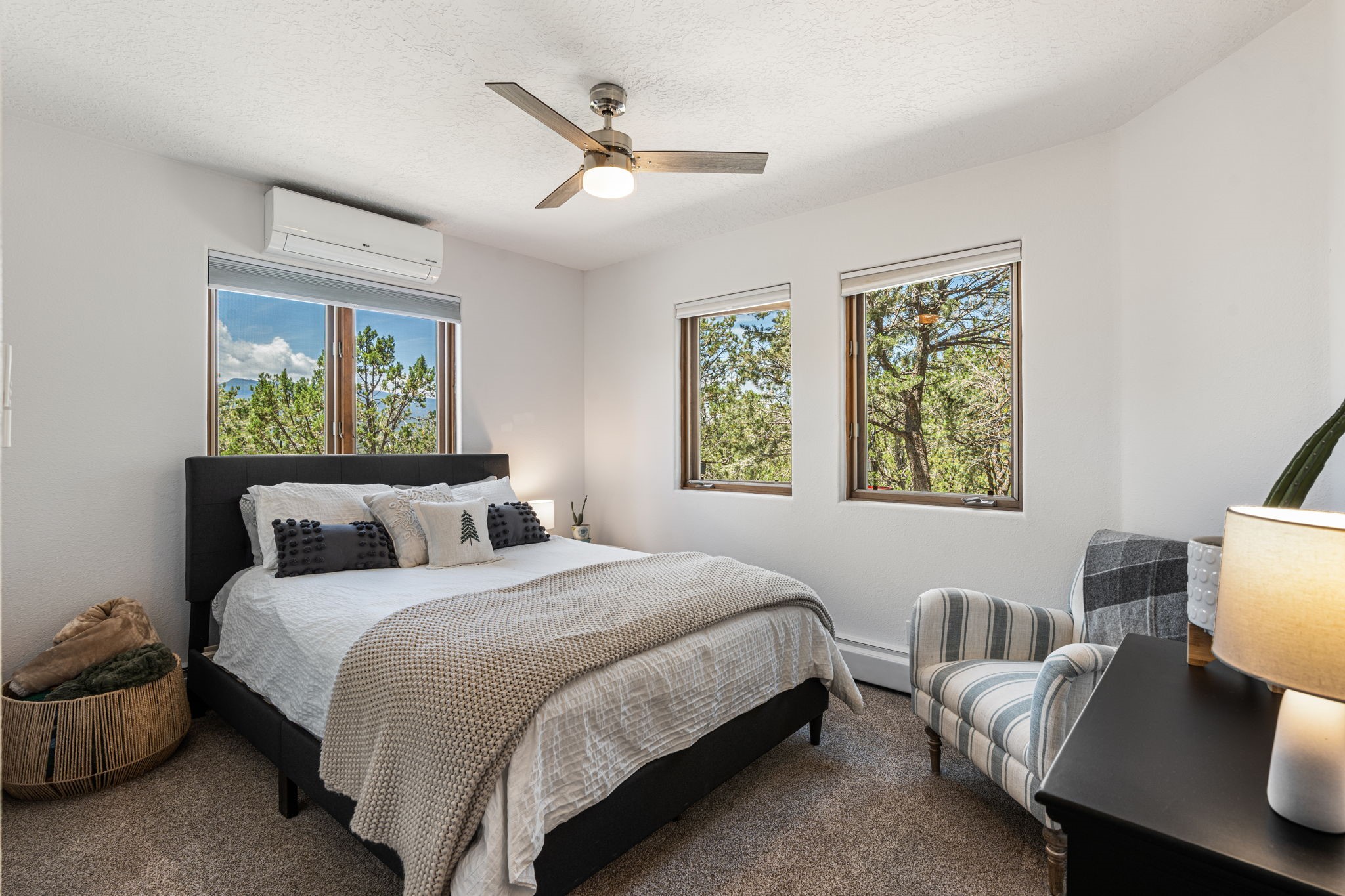 This updated home situated on 4.68 acres & 2 lots, zoned A-2, NO HOA & additional 820 sq. ft Bunker like basement is one of the most unique in the east mountains. It features an oversized 33.9x24 tandem style garage, automatic gate, vaulted ceilings, natural light, exposed wood beams, large casement windows, multiple outdoor seating areas, hot tub purchased 11/1/24, community water-no well. 3 sources of heat: Radiant baseboard, 6 Mini Splits& Wood stove. Solar panels that will be paid off by the Seller with acceptable offer. The views are stunning! The home is open & inviting. The property will take your breath away. Outdoor features include an oversized chair facing the Sandias for a beautiful sunset view, access through back gate, chicken coop and goat pen and much more