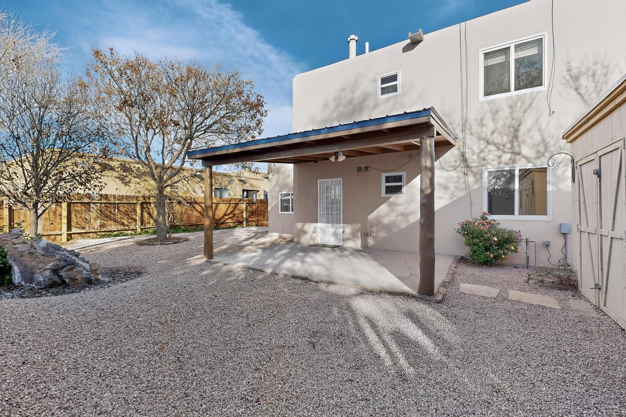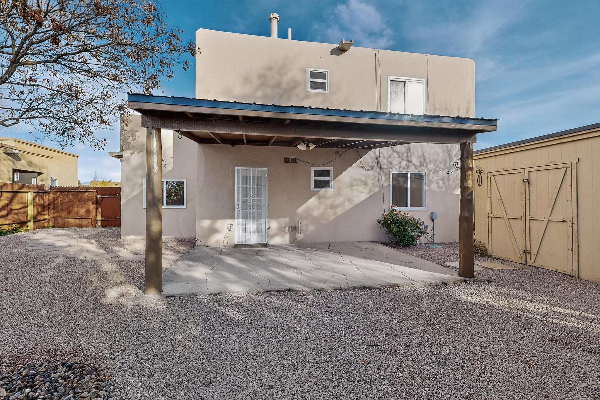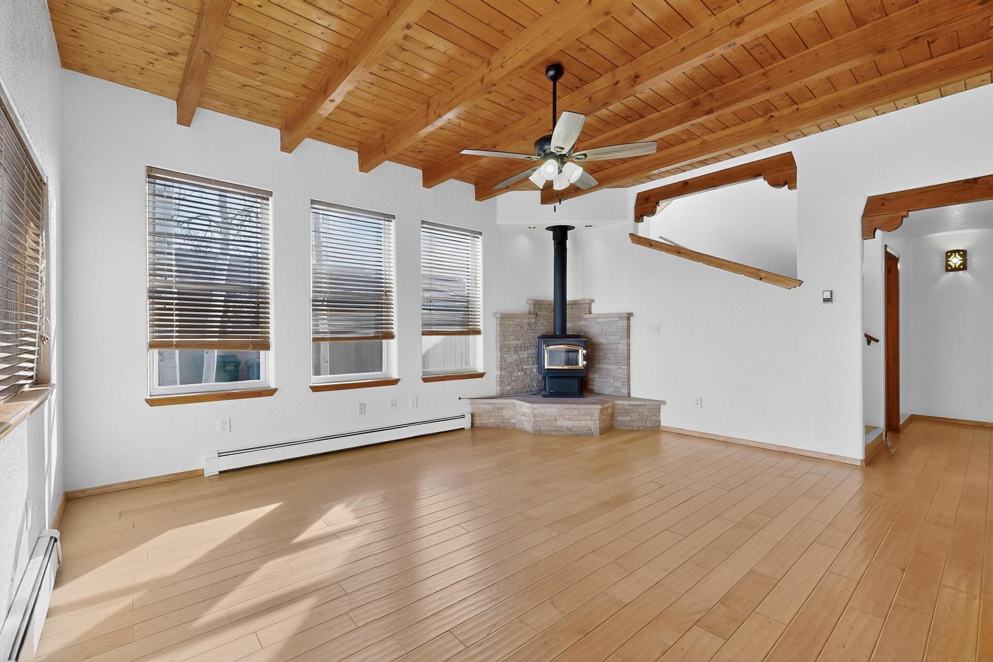 This home is filled with abundant natural light, creating a warm and inviting atmosphere throughout, making it a truly exceptional place you'll want to call your own. This property features 3 bedrooms PLUS an office. 2 full bathrooms, each with custom cabinets, beautifully tiled bathtubs and granite countertops. The living room boasts a cozy wood stove and high beamed tongue-and-groove ceilings, adding Santa Fe charm to the home. Retreat to the main bedroom suite, which offers its own fireplace and a private balcony with a mountain top view--ideal for unwinding after a long day. The kitchen is complete with a brand-new gas stove/oven, custom-made cabinets, granite countertops and tile backsplash. Step outside to enjoy the fully landscaped front and back yards, featuring tranquil water fountains and mature landscaping maintained with drip irrigation. The backyard also includes a flagstone covered portal, perfect for outdoor entertaining and relaxation. Home includes a one car finished garage, large storage shed and a laundry room with a large basin sink and ample upper cabinets. Tiled and wood flooring adds the extra touch.Don't miss the opportunity to make this exceptional property your new home!