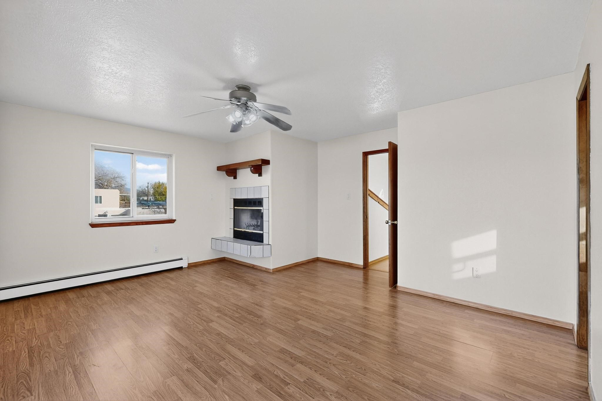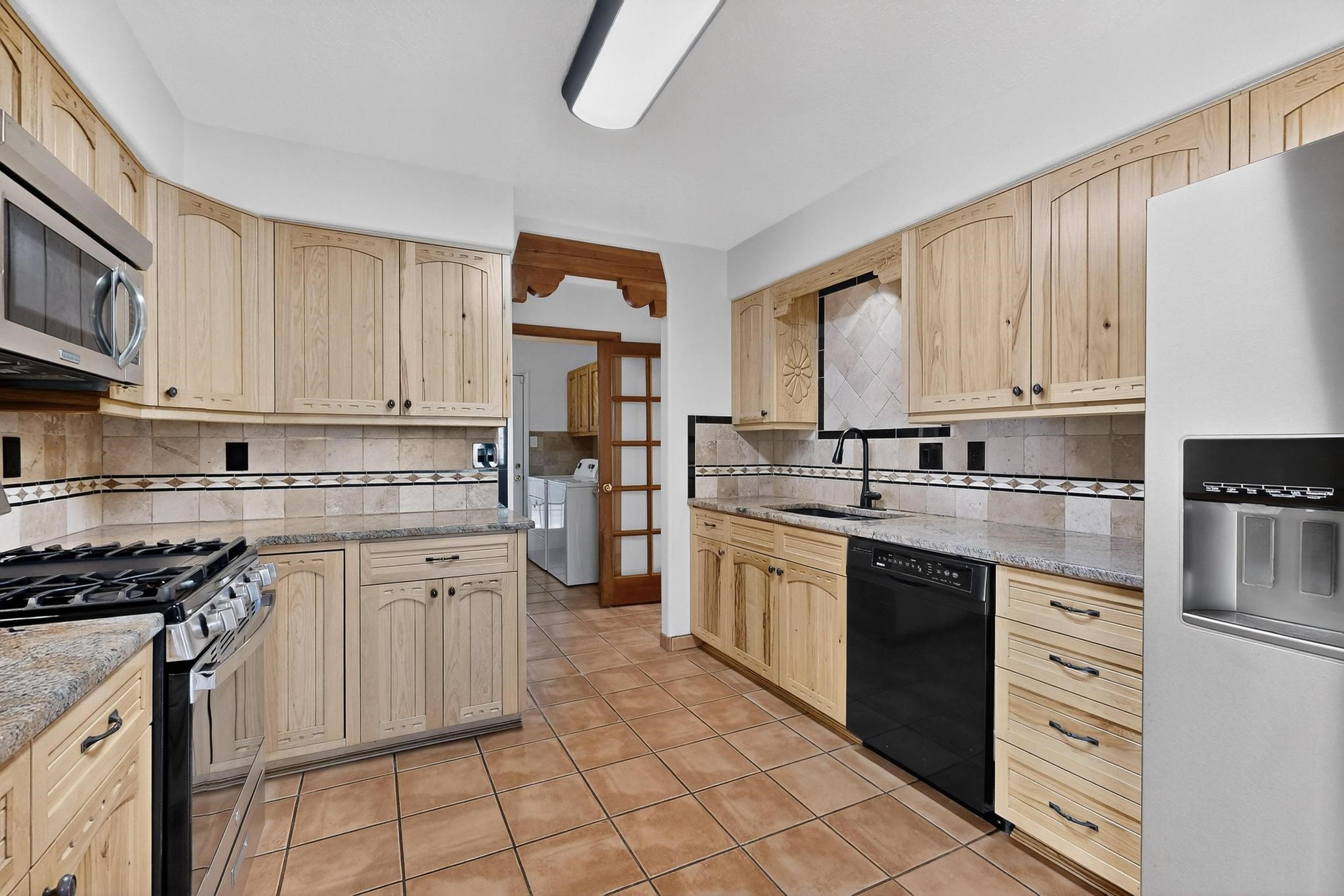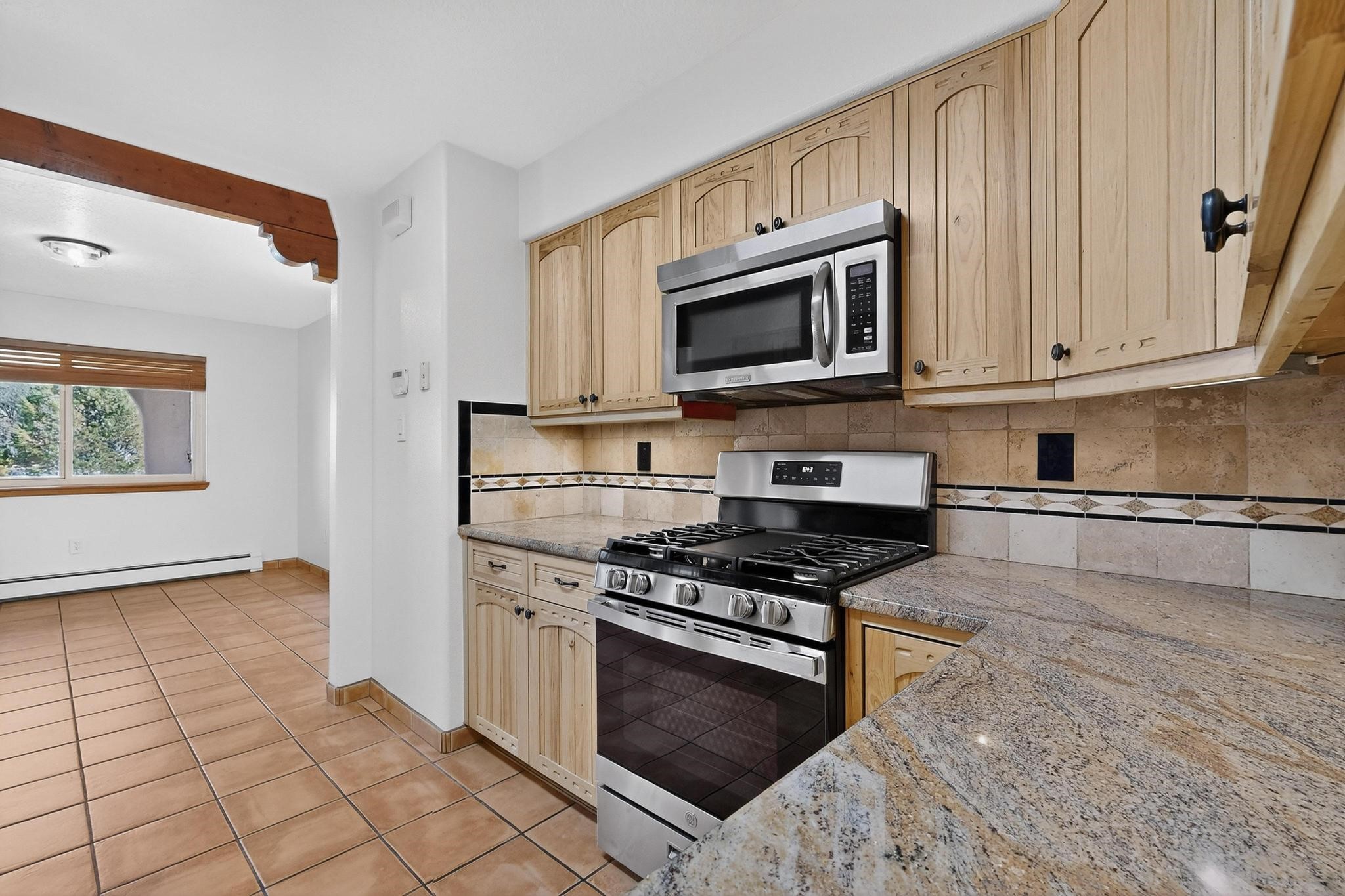 This home is filled with abundant natural light, creating a warm and inviting atmosphere throughout, making it a truly exceptional place you'll want to call your own. This property features 3 bedrooms PLUS an office. 2 full bathrooms, each with custom cabinets, beautifully tiled bathtubs and granite countertops. The living room boasts a cozy wood stove and high beamed tongue-and-groove ceilings, adding Santa Fe charm to the home. Retreat to the main bedroom suite, which offers its own fireplace and a private balcony with a mountain top view--ideal for unwinding after a long day. The kitchen is complete with a brand-new gas stove/oven, custom-made cabinets, granite countertops and tile backsplash. Step outside to enjoy the fully landscaped front and back yards, featuring tranquil water fountains and mature landscaping maintained with drip irrigation. The backyard also includes a flagstone covered portal, perfect for outdoor entertaining and relaxation. Home includes a one car finished garage, large storage shed and a laundry room with a large basin sink and ample upper cabinets. Tiled and wood flooring adds the extra touch.Don't miss the opportunity to make this exceptional property your new home!