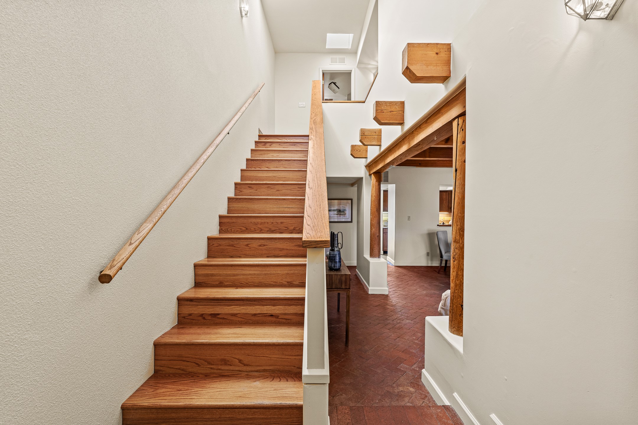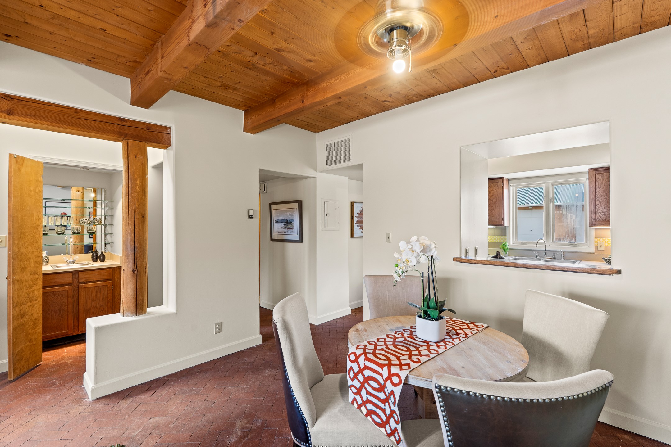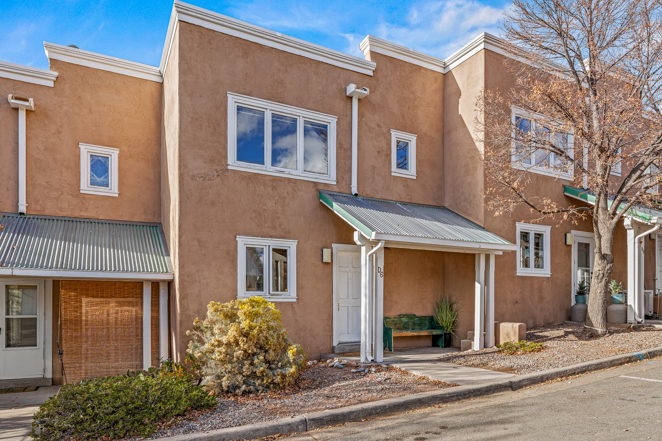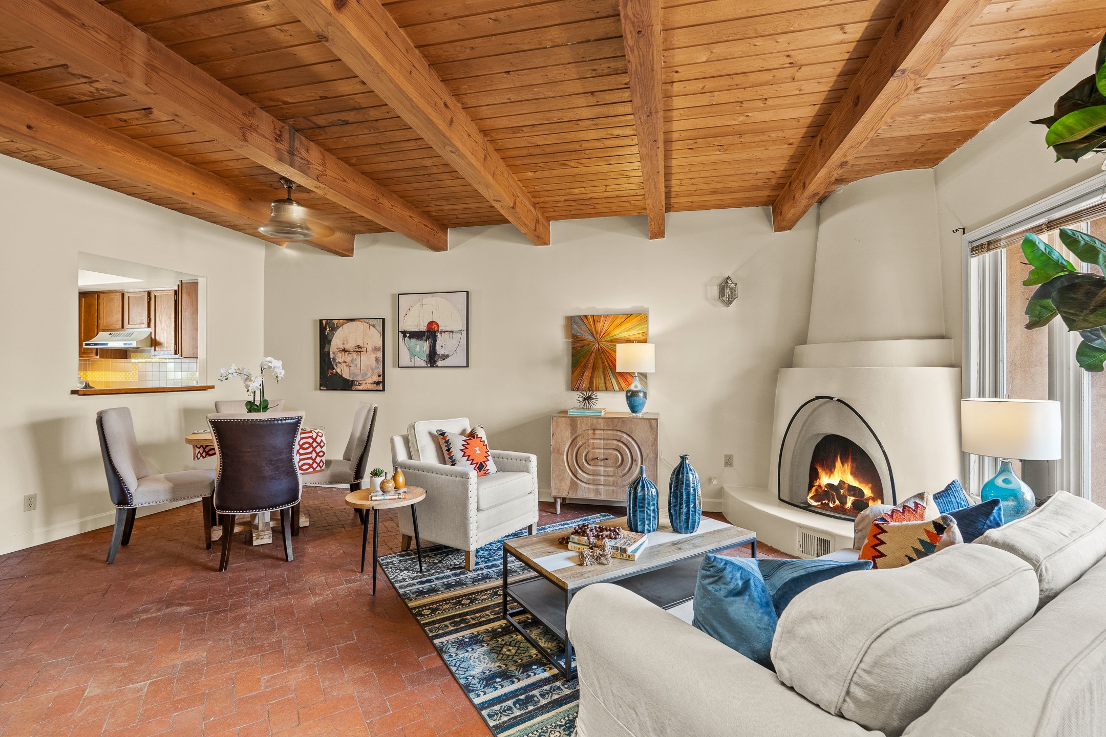 Just steps from the historic Plaza, this charming 2-bedroom, 2-bath condo embodies the true spirit of Santa Fe living. Classic brick floors, vigas and high beamed ceilings, and a traditional wood-burning kiva fireplace create an authentic Southwestern ambiance from the moment you enter. The main living and dining areas feel warm and inviting, complemented by a cozy bar nook and a convenient three-quarter bath on the first level.The kitchen offers generous counter space, a large window over the sink that frames the changing New Mexico light, and a traditional pass-through to the dining area--perfect for casual gatherings. An elegant oak stairway, crowned by a soaring skylight, leads to the upper-level bedrooms. Sunlight fills the space, enhancing the natural textures and warm tones throughout.Both bedrooms feature ample closets and share a full bath, while expansive windows and the upper skylight welcome bright desert light and capture distant mountain views. With no carpeting, the home maintains its clean, easy-care, Southwestern aesthetic.A rare detached one-car garage provides valuable storage and convenience in this prized downtown location. With its blend of regional character, natural materials, and unbeatable proximity to Santa Fe's galleries, restaurants, and historic streets, this property offers the quintessential Southwestern retreat.