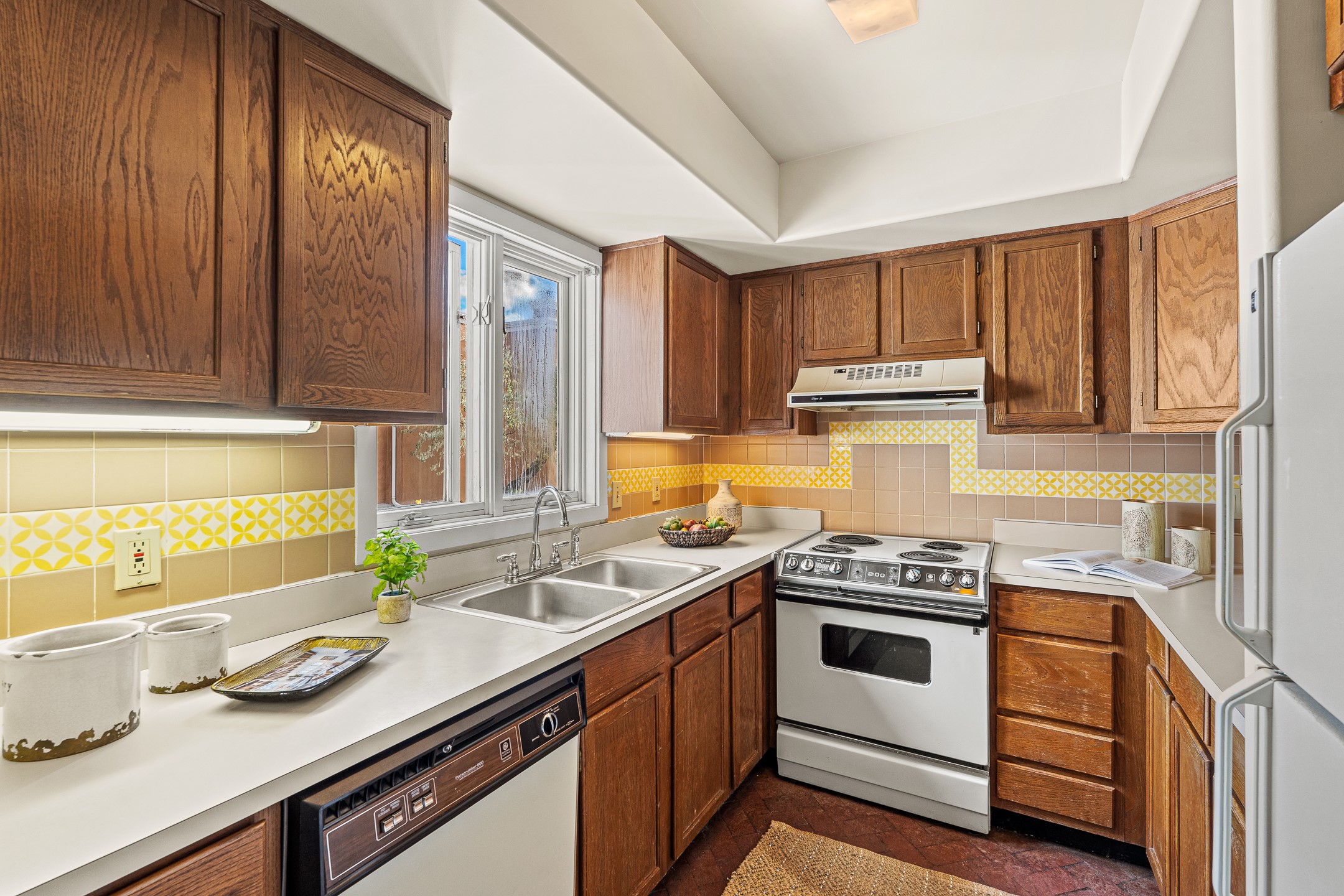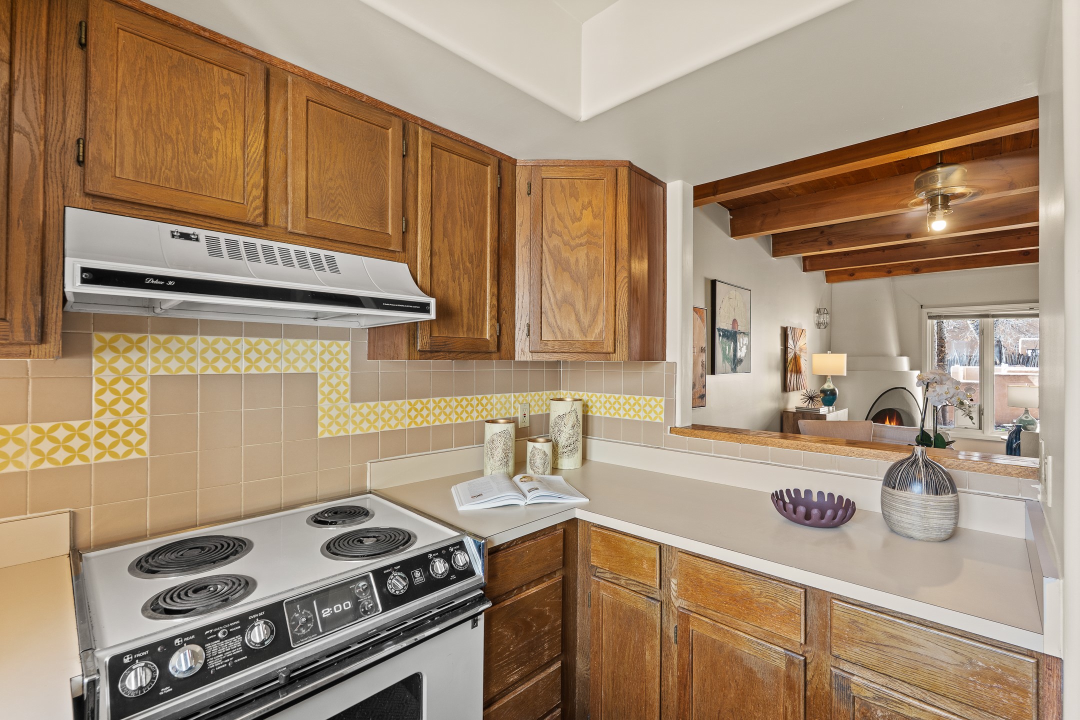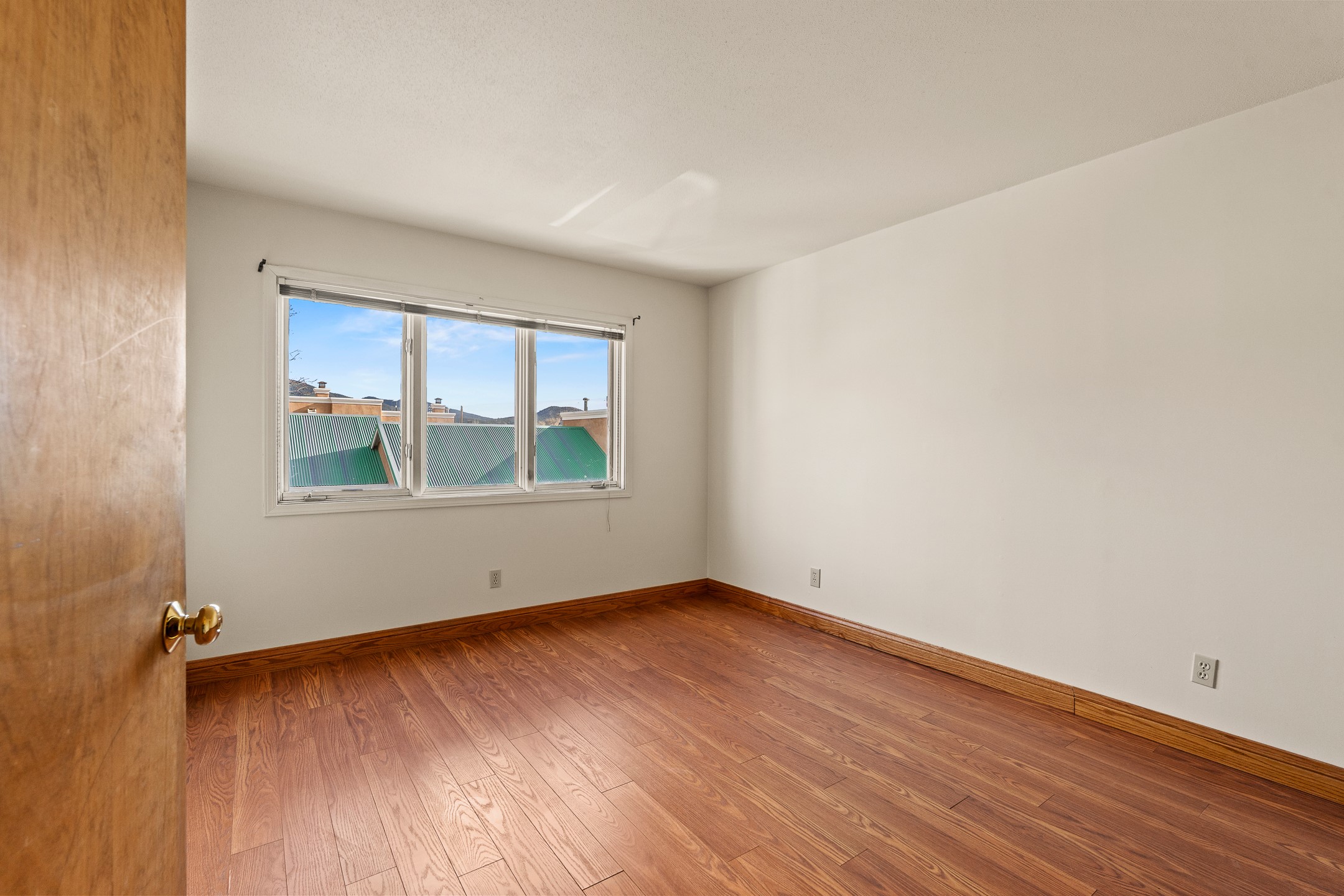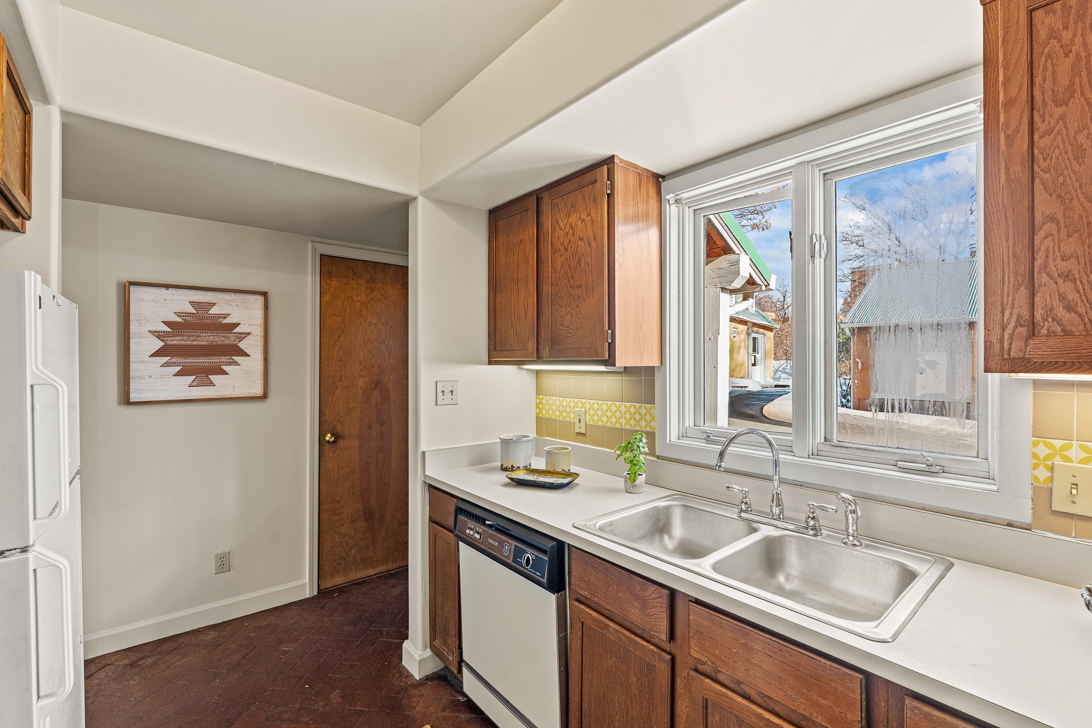 Just steps from the historic Plaza, this charming 2-bedroom, 2-bath condo embodies the true spirit of Santa Fe living. Classic brick floors, vigas and high beamed ceilings, and a traditional wood-burning kiva fireplace create an authentic Southwestern ambiance from the moment you enter. The main living and dining areas feel warm and inviting, complemented by a cozy bar nook and a convenient three-quarter bath on the first level.The kitchen offers generous counter space, a large window over the sink that frames the changing New Mexico light, and a traditional pass-through to the dining area--perfect for casual gatherings. An elegant oak stairway, crowned by a soaring skylight, leads to the upper-level bedrooms. Sunlight fills the space, enhancing the natural textures and warm tones throughout.Both bedrooms feature ample closets and share a full bath, while expansive windows and the upper skylight welcome bright desert light and capture distant mountain views. With no carpeting, the home maintains its clean, easy-care, Southwestern aesthetic.A rare detached one-car garage provides valuable storage and convenience in this prized downtown location. With its blend of regional character, natural materials, and unbeatable proximity to Santa Fe's galleries, restaurants, and historic streets, this property offers the quintessential Southwestern retreat.