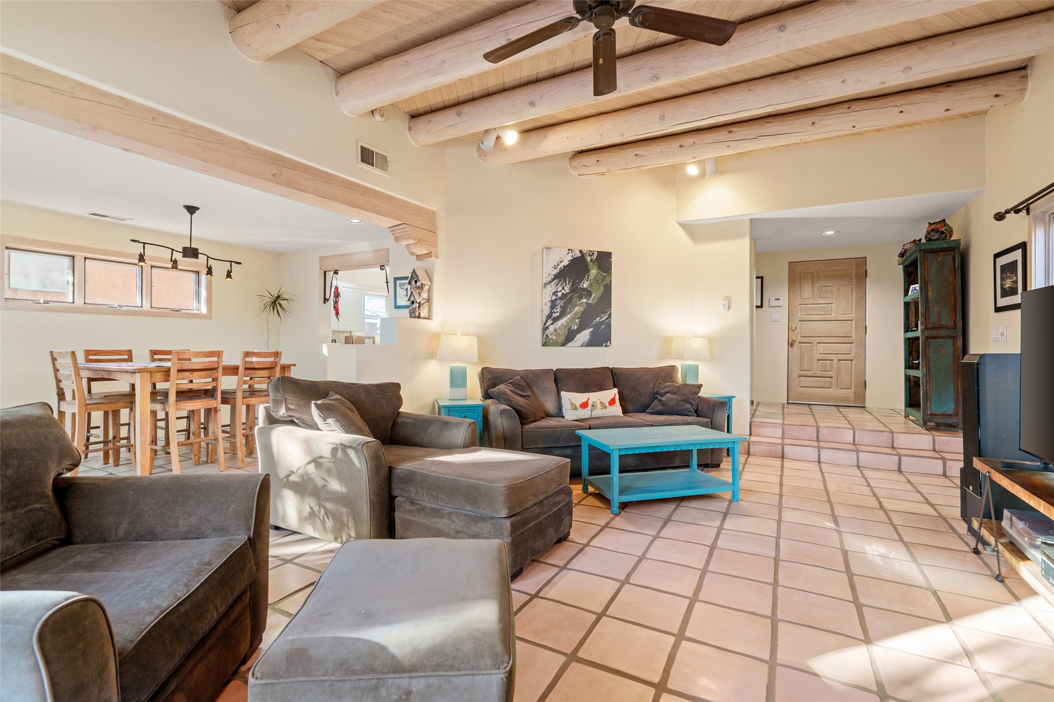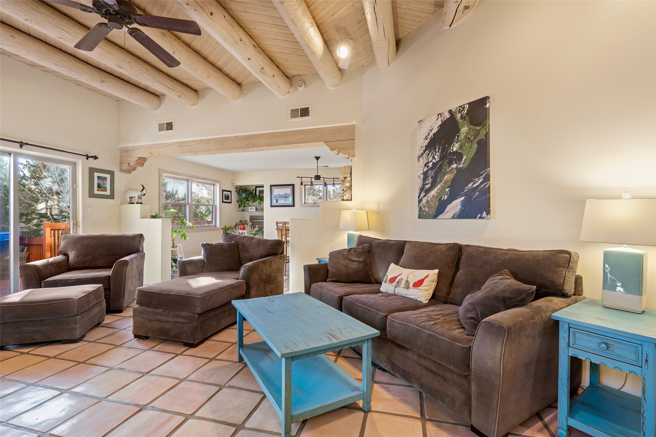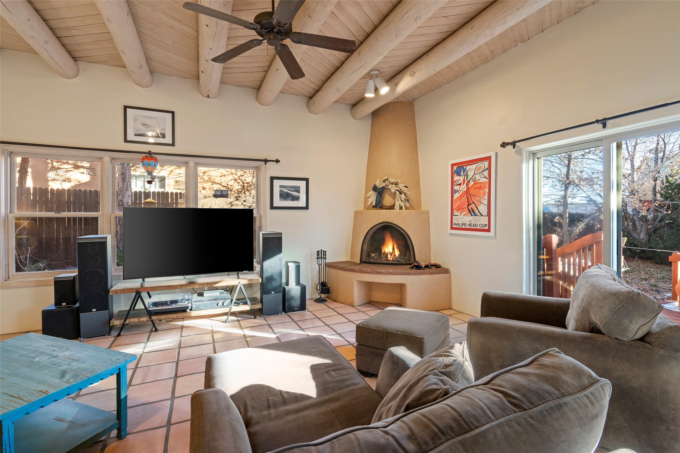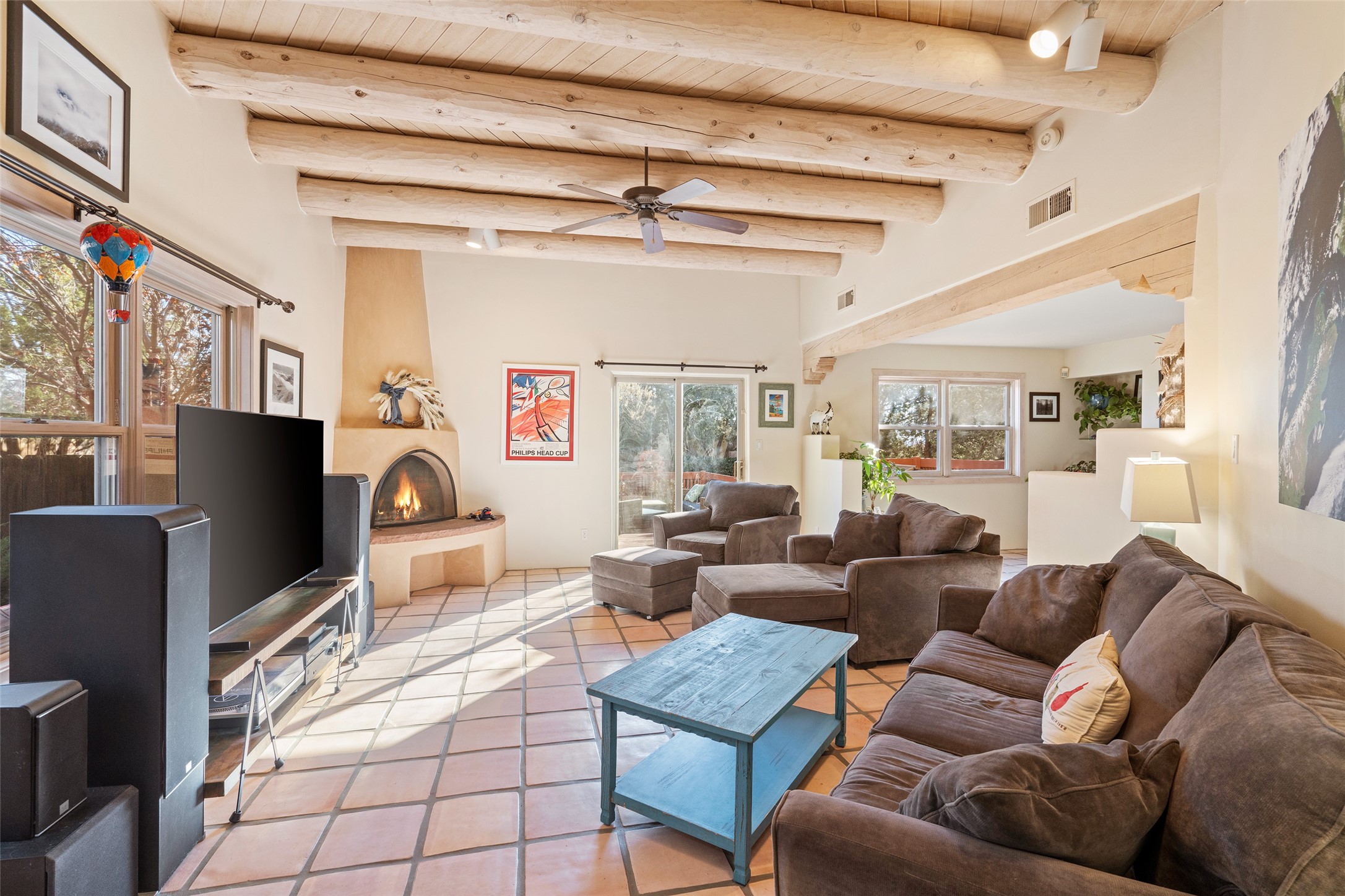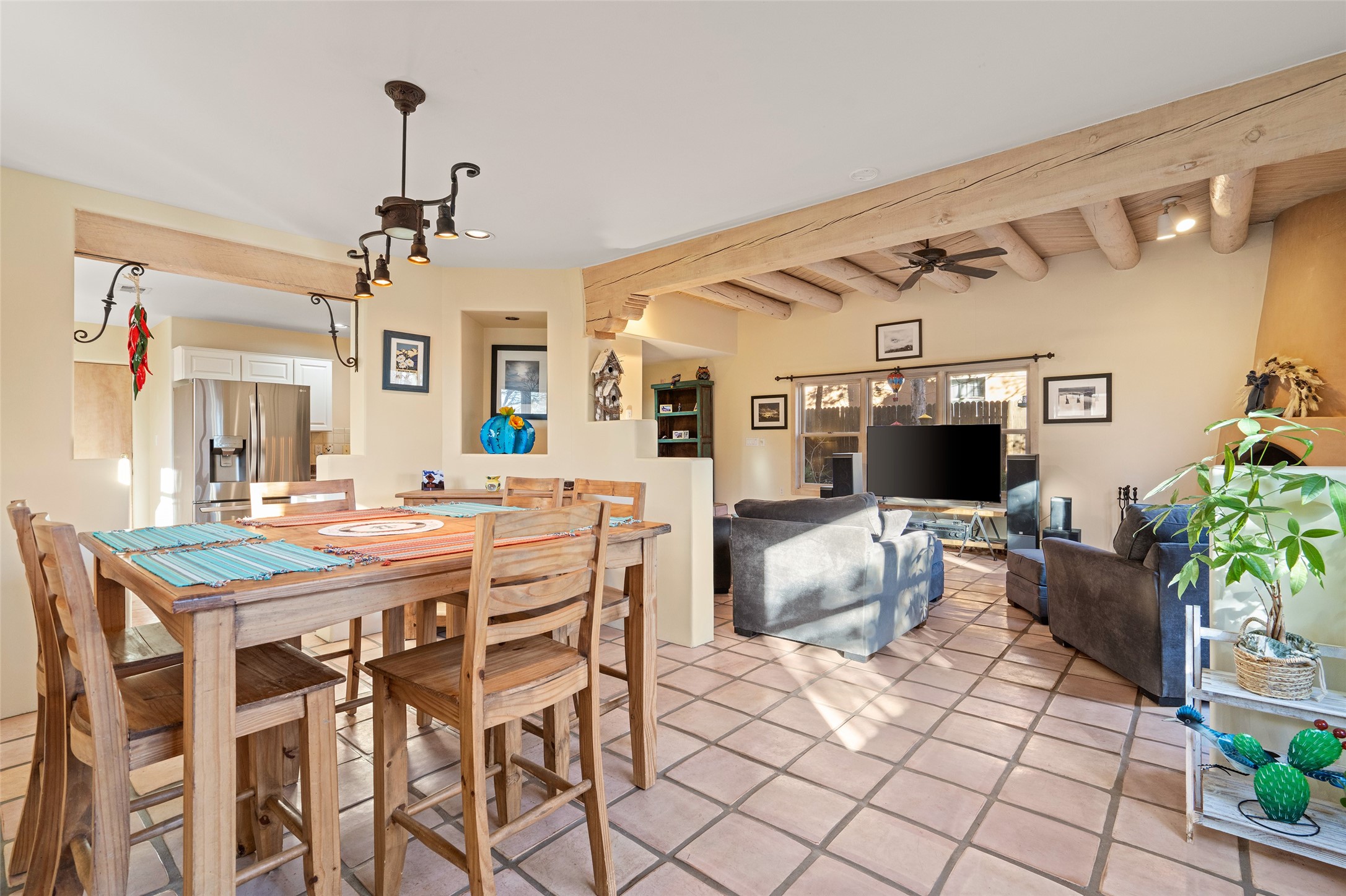 Welcome home! This light and bright two-story home in the quiet neighborhood of Pueblos del Sol, offers convenience, southwest character with vigas and a kiva fireplace as well as thoughtful updates throughout. Enjoy the classic Saltillo tile flooring on the main level and a mature, fully fenced, tree-filled backyard that provides both shade and charm to enjoy while sitting on the finished back deck! Upstairs, you'll find three sunny bedrooms with newer carpet, including a spacious primary suite featuring a generous walk-in closet and a bathroom illuminated by skylights that welcome in beautiful New Mexico sunshine. And don't forget the heated 2 car garage for conveneince! Ideally located, this home offers quick access to coffee shops, restaurants, medical facilities, and an easy commute to I-25, 599, and Hwy 285/84. Schedule a showing today, don't miss this one!