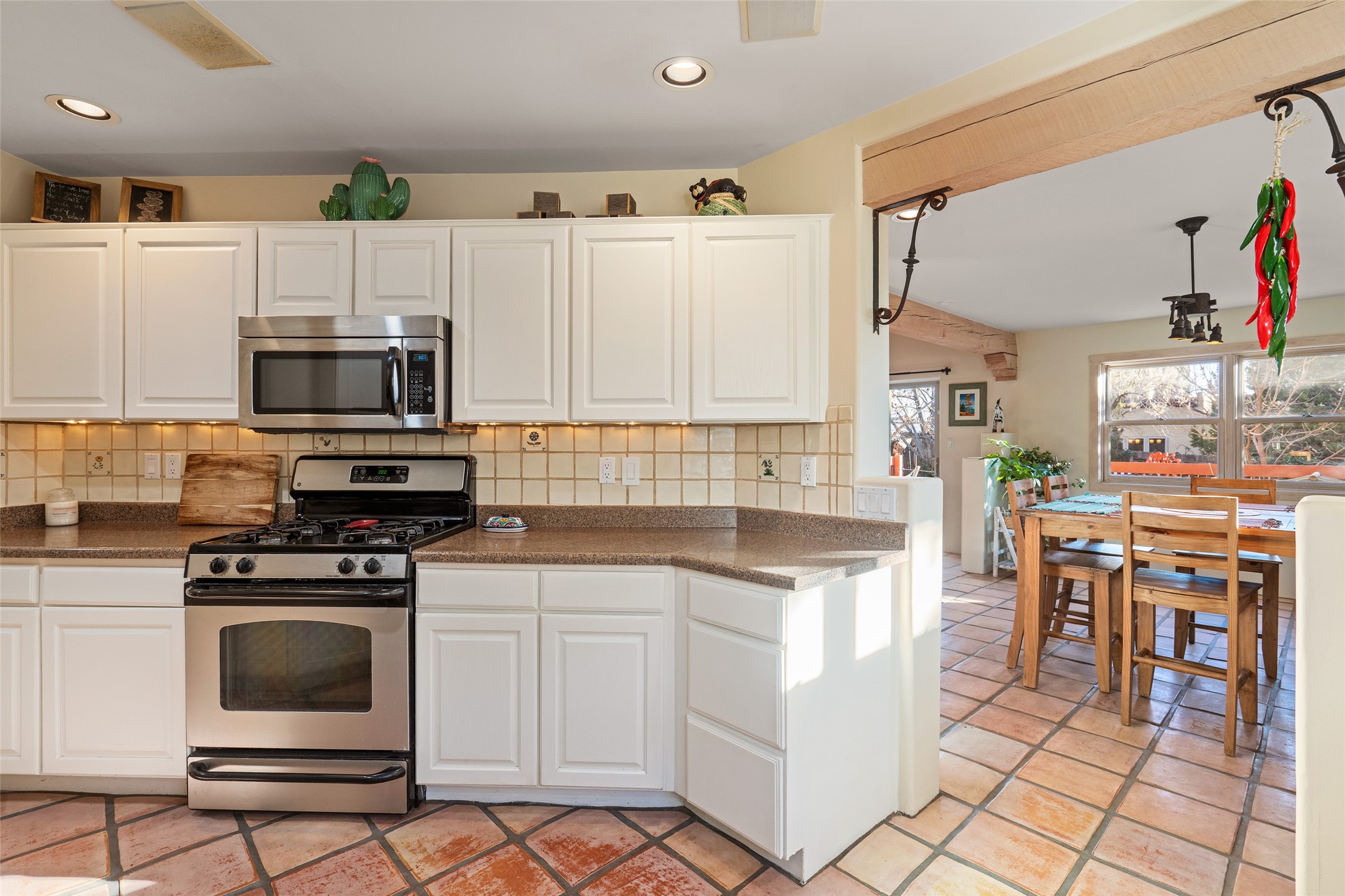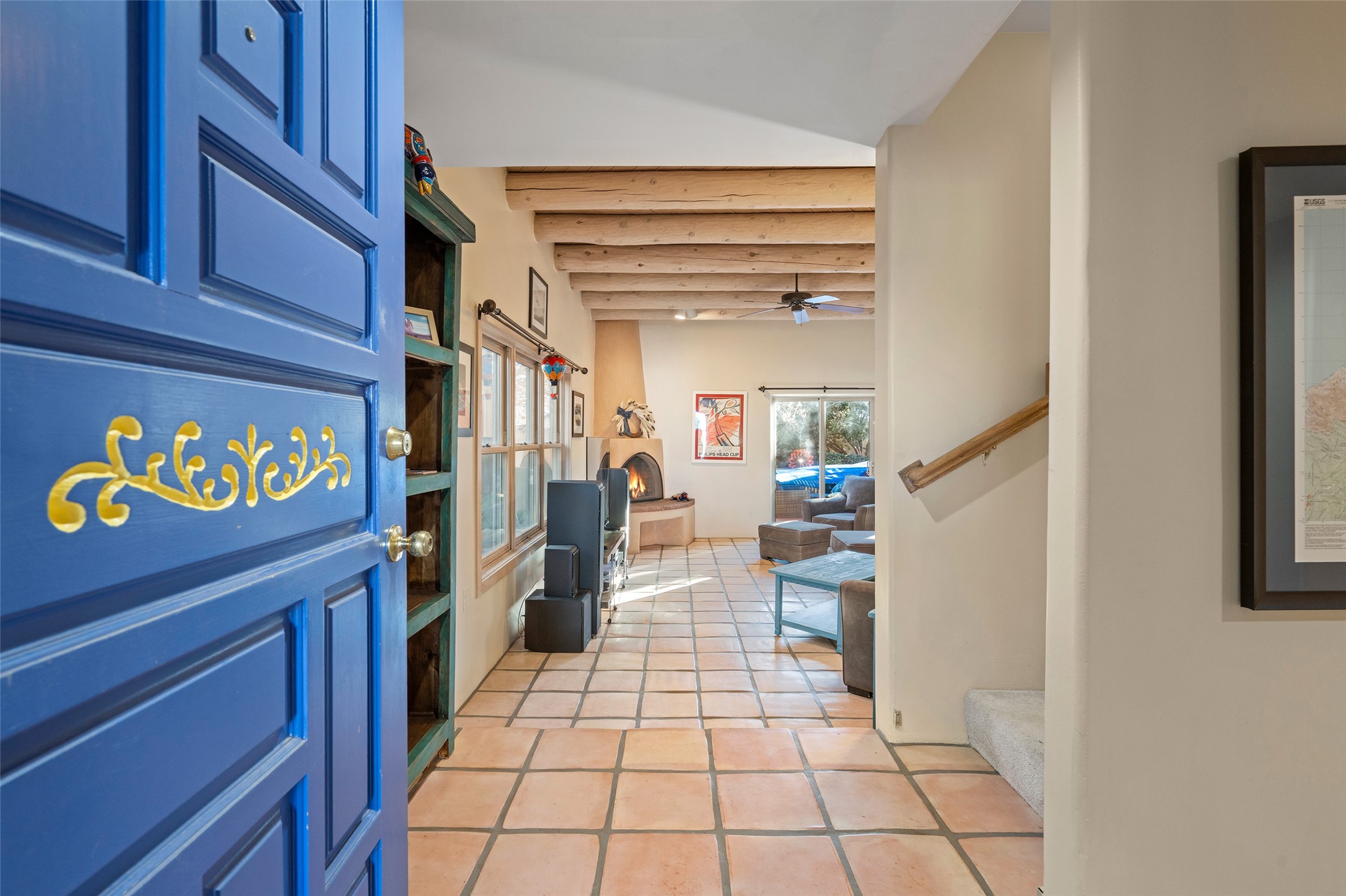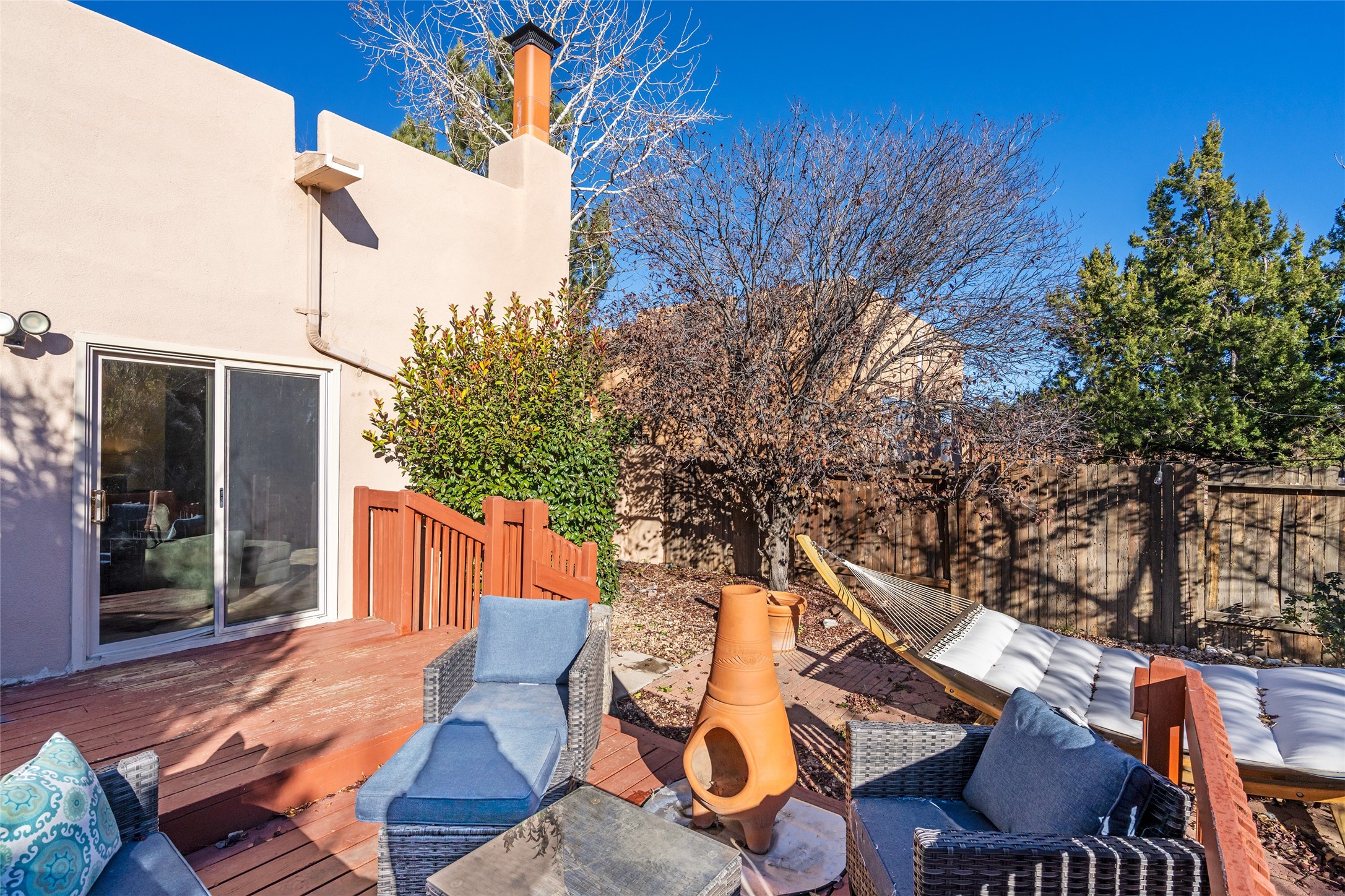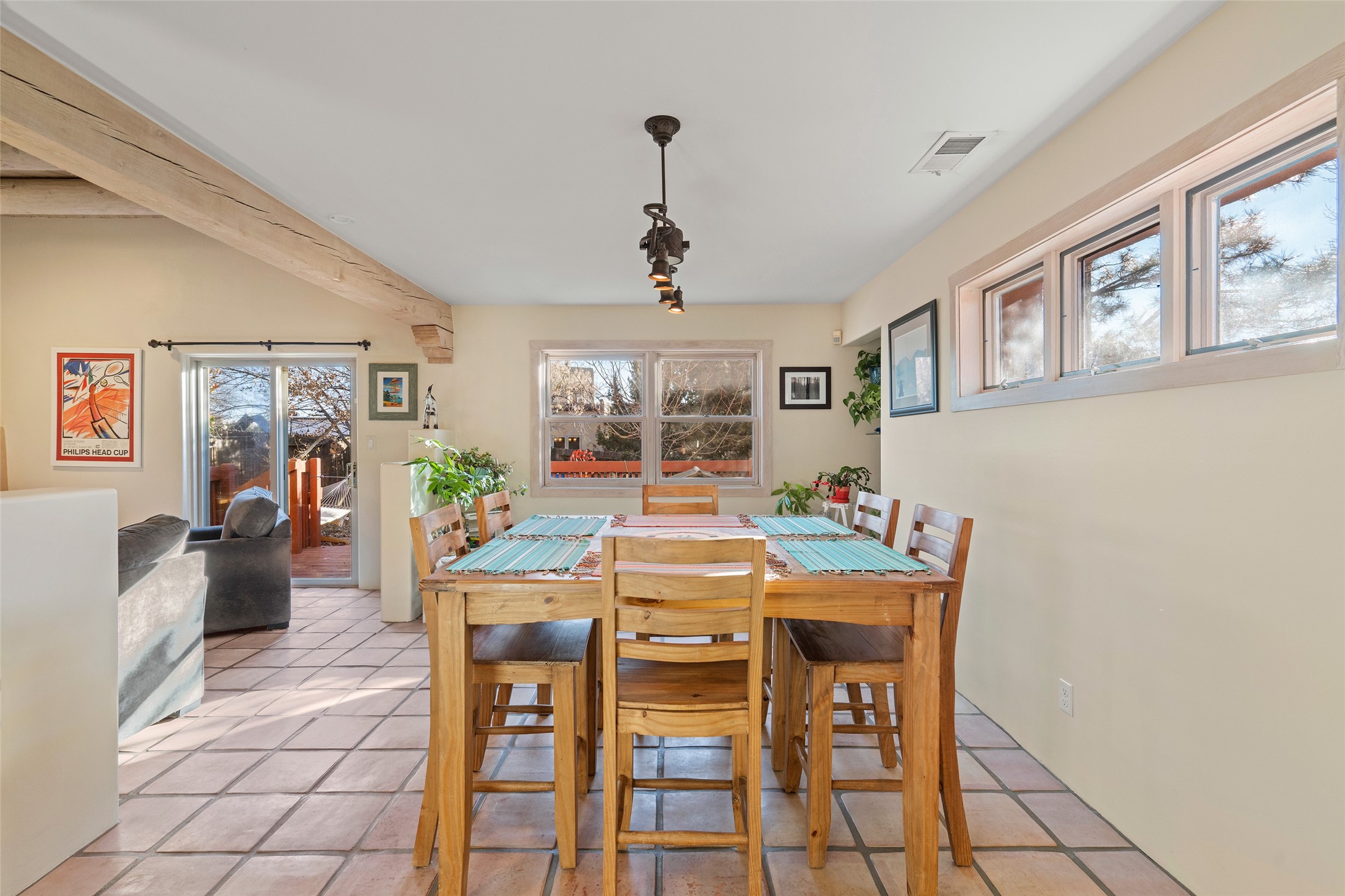 Welcome home! This light and bright two-story home in the quiet neighborhood of Pueblos del Sol, offers convenience, southwest character with vigas and a kiva fireplace as well as thoughtful updates throughout. Enjoy the classic Saltillo tile flooring on the main level and a mature, fully fenced, tree-filled backyard that provides both shade and charm to enjoy while sitting on the finished back deck! Upstairs, you'll find three sunny bedrooms with newer carpet, including a spacious primary suite featuring a generous walk-in closet and a bathroom illuminated by skylights that welcome in beautiful New Mexico sunshine. And don't forget the heated 2 car garage for conveneince! Ideally located, this home offers quick access to coffee shops, restaurants, medical facilities, and an easy commute to I-25, 599, and Hwy 285/84. Schedule a showing today, don't miss this one!