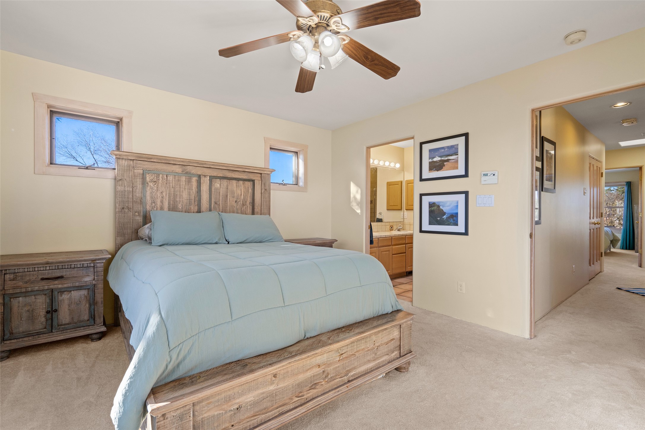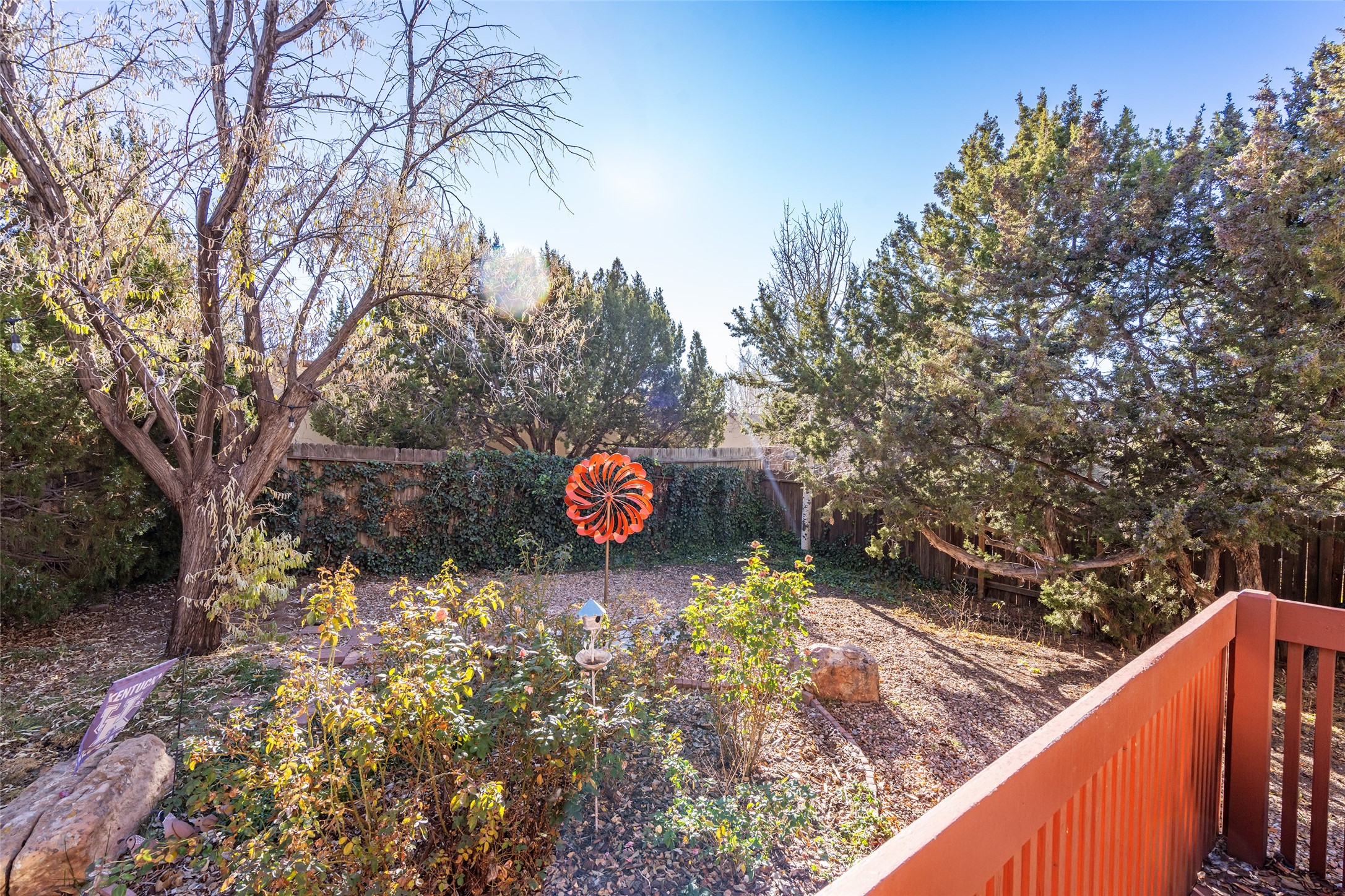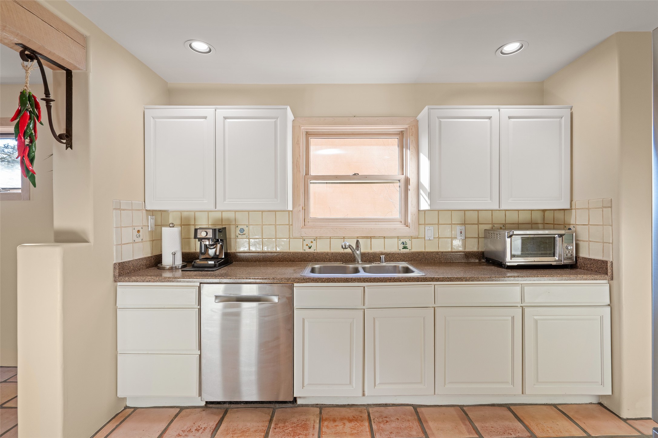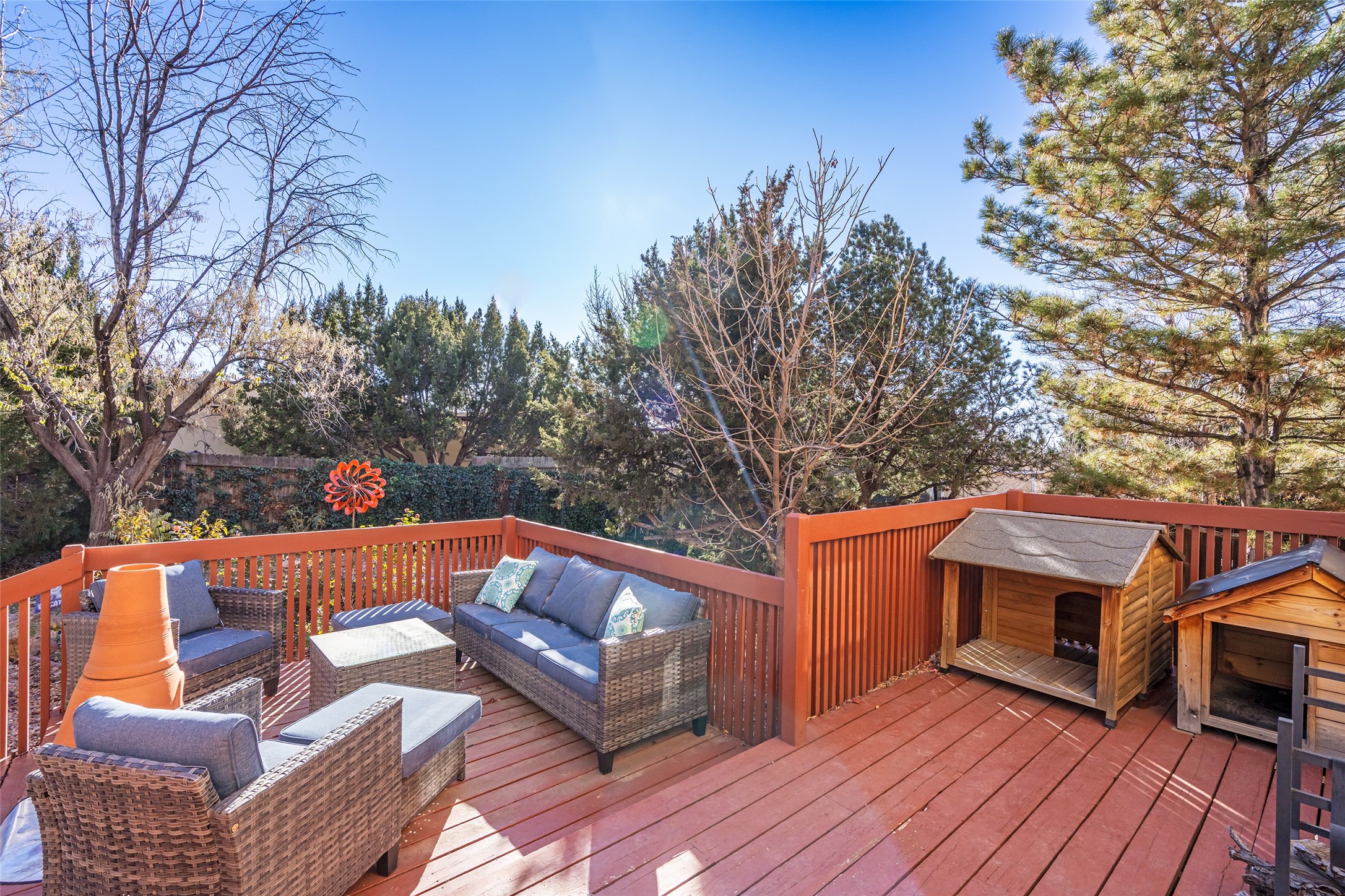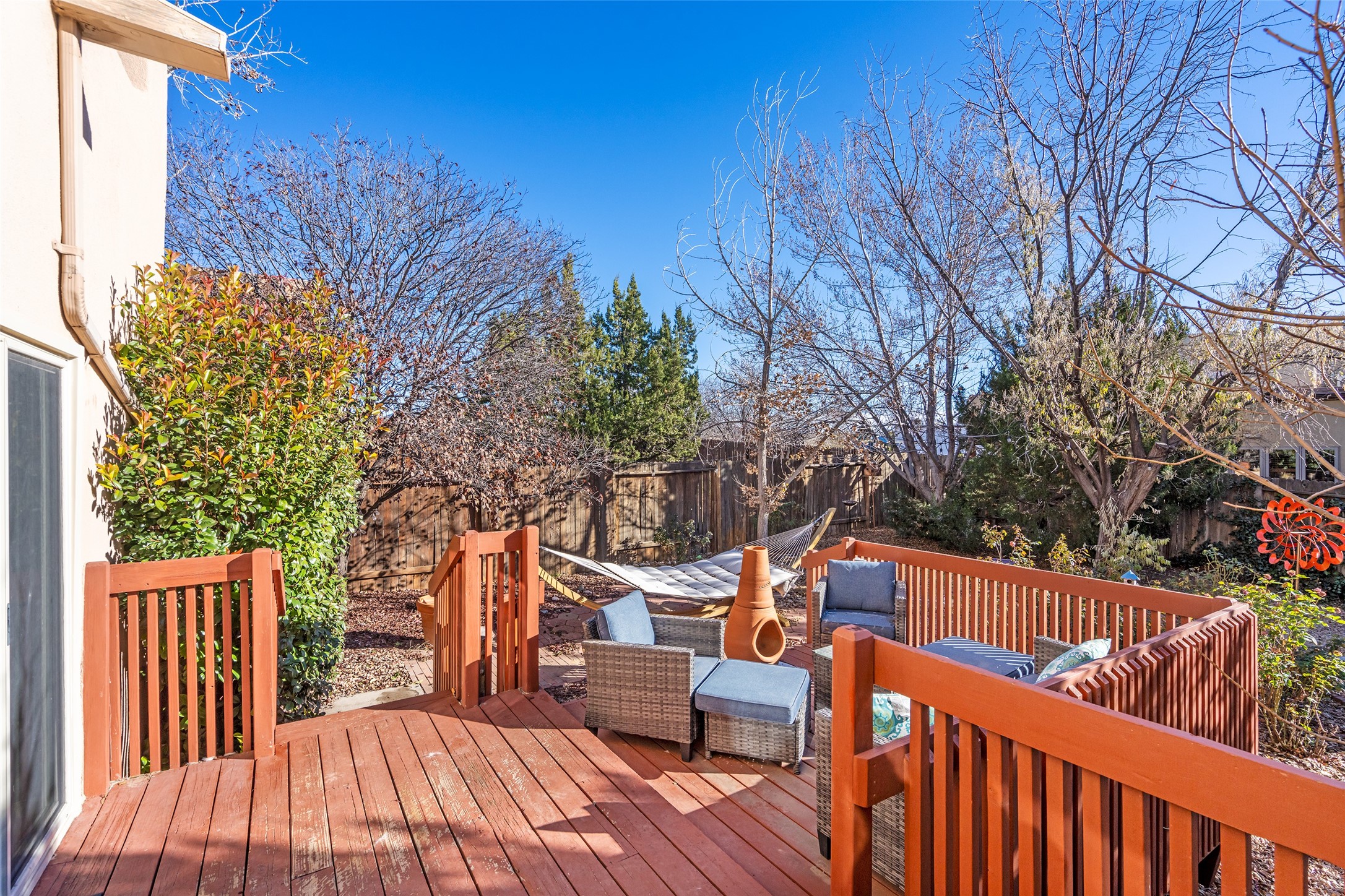 Welcome home! This light and bright two-story home in the quiet neighborhood of Pueblos del Sol, offers convenience, southwest character with vigas and a kiva fireplace as well as thoughtful updates throughout. Enjoy the classic Saltillo tile flooring on the main level and a mature, fully fenced, tree-filled backyard that provides both shade and charm to enjoy while sitting on the finished back deck! Upstairs, you'll find three sunny bedrooms with newer carpet, including a spacious primary suite featuring a generous walk-in closet and a bathroom illuminated by skylights that welcome in beautiful New Mexico sunshine. And don't forget the heated 2 car garage for conveneince! Ideally located, this home offers quick access to coffee shops, restaurants, medical facilities, and an easy commute to I-25, 599, and Hwy 285/84. Schedule a showing today, don't miss this one!