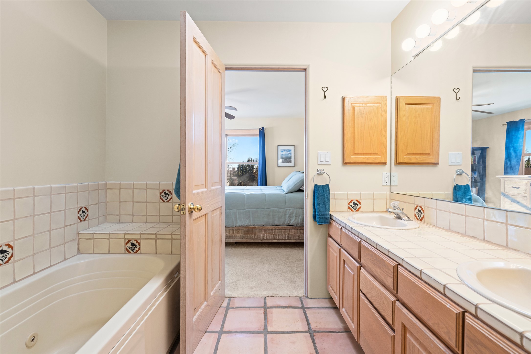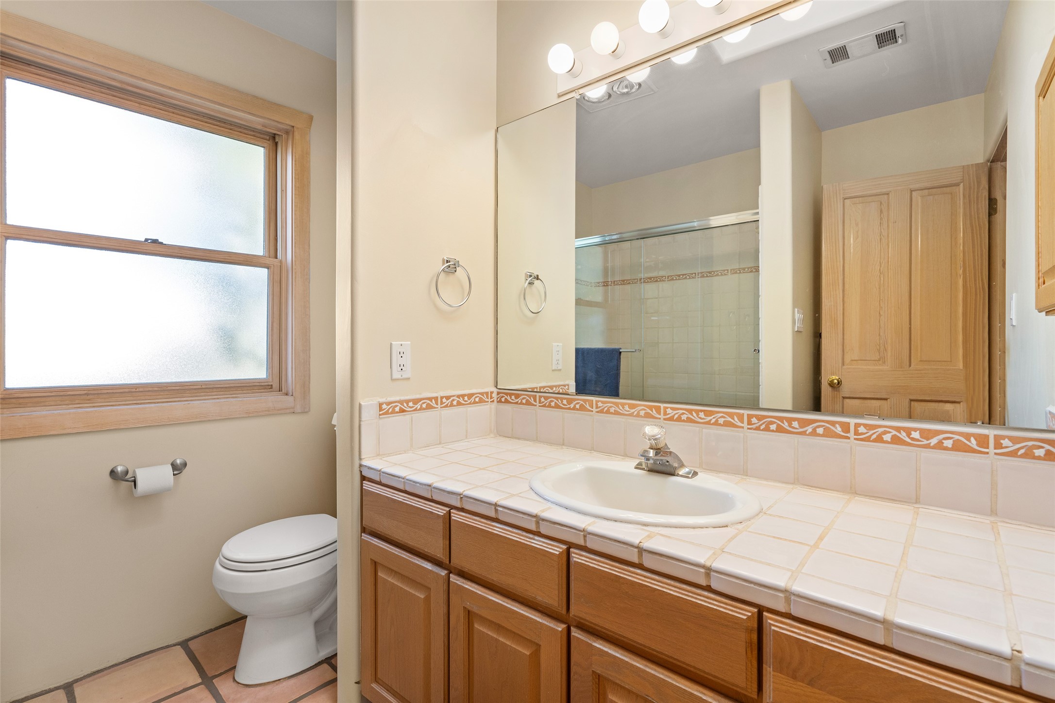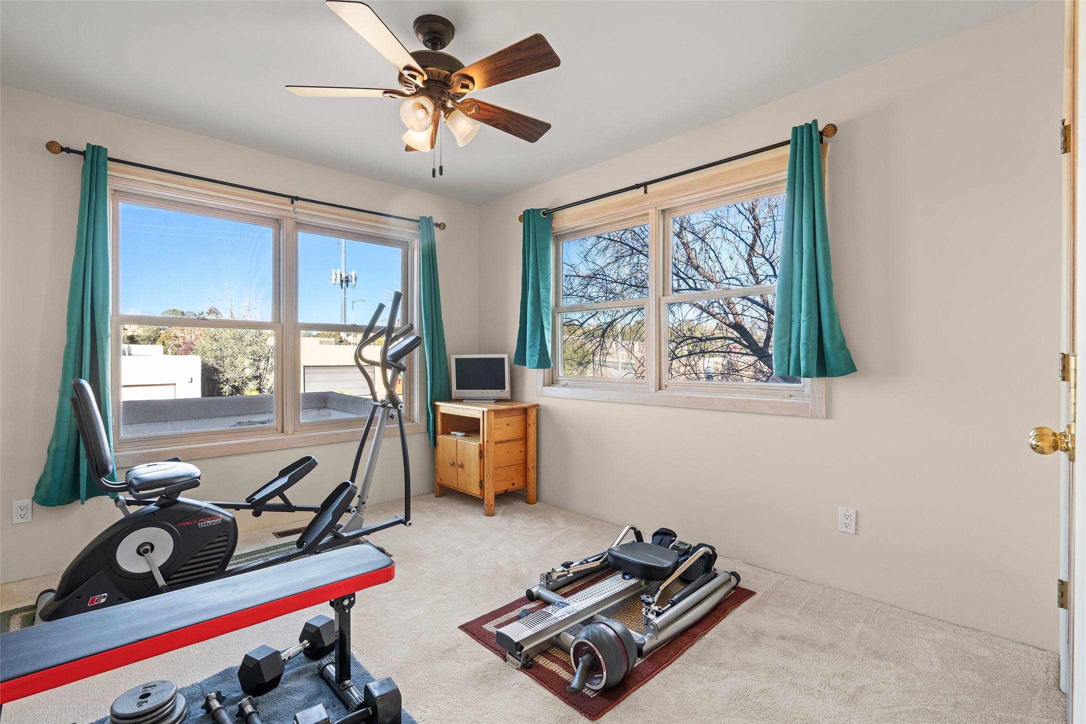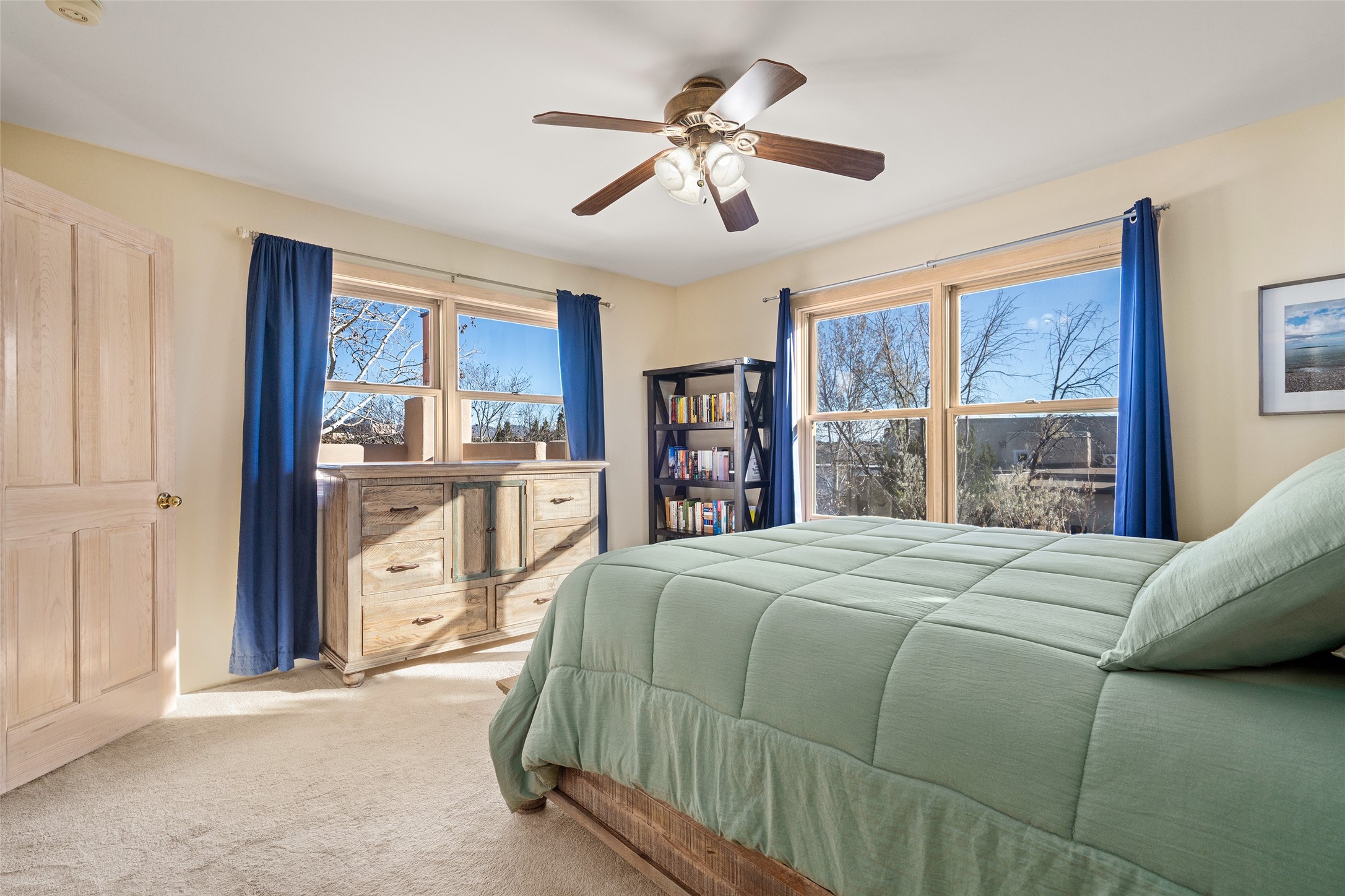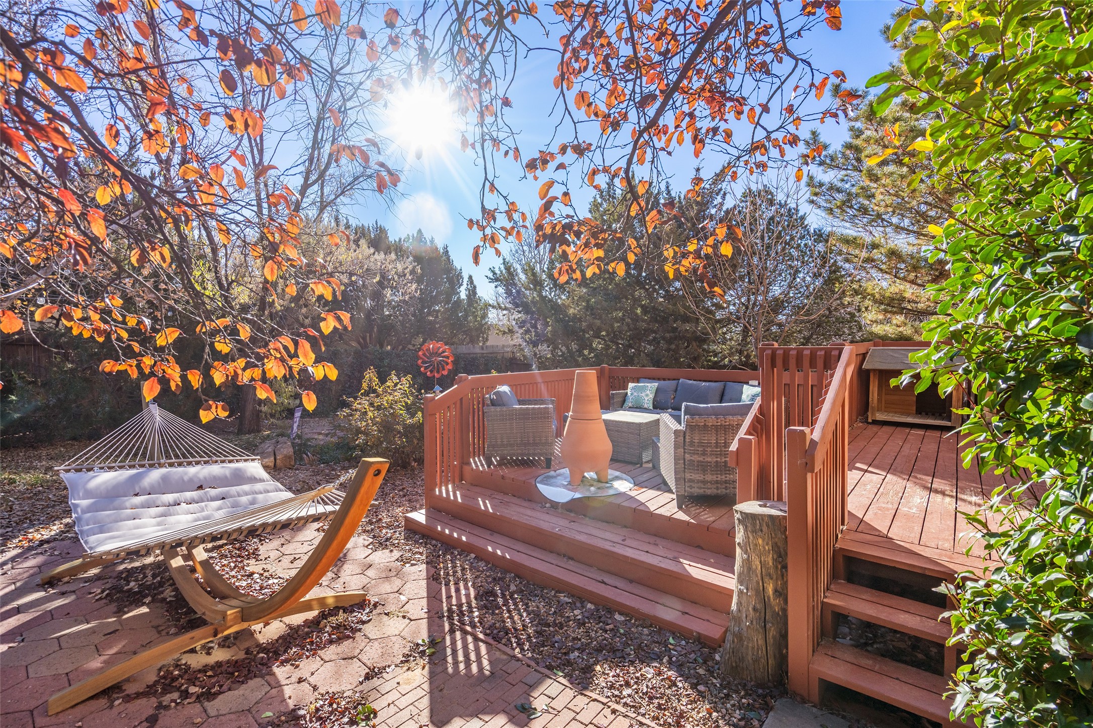 Welcome home! This light and bright two-story home in the quiet neighborhood of Pueblos del Sol, offers convenience, southwest character with vigas and a kiva fireplace as well as thoughtful updates throughout. Enjoy the classic Saltillo tile flooring on the main level and a mature, fully fenced, tree-filled backyard that provides both shade and charm to enjoy while sitting on the finished back deck! Upstairs, you'll find three sunny bedrooms with newer carpet, including a spacious primary suite featuring a generous walk-in closet and a bathroom illuminated by skylights that welcome in beautiful New Mexico sunshine. And don't forget the heated 2 car garage for conveneince! Ideally located, this home offers quick access to coffee shops, restaurants, medical facilities, and an easy commute to I-25, 599, and Hwy 285/84. Schedule a showing today, don't miss this one!