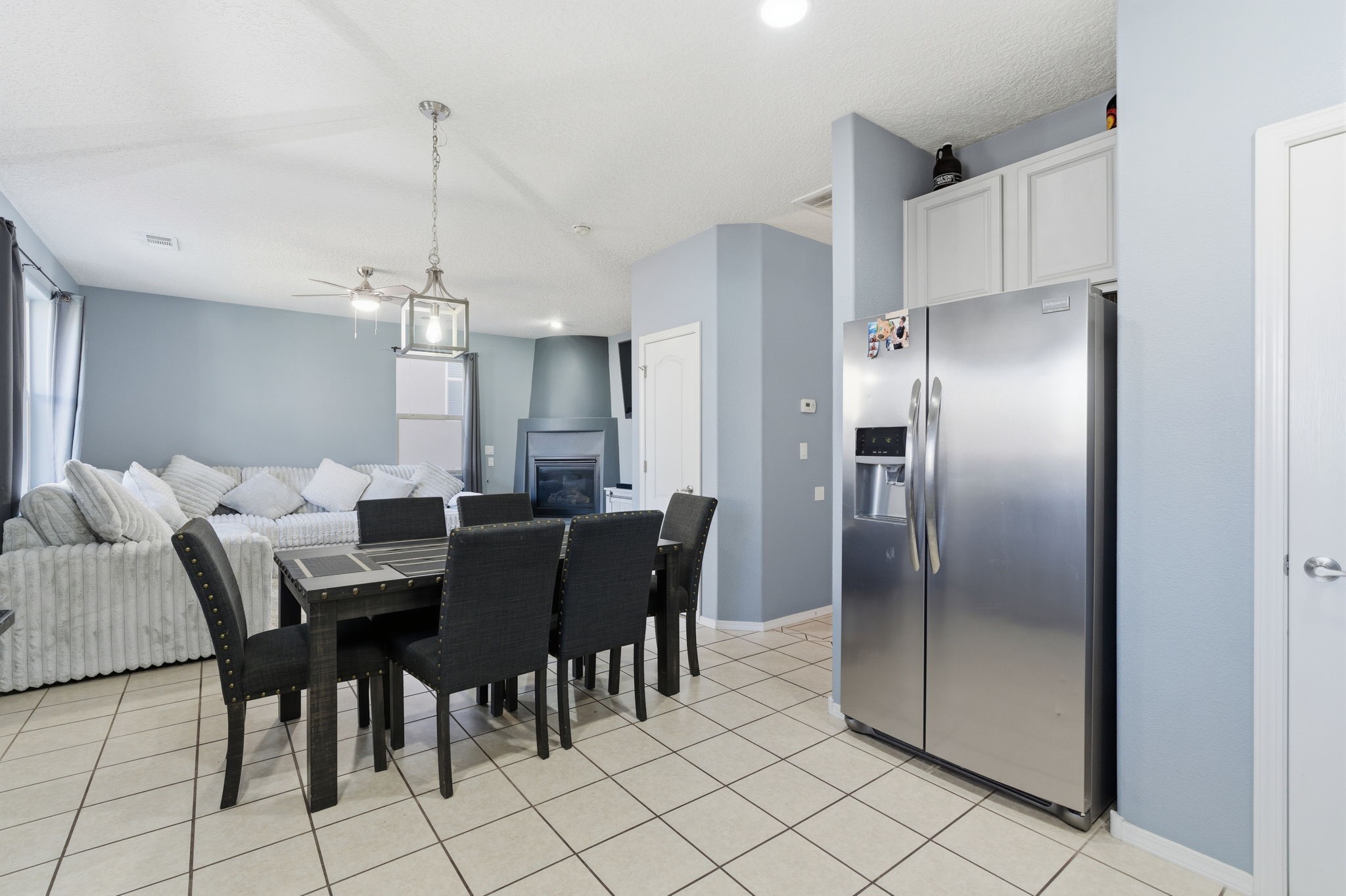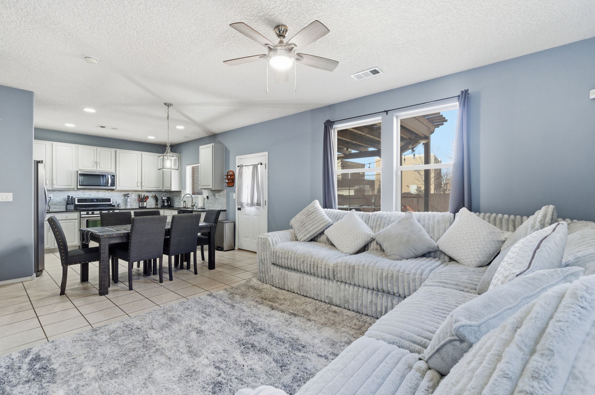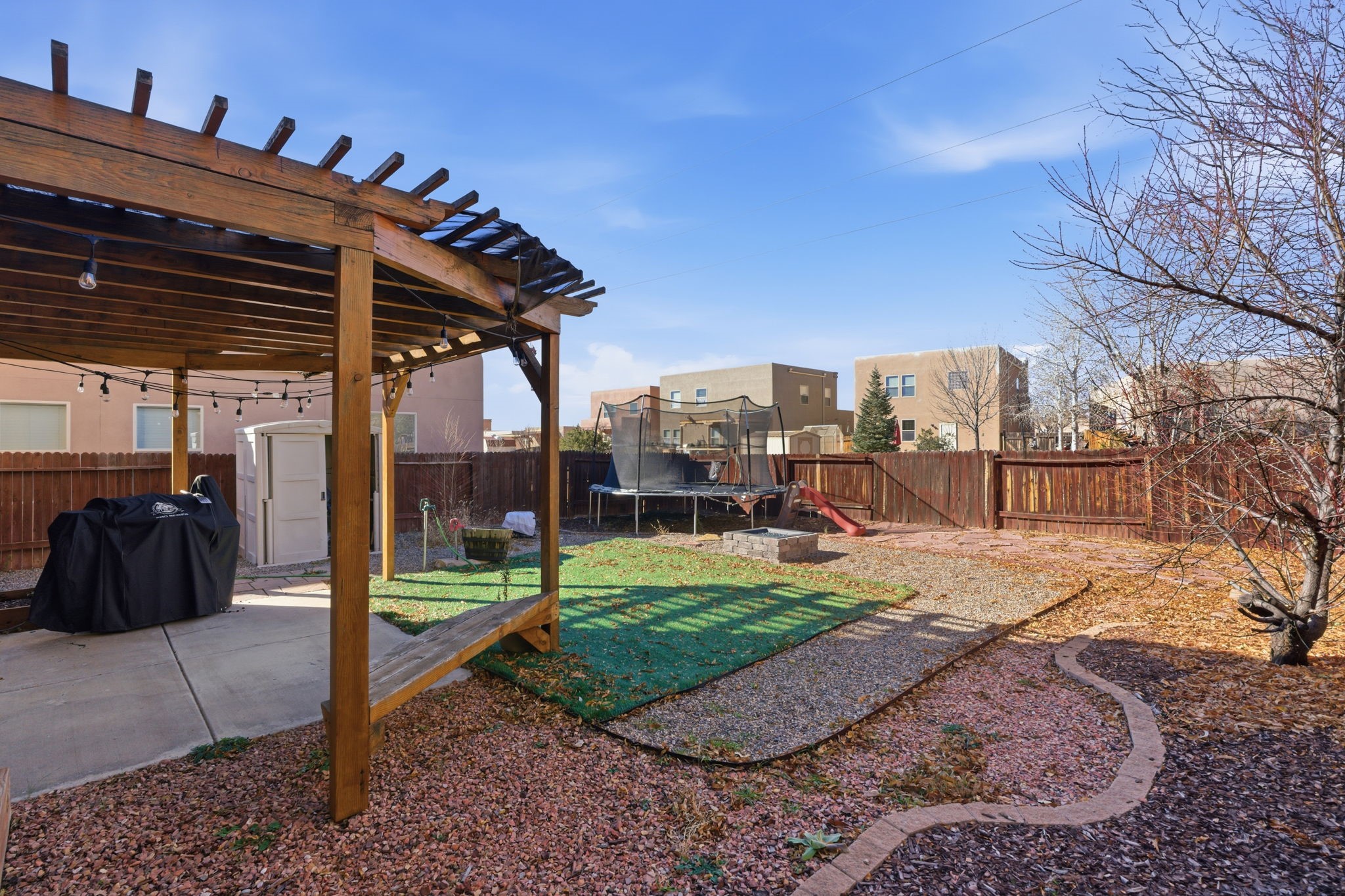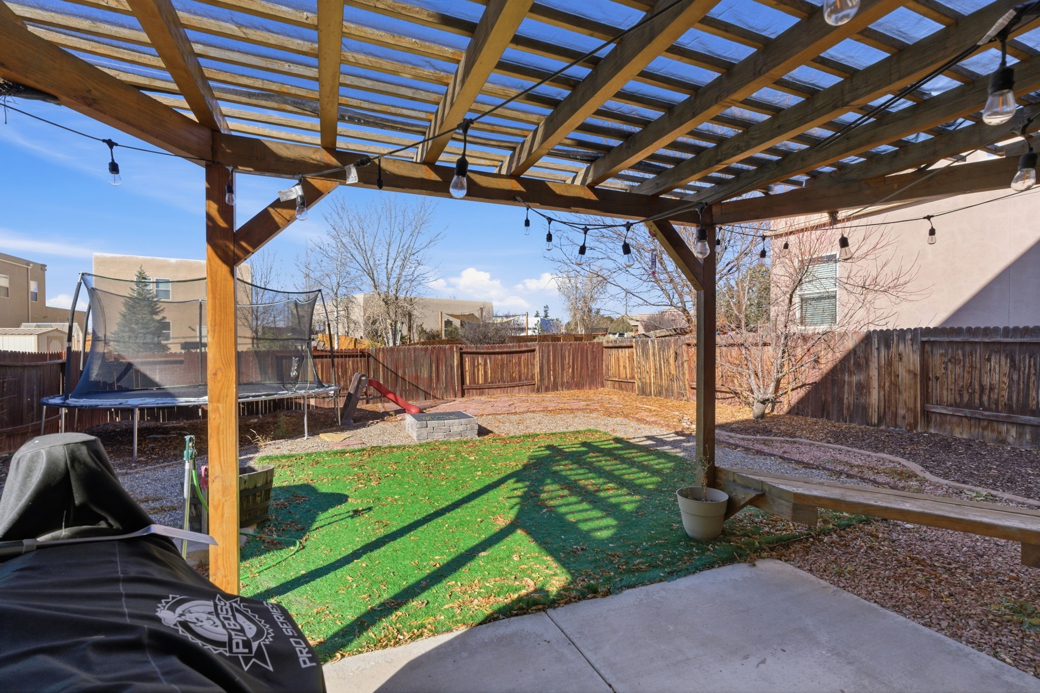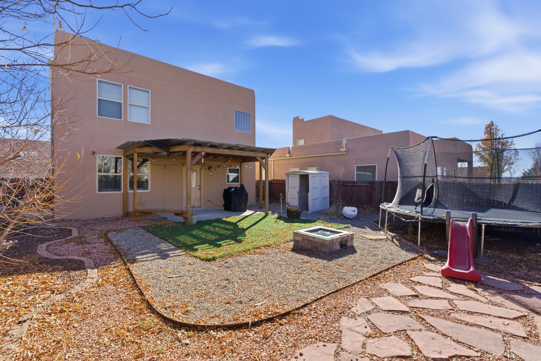 Offered at $535,000 3 Bed 3 Bath 1,843 sq ftBeautifully maintained two-story home built in 2010 with open floor plan and modern finishes. Main level features a bright living area with gas Kiva fireplace, dining space, and kitchen with stainless steel appliances, glass tile backsplash, and tile flooring. Upstairs includes a versatile loft and spacious primary suite with soaking tub, shower, and two walk-in closets.Enjoy outdoor living in the fully fenced backyard with wood pergola, built-in firepit, and storage unit. Additional highlights: refrigerated air, forced air heating, rain barrels, front portal entry, and attached two-car garage. HOA provides access to community park and walking trails.Conveniently located near schools, shopping, medical facilities, Santa Fe Community College, and Genoveva Chavez Community Center, with easy access to I-25 and Hwy 599. Move-in ready and full of Santa Fe charm!