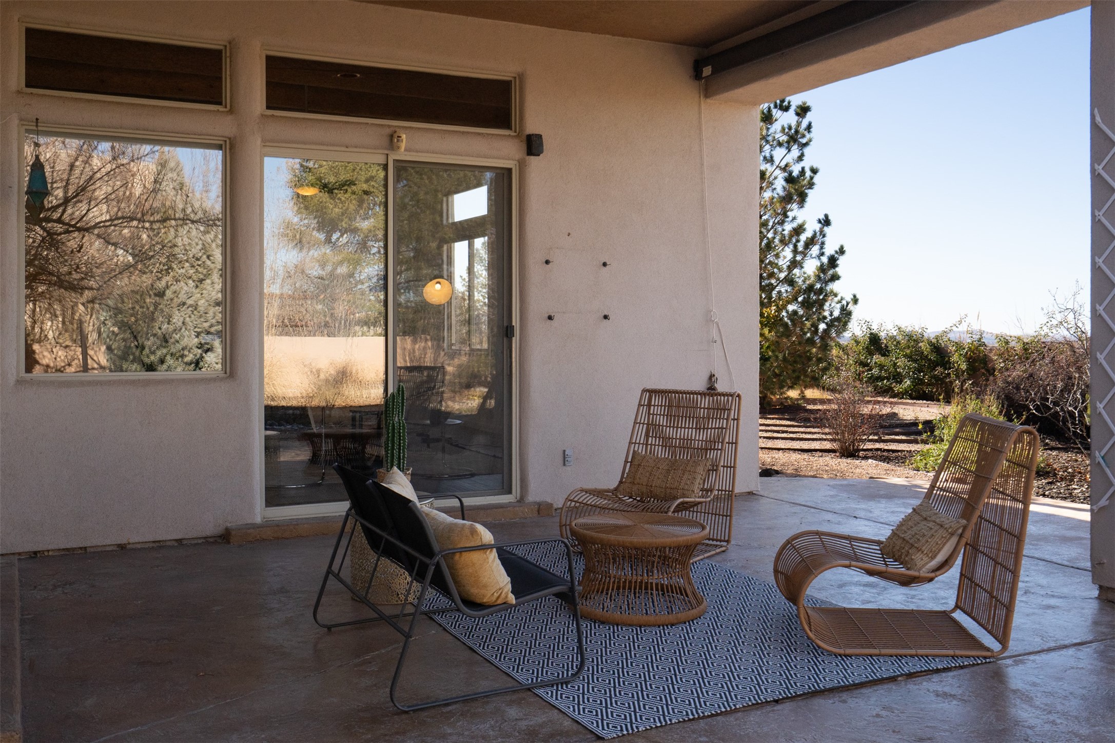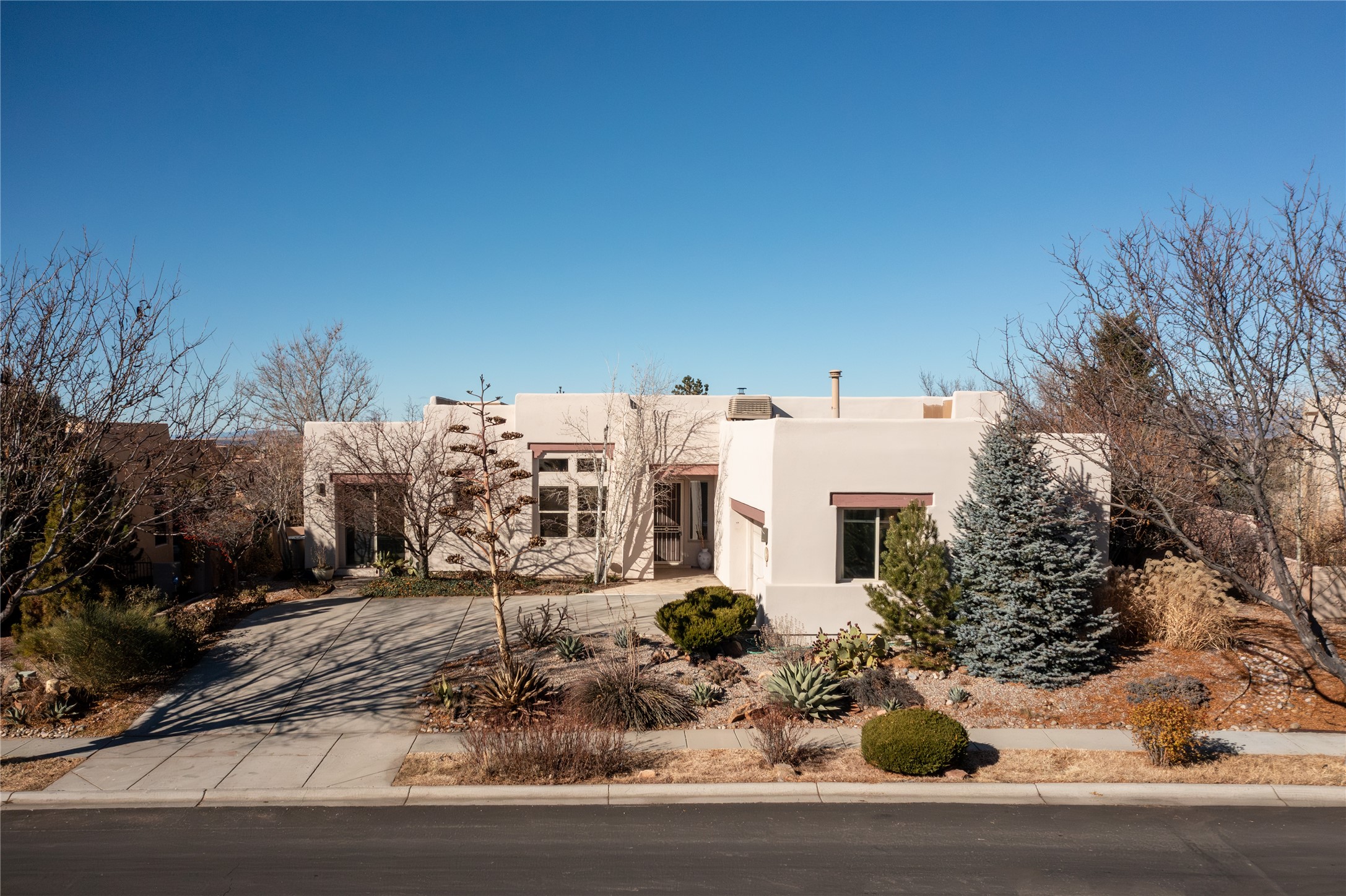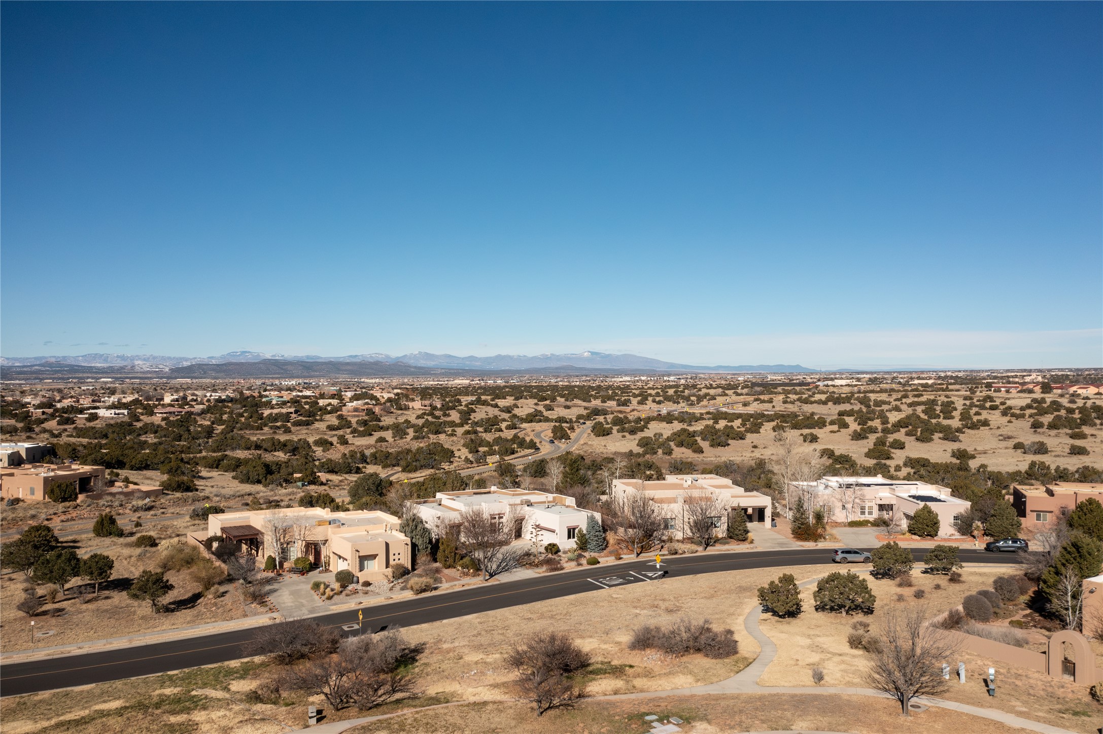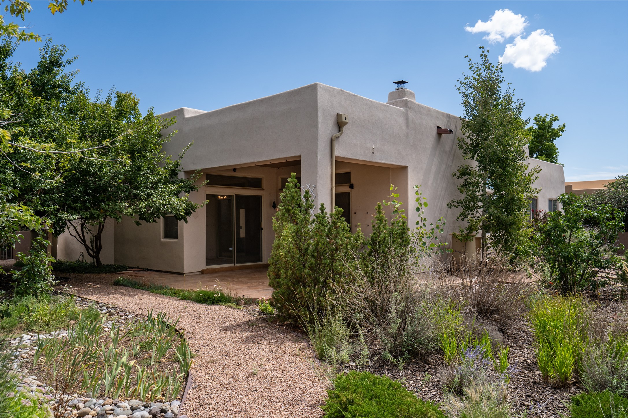 Unobstructed views of the Jemez and Ortiz Mountains set the tone for this bright, beautifully maintained Santa Fe home, loved by one family for decades. Located on an arroyo with green space in both front and back, the setting seems private while still being walkable to the Santa Fe Community College and Pantry Dos. Recent updates include new flooring (no carpet), new appliances, and fresh paint throughout. The great room is filled with natural light and features high ceilings, vigas, and a corner kiva fireplace. The spacious kitchen, breakfast nook, dining area, and living room come together in one open, well-designed space that fills the home with light and function. The large primary bedroom is privately situated apart from the two additional bedrooms. A separate studio/den/flex space provides added versatility for work, creativity, or a second living area. Outdoor living is a highlight, with a deep back portal oriented toward the mountains, a manicured backyard, and mature landscaping. Radiant heat, evaporative cooling, and a completed pre-inspection add to the home's comfort and peace of mind. A clean, bright property with classic Santa Fe style and an exceptional setting--the kind of home that doesn't come along often.