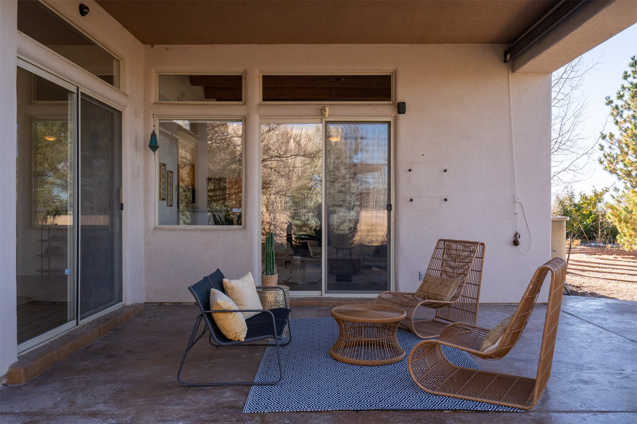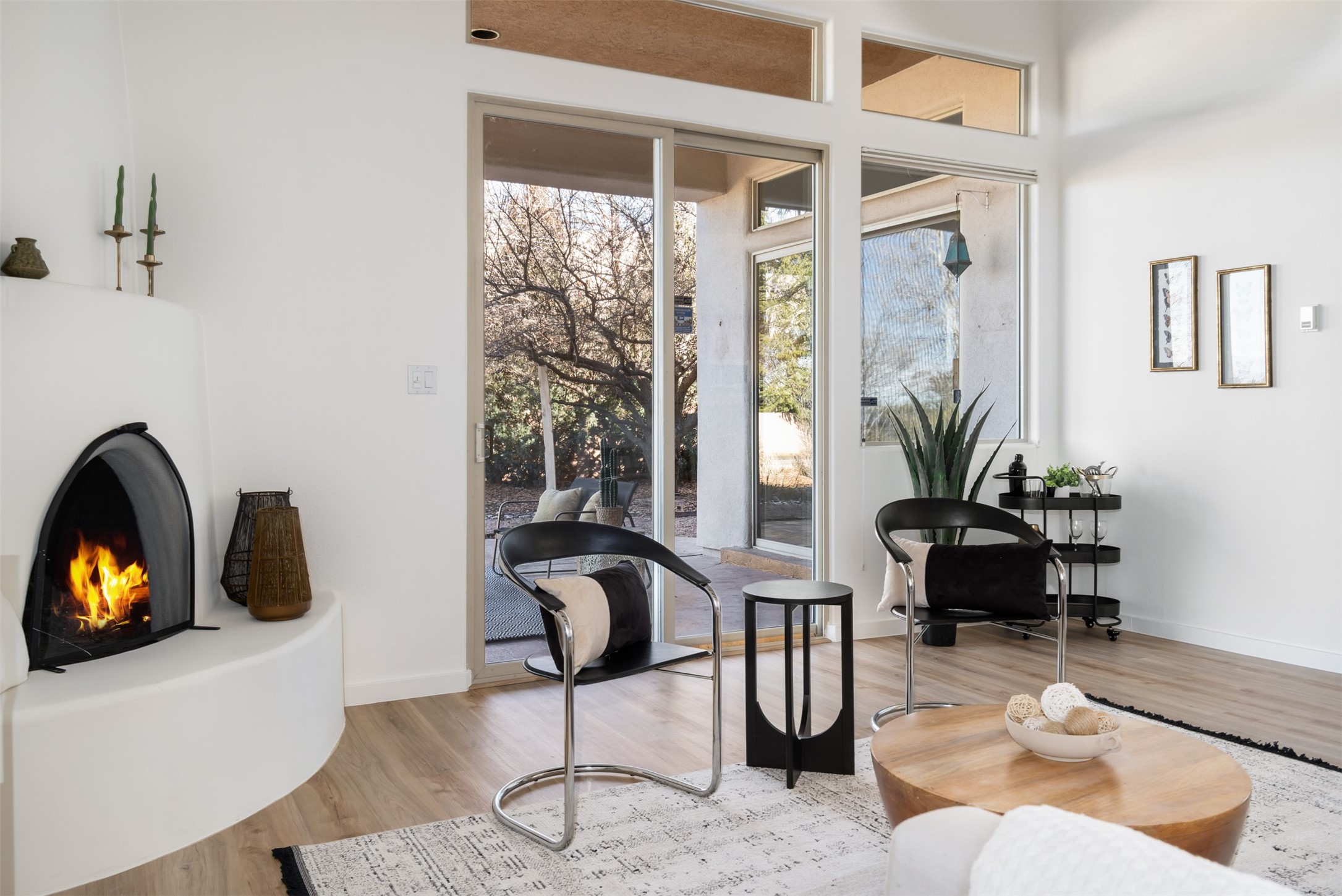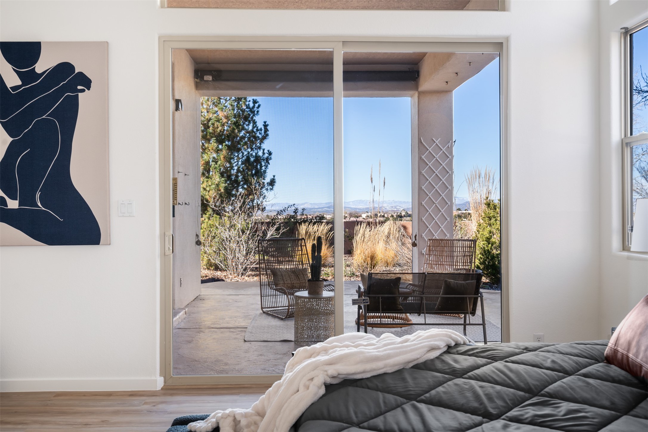 Unobstructed views of the Jemez and Ortiz Mountains set the tone for this bright, beautifully maintained Santa Fe home, loved by one family for decades. Located on an arroyo with green space in both front and back, the setting seems private while still being walkable to the Santa Fe Community College and Pantry Dos. Recent updates include new flooring (no carpet), new appliances, and fresh paint throughout. The great room is filled with natural light and features high ceilings, vigas, and a corner kiva fireplace. The spacious kitchen, breakfast nook, dining area, and living room come together in one open, well-designed space that fills the home with light and function. The large primary bedroom is privately situated apart from the two additional bedrooms. A separate studio/den/flex space provides added versatility for work, creativity, or a second living area. Outdoor living is a highlight, with a deep back portal oriented toward the mountains, a manicured backyard, and mature landscaping. Radiant heat, evaporative cooling, and a completed pre-inspection add to the home's comfort and peace of mind. A clean, bright property with classic Santa Fe style and an exceptional setting--the kind of home that doesn't come along often.