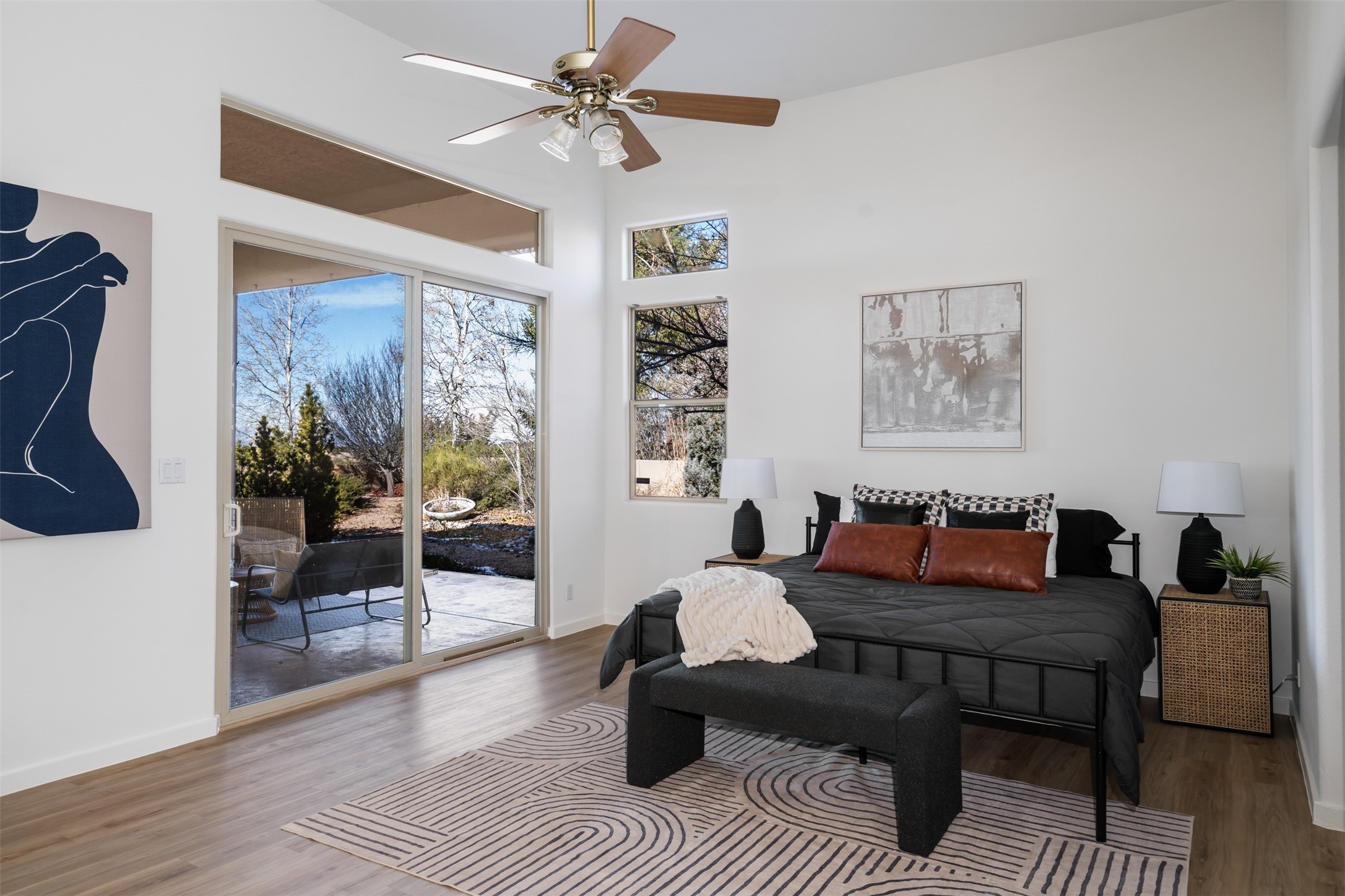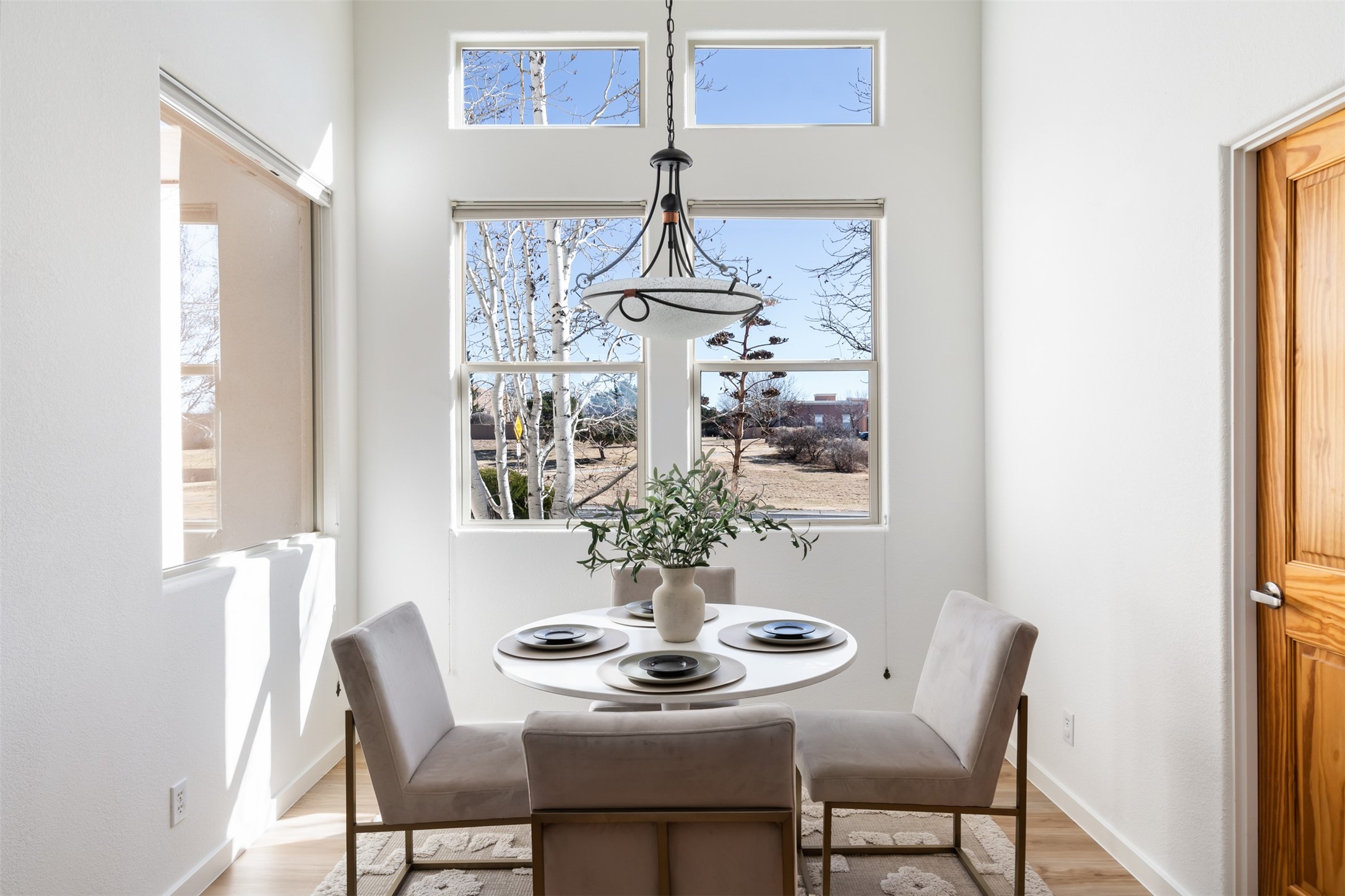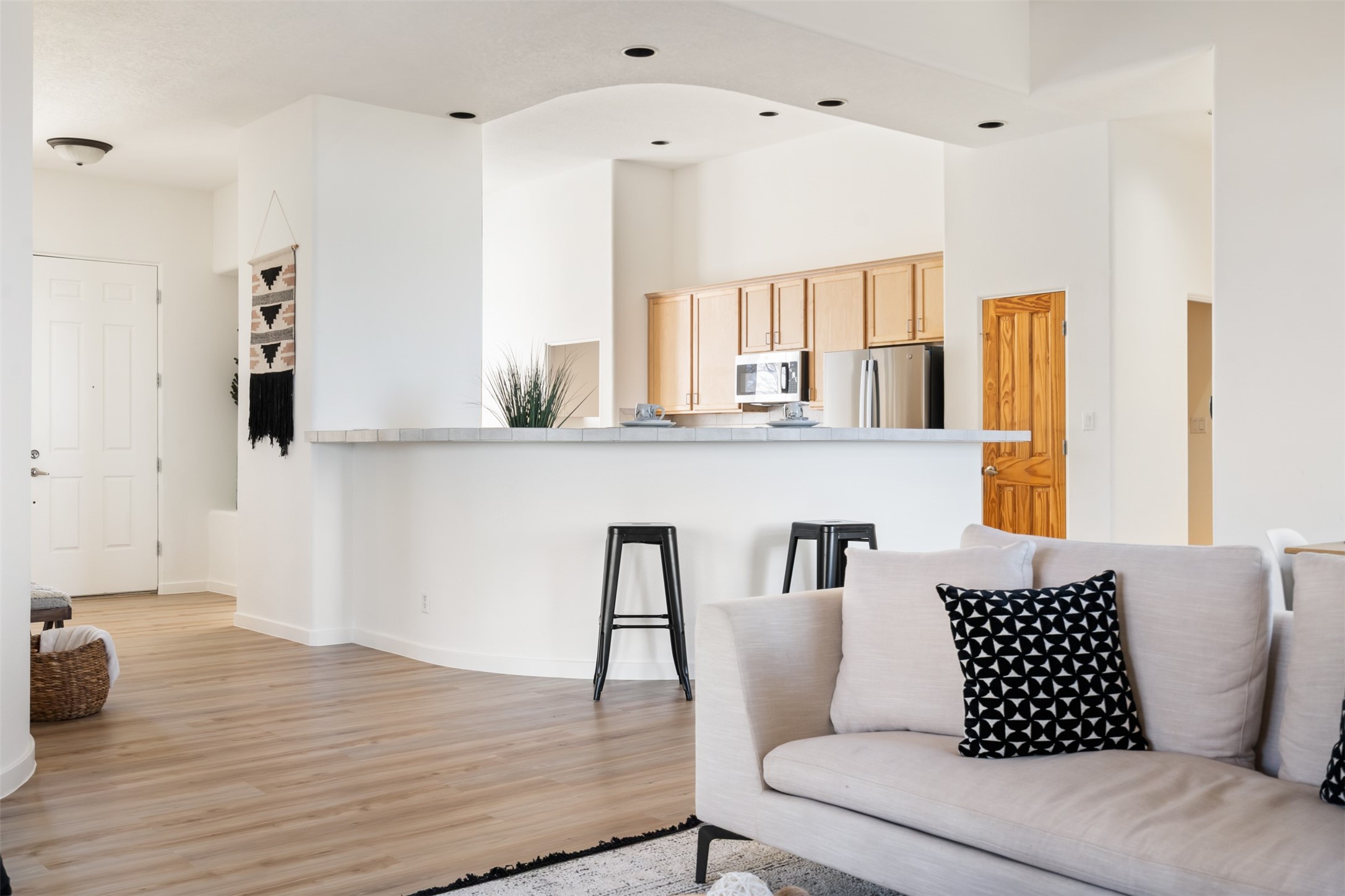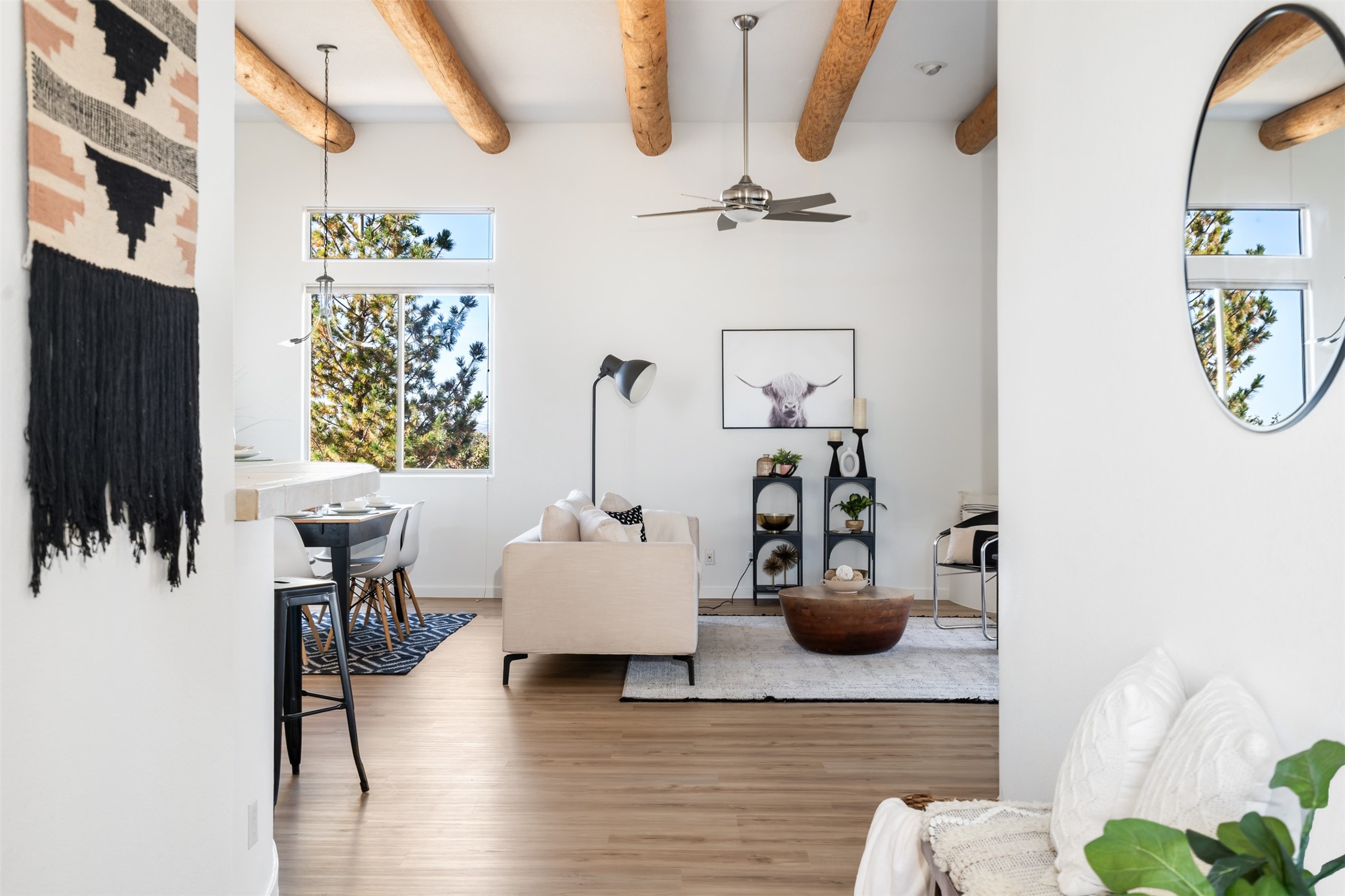 Unobstructed views of the Jemez and Ortiz Mountains set the tone for this bright, beautifully maintained Santa Fe home, loved by one family for decades. Located on an arroyo with green space in both front and back, the setting seems private while still being walkable to the Santa Fe Community College and Pantry Dos. Recent updates include new flooring (no carpet), new appliances, and fresh paint throughout. The great room is filled with natural light and features high ceilings, vigas, and a corner kiva fireplace. The spacious kitchen, breakfast nook, dining area, and living room come together in one open, well-designed space that fills the home with light and function. The large primary bedroom is privately situated apart from the two additional bedrooms. A separate studio/den/flex space provides added versatility for work, creativity, or a second living area. Outdoor living is a highlight, with a deep back portal oriented toward the mountains, a manicured backyard, and mature landscaping. Radiant heat, evaporative cooling, and a completed pre-inspection add to the home's comfort and peace of mind. A clean, bright property with classic Santa Fe style and an exceptional setting--the kind of home that doesn't come along often.