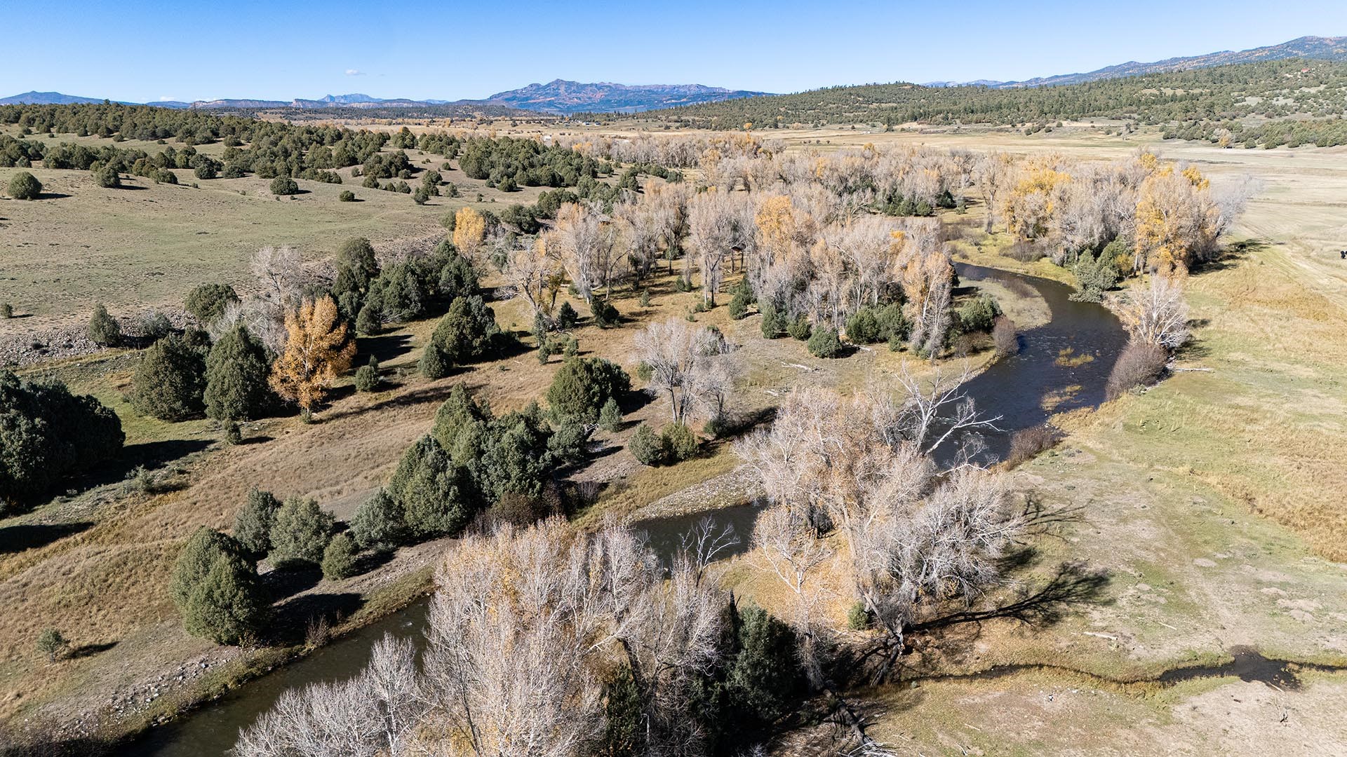 El Barranco Ranch on the Chama River consists of 440 gorgeous acres, blessed with 1.5 miles of both sides of the Chama River in Northern New Mexico. The El Barranco trio of fly fishing, agriculture, and big game hunting is difficult to match on one property. The ranch offers excellent fly fishing on the trout-rich Chama River, which winds through a beautiful setting of cottonwoods. Fly fishing is a prominent feature, but the opportunity to hunt elk or mule deer cannot be overlooked. The ranch borders the vast, undeveloped acreage of the Jicarilla Apache Nation, as well as the renowned elk and mule deer habitat that exists on those lands. Elk and mule deer routinely visit El Barranco's hayfields and river bottom to feed and water. The ranch is eligible for and has received multiple hunting vouchers. It is not unusual at El Barranco in the early fall to hunt elk or mule deer in the morning, fish for large brown and rainbow trout in the middle of the day, and then enjoy another evening hunt. There is more value than just the first-class recreational aspects of the ranch. Substantial senior water rights lead to great hay production and cattle grazing, which has been the primary focus of the current owners. Farm work can be done hands-on or by retaining existing hay and grazing leases. At a time when live water fishing properties and senior water rights are hard to find, a rare recreational and agricultural opportunity awaits the buyer of this gold medal property. Buyers seeking additional acreage should consider the 270 acre El Barranco East property, located across the highway.