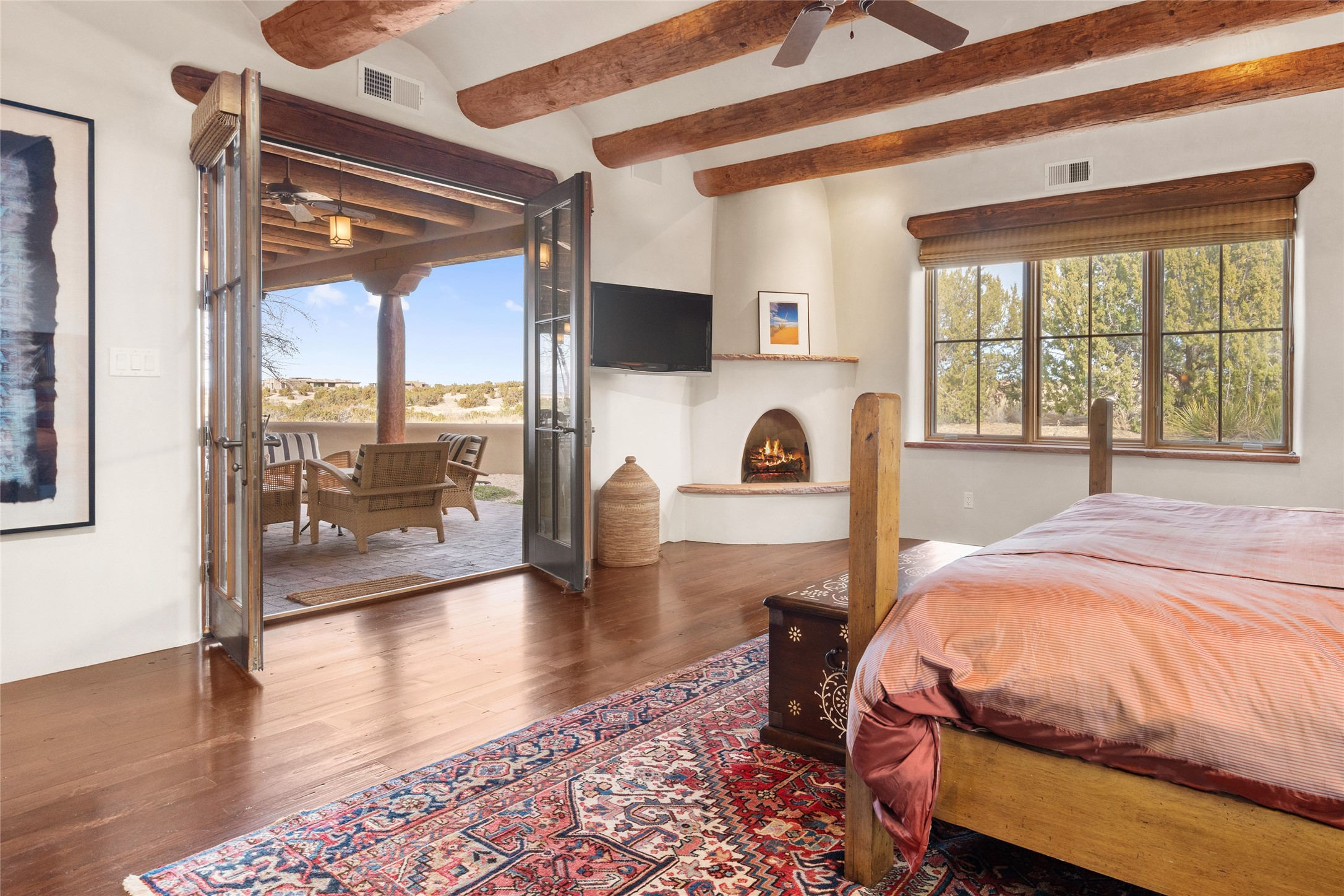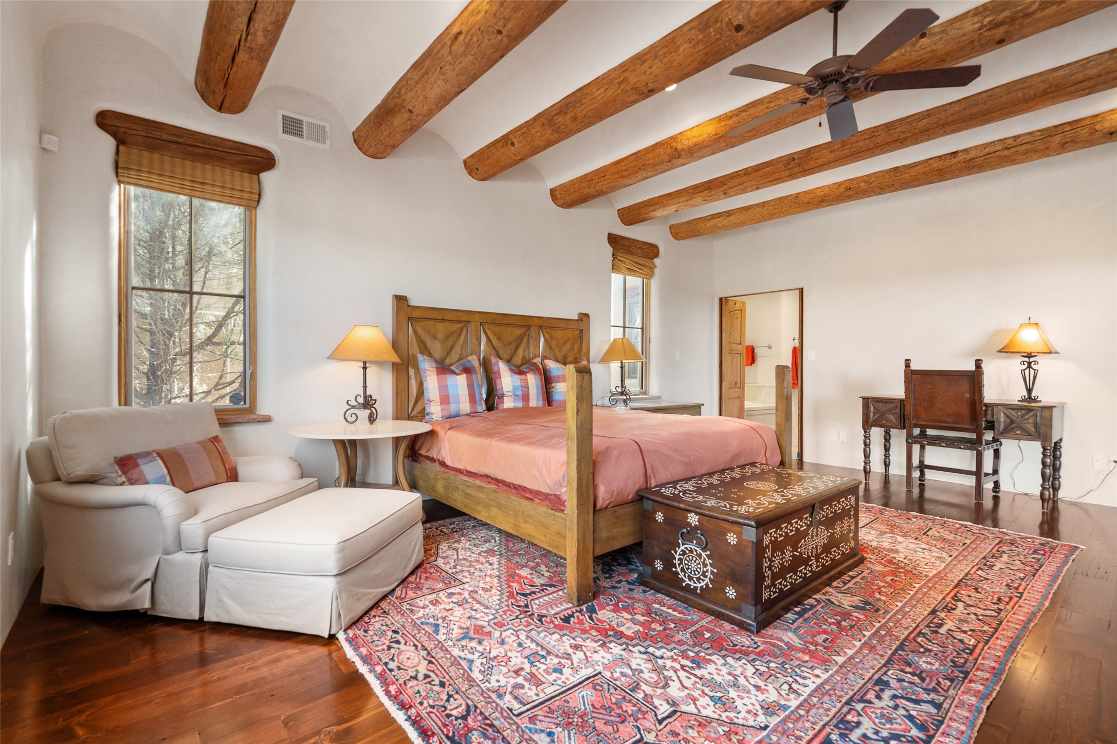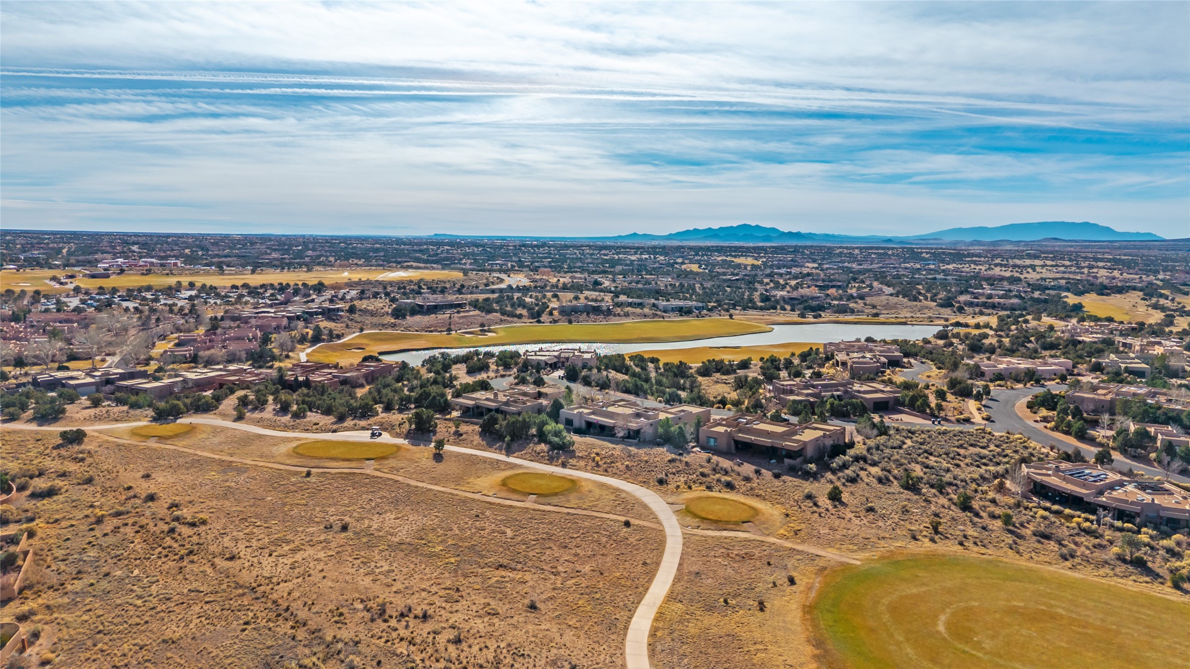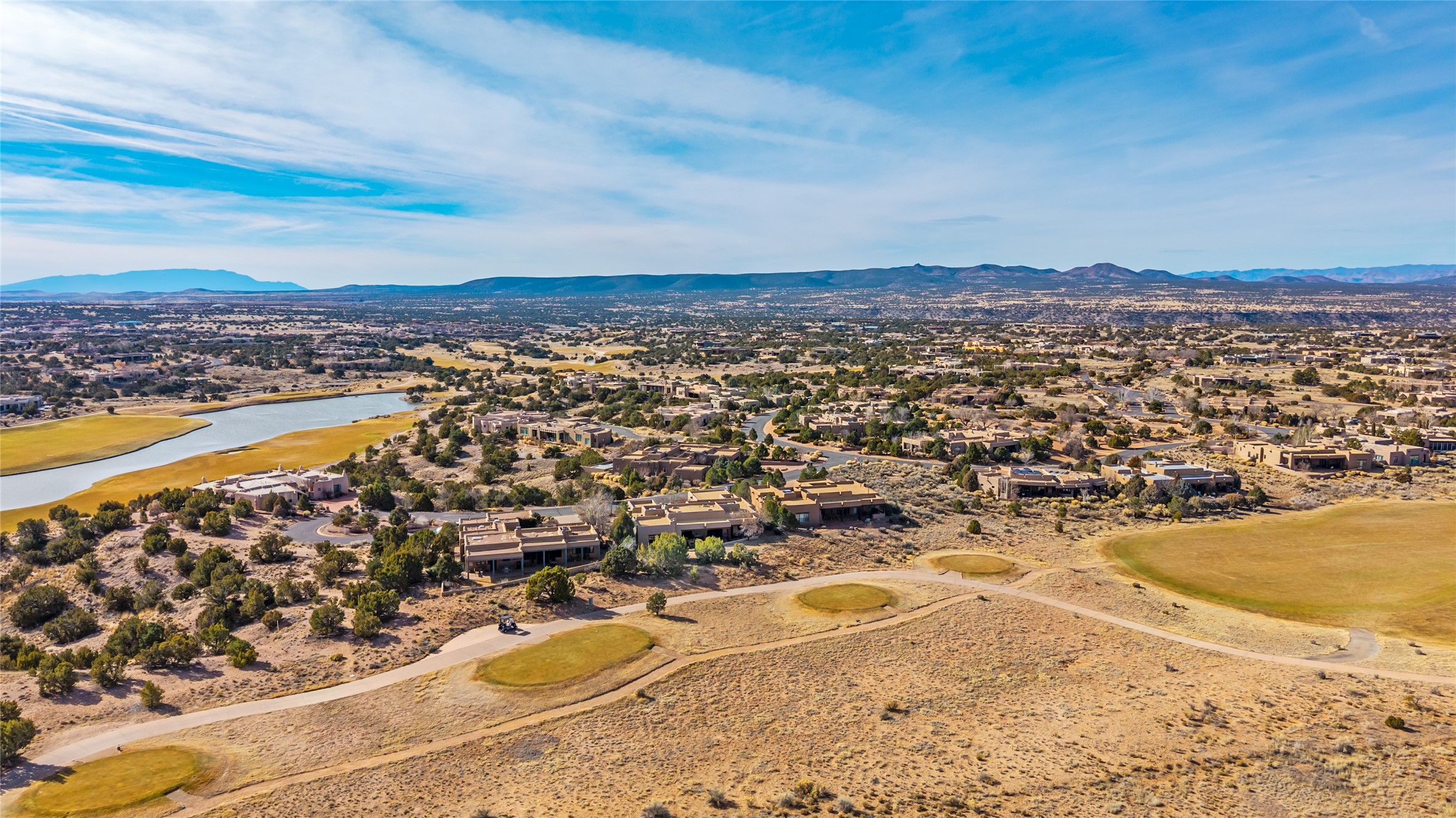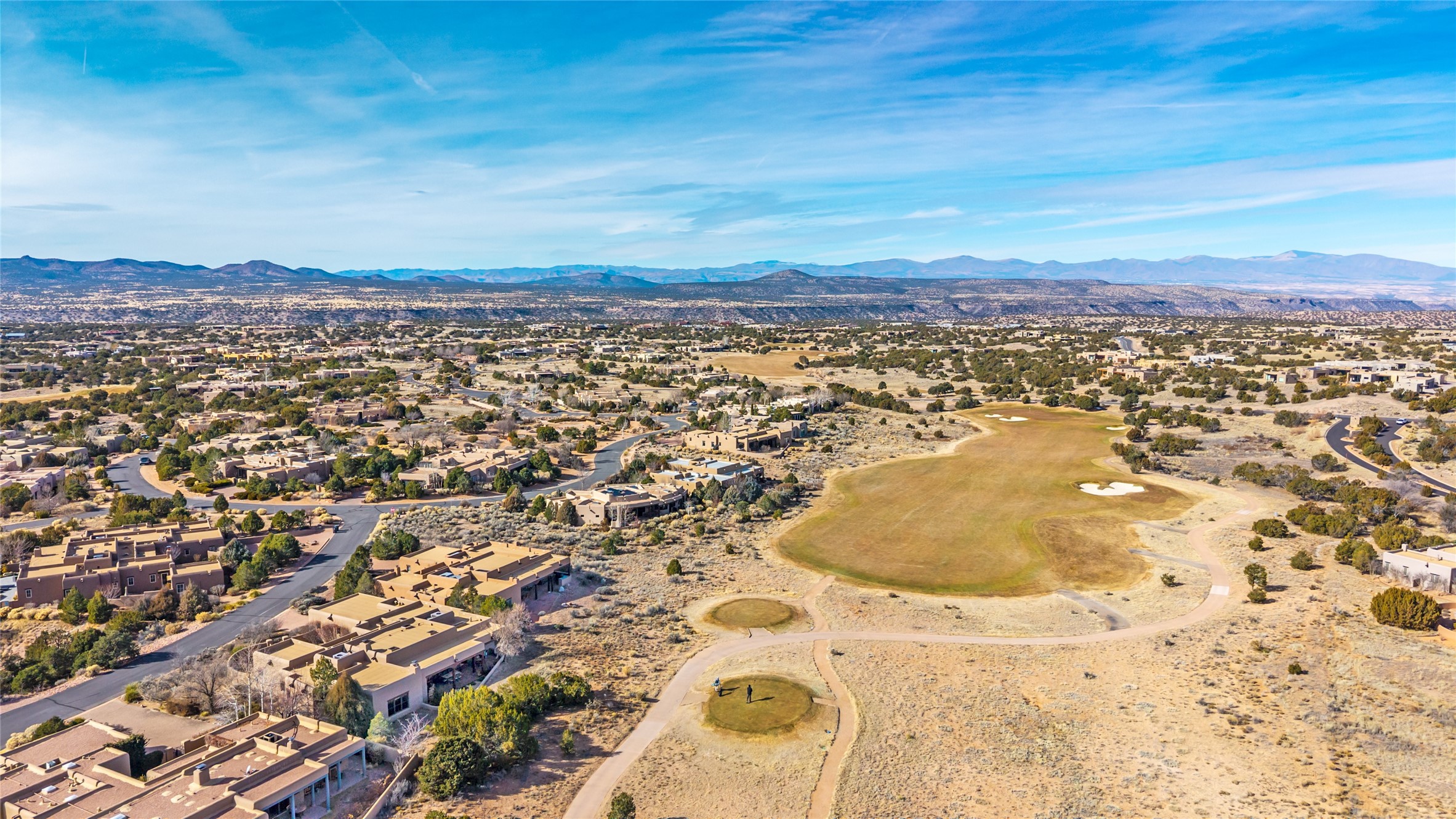 PERCHED ON A SLEEPY CUL DE SAC IN THE COVETED PUEBLOS ENCLAVE OF LAS CAMPANAS IS AN EXTRAORDINARY PROPERTY WITH HANDSOME SANTA FE TOUCHES THROUGHOUT, GREAT INDOOR/OUTDOOR ENTERTAINING SPACES AND ARCHITECTURAL DETAILS THAT ADD INTEREST AND TRUE COMFORT. Gleaming plaster walls, coved vigas, and warm wood floors anchor the residence. A spacious, cook's kitchen with center island, granite counter tops and high-end appliances - replete with a generous butler's pantry. Good sized laundry and a mud room area adjacent to entry from garage. The floor plan provides marvelous separation of spaces - including the 3 bedrooms and wide hallways that double as fine gallery space. New Stucco. Rare offering in a section of Las Campanas where homes seldom come to market.