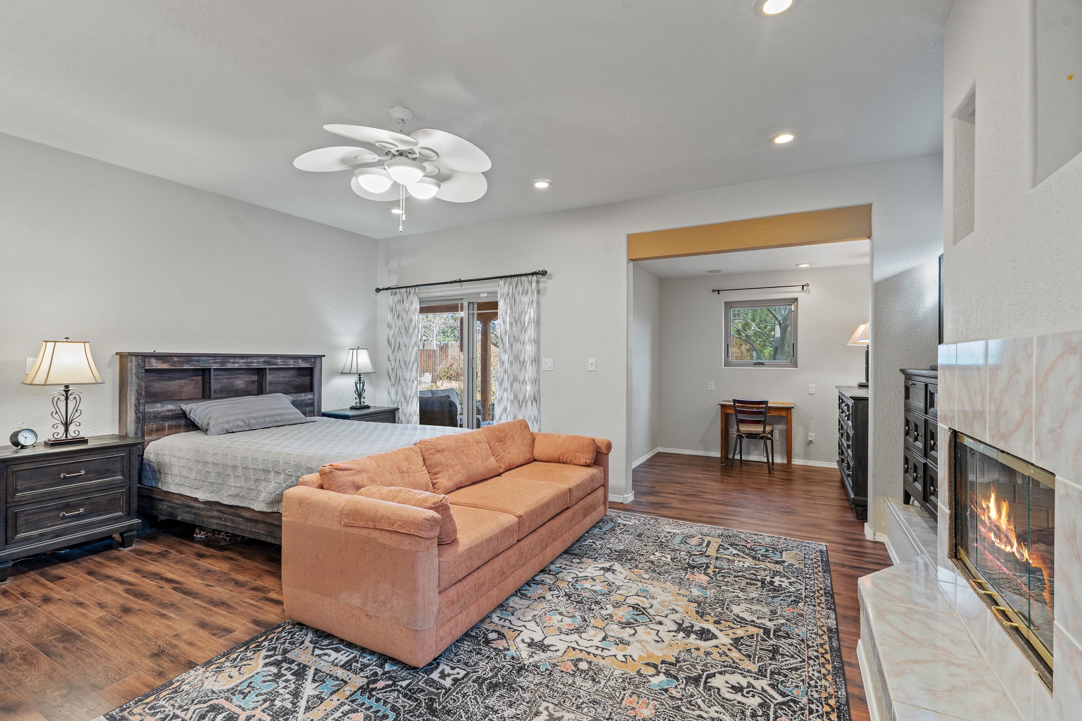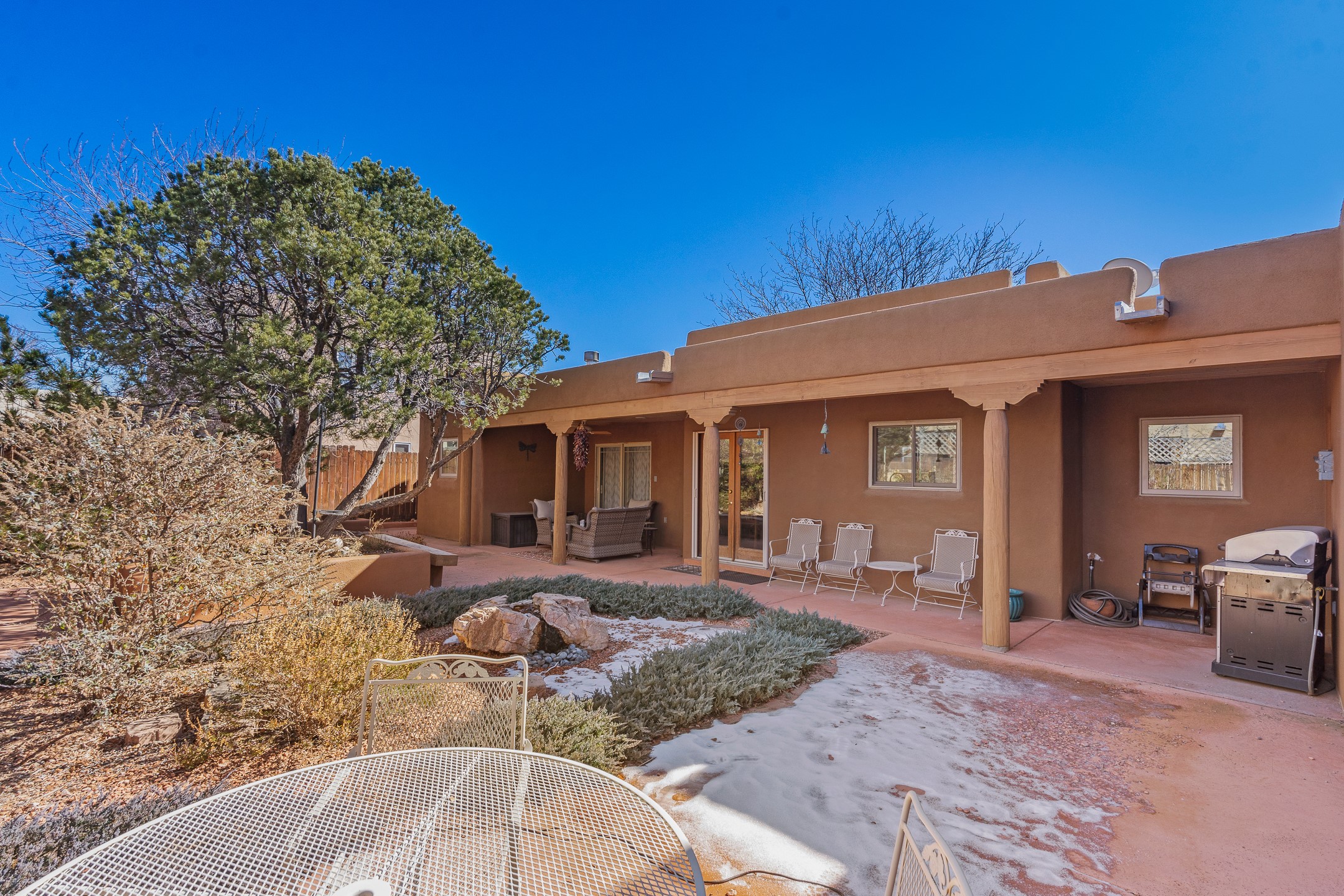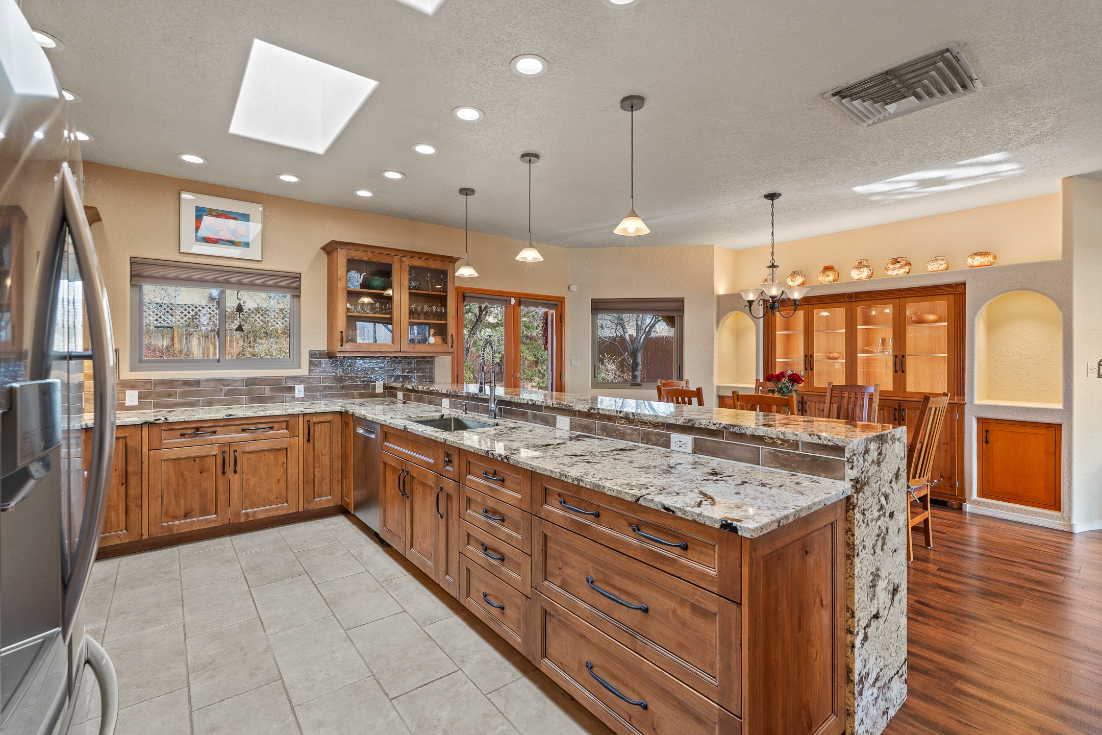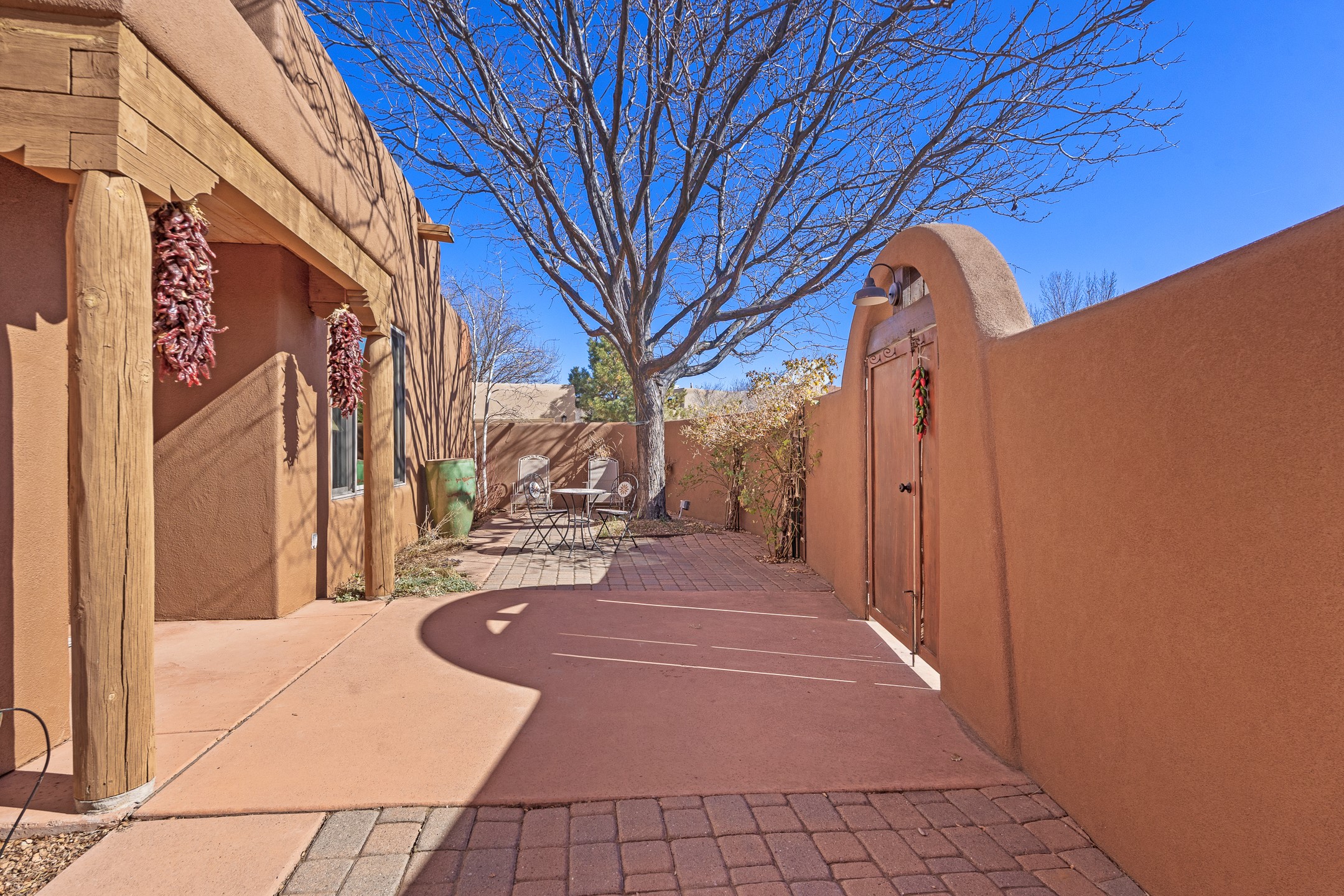 Tucked into the coveted Pueblos Del Sol neighborhood, this custom home with a guest house is a rare find--offering privacy, thoughtful design, and flexible living. The main house and guest house are connected by a two-car garage, yet are completely separate and private, and are enclosed within a stucco wall that creates a private, cohesive compound. The 1,892 sq. ft. single-level main residence features 3 bedrooms and 2 bathrooms with a light-filled open-concept living, kitchen, and dining area. The generous South-facing living room offers high tongue-and-groove ceilings with beams, warm wood flooring, and a corner gas fireplace for added ambience. The recently renovated kitchen--designed by Sven Grell of Santa Fe Kitchen Design--is the centerpiece of the home. It features beautiful granite countertops, custom Alder wood cabinetry, stainless steel appliances, and a functional U-shaped layout with bar seating--creating a seamless space for cooking and conversation. The adjacent dining area is enhanced by a custom, lighted built-in buffet--perfect for displaying pottery, glassware, or treasured dishware. The private, landscaped backyard is accessible from both the dining room and the primary suite. The primary bedroom includes a gas fireplace and a generous sitting area--ideal for a home office or reading nook. The 533 sq. ft. 1-bedroom, 1-bathroom guest house enjoys its own entrance and private courtyard, and has been a successful rental for the current owners. Additional bonuses: In-floor radiant heat, mini-split and evaporative cooling, ample off street parking and a wonderful South-facing front courtyard for sunny, winter morning coffee hour. This is a rare opportunity to own both a beautifully crafted home and a private guest house in one of Santa Fe's desirable midtown neighborhoods--complete with access to nearby trails, privacy, and timeless Santa Fe charm.