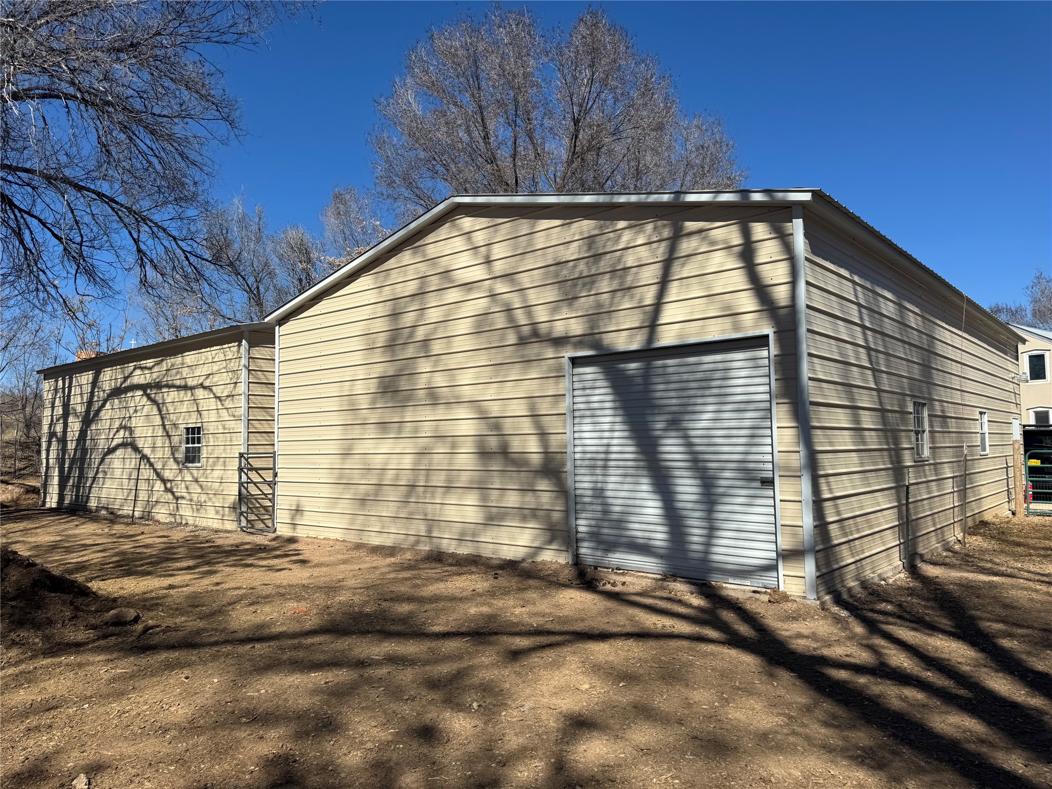 This rare Santa Fe County (Namb area), fenced horse property has water rights, mountain views, lots of shade trees, a barn, a shop, and a greenhouse. Situated on 1.389 lush, irrigated and fenced acres, this 3-bedroom, 2-bath, custom northern NM style home offers 2,196 sq ft with refrigerated-air, HVAC, ceiling fans, vaulted pine ceilings, exposed vigas, solid ash hardwood floors,and a spacious loft for hobbies or relaxing. Open living area features high-efficiency Acucraft wood-burning fireplace insert. Kitchen includes granite countertops, island, custom cabinets with pull-out shelving, wine storage, and quality appliances. Primary suite offers walk-in closets, spa-style bath with air-jetted tub, and natural travertine tile. Private guest suite includes separate exterior entrance and ensuite bath with travertine tile and cave horse art accent tiles by a local artist. Outdoor living features flagstone portals and walkways, ceiling fan, 1620 Trex deck, patio with fire pit, mature landscaping with drip irrigation, fruit trees, 1220 greenhouse, raised-bed garden, solar-powered gate, perimeter fencing (partial latilla), RV trailer parking and horse trailer parking. Horse amenities include grassy fenced turnout, 3035 three/four stall barn with partially insulated feed/tack room, huge area for hay storage, large corral, and ability to ride out from the property on shady trails (also Bureau of Land Management access within 3 miles). The 3045 metal building "dream shop" features three roll-up doors, reinforced slab for heavy-duty car lift installation, 110V and 220V electricity, workbench with lower shelf, generous fluorescent lighting, and two overhead piping systems (shop vacuum and compressor). All of this plus deeded acequia water rights and a private well. This unique offering--just off the High Road to Taos--is set against beautiful views of Sacred Heart Church, Santa Fe Ski Basin, and Santa Fe Baldy, just minutes from Pojoaque and an easy drive to Santa Fe and Los Alamos. Bring all of your animals, and move right in! Come visit and you will want to stay forever!