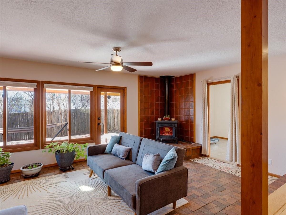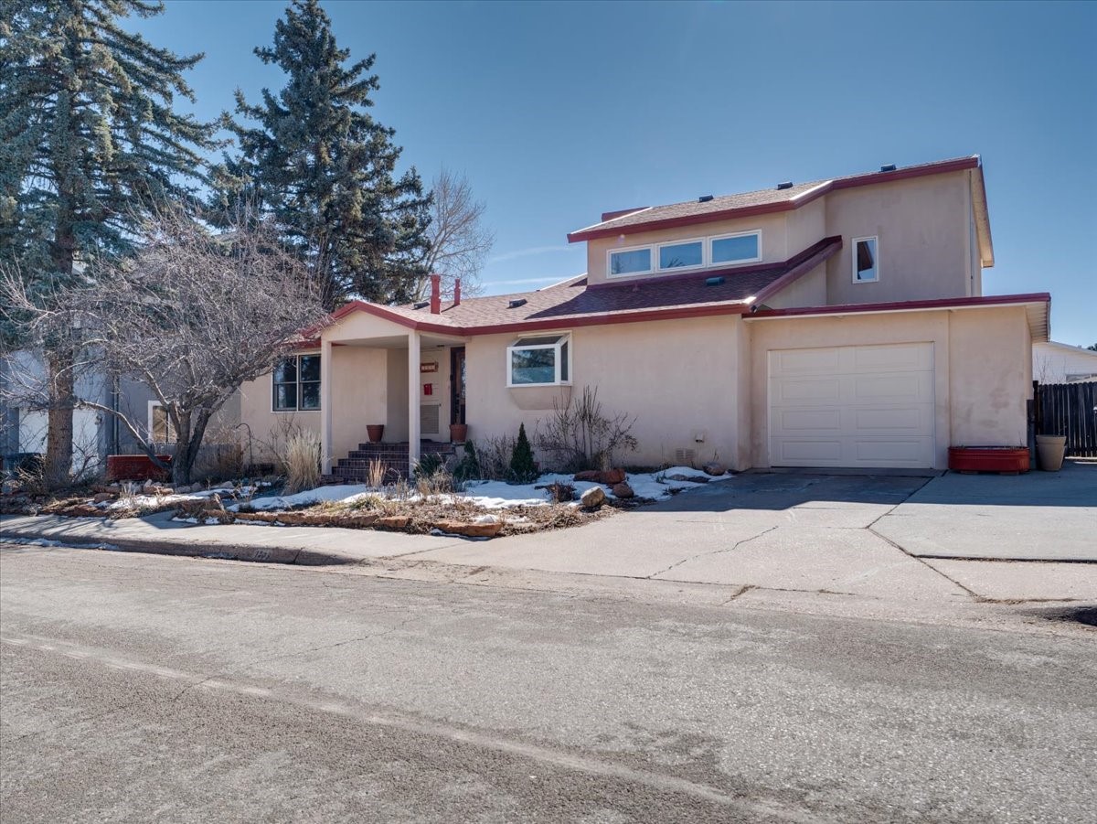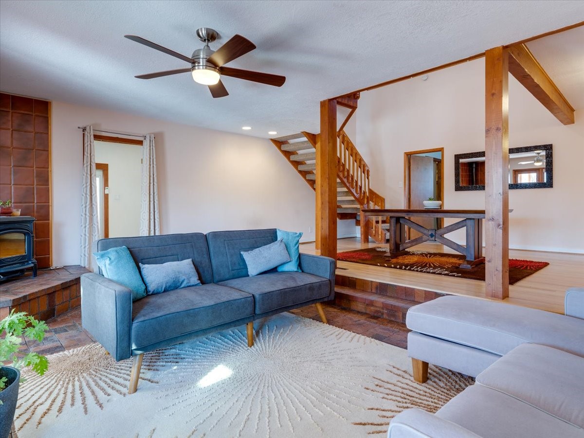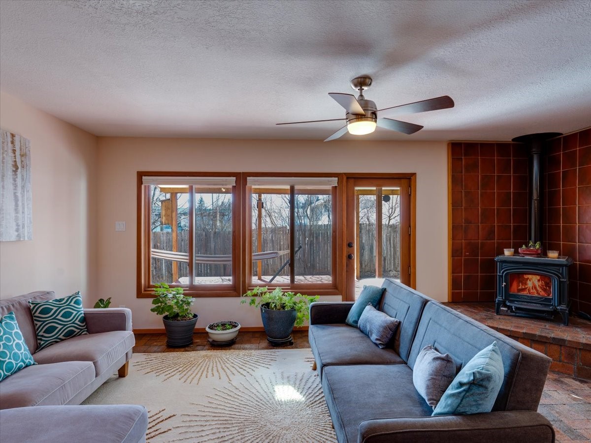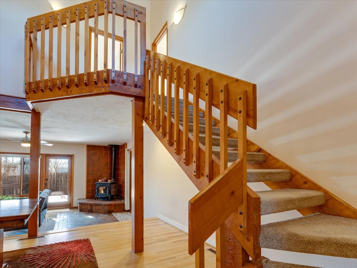 Charming Eastern area home that has been lovingly maintained and thoughtfully upgraded throughout. A beautiful wood front door with stained glass greets you setting the tone for the character found inside. Original hardwood floors lead into a spacious dining area open to the second level, creating a warm and inviting atmosphere. The kitchen sits at the front of the home and features a garden window, eat-in bar, refaced cabinetry (2019), and updated appliances replaced between 2020 and 2022. Laundry room and access to the attached heated garage with 240 volt outlet for EV charging are conveniently located just off the kitchen. The sunken living area offers beautiful windows, brick flooring, and a cozy corner wood-burning stove -- perfect for chilly months. A bright bonus room off the living room with lovely tile work and separate entry makes a perfect office, gym, yoga studio, or playroom. Two generously sized bedrooms on the main level share an updated full bath with solid-surface countertop and tiled tub surround. Upstairs, the primary suite features vaulted ceilings and a full ensuite bath. An additional upstairs bedroom with vaulted ceilings provides flexible space for guests, family, or a home office. The fenced backyard is a pollinator's dream with apple, pear, blue spruce and aspen trees -- plus a charming chicken coop that could easily be converted into a dog run. Major updates provide peace of mind, including a full electrical rewire with EV charging receptacle (November 2019), water heater with recirculating system (November 2019), refinished hardwood floors (November 2019), updated ceiling fans (November 2019), solar panels installed in August 2020, and HVAC. This beautifully updated home offers timeless charm, modern efficiency, and a fantastic location -- truly move-in ready and a must see!