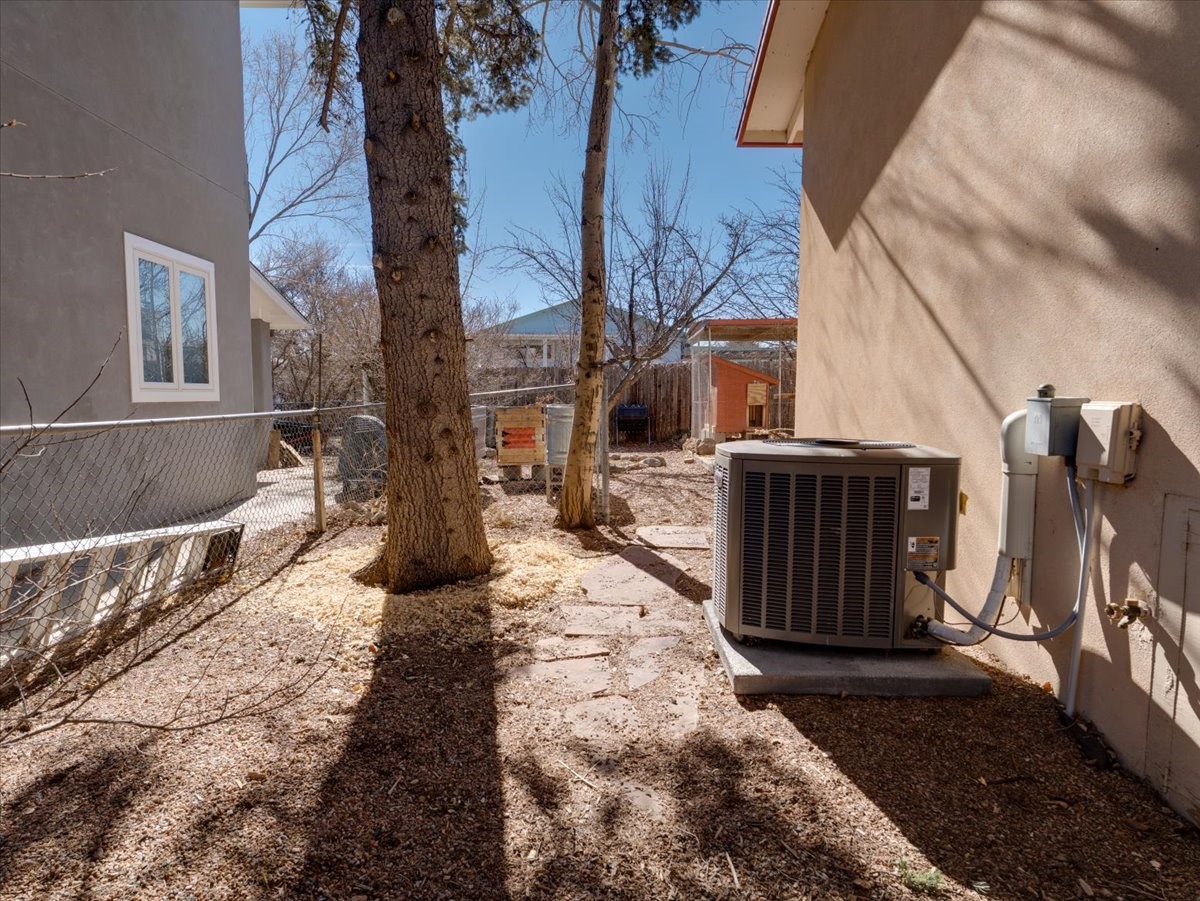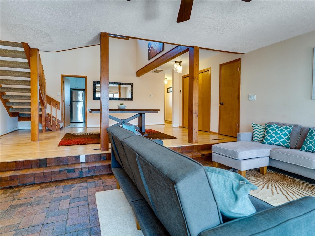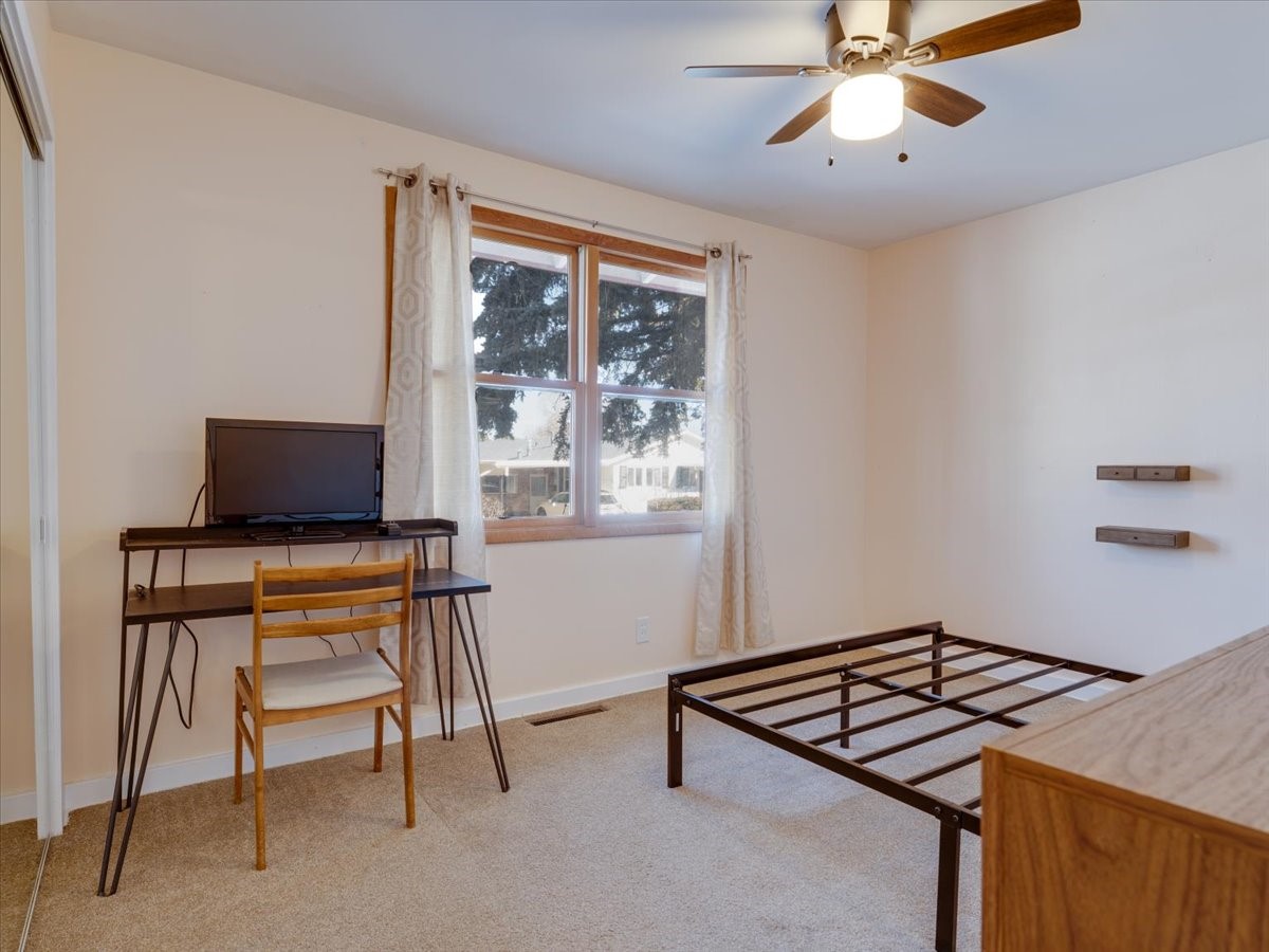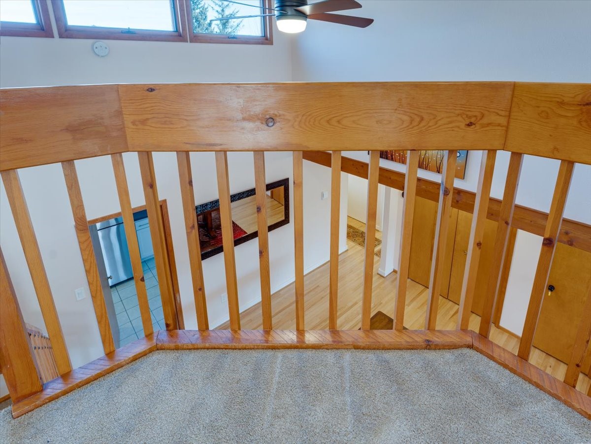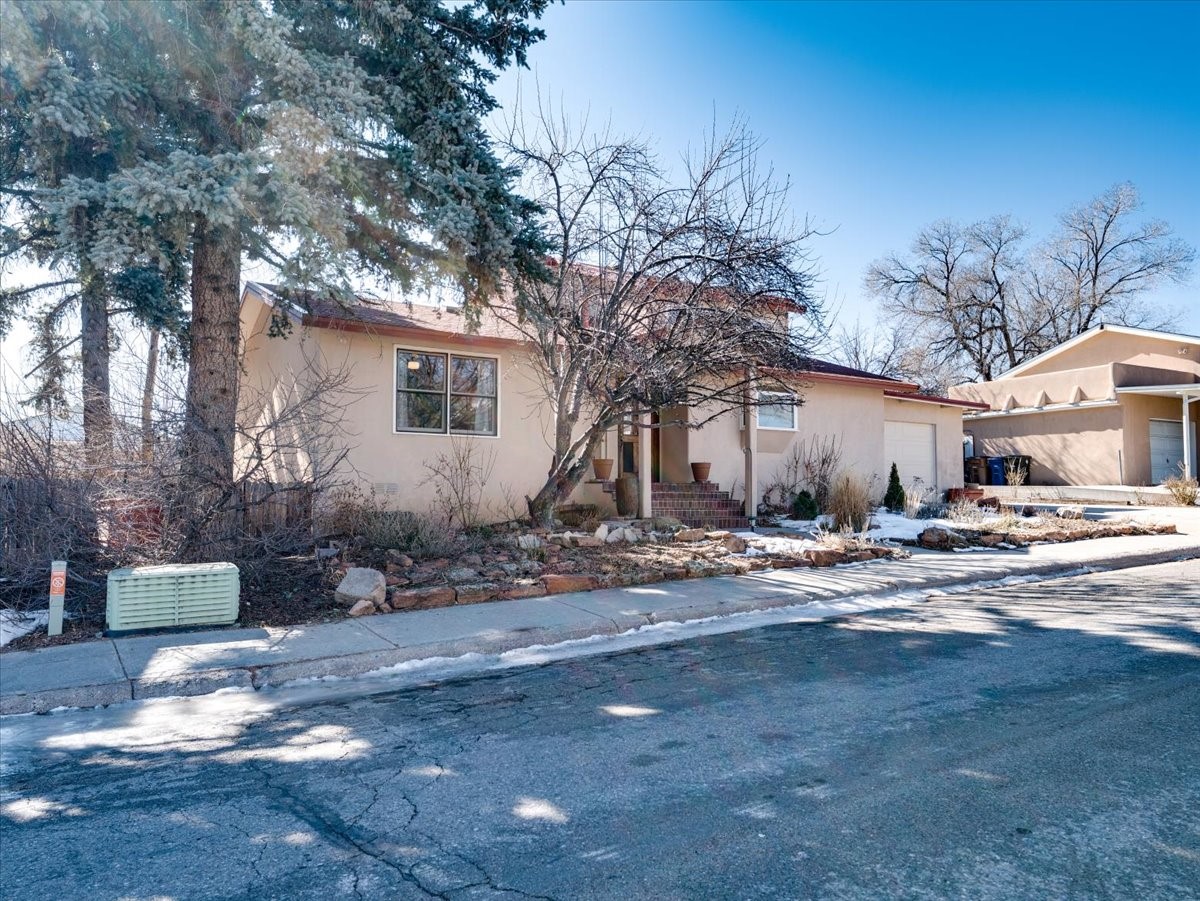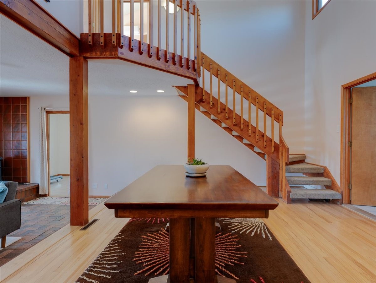 Charming Eastern area home that has been lovingly maintained and thoughtfully upgraded throughout. A beautiful wood front door with stained glass greets you setting the tone for the character found inside. Original hardwood floors lead into a spacious dining area open to the second level, creating a warm and inviting atmosphere. The kitchen sits at the front of the home and features a garden window, eat-in bar, refaced cabinetry (2019), and updated appliances replaced between 2020 and 2022. Laundry room and access to the attached heated garage with 240 volt outlet for EV charging are conveniently located just off the kitchen. The sunken living area offers beautiful windows, brick flooring, and a cozy corner wood-burning stove -- perfect for chilly months. A bright bonus room off the living room with lovely tile work and separate entry makes a perfect office, gym, yoga studio, or playroom. Two generously sized bedrooms on the main level share an updated full bath with solid-surface countertop and tiled tub surround. Upstairs, the primary suite features vaulted ceilings and a full ensuite bath. An additional upstairs bedroom with vaulted ceilings provides flexible space for guests, family, or a home office. The fenced backyard is a pollinator's dream with apple, pear, blue spruce and aspen trees -- plus a charming chicken coop that could easily be converted into a dog run. Major updates provide peace of mind, including a full electrical rewire with EV charging receptacle (November 2019), water heater with recirculating system (November 2019), refinished hardwood floors (November 2019), updated ceiling fans (November 2019), solar panels installed in August 2020, and HVAC. This beautifully updated home offers timeless charm, modern efficiency, and a fantastic location -- truly move-in ready and a must see!