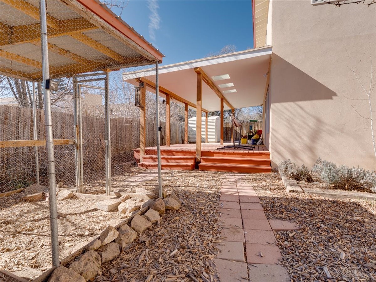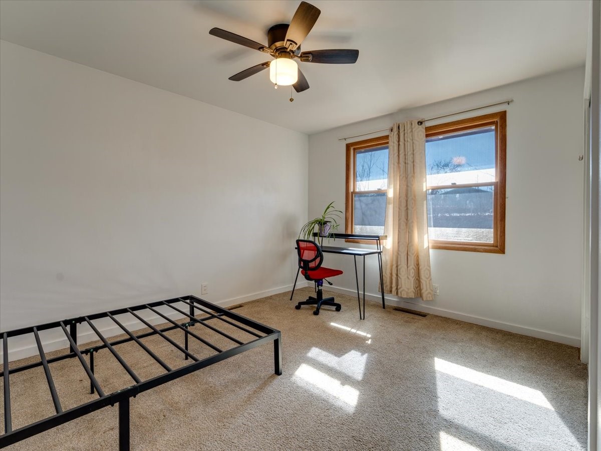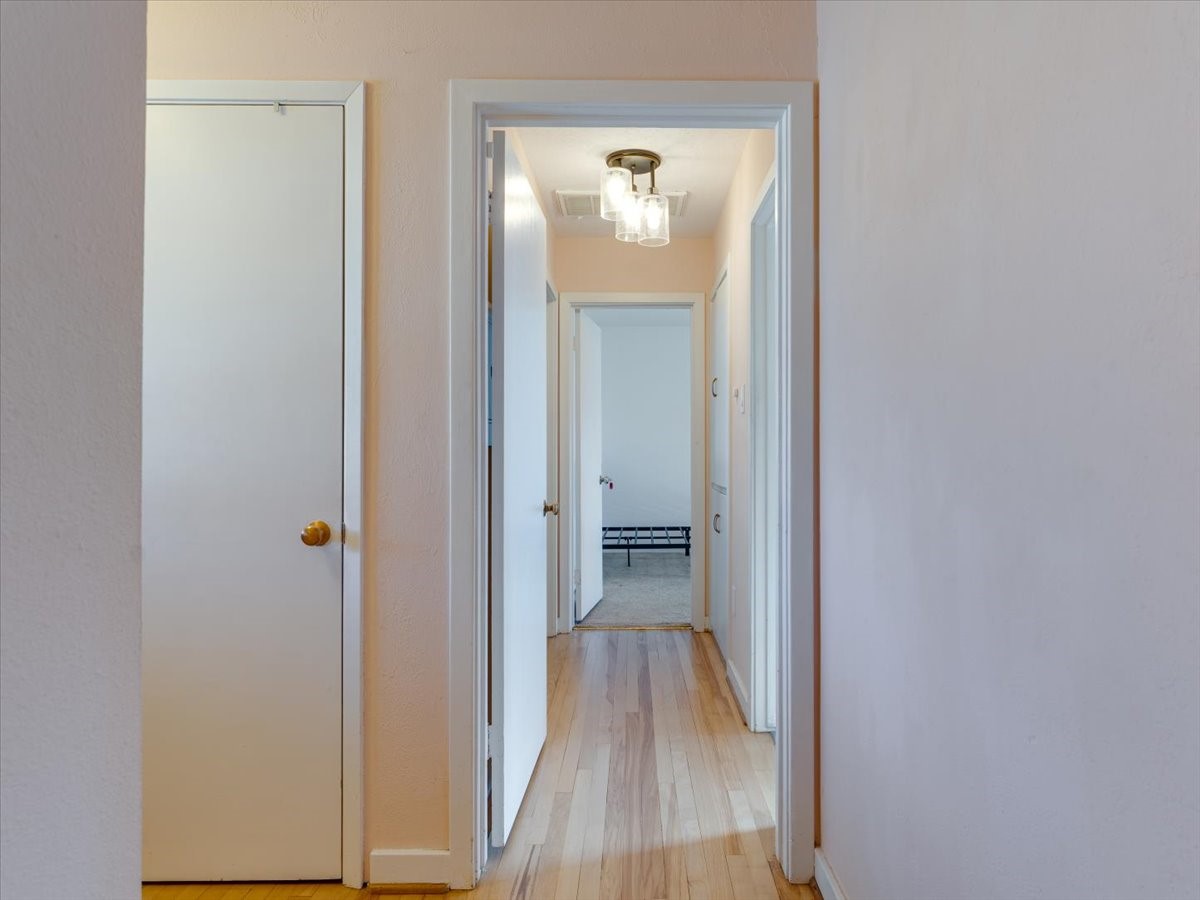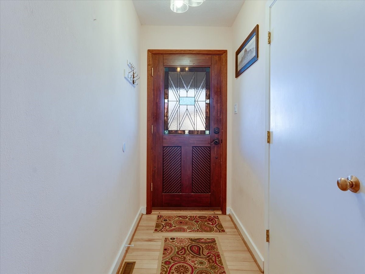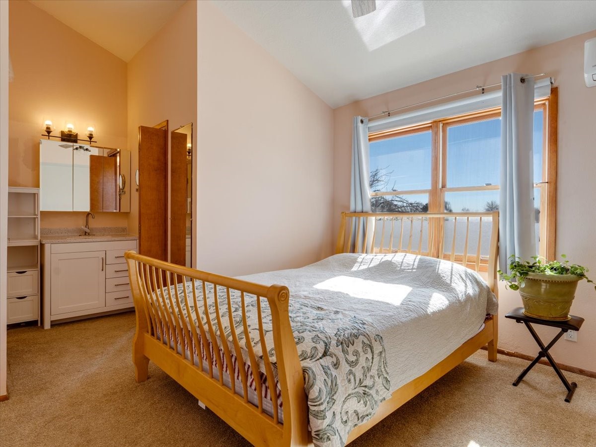 Charming Eastern area home that has been lovingly maintained and thoughtfully upgraded throughout. A beautiful wood front door with stained glass greets you setting the tone for the character found inside. Original hardwood floors lead into a spacious dining area open to the second level, creating a warm and inviting atmosphere. The kitchen sits at the front of the home and features a garden window, eat-in bar, refaced cabinetry (2019), and updated appliances replaced between 2020 and 2022. Laundry room and access to the attached heated garage with 240 volt outlet for EV charging are conveniently located just off the kitchen. The sunken living area offers beautiful windows, brick flooring, and a cozy corner wood-burning stove -- perfect for chilly months. A bright bonus room off the living room with lovely tile work and separate entry makes a perfect office, gym, yoga studio, or playroom. Two generously sized bedrooms on the main level share an updated full bath with solid-surface countertop and tiled tub surround. Upstairs, the primary suite features vaulted ceilings and a full ensuite bath. An additional upstairs bedroom with vaulted ceilings provides flexible space for guests, family, or a home office. The fenced backyard is a pollinator's dream with apple, pear, blue spruce and aspen trees -- plus a charming chicken coop that could easily be converted into a dog run. Major updates provide peace of mind, including a full electrical rewire with EV charging receptacle (November 2019), water heater with recirculating system (November 2019), refinished hardwood floors (November 2019), updated ceiling fans (November 2019), solar panels installed in August 2020, and HVAC. This beautifully updated home offers timeless charm, modern efficiency, and a fantastic location -- truly move-in ready and a must see!