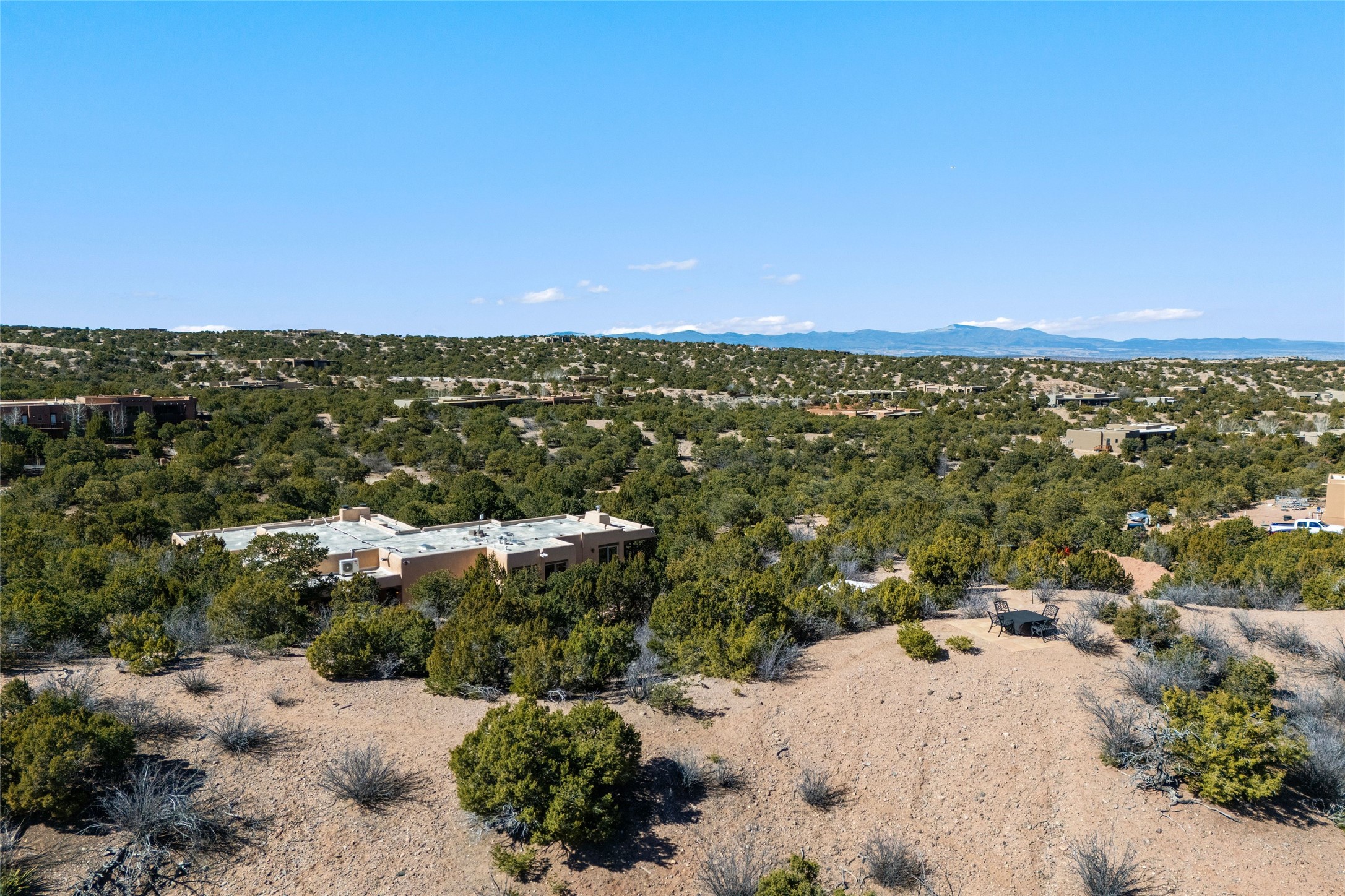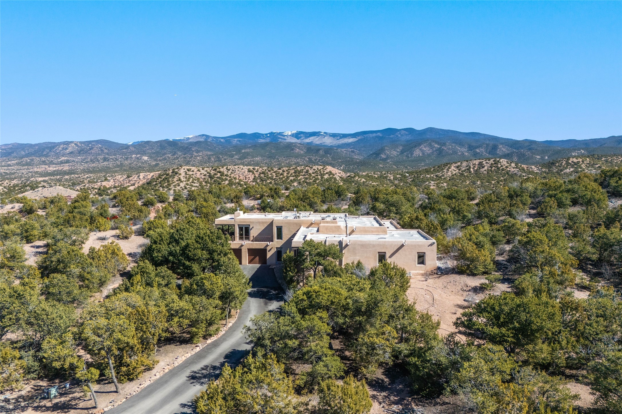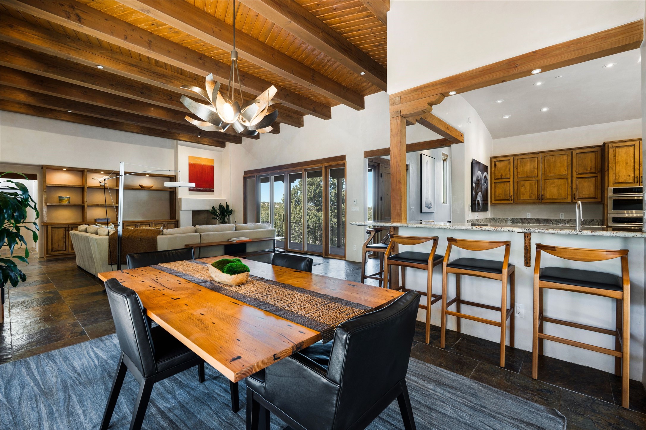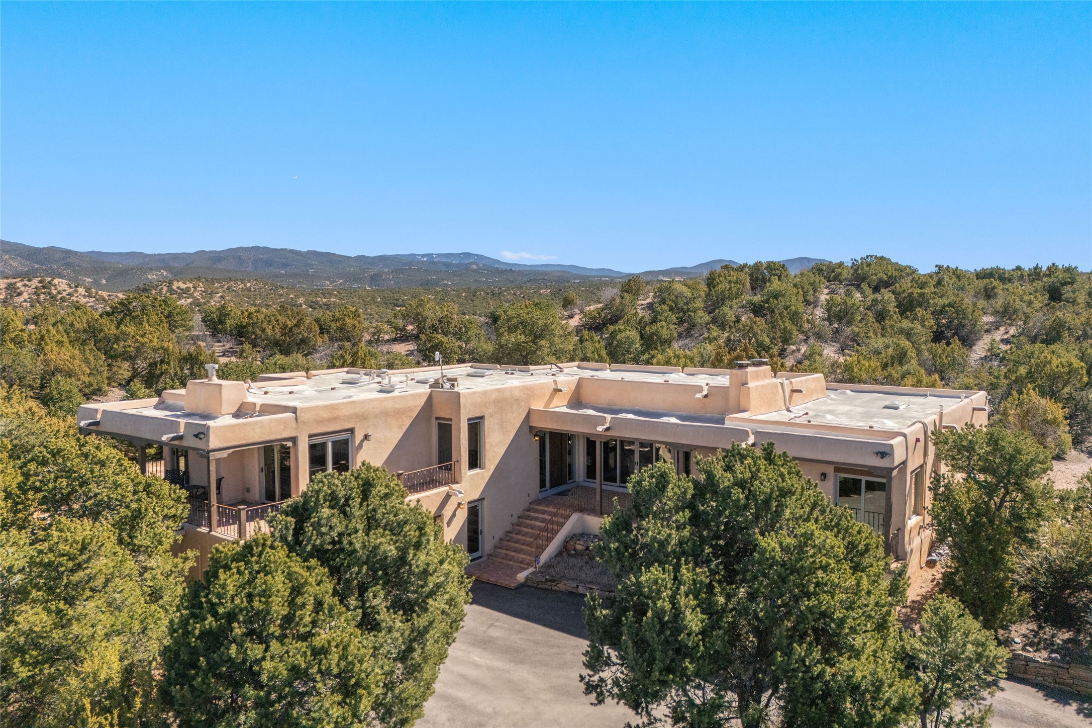 This custom-built 3 bedroom, 3 bathroom home in the gated community of Tesuque Hills offers the perfect escape from the downtown frenzy, while being less than 15 minutes from the heart of Santa Fe. Here, you enjoy the tranquility of the northern foothills with quick access to everything the city has to offer. Set on a tree-covered, 1-acre lot, the home is surrounded by wooded views that create a peaceful and private retreat. Multiple portals invite you to relax and take in the natural beauty, while sunsets filter through the trees and paint the sky in unforgettable color. The spacious interior is thoughtfully designed to feel open to nature, with generous living areas that capture both light and views, seamlessly blending indoor comfort with the outdoors. At the heart of the home is an amazing Chef's kitchen, built for cooking and entertaining. Wrap-around granite countertops, custom cabinetry, double ovens, stainless steel appliances, and a wine refrigerator make it ideal for everything type of chef. The open flow into the main living areas ensures the cook is always part of the conversation. Nearly all of the home is single level, with the primary suite set up a few steps above the main floor. From its own deck, enjoy stunning mountain views and peaceful mornings. One guest room offers an ensuite bathroom while the third bedroom could be used as an office. Slate floors with in-floor radiant heat and classic viga/beamed ceilings further enhance the warmth and authenticity of the home. A secluded hot tub provides the perfect place to stargaze beneath New Mexico's brilliant night skies. Even further up the hill, a fire table creates a magical gathering space. Imagine spending evenings there with friends and family, taking in sweeping, "killer" views of the majestic Sangre de Cristo Mountains--a truly unforgettable backdrop. Experience for yourself why the serenity--yet close proximity--of the northern foothills remains one of Santa Fe's best-kept secrets.