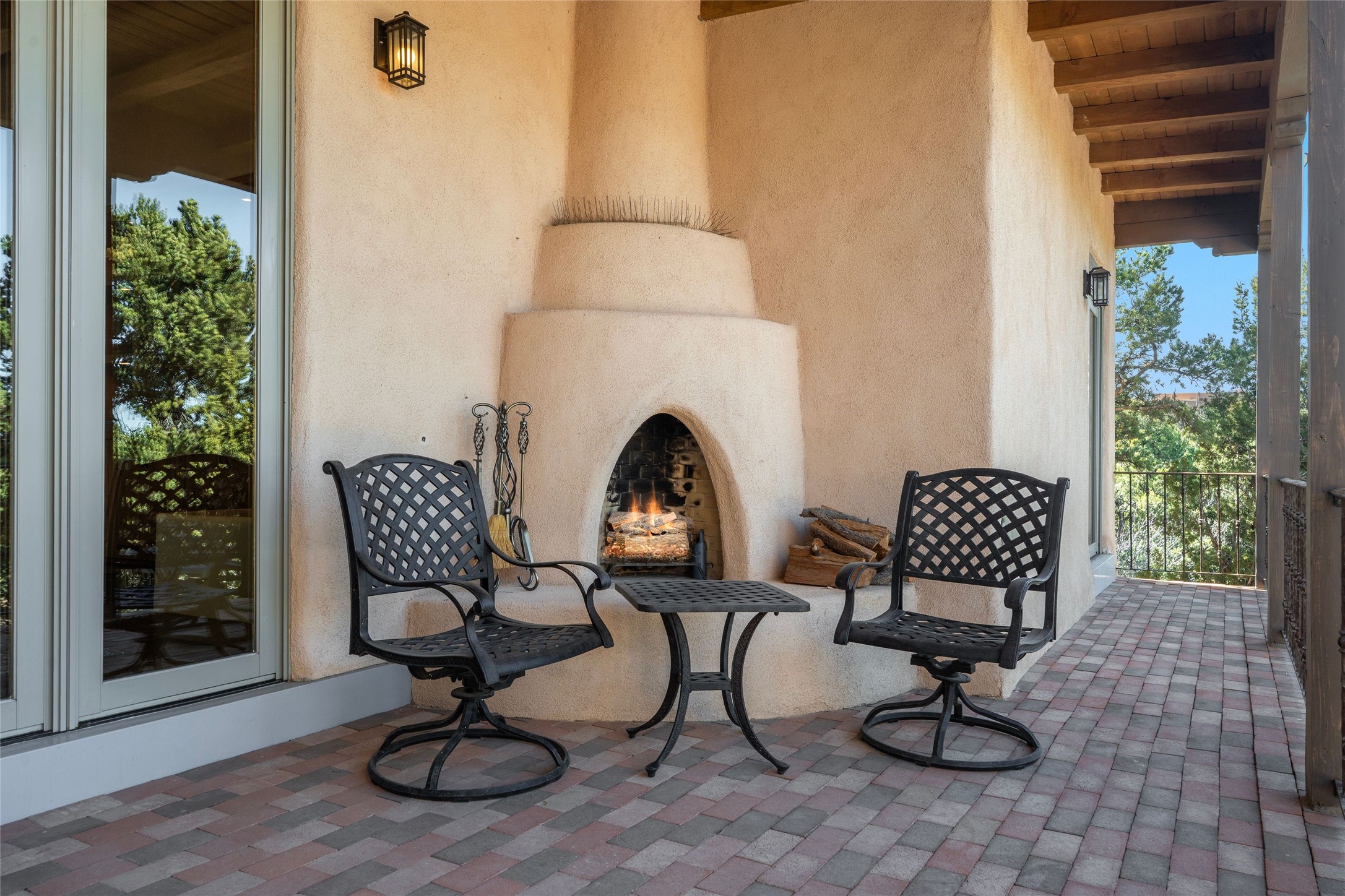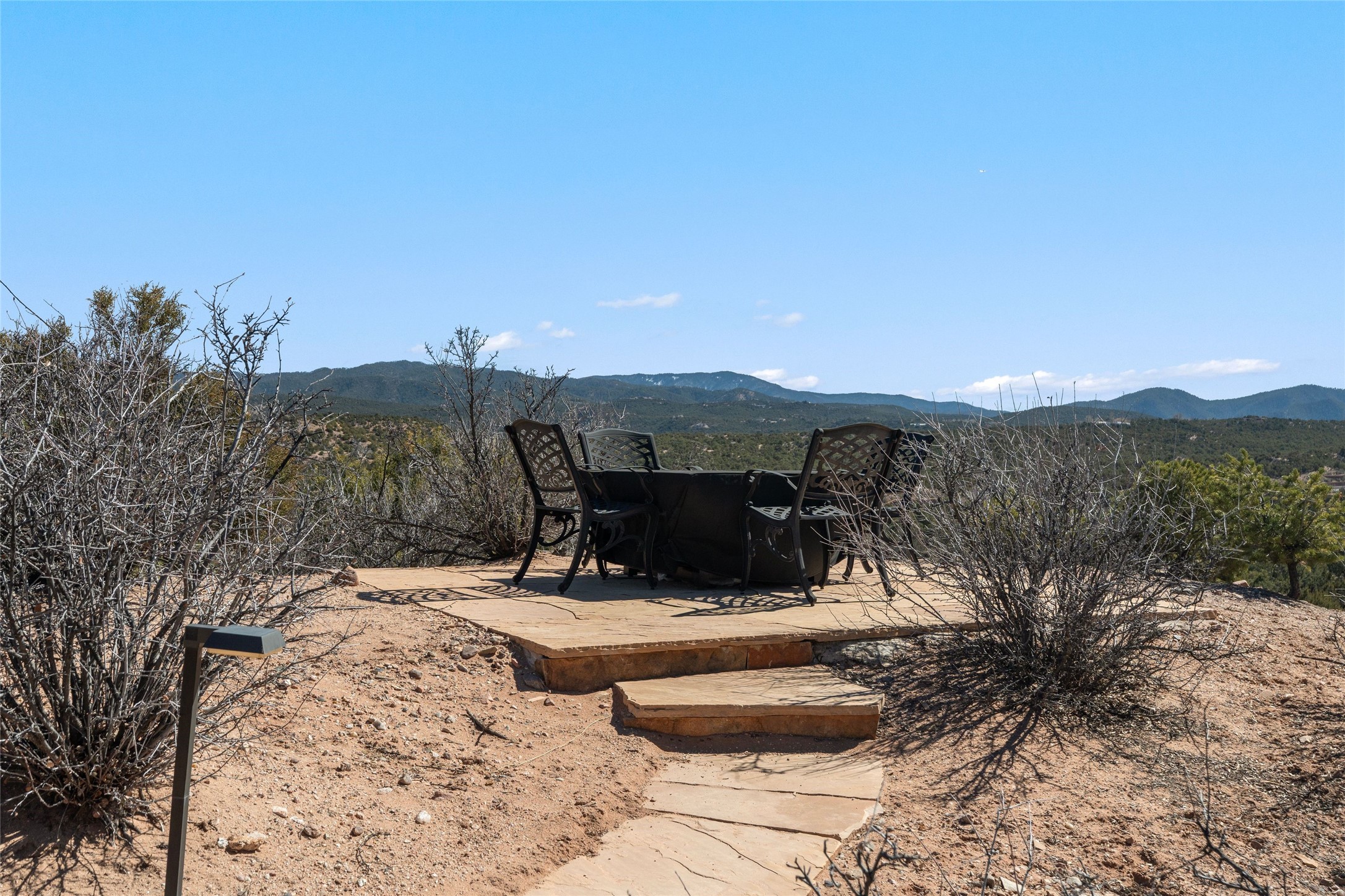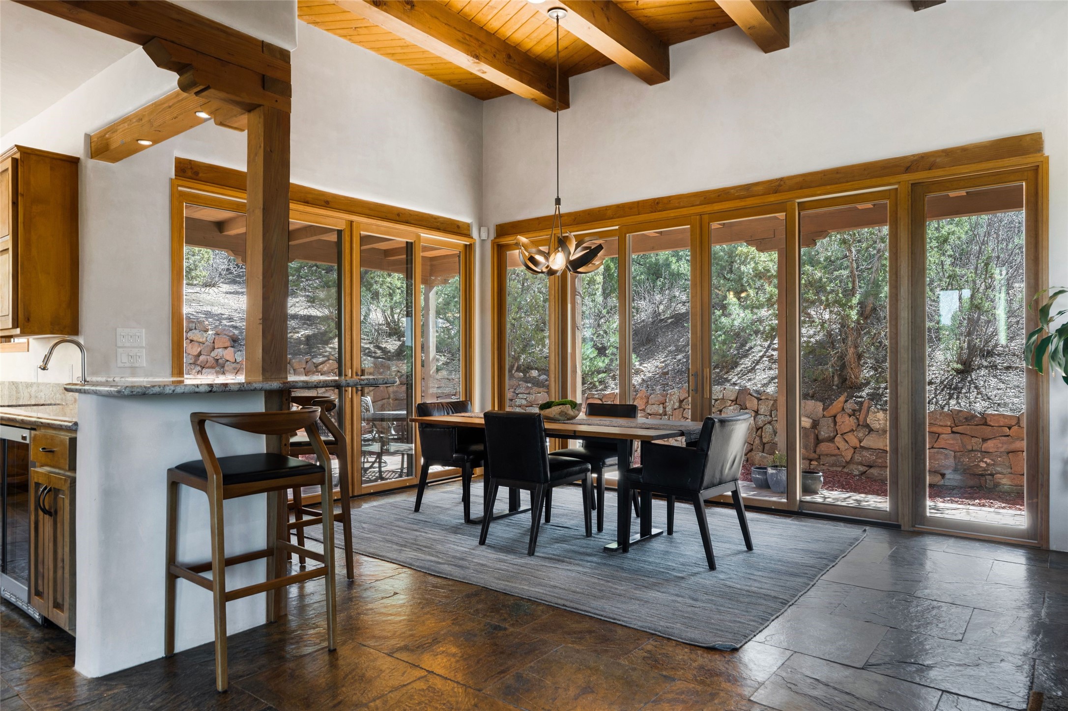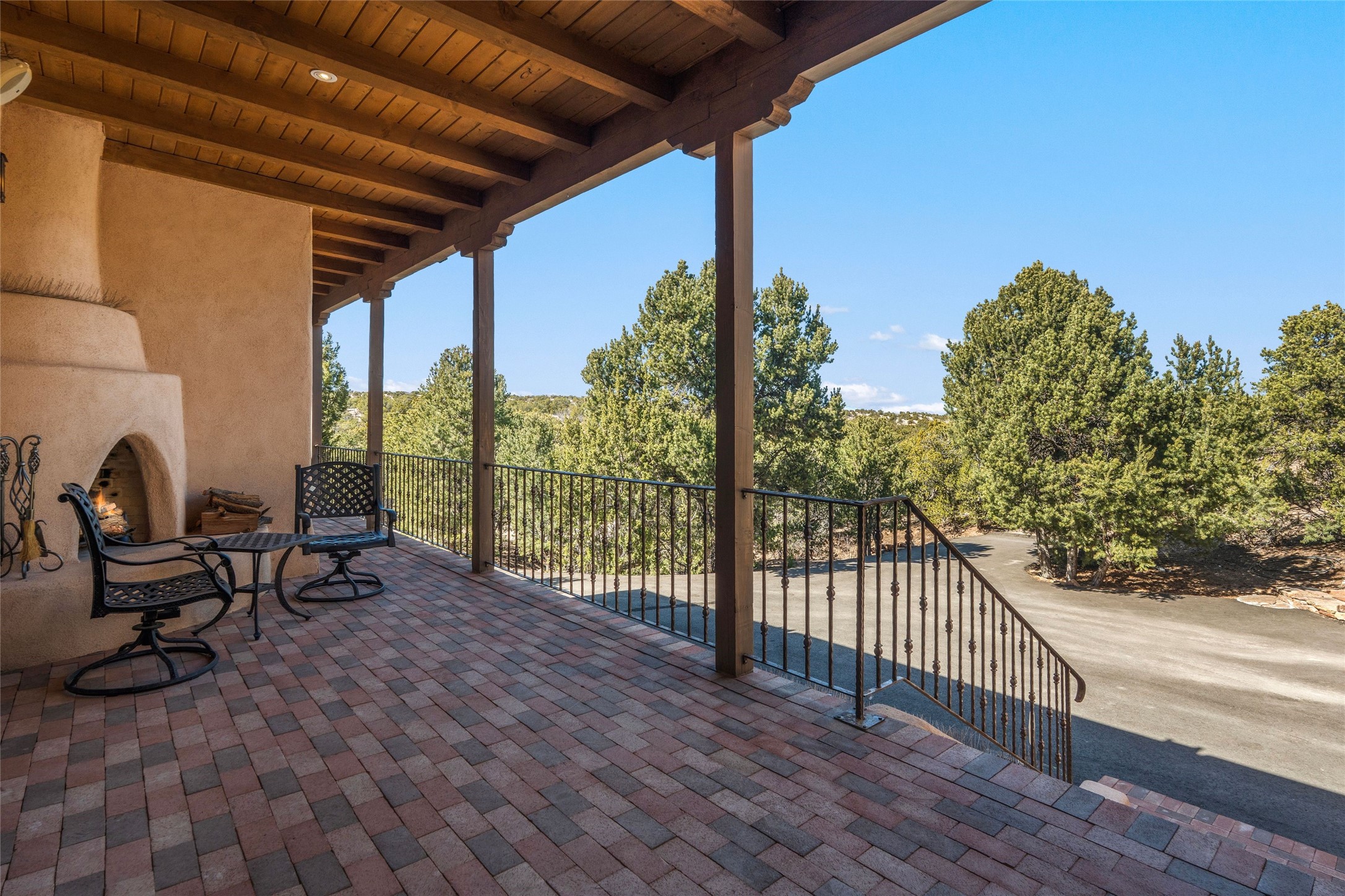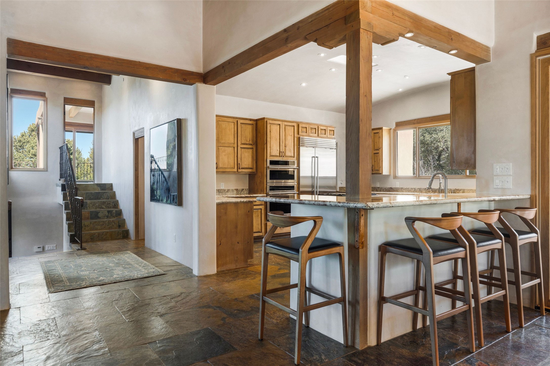 This custom-built 3 bedroom, 3 bathroom home in the gated community of Tesuque Hills offers the perfect escape from the downtown frenzy, while being less than 15 minutes from the heart of Santa Fe. Here, you enjoy the tranquility of the northern foothills with quick access to everything the city has to offer. Set on a tree-covered, 1-acre lot, the home is surrounded by wooded views that create a peaceful and private retreat. Multiple portals invite you to relax and take in the natural beauty, while sunsets filter through the trees and paint the sky in unforgettable color. The spacious interior is thoughtfully designed to feel open to nature, with generous living areas that capture both light and views, seamlessly blending indoor comfort with the outdoors. At the heart of the home is an amazing Chef's kitchen, built for cooking and entertaining. Wrap-around granite countertops, custom cabinetry, double ovens, stainless steel appliances, and a wine refrigerator make it ideal for everything type of chef. The open flow into the main living areas ensures the cook is always part of the conversation. Nearly all of the home is single level, with the primary suite set up a few steps above the main floor. From its own deck, enjoy stunning mountain views and peaceful mornings. One guest room offers an ensuite bathroom while the third bedroom could be used as an office. Slate floors with in-floor radiant heat and classic viga/beamed ceilings further enhance the warmth and authenticity of the home. A secluded hot tub provides the perfect place to stargaze beneath New Mexico's brilliant night skies. Even further up the hill, a fire table creates a magical gathering space. Imagine spending evenings there with friends and family, taking in sweeping, "killer" views of the majestic Sangre de Cristo Mountains--a truly unforgettable backdrop. Experience for yourself why the serenity--yet close proximity--of the northern foothills remains one of Santa Fe's best-kept secrets.