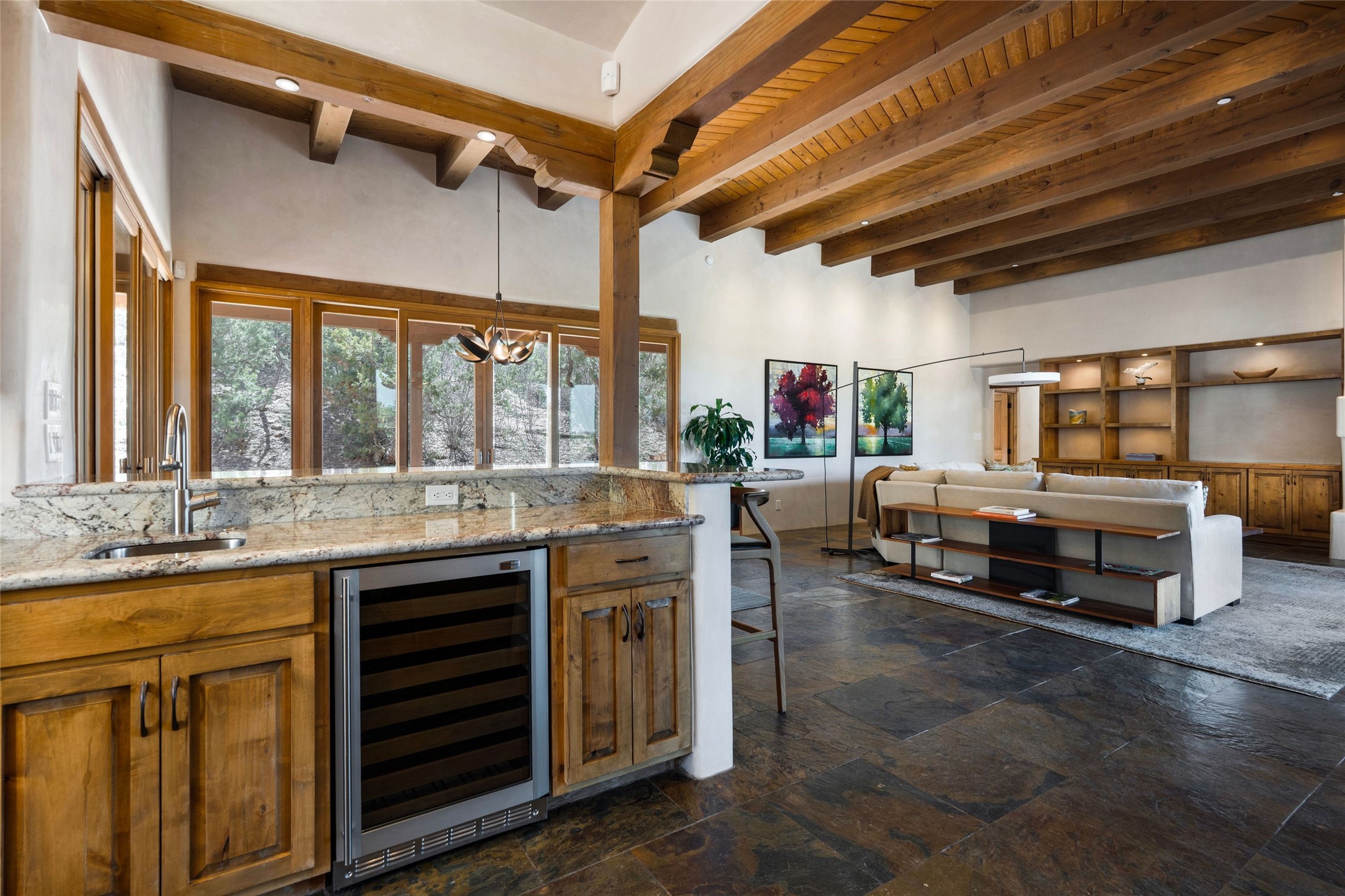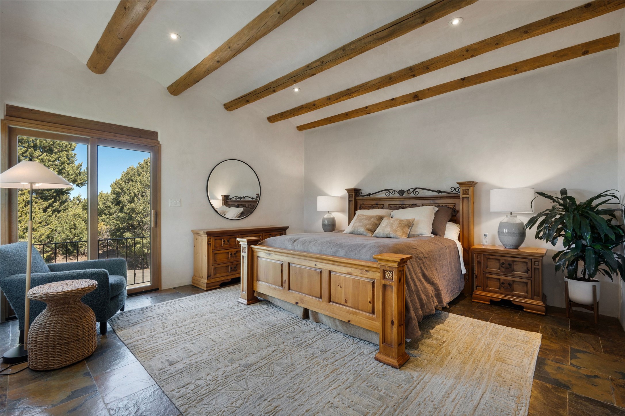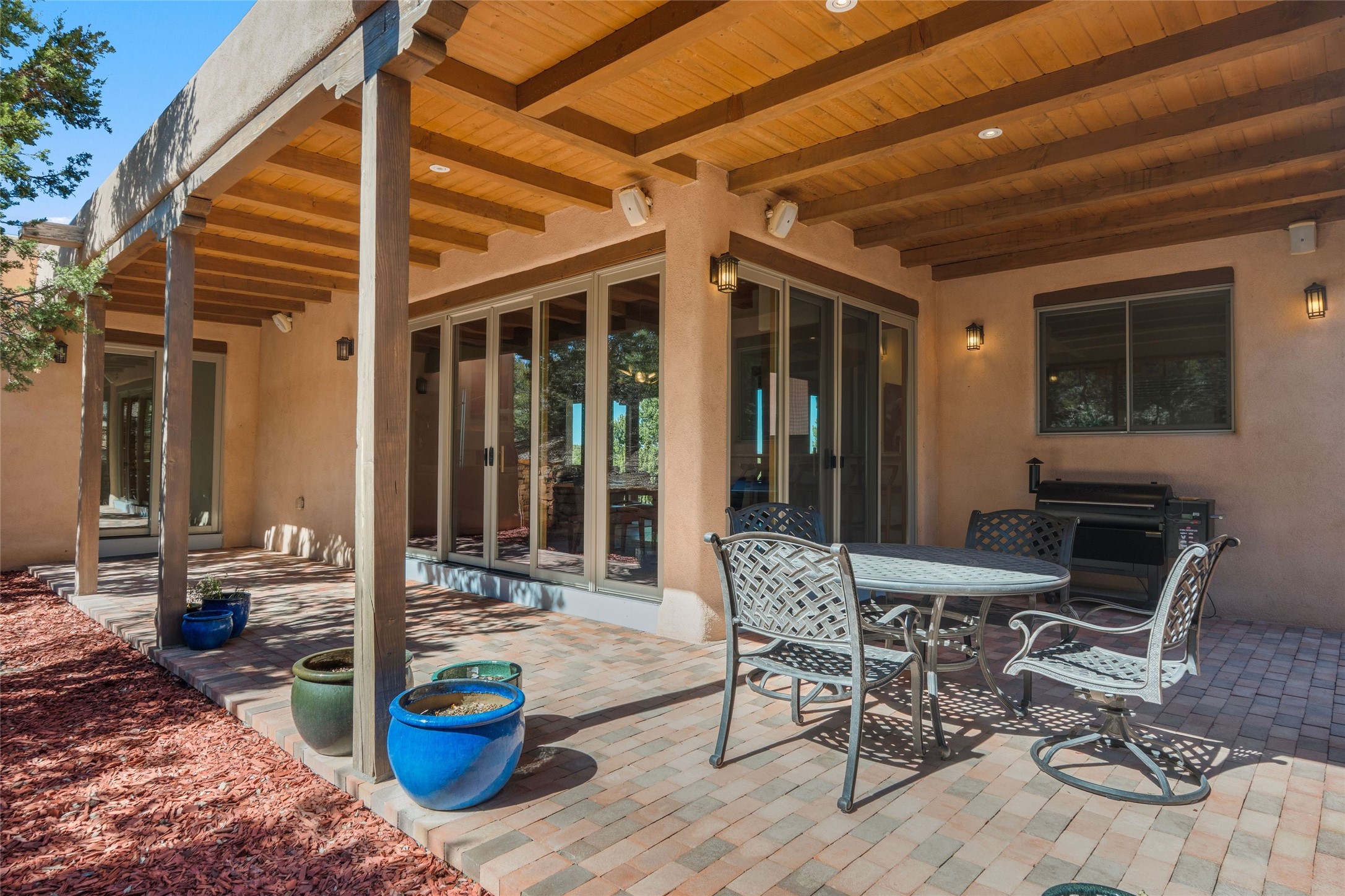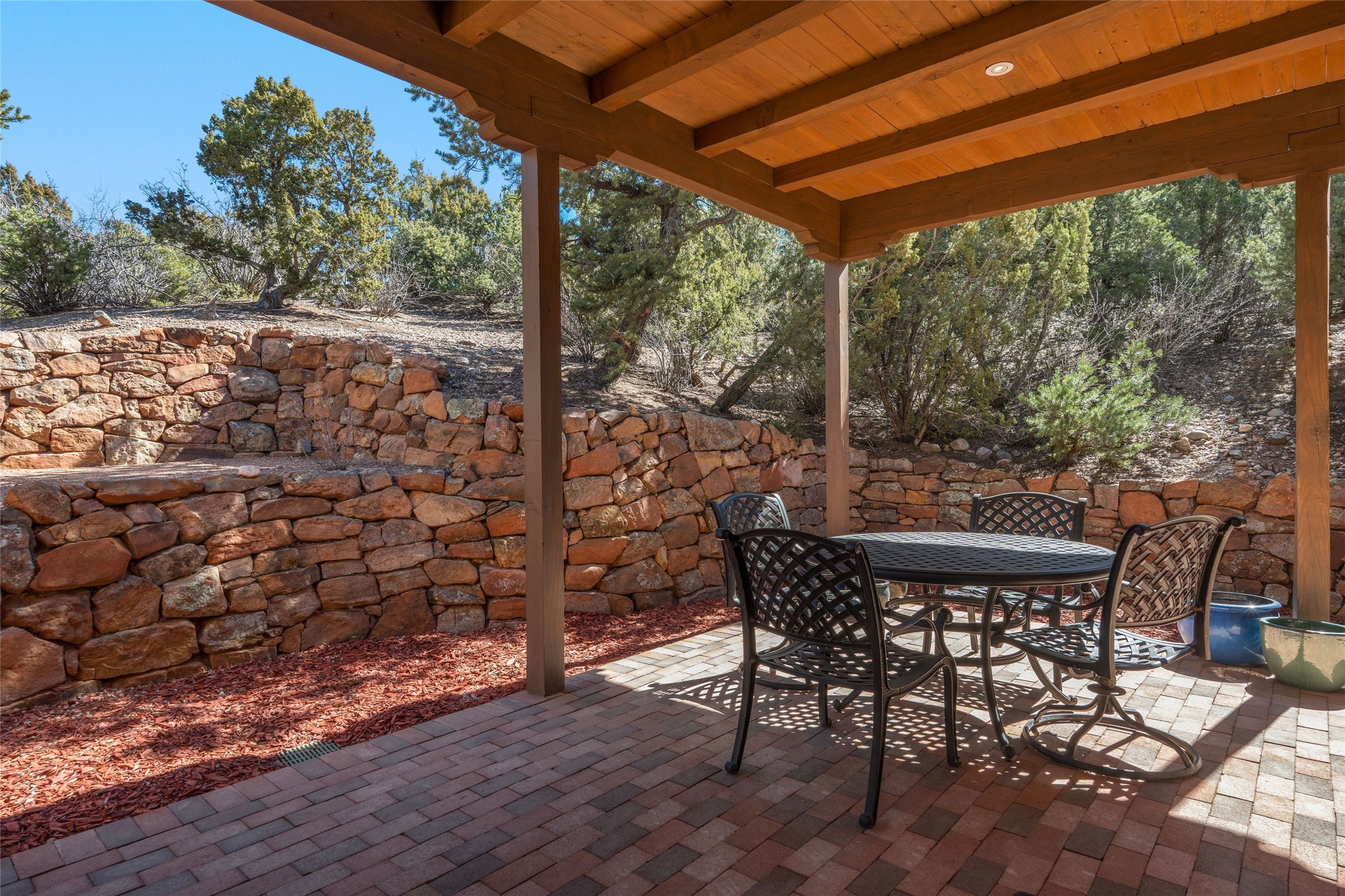 This custom-built 3 bedroom, 3 bathroom home in the gated community of Tesuque Hills offers the perfect escape from the downtown frenzy, while being less than 15 minutes from the heart of Santa Fe. Here, you enjoy the tranquility of the northern foothills with quick access to everything the city has to offer. Set on a tree-covered, 1-acre lot, the home is surrounded by wooded views that create a peaceful and private retreat. Multiple portals invite you to relax and take in the natural beauty, while sunsets filter through the trees and paint the sky in unforgettable color. The spacious interior is thoughtfully designed to feel open to nature, with generous living areas that capture both light and views, seamlessly blending indoor comfort with the outdoors. At the heart of the home is an amazing Chef's kitchen, built for cooking and entertaining. Wrap-around granite countertops, custom cabinetry, double ovens, stainless steel appliances, and a wine refrigerator make it ideal for everything type of chef. The open flow into the main living areas ensures the cook is always part of the conversation. Nearly all of the home is single level, with the primary suite set up a few steps above the main floor. From its own deck, enjoy stunning mountain views and peaceful mornings. One guest room offers an ensuite bathroom while the third bedroom could be used as an office. Slate floors with in-floor radiant heat and classic viga/beamed ceilings further enhance the warmth and authenticity of the home. A secluded hot tub provides the perfect place to stargaze beneath New Mexico's brilliant night skies. Even further up the hill, a fire table creates a magical gathering space. Imagine spending evenings there with friends and family, taking in sweeping, "killer" views of the majestic Sangre de Cristo Mountains--a truly unforgettable backdrop. Experience for yourself why the serenity--yet close proximity--of the northern foothills remains one of Santa Fe's best-kept secrets.
