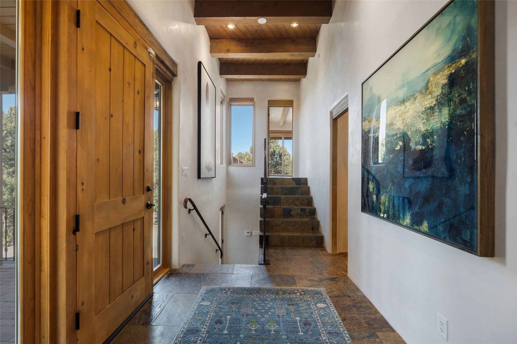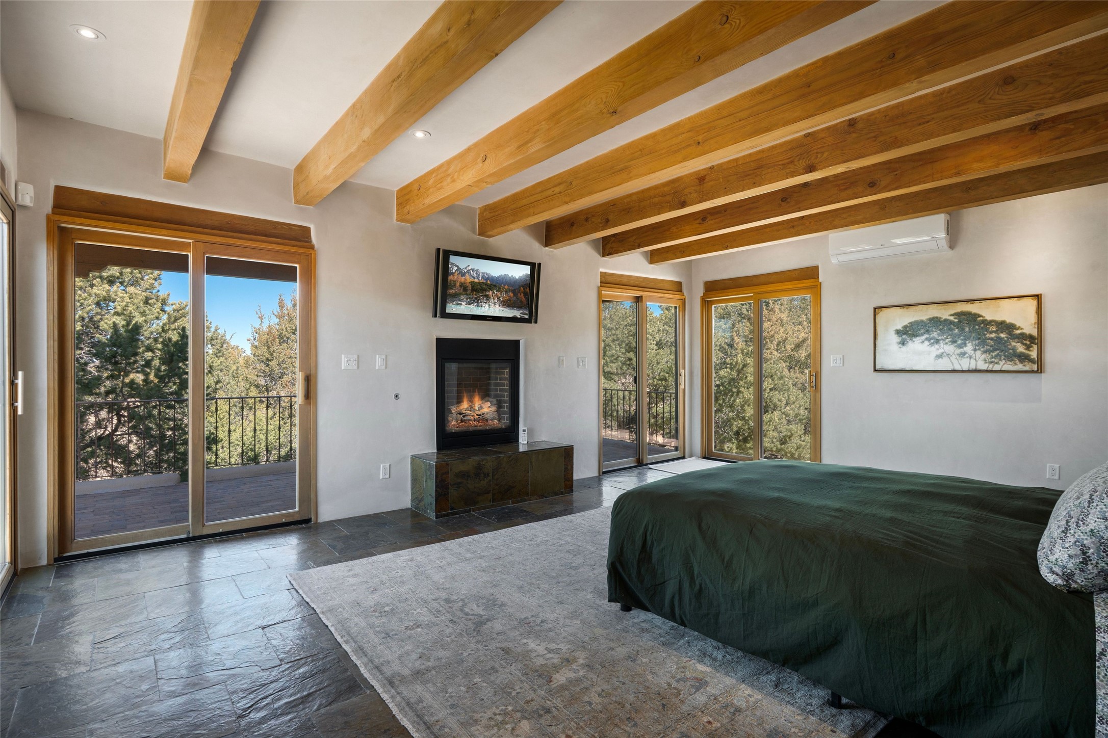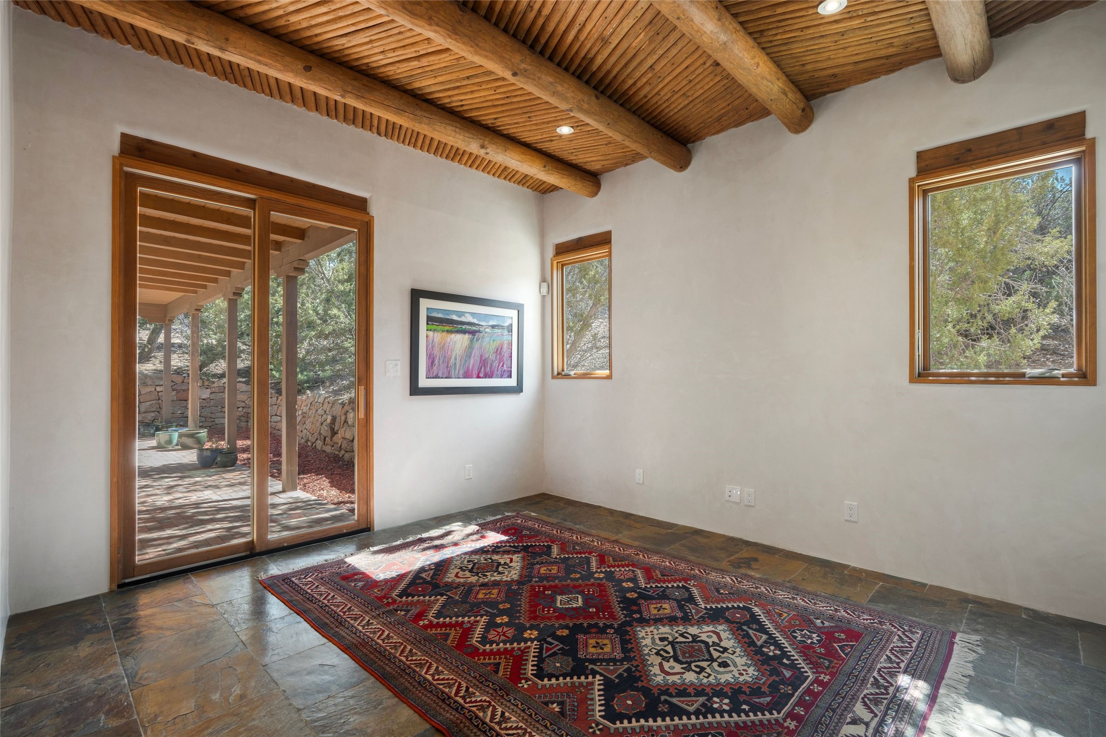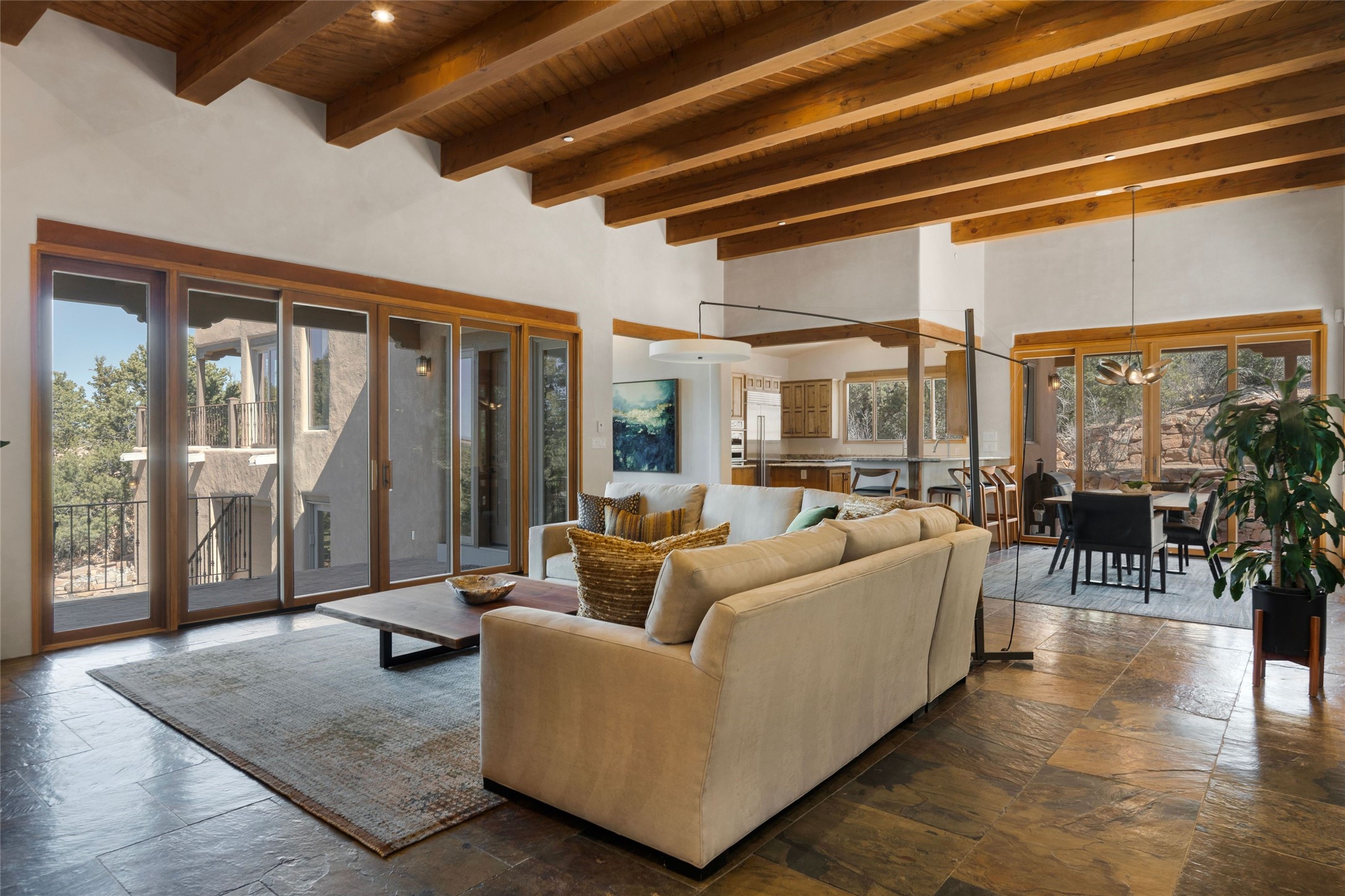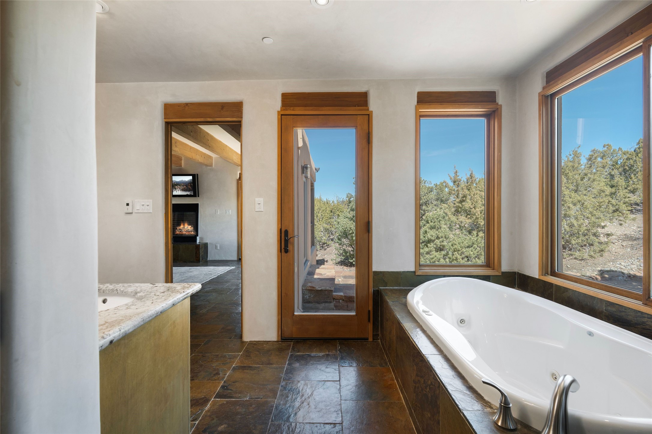 This custom-built 3 bedroom, 3 bathroom home in the gated community of Tesuque Hills offers the perfect escape from the downtown frenzy, while being less than 15 minutes from the heart of Santa Fe. Here, you enjoy the tranquility of the northern foothills with quick access to everything the city has to offer. Set on a tree-covered, 1-acre lot, the home is surrounded by wooded views that create a peaceful and private retreat. Multiple portals invite you to relax and take in the natural beauty, while sunsets filter through the trees and paint the sky in unforgettable color. The spacious interior is thoughtfully designed to feel open to nature, with generous living areas that capture both light and views, seamlessly blending indoor comfort with the outdoors. At the heart of the home is an amazing Chef's kitchen, built for cooking and entertaining. Wrap-around granite countertops, custom cabinetry, double ovens, stainless steel appliances, and a wine refrigerator make it ideal for everything type of chef. The open flow into the main living areas ensures the cook is always part of the conversation. Nearly all of the home is single level, with the primary suite set up a few steps above the main floor. From its own deck, enjoy stunning mountain views and peaceful mornings. One guest room offers an ensuite bathroom while the third bedroom could be used as an office. Slate floors with in-floor radiant heat and classic viga/beamed ceilings further enhance the warmth and authenticity of the home. A secluded hot tub provides the perfect place to stargaze beneath New Mexico's brilliant night skies. Even further up the hill, a fire table creates a magical gathering space. Imagine spending evenings there with friends and family, taking in sweeping, "killer" views of the majestic Sangre de Cristo Mountains--a truly unforgettable backdrop. Experience for yourself why the serenity--yet close proximity--of the northern foothills remains one of Santa Fe's best-kept secrets.