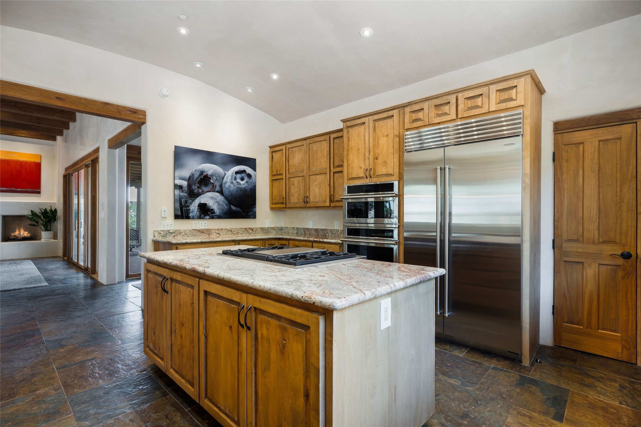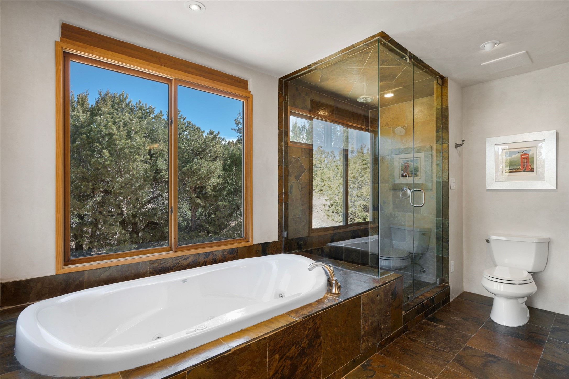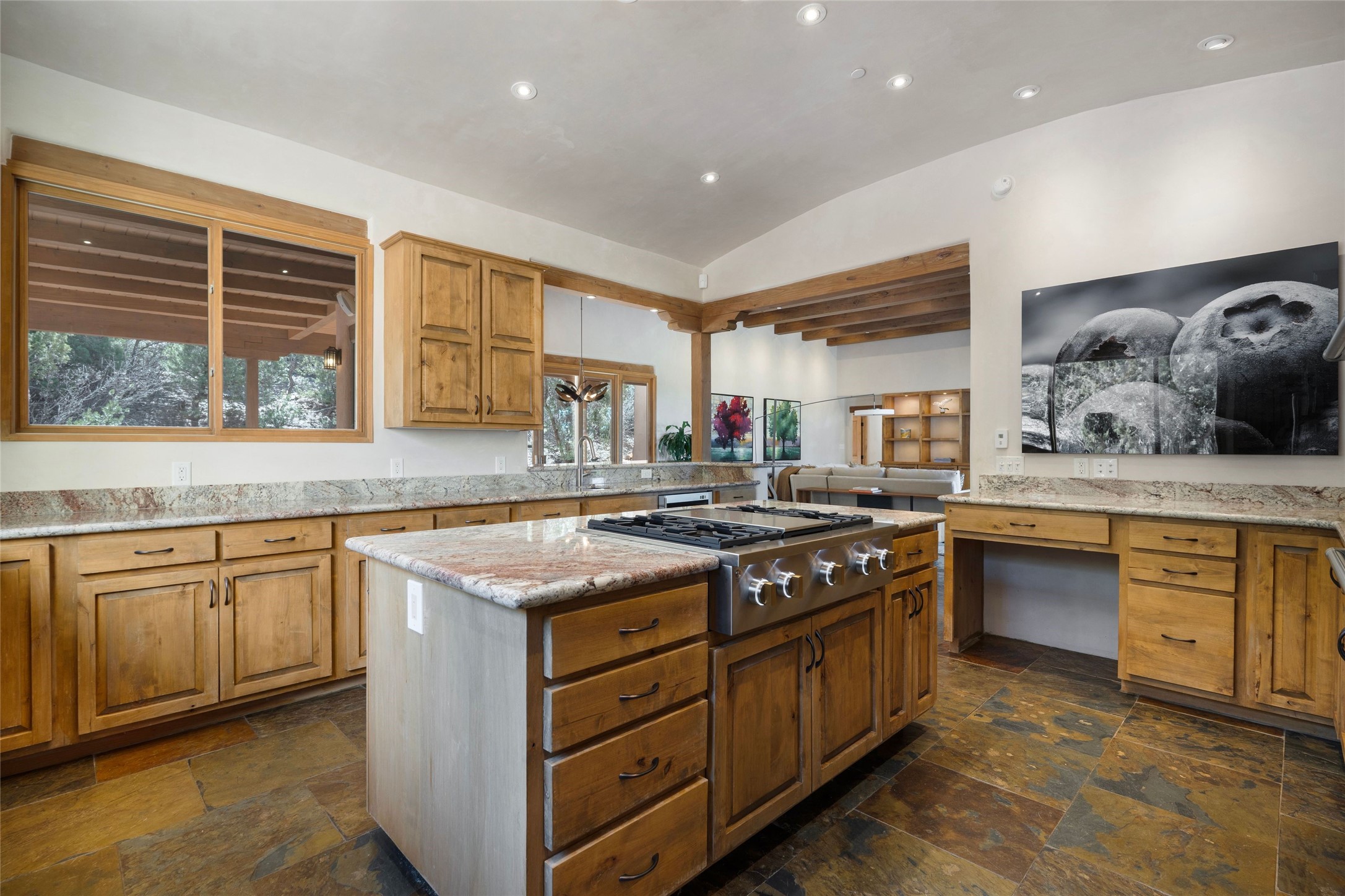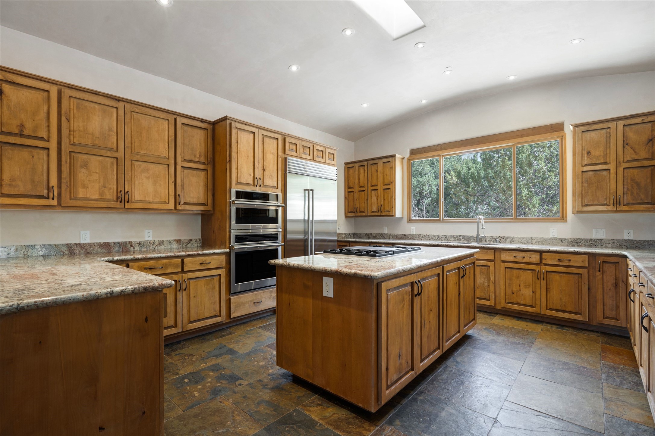 This custom-built 3 bedroom, 3 bathroom home in the gated community of Tesuque Hills offers the perfect escape from the downtown frenzy, while being less than 15 minutes from the heart of Santa Fe. Here, you enjoy the tranquility of the northern foothills with quick access to everything the city has to offer. Set on a tree-covered, 1-acre lot, the home is surrounded by wooded views that create a peaceful and private retreat. Multiple portals invite you to relax and take in the natural beauty, while sunsets filter through the trees and paint the sky in unforgettable color. The spacious interior is thoughtfully designed to feel open to nature, with generous living areas that capture both light and views, seamlessly blending indoor comfort with the outdoors. At the heart of the home is an amazing Chef's kitchen, built for cooking and entertaining. Wrap-around granite countertops, custom cabinetry, double ovens, stainless steel appliances, and a wine refrigerator make it ideal for everything type of chef. The open flow into the main living areas ensures the cook is always part of the conversation. Nearly all of the home is single level, with the primary suite set up a few steps above the main floor. From its own deck, enjoy stunning mountain views and peaceful mornings. One guest room offers an ensuite bathroom while the third bedroom could be used as an office. Slate floors with in-floor radiant heat and classic viga/beamed ceilings further enhance the warmth and authenticity of the home. A secluded hot tub provides the perfect place to stargaze beneath New Mexico's brilliant night skies. Even further up the hill, a fire table creates a magical gathering space. Imagine spending evenings there with friends and family, taking in sweeping, "killer" views of the majestic Sangre de Cristo Mountains--a truly unforgettable backdrop. Experience for yourself why the serenity--yet close proximity--of the northern foothills remains one of Santa Fe's best-kept secrets.