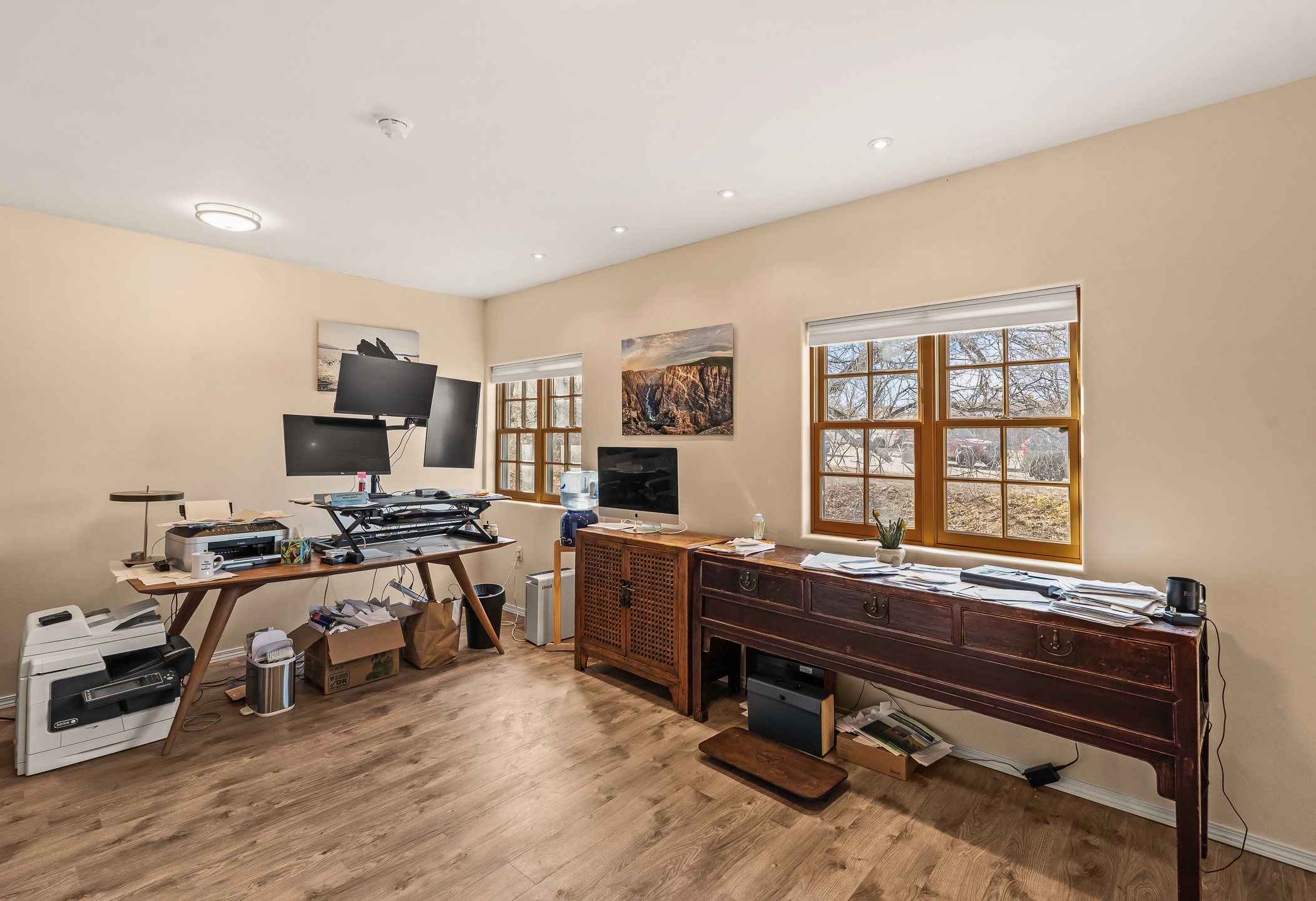 Discover a rare opportunity to own a professional office condo in one of Santa Fe's most convenient and high-traffic locations, along the Santa Fe River and just moments from the intersection of St. Francis Drive and West Alameda. This middle unit, in a three-unit complex, is filled with natural light from multiple windows, creating a bright, welcoming environment for clients and staff alike. The flexible floor plan easily accommodates four private offices plus a reception area, making it ideal for businesses such as medical, legal, therapy, healing arts, or general professional use. The space also includes a kitchenette, private bathroom, and charming covered brick walkways that enhance both curb appeal and accessibility. Parking is a major asset here, with 11 total spaces in the complex and three of which are designated for Unit B, one ADA space for shared use, and an additional shared space for all three units. Enjoy exceptional proximity to DeVargas Center and easy access to Santa Fe's main traffic corridors: St. Francis Drive, Cerrillos Road, Alameda, and Paseo de Peralta, ensuring strong visibility and convenience for clients coming from any direction.