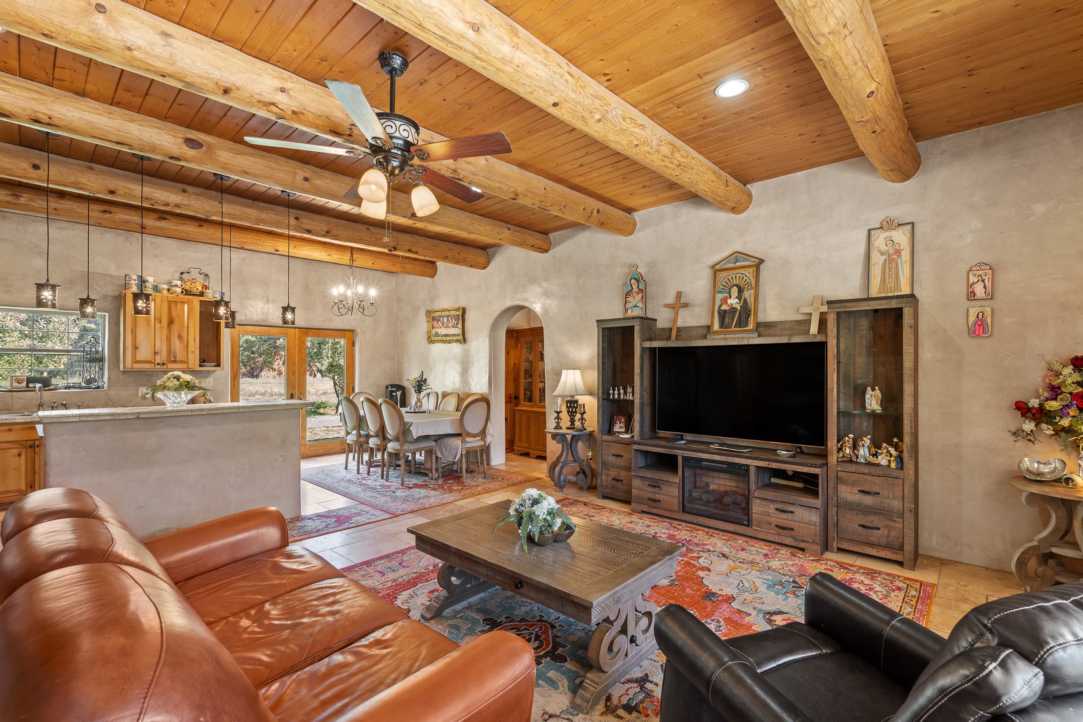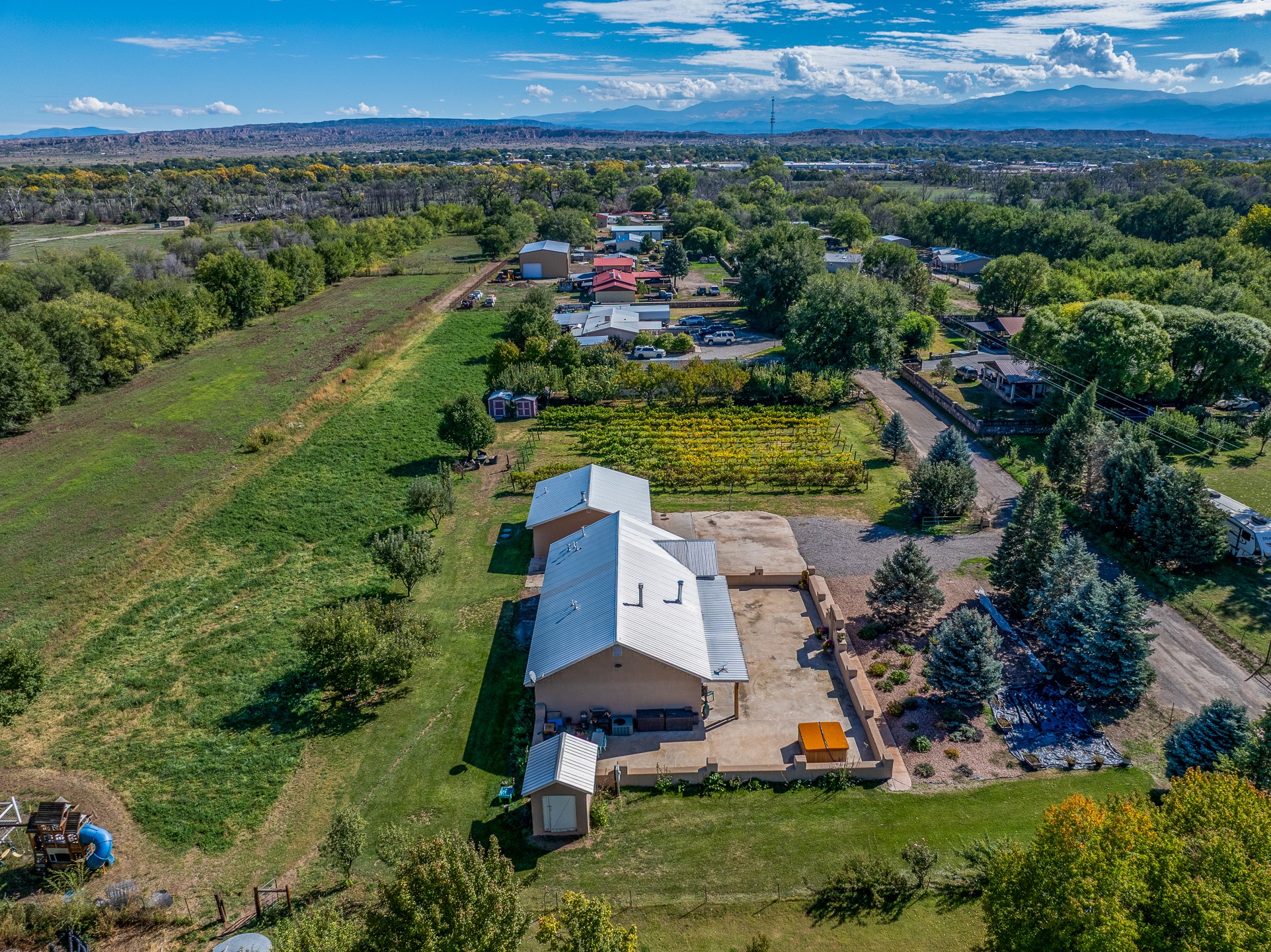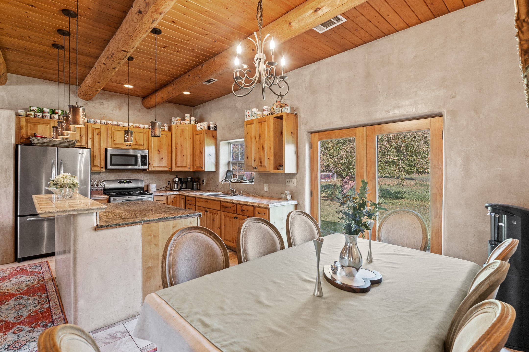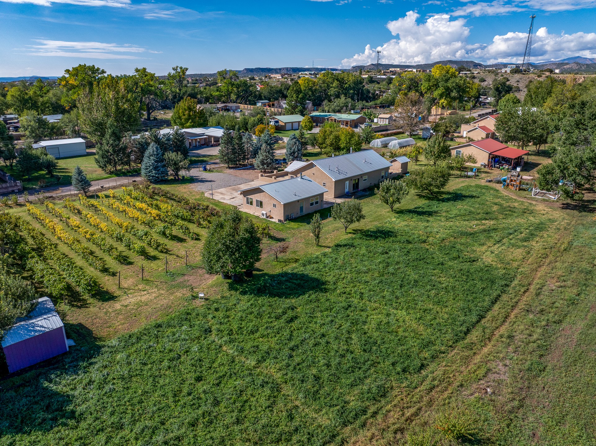 Charming Adobe Retreat with Guest House, Vineyard, Orchard & Lush Gardens! Completely rebuilt in 2009, this stunning adobe and frame construction home blends traditional Southwestern charm with modern luxury. Featuring 3 bedrooms and 2 bathrooms in the main home, these homes sit on a beautiful lot bursting with fruit trees--including chokecherry, plum, apple, and peach--as well as vibrant gardens with mature trees and your very own vineyard! Inside, you'll find diamond plaster walls, custom cabinets, granite countertops with a coordinating backsplash, and travertine tile floors. Thoughtful details like nichos, hand-carved woodwork, vigas with tongue-and-groove ceilings, and excellent bedroom separation create a warm, refined ambiance throughout. The detached guest house is light-filled and inviting, with wood floors, T&G ceilings, a wood stove, custom cabinetry, and intricate hand-carved accents. The guest house is perfect for visitors, rental income, or a creative studio space. Enjoy spacious front and side patios, ideal for entertaining or relaxing under the stars, plus a fabulous hot tub for year-round enjoyment. A rare opportunity to own a uniquely artistic and serene property--this home is a true oasis. Conveniently located in Espanola with a short 30 minute drive to LANL.