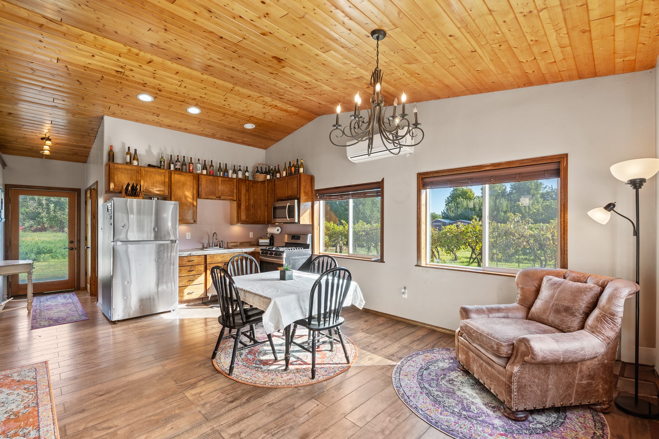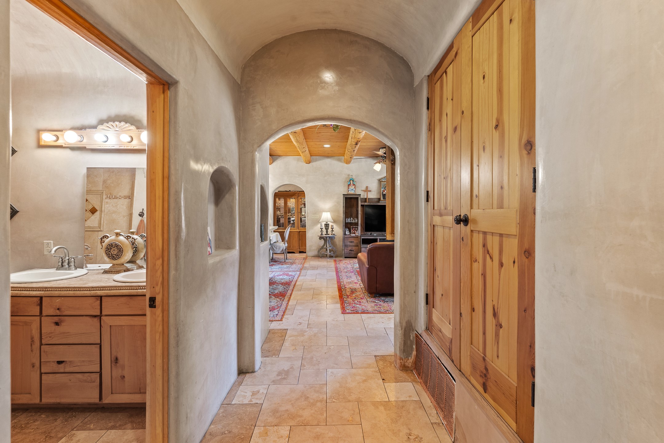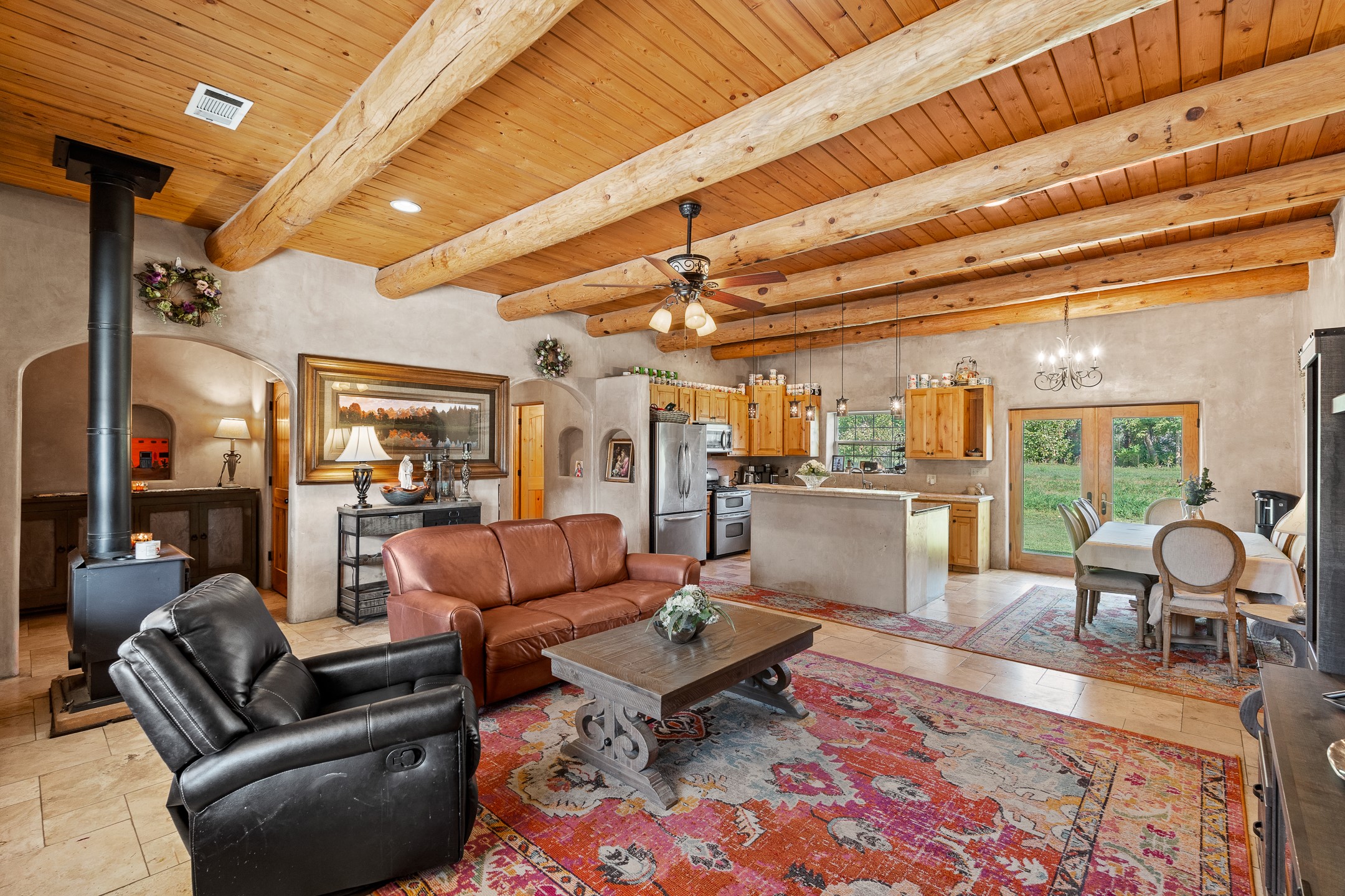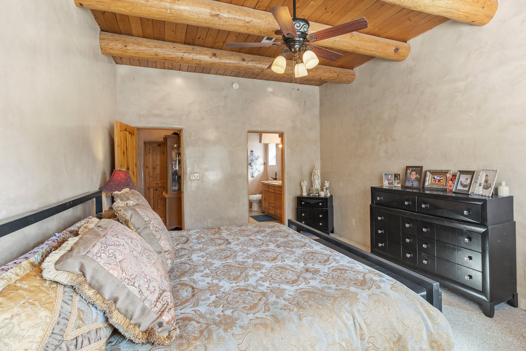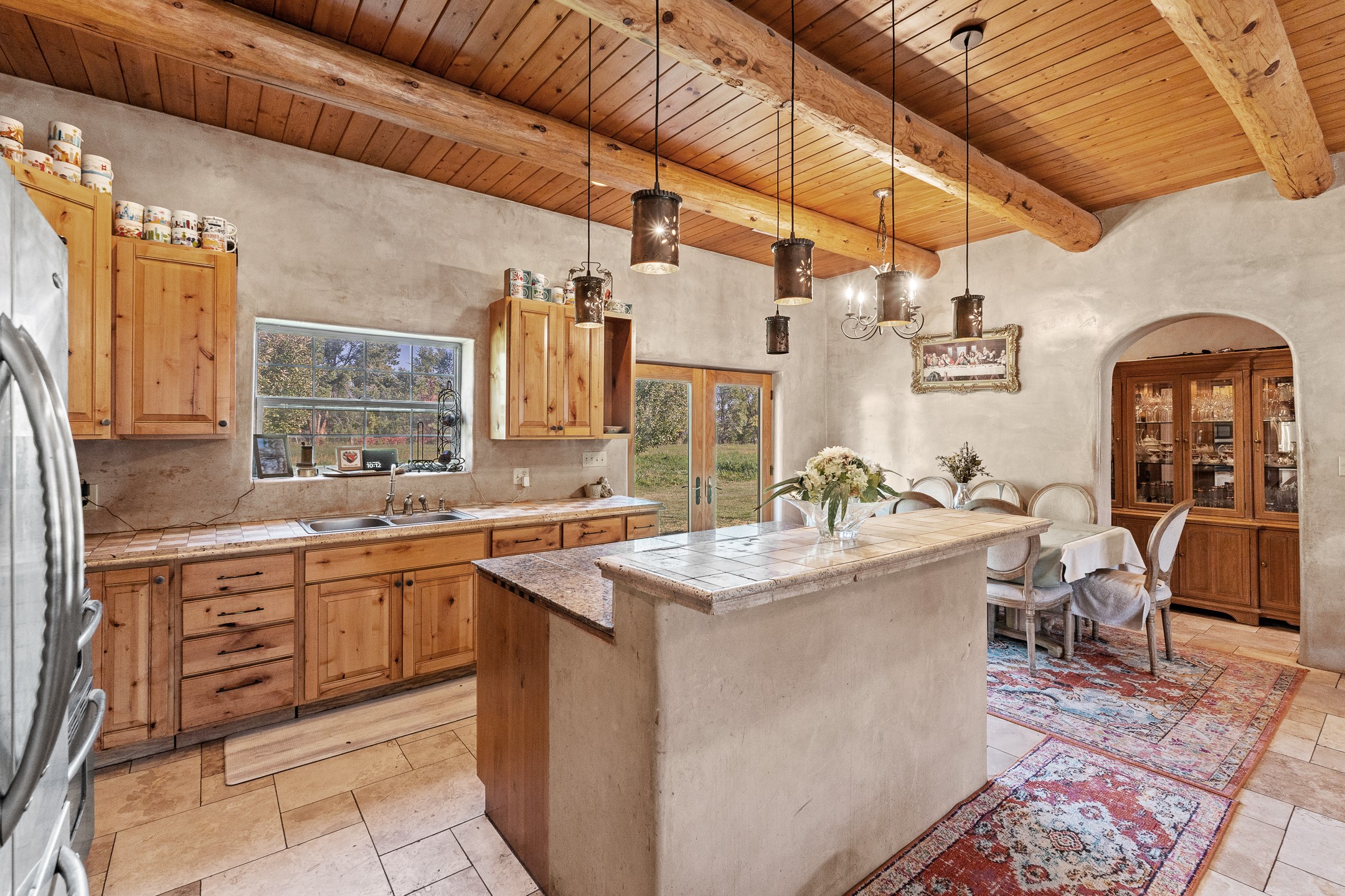 Charming Adobe Retreat with Guest House, Vineyard, Orchard & Lush Gardens! Completely rebuilt in 2009, this stunning adobe and frame construction home blends traditional Southwestern charm with modern luxury. Featuring 3 bedrooms and 2 bathrooms in the main home, these homes sit on a beautiful lot bursting with fruit trees--including chokecherry, plum, apple, and peach--as well as vibrant gardens with mature trees and your very own vineyard! Inside, you'll find diamond plaster walls, custom cabinets, granite countertops with a coordinating backsplash, and travertine tile floors. Thoughtful details like nichos, hand-carved woodwork, vigas with tongue-and-groove ceilings, and excellent bedroom separation create a warm, refined ambiance throughout. The detached guest house is light-filled and inviting, with wood floors, T&G ceilings, a wood stove, custom cabinetry, and intricate hand-carved accents. The guest house is perfect for visitors, rental income, or a creative studio space. Enjoy spacious front and side patios, ideal for entertaining or relaxing under the stars, plus a fabulous hot tub for year-round enjoyment. A rare opportunity to own a uniquely artistic and serene property--this home is a true oasis. Conveniently located in Espanola with a short 30 minute drive to LANL.