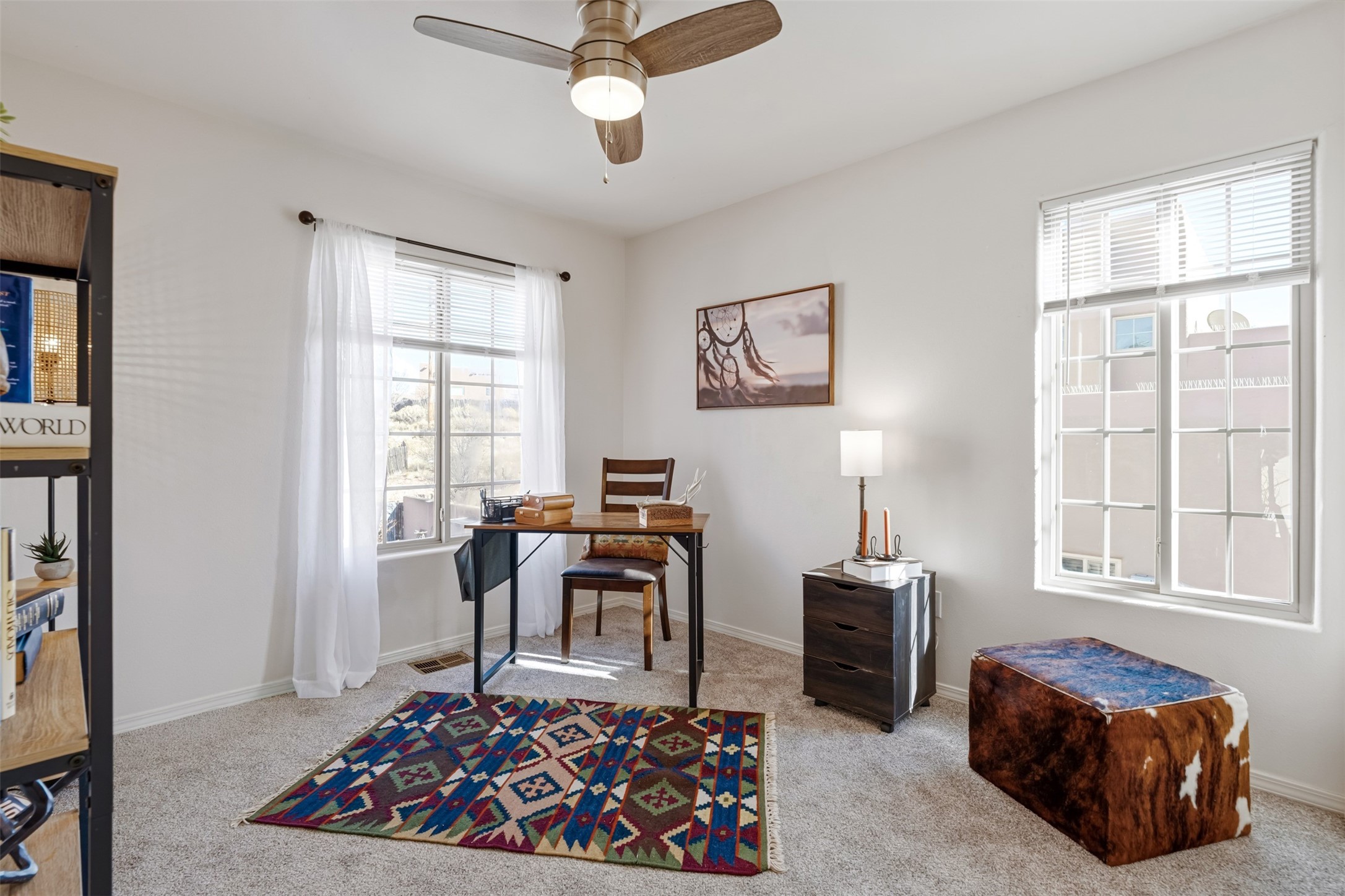 Located within the desirable and convenient Nava Ade community with access to amenities including walking paths, green space, pool, fitness center, steam room, and hot tub, 4212 Big Sky Road is a smart, well-designed two-story home, offering 1,272 square feet, three bedrooms, and two full baths.The main level feels expansive, with tall ceilings and oversized windows that pull in light from multiple directions. Sliding doors open directly to a fenced backyard, creating an easy connection between indoor living and outdoor space--ideal for morning coffee, pets, or an evening unwind.A large bedroom and a full bath are positioned on the ground floor, offering flexibility for guests, kids, or a primary bedroom for single-level living. Upstairs, two additional bedrooms share a full bath. The layout strikes a practical balance: open and airy below, private and quiet above.The yard is fully enclosed, and the corner position lends the property an open, spacious feel. Perfect for buyers who value natural light, efficient design, and a well-maintained community neighborhood. Convenient Southside location with easy access to Santa Fe Place Mall and Zafarano Drive shopping (Target, Albertsons, etc).