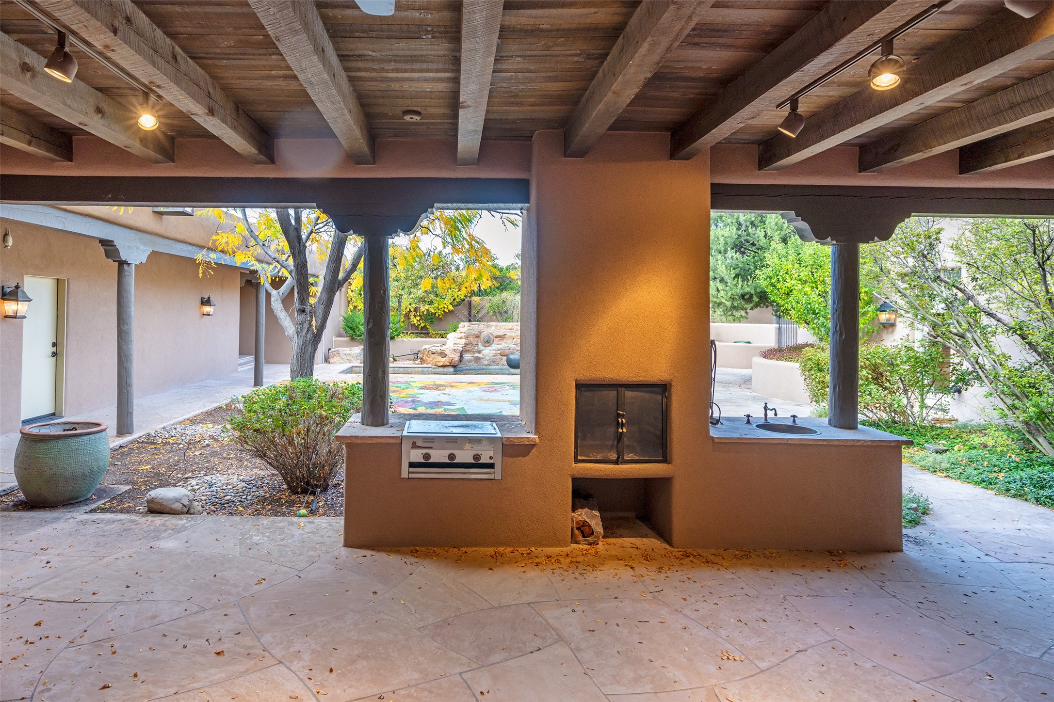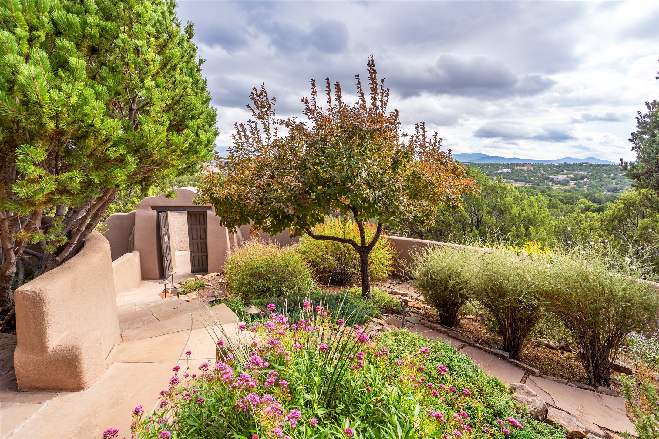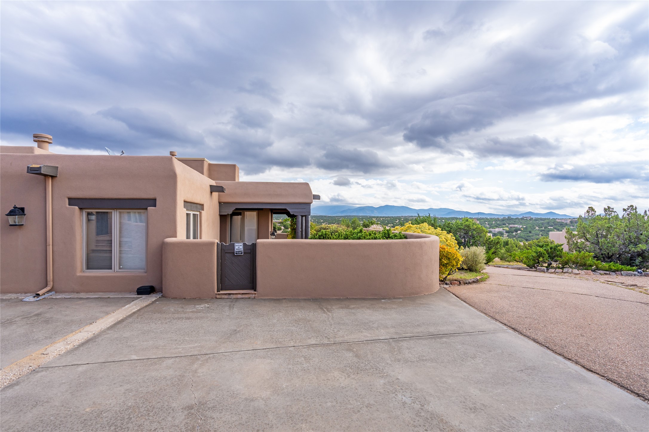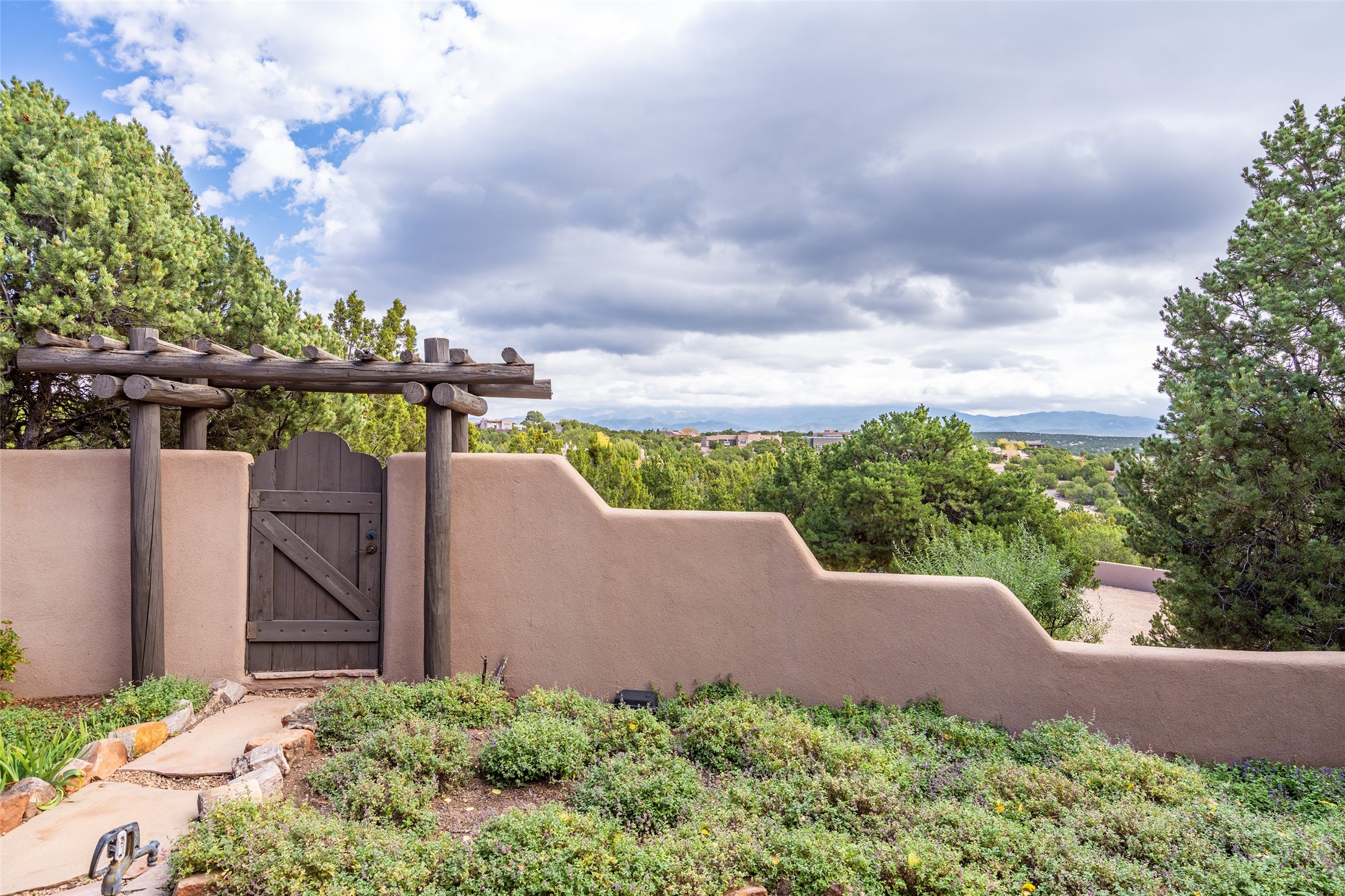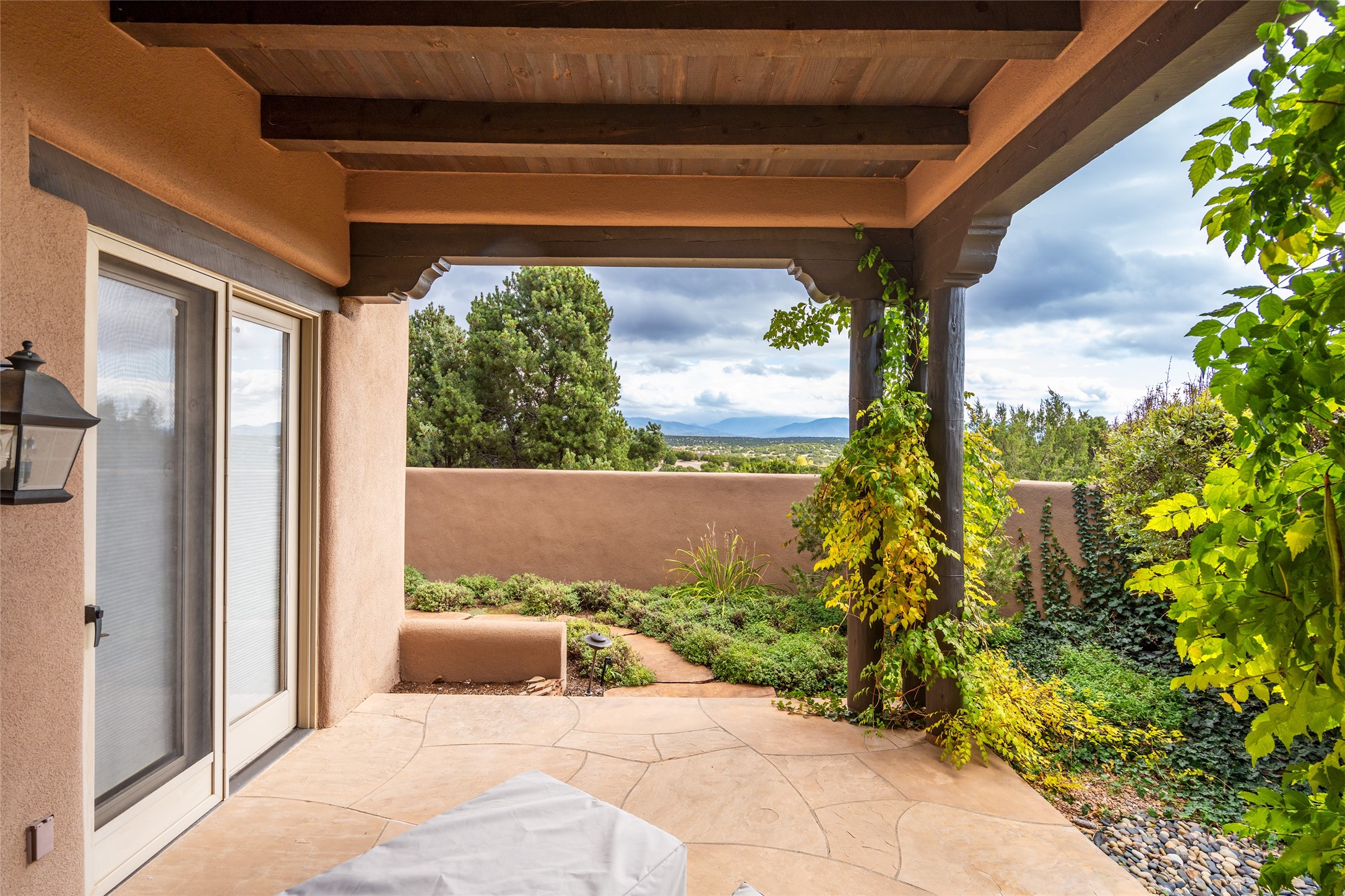 Expansive two bedroom home with guest house and studio. Exceptional views from your front porch and broad portal and large private back yard area perfect for entertaining. 230 square foot lap pool and hot tub for relaxing or entertaining. The main house has a grand foyer ready for art work with a back door showcasing the rear portal and back yard. The large kitchen has plenty of cabinet space, a butlers pantry, quartz counter tops, Wolf 5 burner stove, Cove Dishwasher, Subzero refrigerator, and a cozy banco/breakfast nook offset by a kiva fire place. Adjacent to the kitchen is a dining room that can easily seat 8 with nice views into the back courtyard and front yard. Down two steps past the office and large great room with fireplace to the massive main suite, full bathroom, soaking tub, two walk-in closets, sitting areas and easy access to the 8' hot tub. Guest house has a full kitchen and full bath. Detached studio ready for your endeavors. 2025 roof update with 5 year limited warranty on labor and materials. Must see this gem. Set up a showing today.