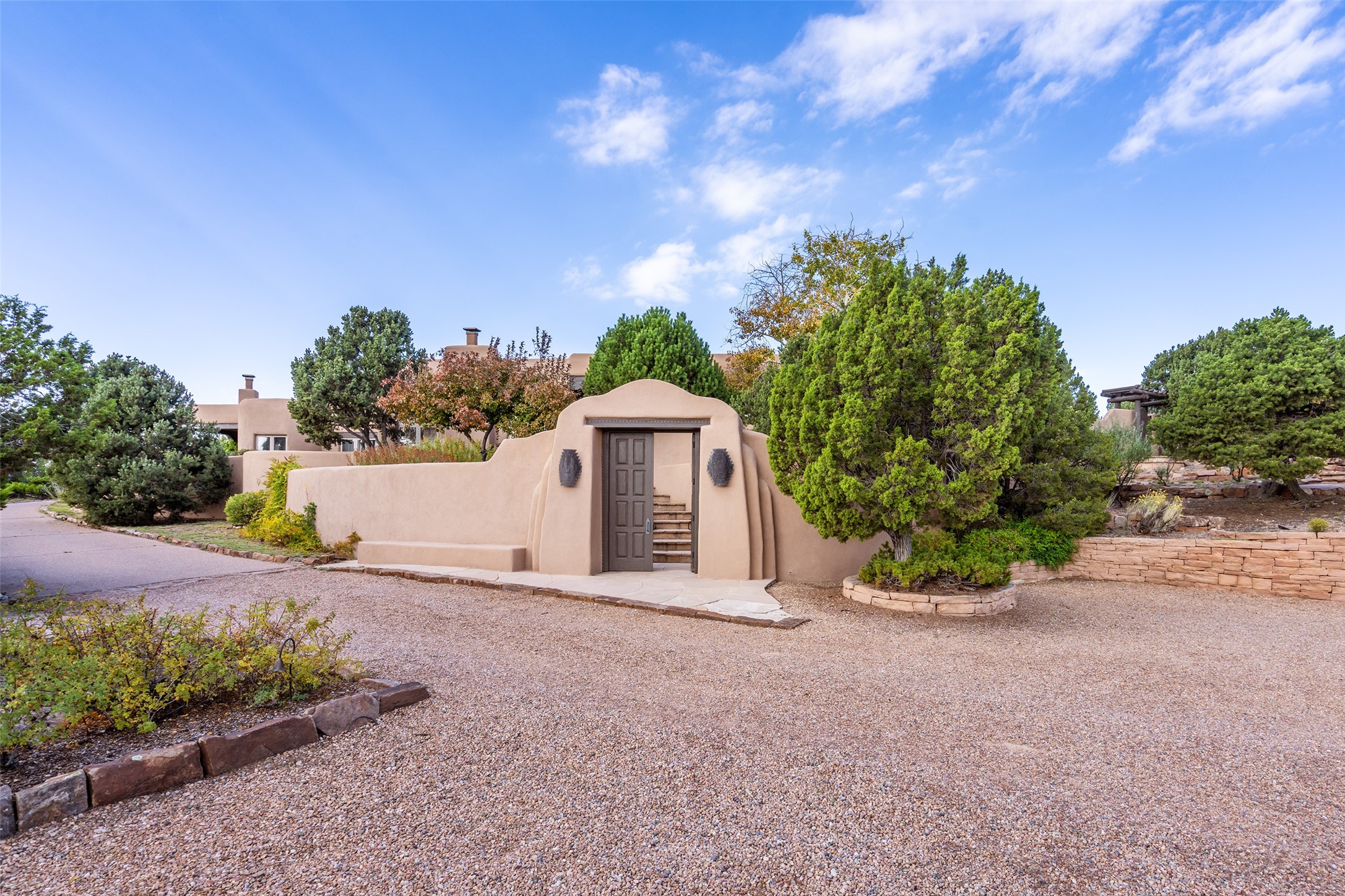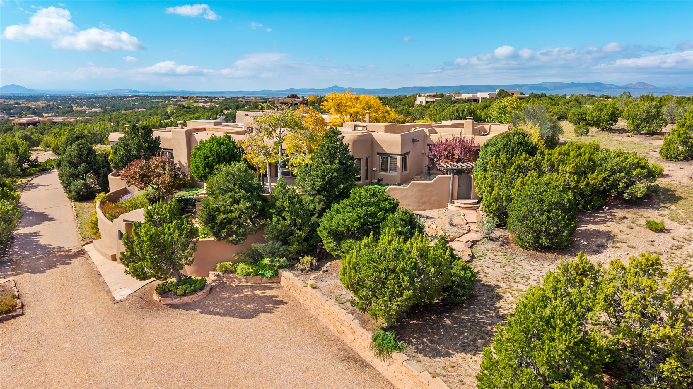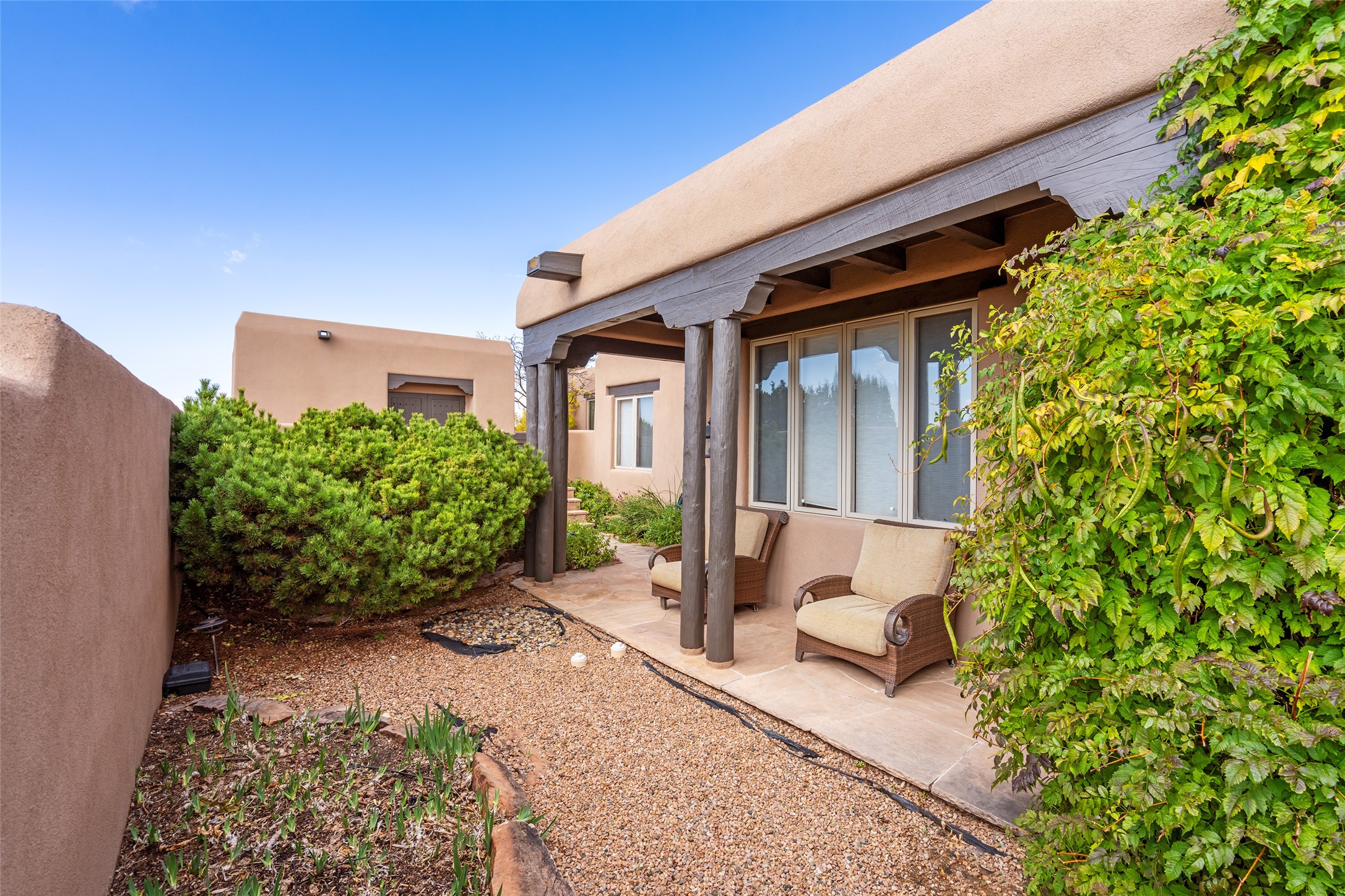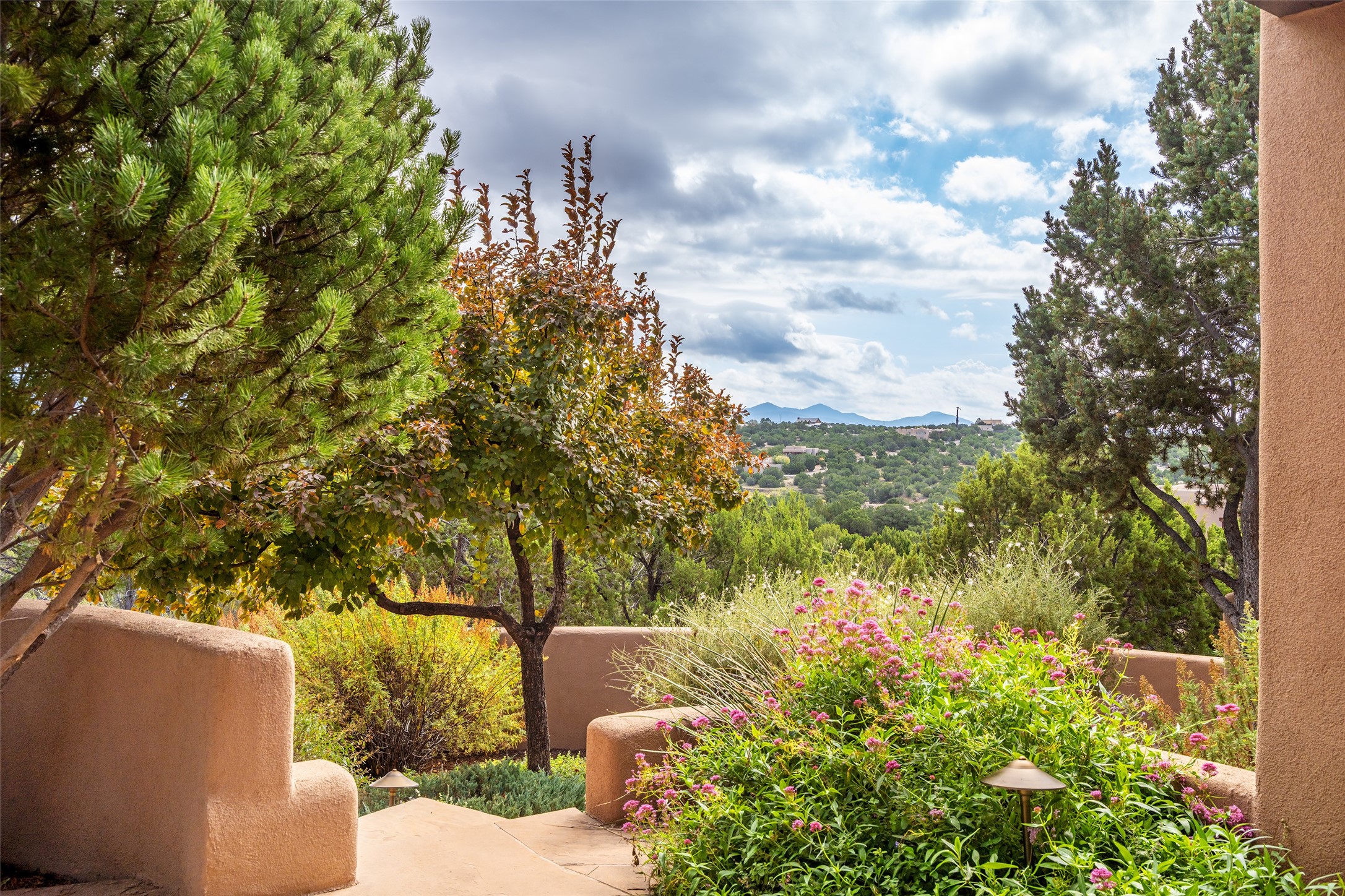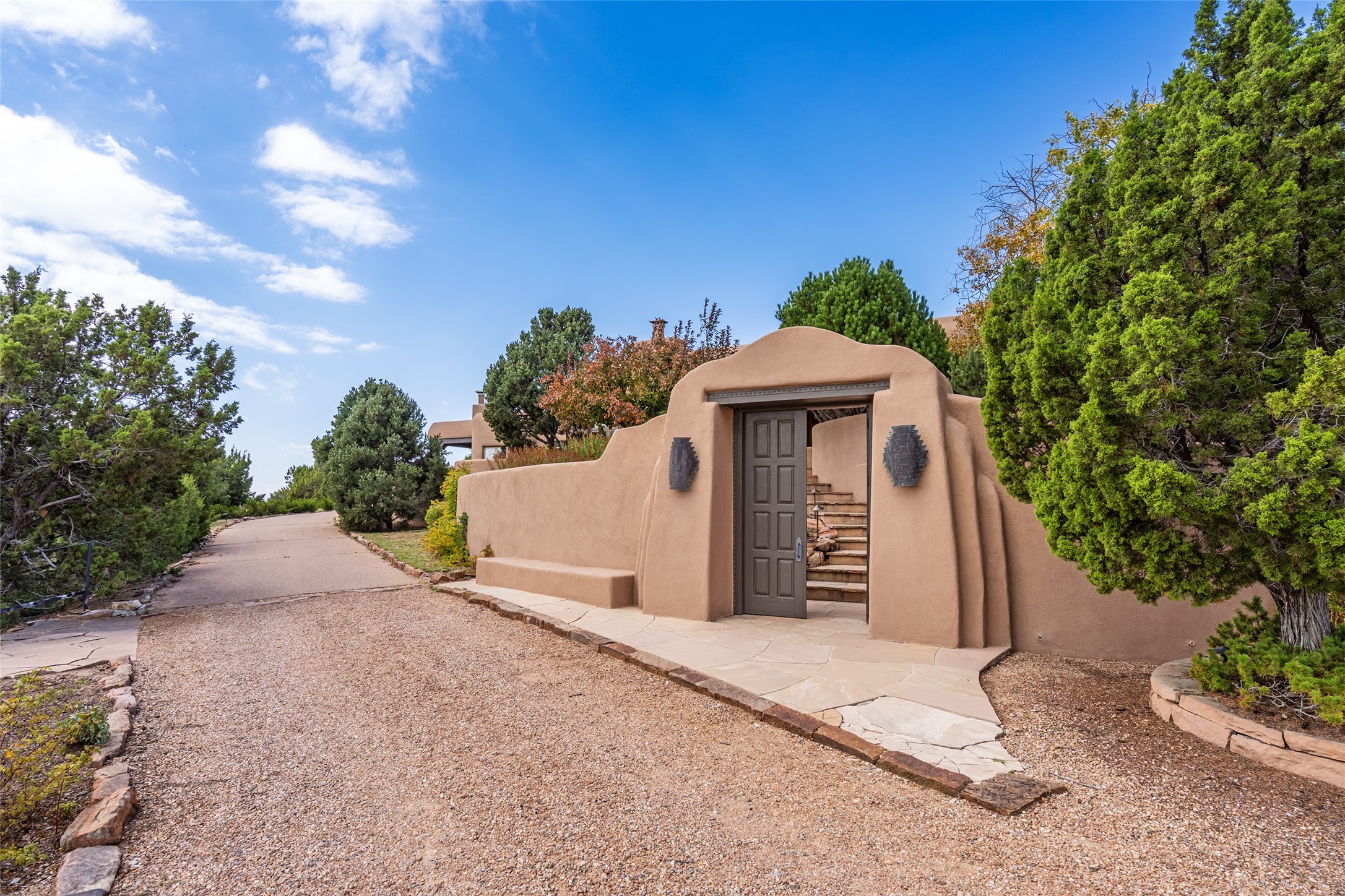 Expansive two bedroom home with guest house and studio. Exceptional views from your front porch and broad portal and large private back yard area perfect for entertaining. 230 square foot lap pool and hot tub for relaxing or entertaining. The main house has a grand foyer ready for art work with a back door showcasing the rear portal and back yard. The large kitchen has plenty of cabinet space, a butlers pantry, quartz counter tops, Wolf 5 burner stove, Cove Dishwasher, Subzero refrigerator, and a cozy banco/breakfast nook offset by a kiva fire place. Adjacent to the kitchen is a dining room that can easily seat 8 with nice views into the back courtyard and front yard. Down two steps past the office and large great room with fireplace to the massive main suite, full bathroom, soaking tub, two walk-in closets, sitting areas and easy access to the 8' hot tub. Guest house has a full kitchen and full bath. Detached studio ready for your endeavors. 2025 roof update with 5 year limited warranty on labor and materials. Must see this gem. Set up a showing today.