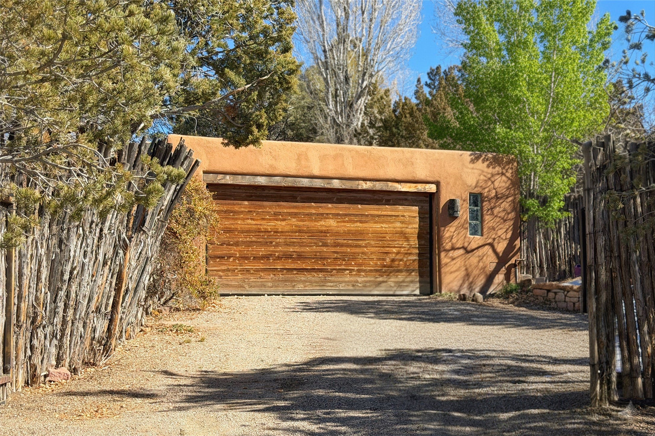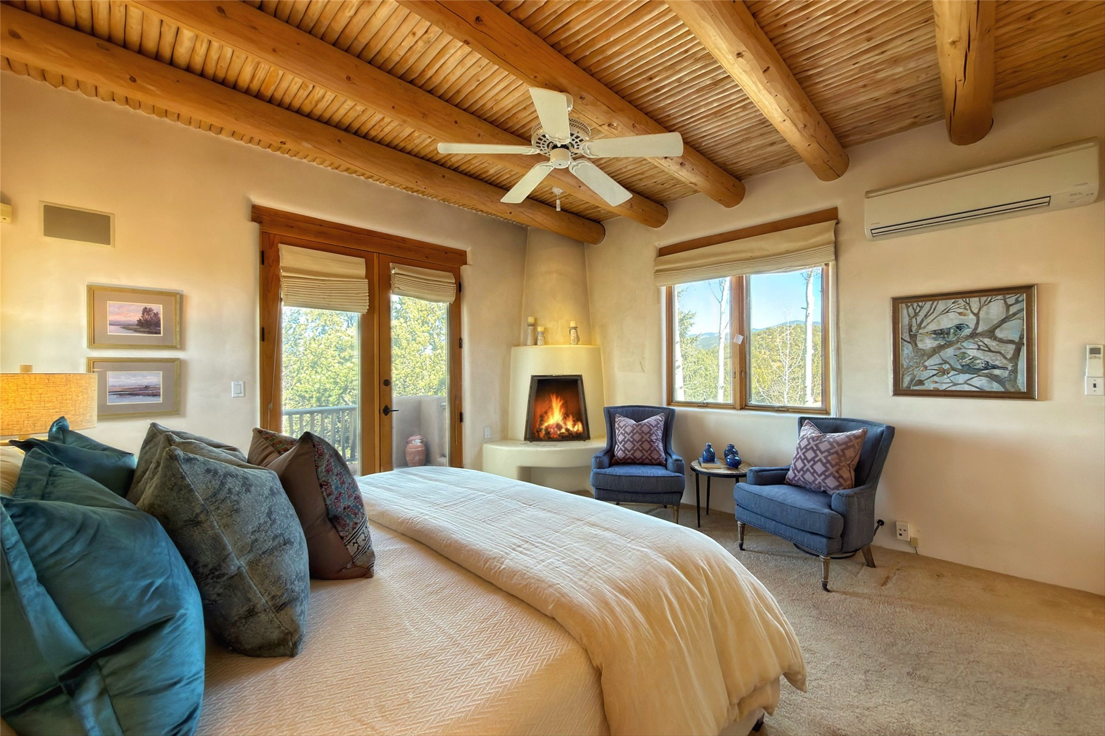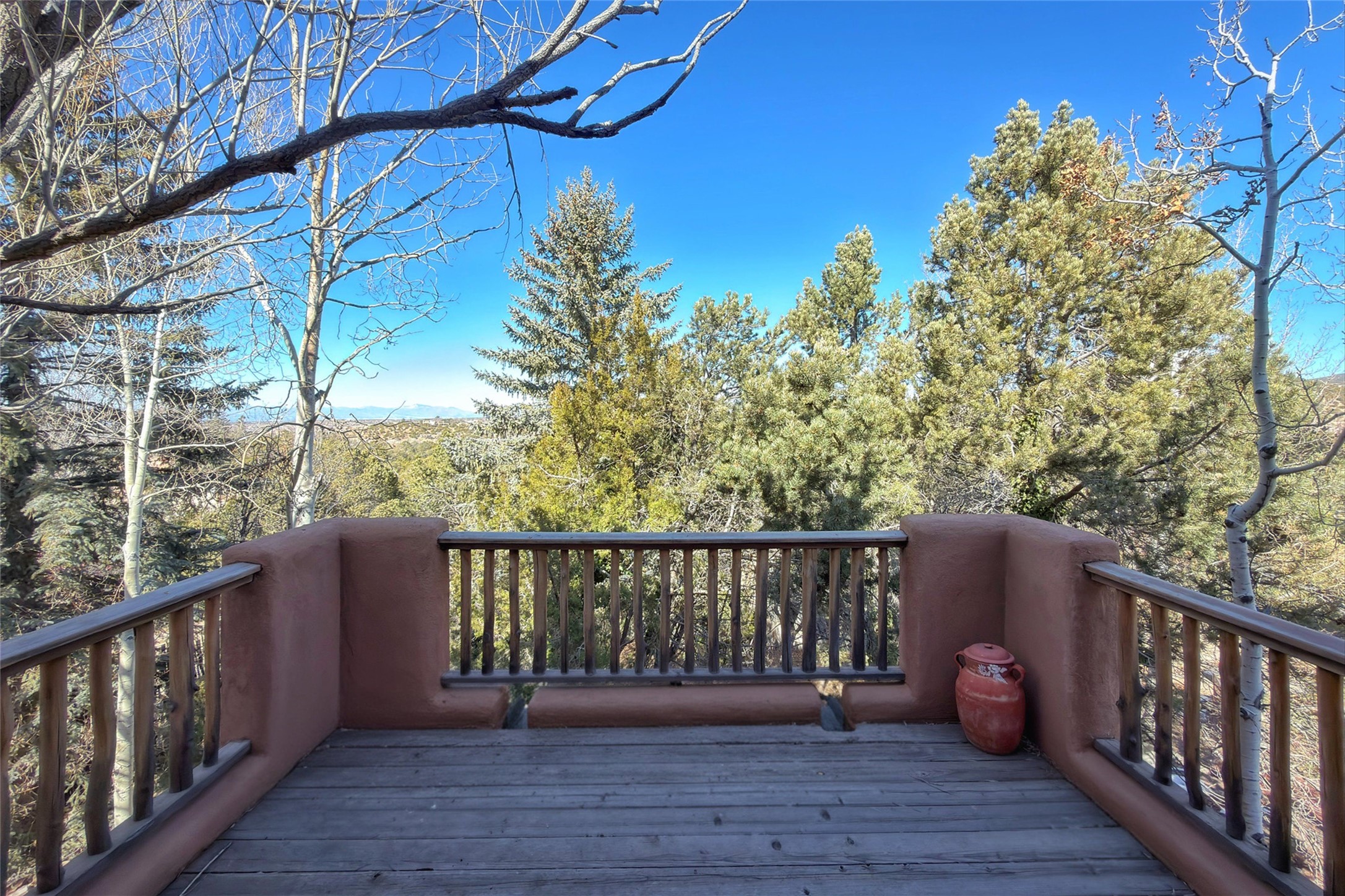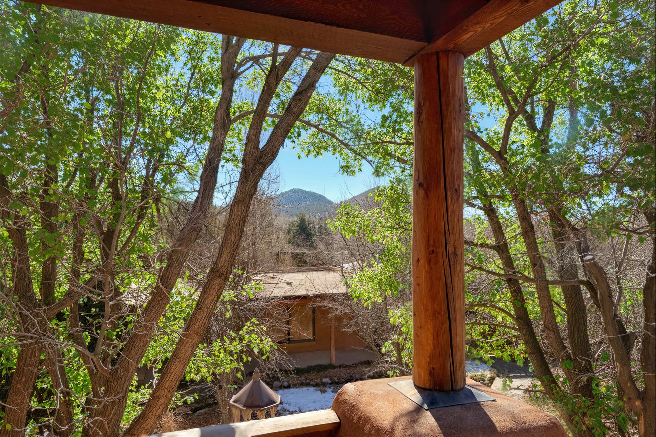A rare opportunity to own an adobe compound priced $550,000 below a recent appraisal. This compound off exclusive Upper Canyon Road with casita and studio offers views, and lush grounds. Discretely hidden behind gates on a quiet cul-de-sac in Santa Fe's historic East Side, this adobe compound offers privacy, protected views, and access to nature. Set on 1.14 acres, the fully fenced and landscaped property enjoys vistas of the Sangre de Cristo and Jemez Mountains. Designed by architect Paula Baker, author of Healthy Home, the custom residence was thoughtfully built in the early 1990s. The main house has four bedrooms, four baths, and multiple living areas. The open-concept living area connects kitchen, dining, and living spaces with easy access to private quarters. A detached guest casita includes two bedrooms, a bath, and a kitchenette. A separate studio, office, or gym provides flexible space. The primary suite features private patios with sweeping views, an office, multiple closets, and a spa-style bath. Architectural highlights include six fireplaces, vigas, latillas, antique doors, wood and brick floors, and abundant natural light. Heating includes ductless mini-splits, radiant flooring, and forced air. A detached two-car garage completes the residence. Outdoor living includes a front portal, multiple patios, a stream, and waterfall celebrated in the book Secret Gardens of Santa Fe. Private access across the road to protected hiking trails that connects to the Dorothy Stewart trail and Dale Ball Trail system. This is a rare opportunity to own a private, thoughtfully designed adobe compound in one of Santa Fe's most desirable East Side locations.